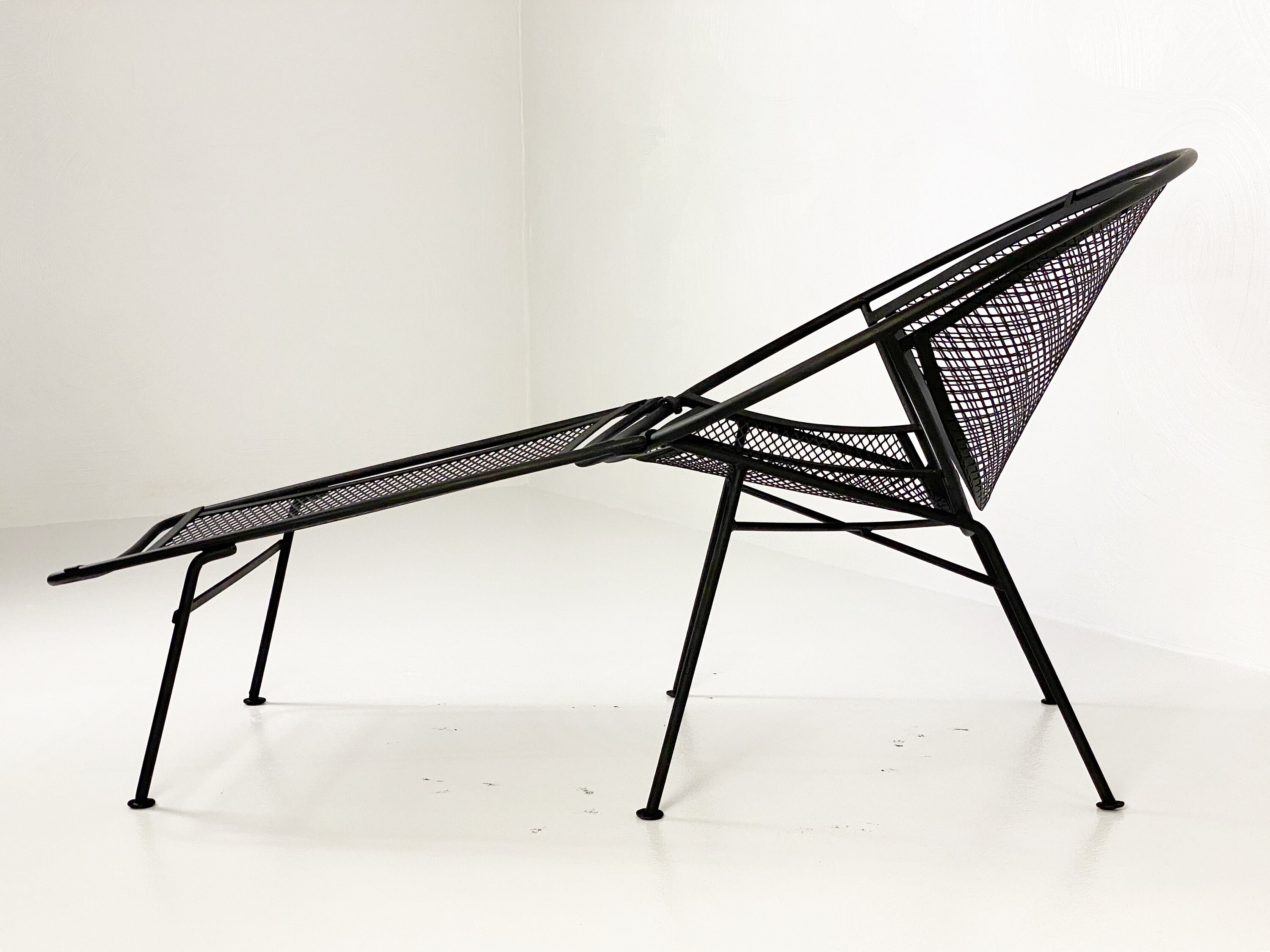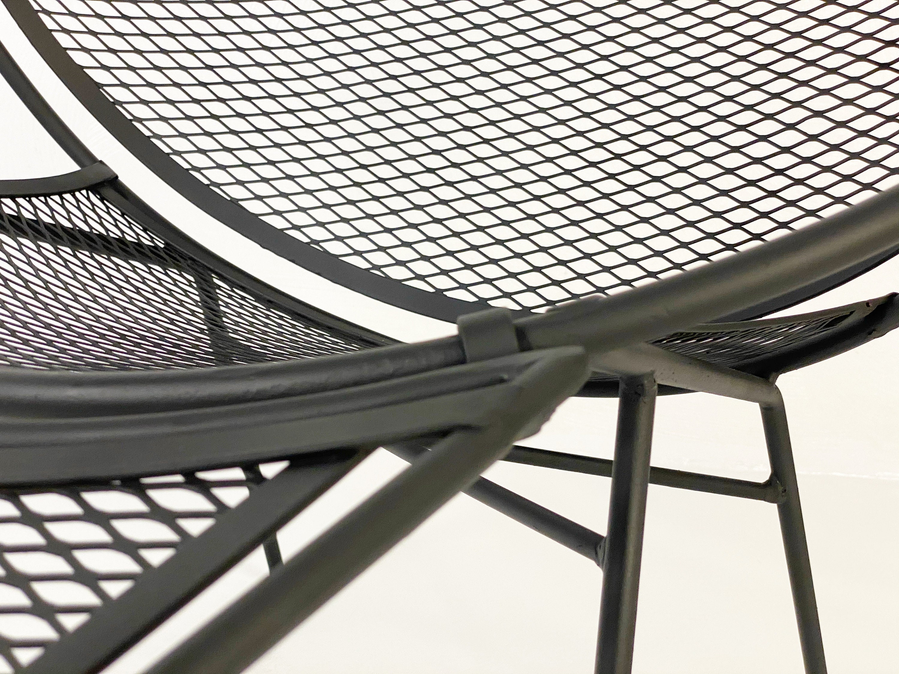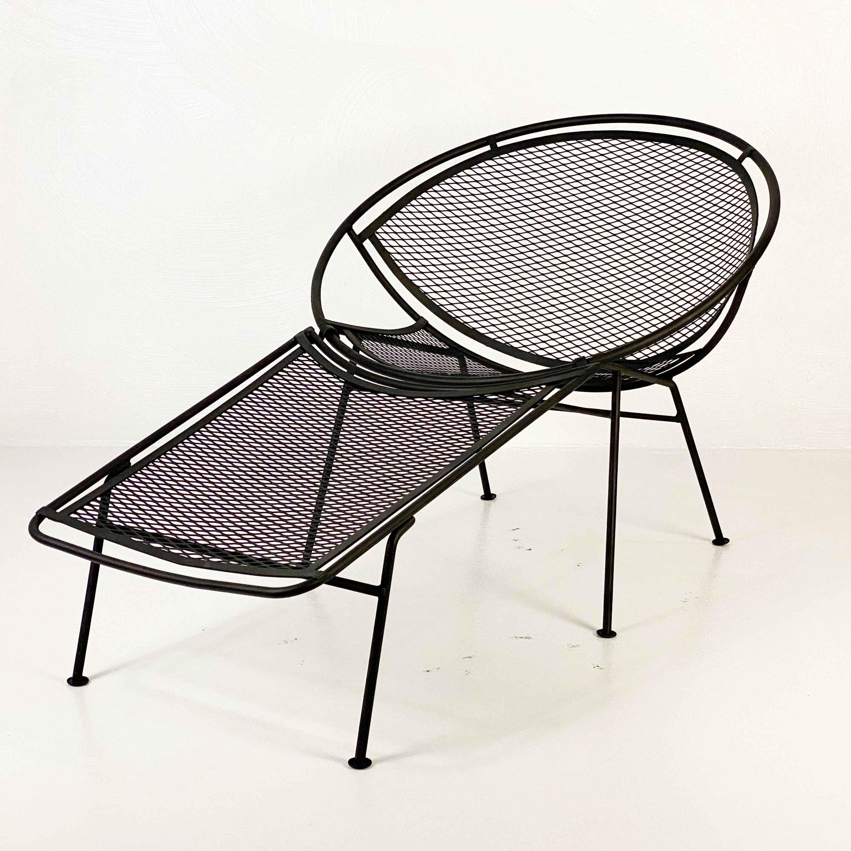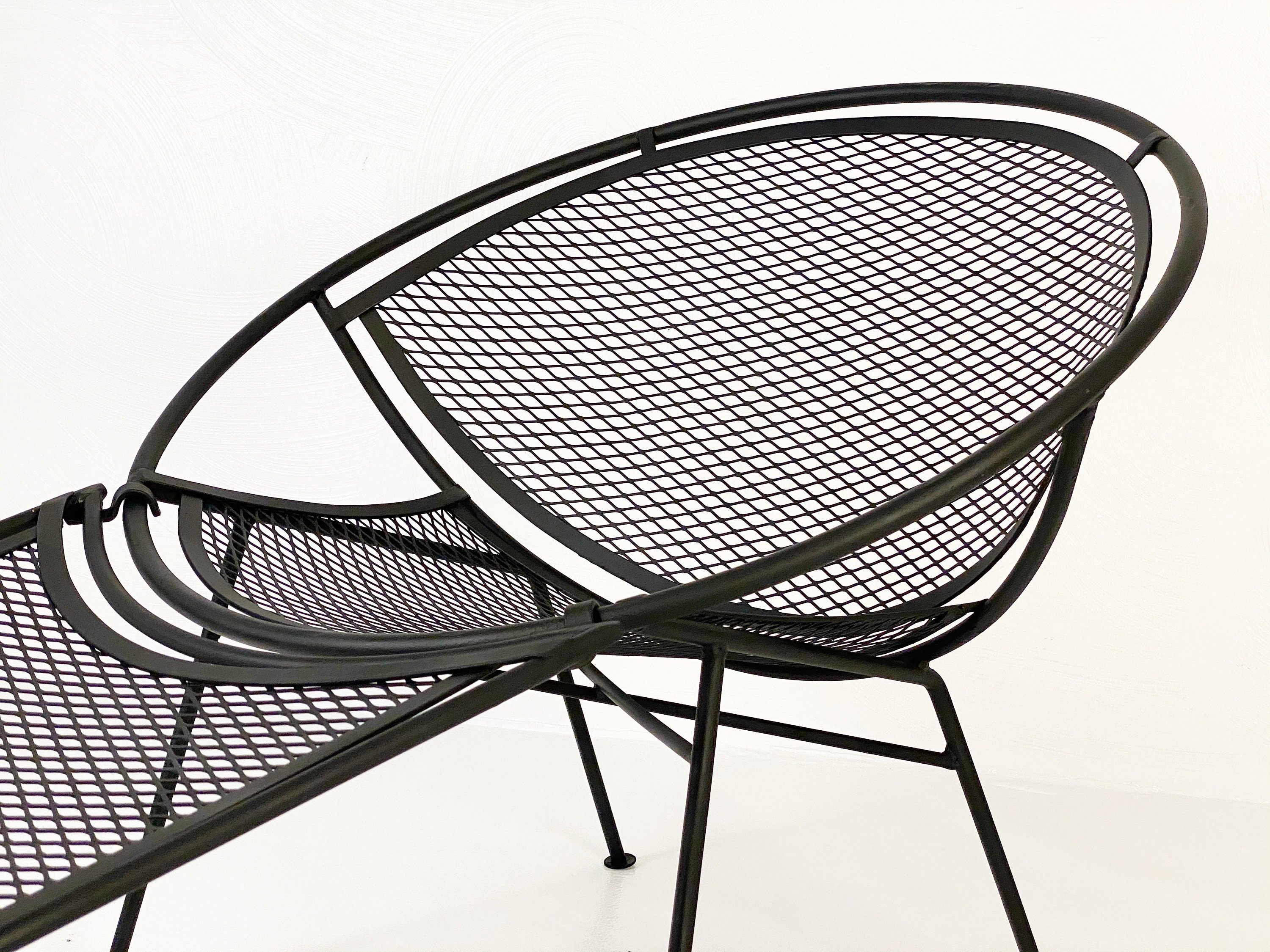Here is a very nice black cast iron radar hoop chaise lounge chair by Maurizio Tempestini for Salterini, circa 1960s. The chaise hoop chair is by far one of the most comfortable outdoor chaises ever made in the mid-century era. The leg design offers a comfortable raised area for your legs and the hoop design allows your arms to rest perfectly while relaxing outdoors. We have 1 chaise lounge chair available and it is in very good condition without any rust or breaks in the iron. All chairs were cleaned and given a coat of high-performance enamel in flat black before being placed online for sale.