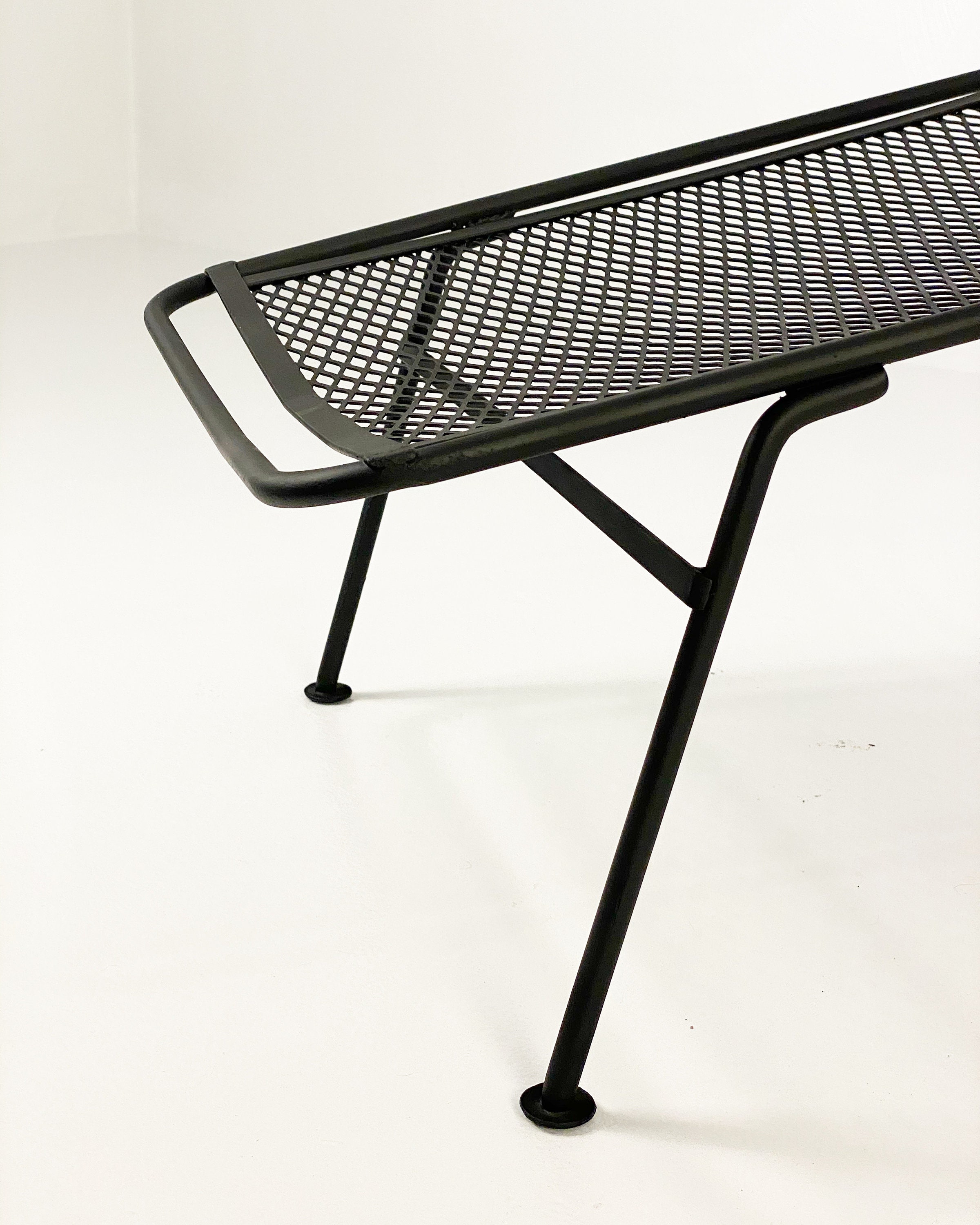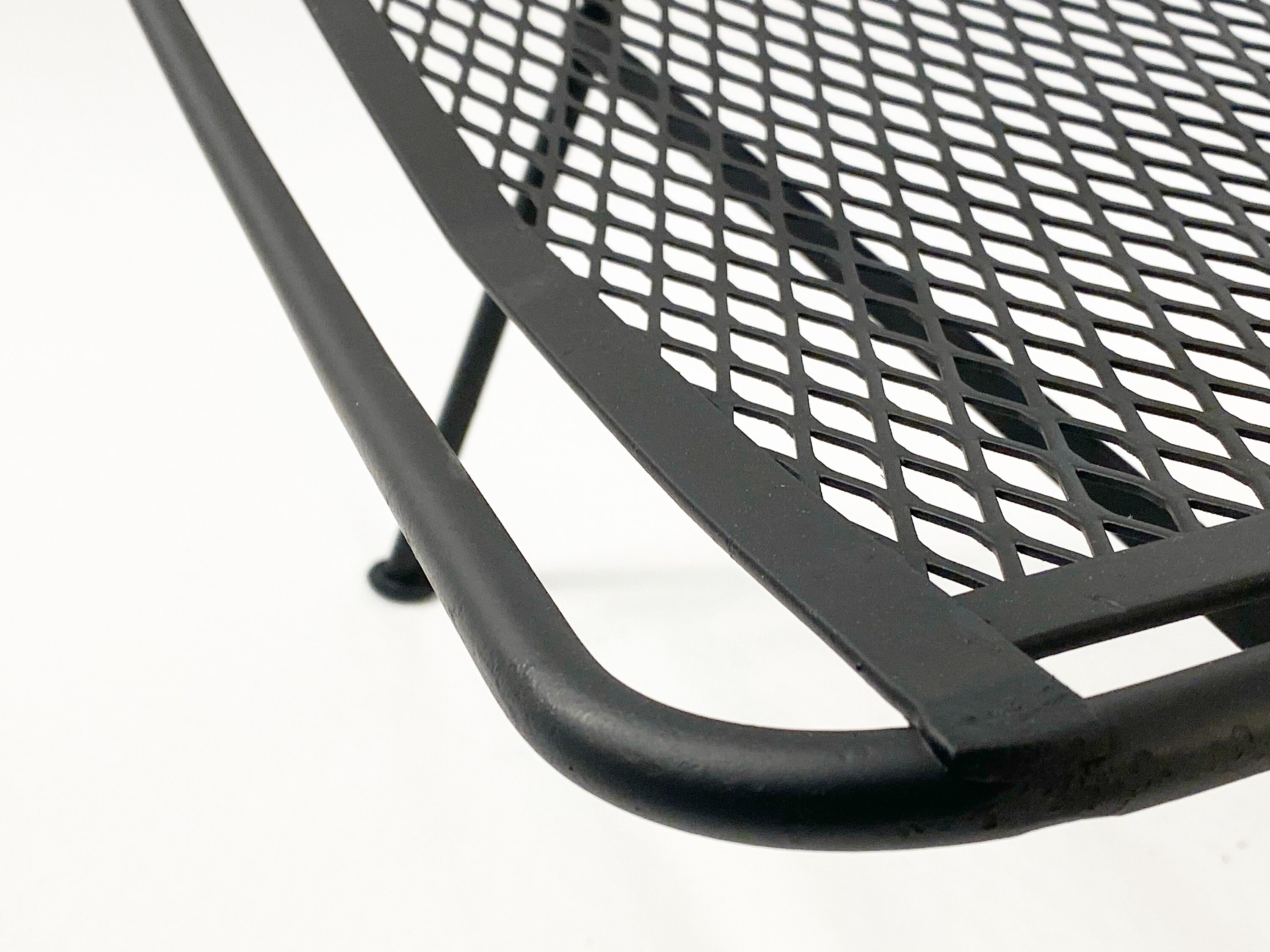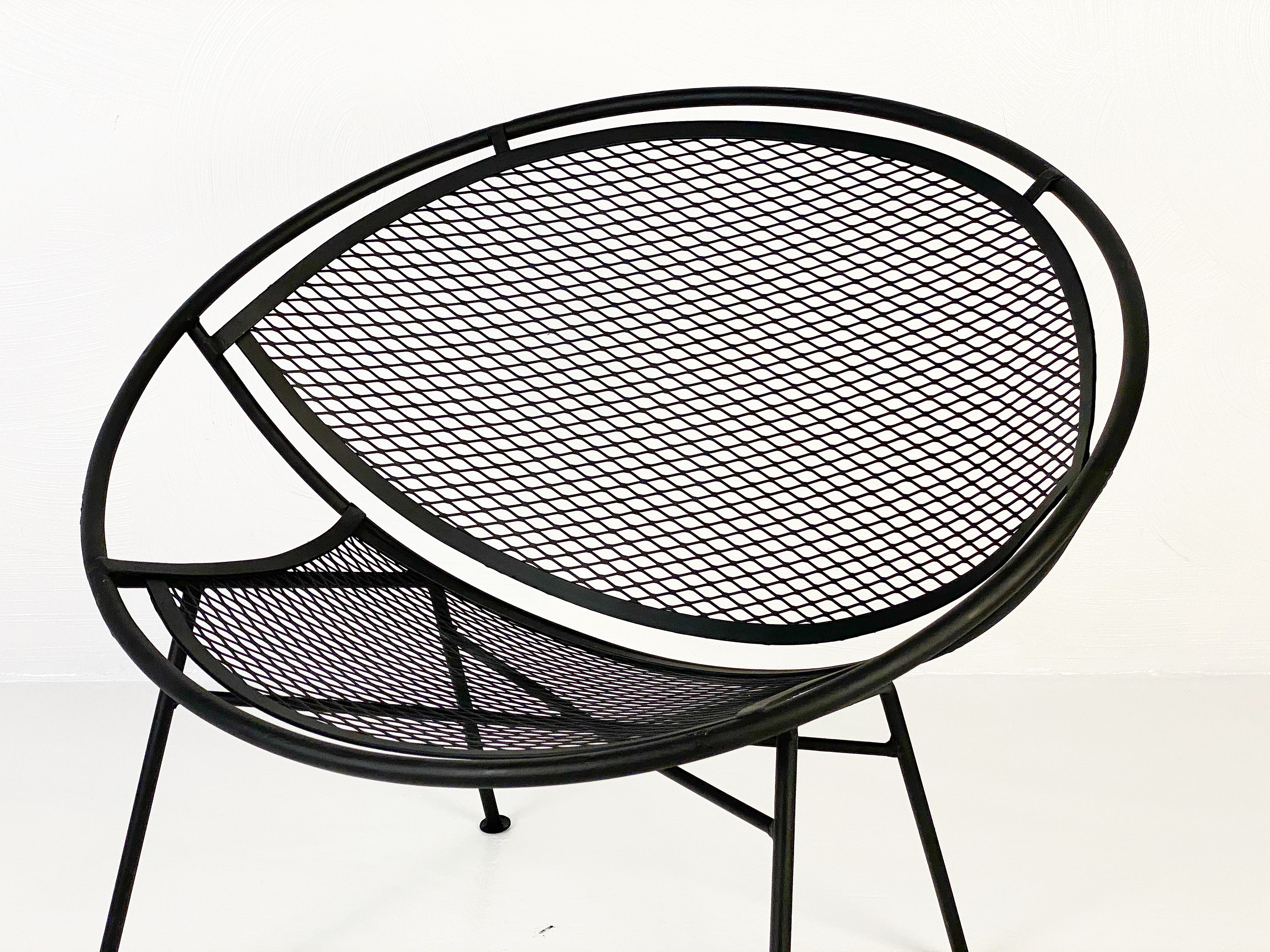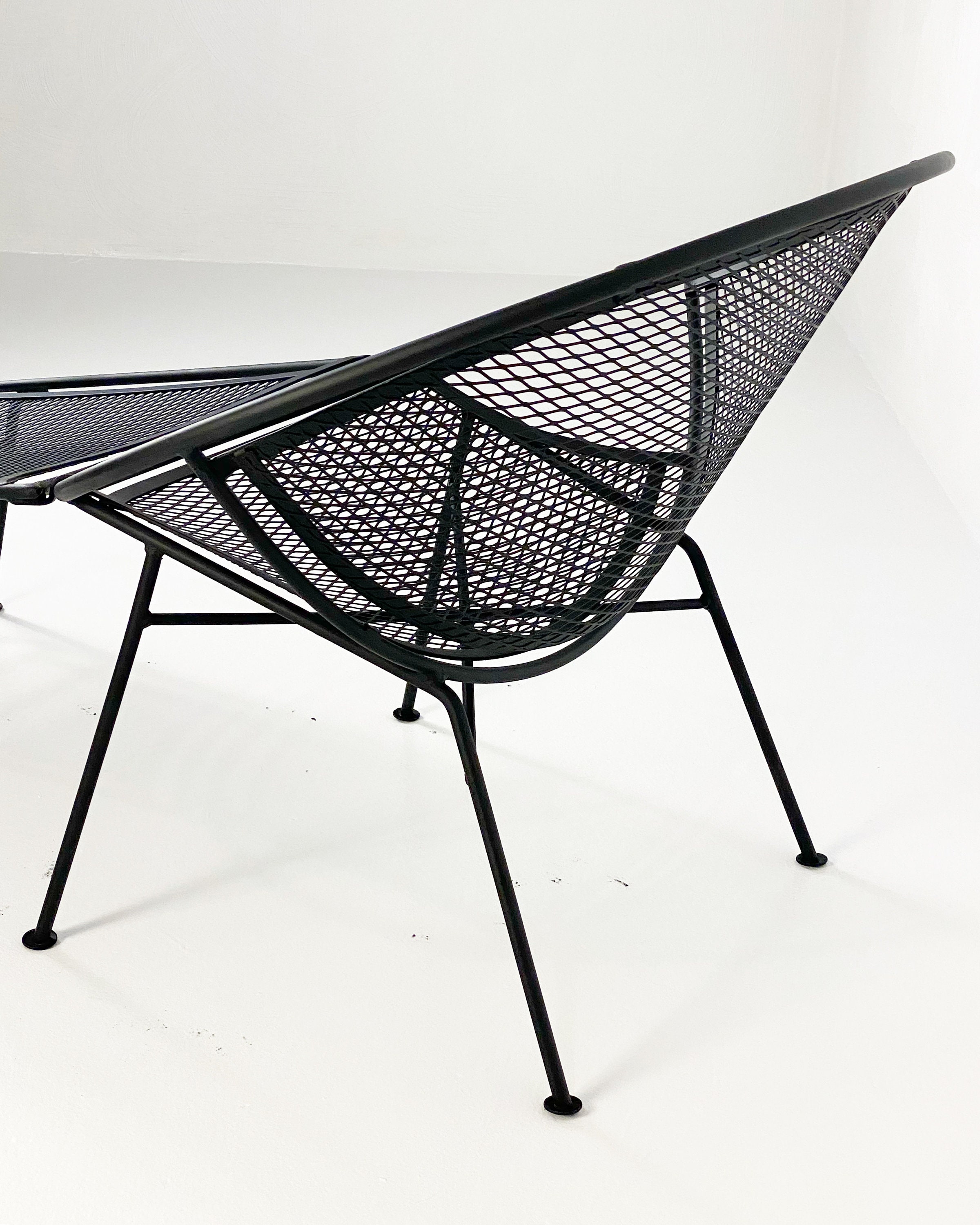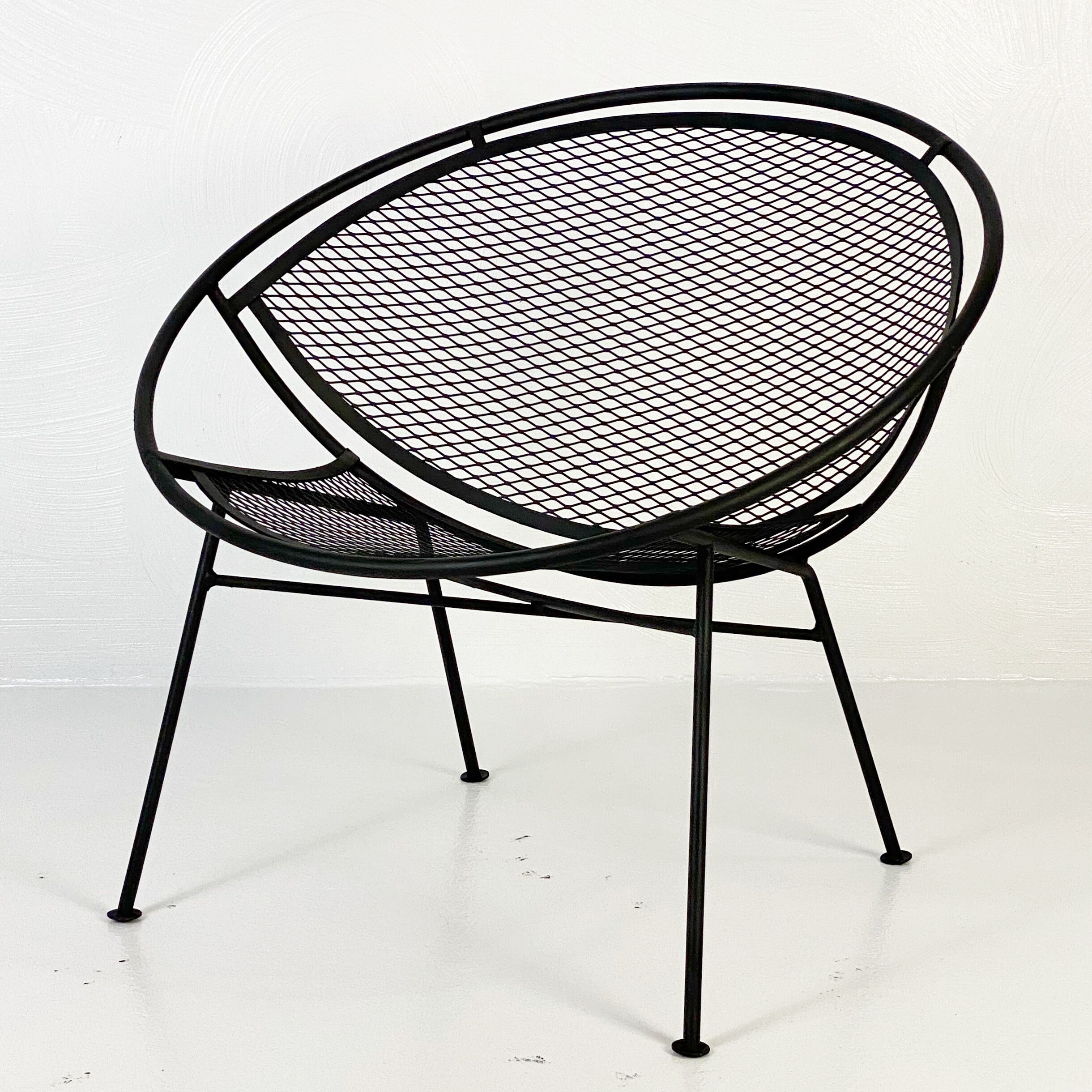 Here is a very nice black cast iron radar hoop chaise lounge chair by Maurizio Tempestini for Salterini, circa 1960s. The chaise hoop chair is by far one of the most comfortable outdoor chaises ever made in the mid-century era. The leg design offers a comfortable raised area for your legs and the hoop design allows your arms to rest perfectly while relaxing outdoors. We have 1 chaise lounge chair available and it is in very good condition without any rust or breaks in the iron. All chairs were cleaned and given a coat of high-performance enamel in flat black before being placed online for sale.