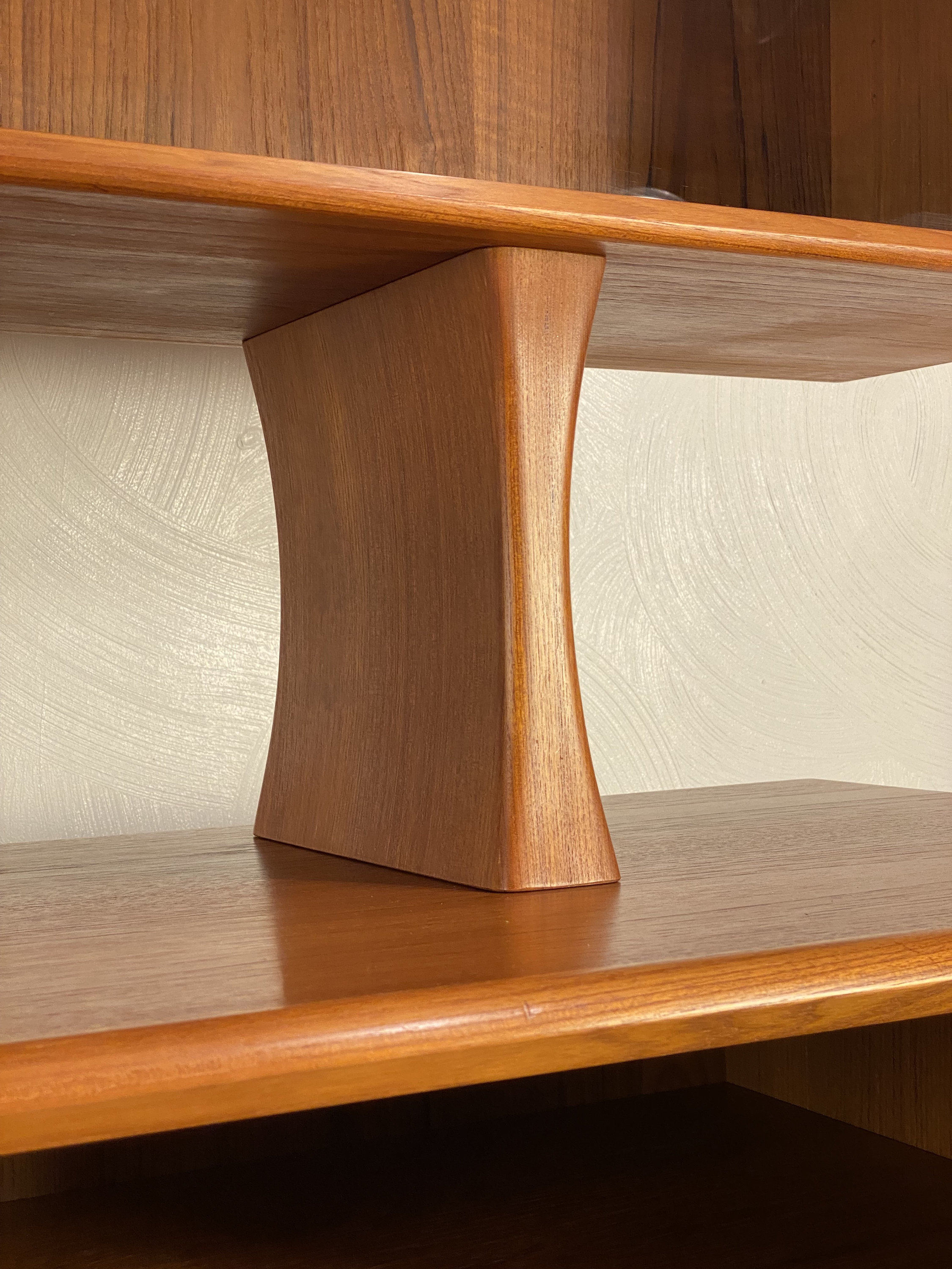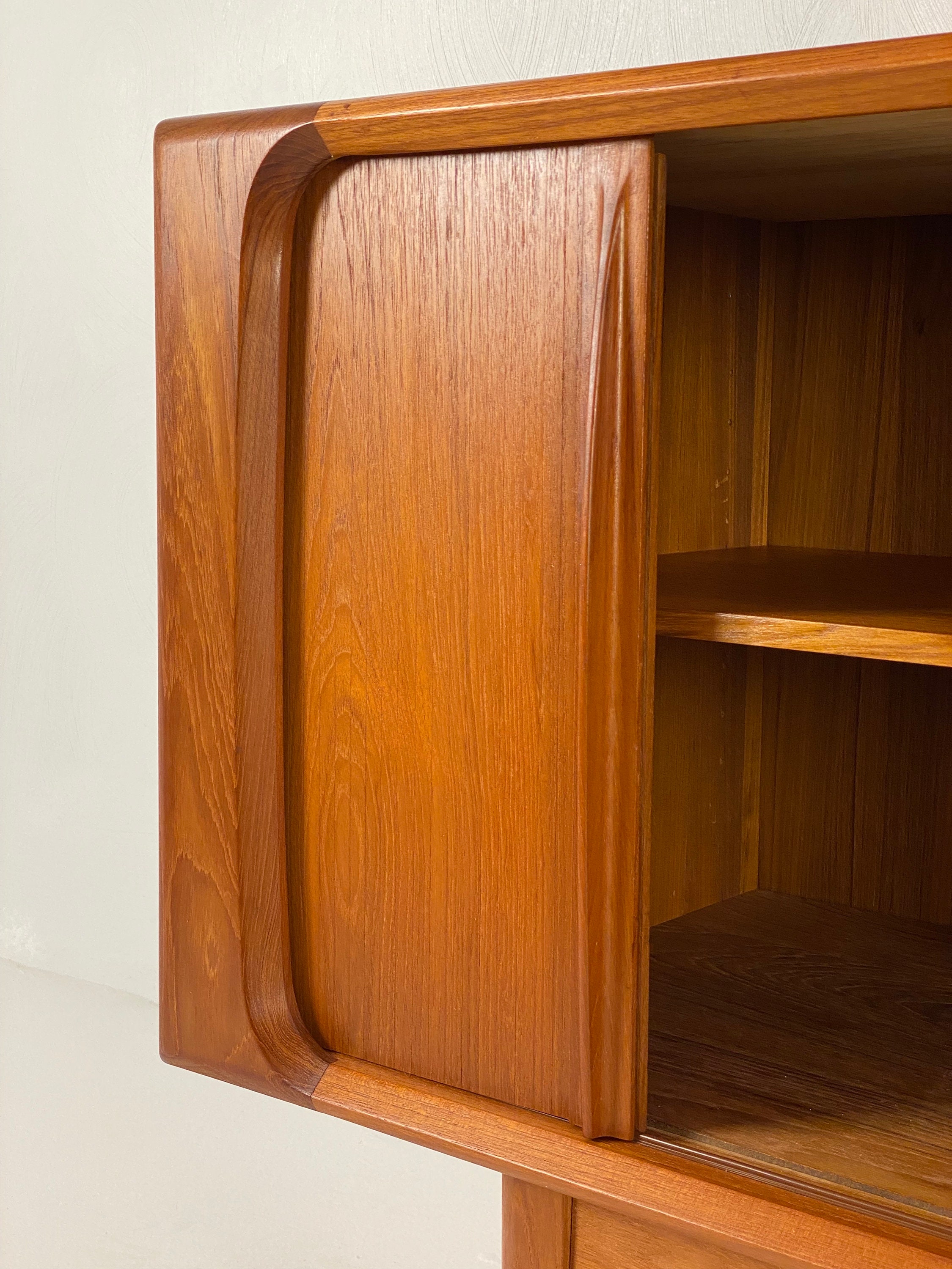 Here is an absolutely stunning teak tambour credenza with a glass front hutch top by Bernhard Pedersen & Son of Denmark, circa 1960s. The credenza has two very nice tambour doors on the front and when opened show 3 small silverware drawers in the center with a large compartment on either side. Inside the credenza are 3 height adjustable shelves. The glass front hutch top has 2 height adjustable shelves and offers lots of room for displaying your favorite pieces. Overall this piece is in exceptional original condition. The left glass door on the hutch top does show some light scuffs that can be seen in certain light and there is one very small nick on the front right, this is very very small but we wanted to point it out in advance of purchase. As this piece is very long at 83" we found that it must sit level for the tambour doors to open back fully, if the piece is not level the doors tend to open back to about where you can see in our photos. It does have a stamp from the maker on the underside of the credenza. Overall this is an exceptional piece and ready for its next 50+ years.