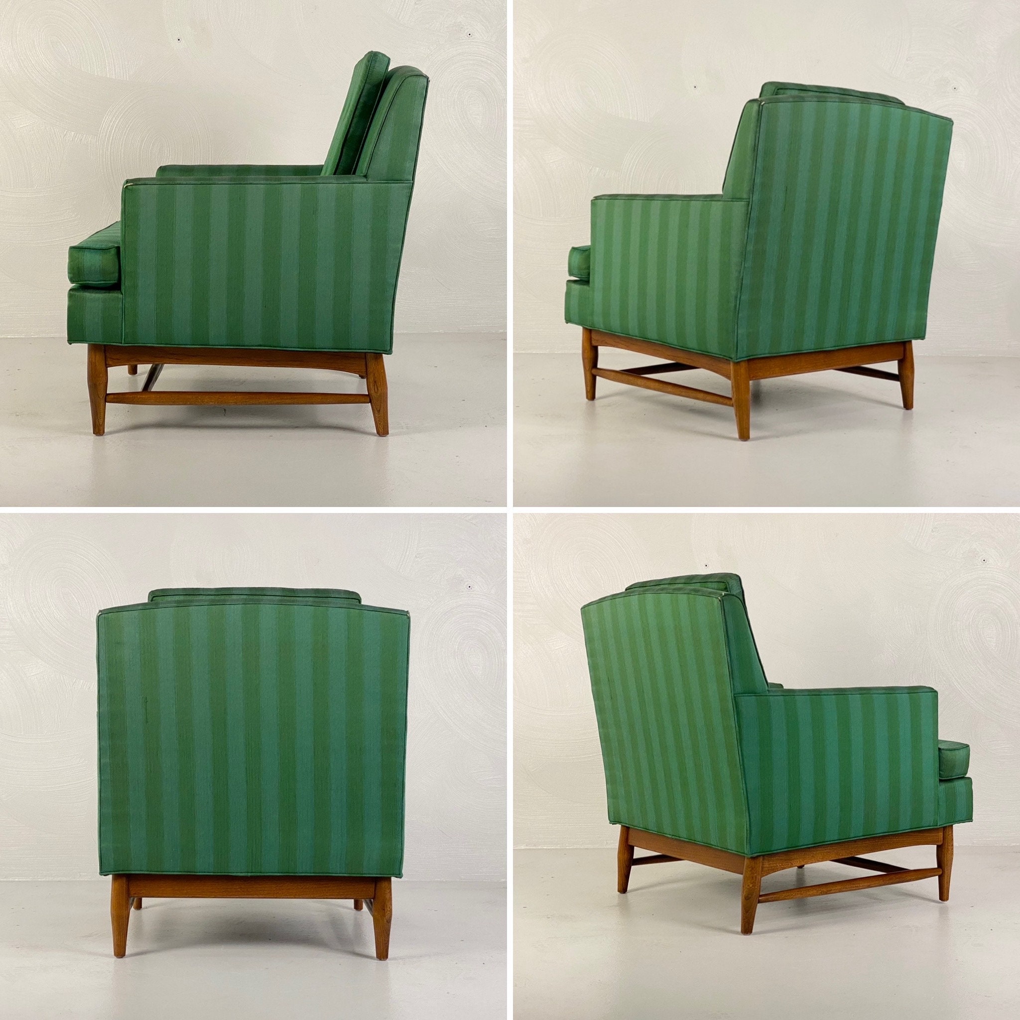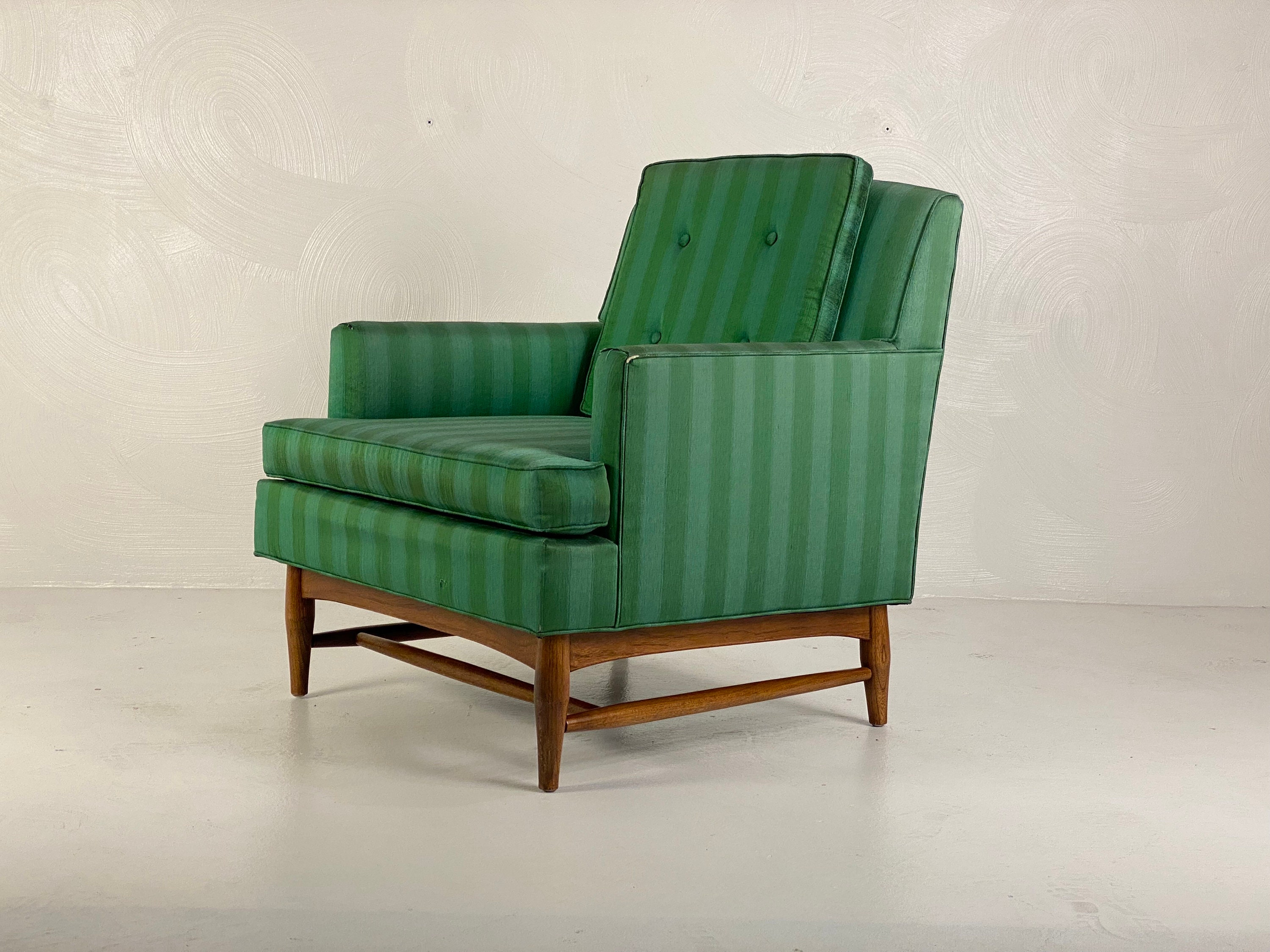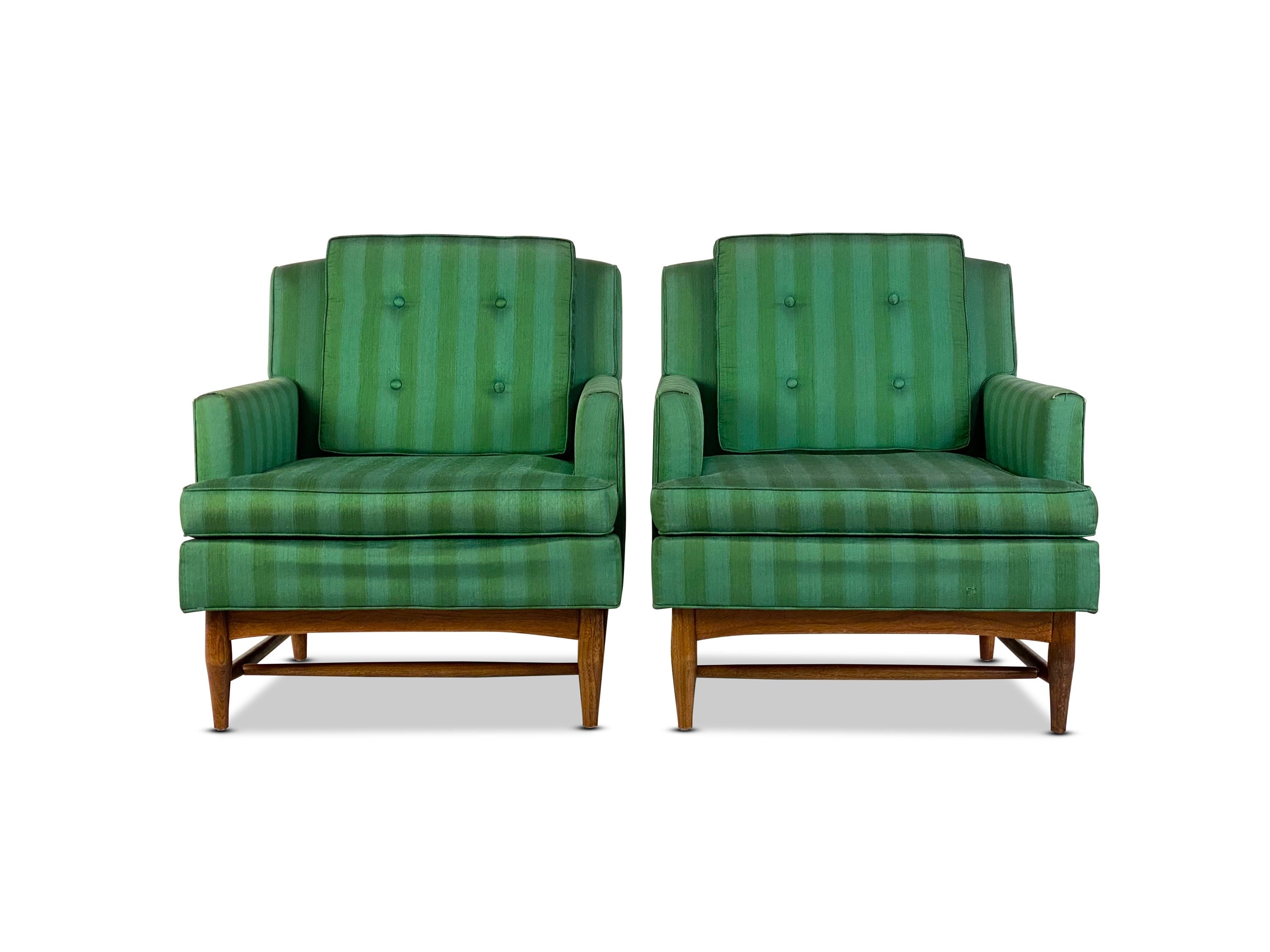 Here is a very nice and hard-to-find pair of high-quality lounge chairs in their original green-striped fabric by American of Martinsville, circa 1960s. Both chairs sit on a walnut wood frame with modern peg legs which ooze mid-century from every angle. These chairs are very well crafted and sit comfortably. The original upholstery does have a few signs of wear around the piping on the back corners and front armrests on both chairs. As seen in our last few photos, there is a consistent 2" tear on each armrest. Although clean and usable with some minor wear they would be an excellent candidate for reupholstering. Both lounge chairs are labeled by the maker.