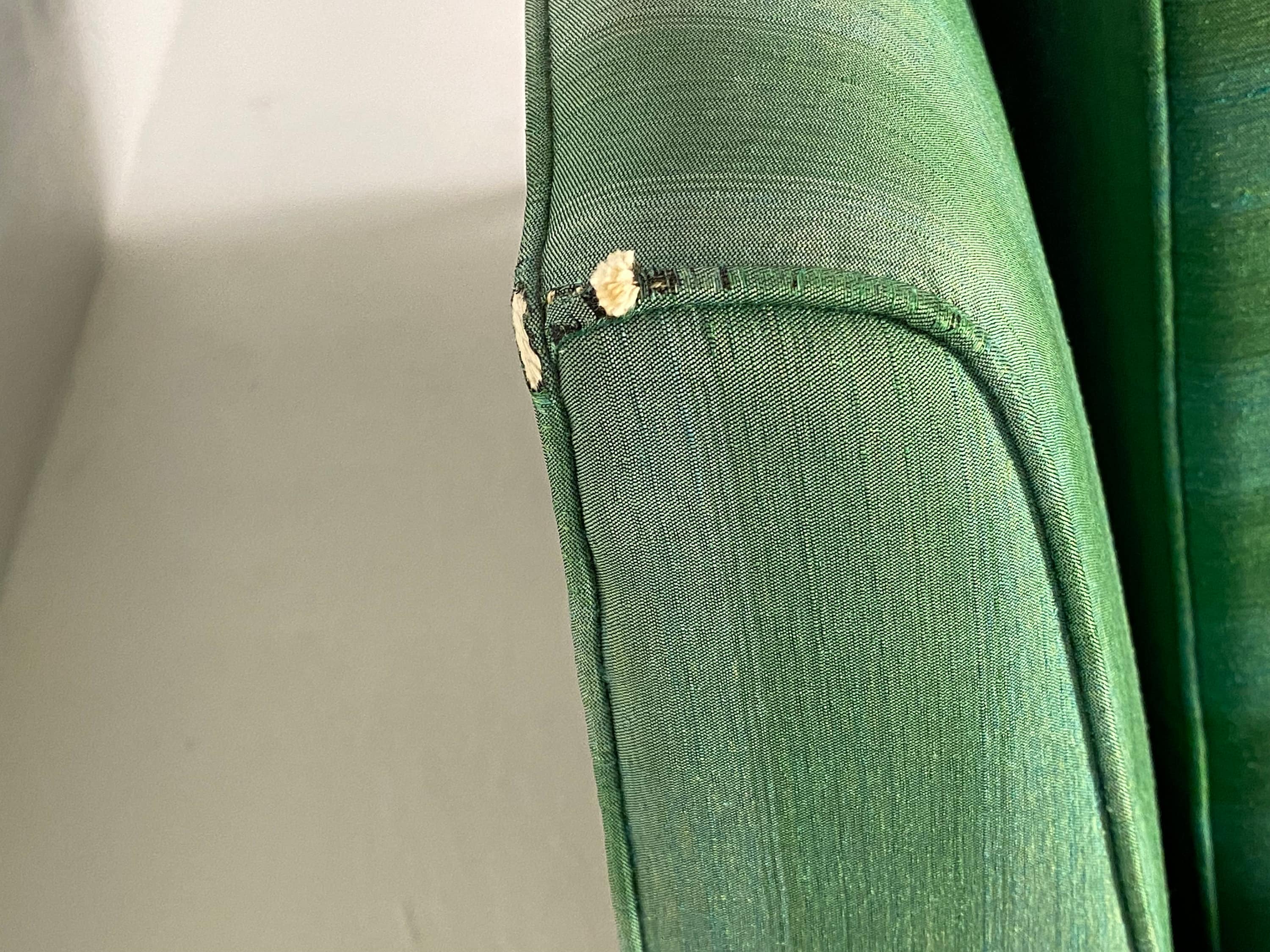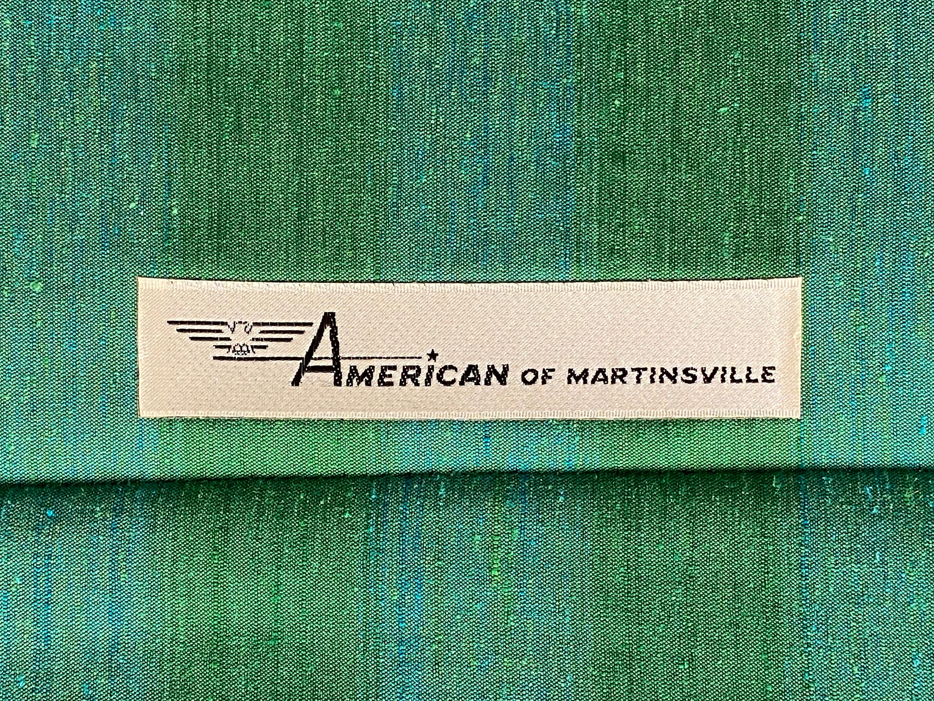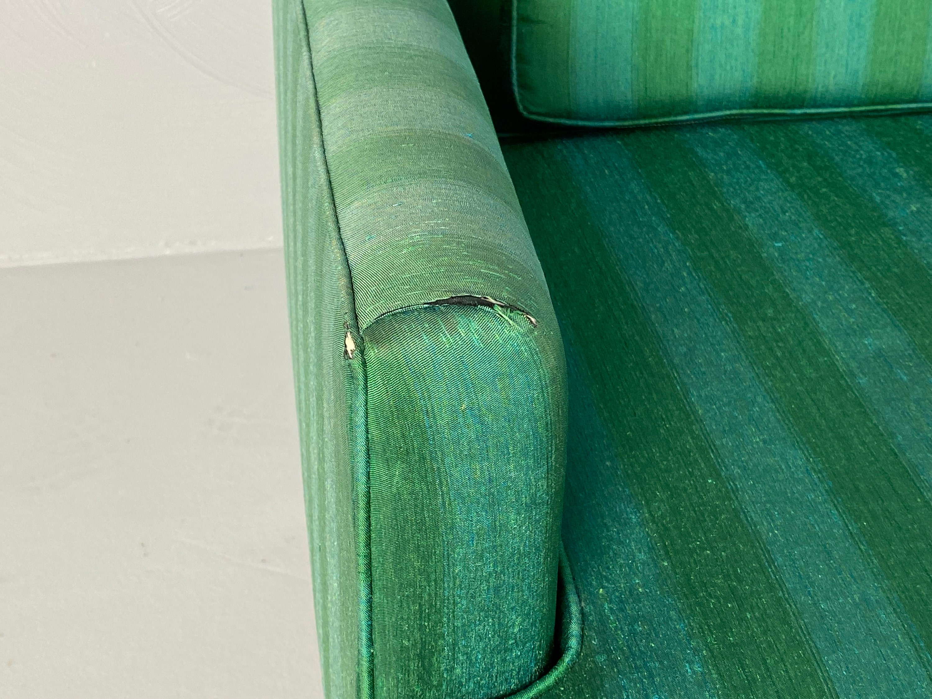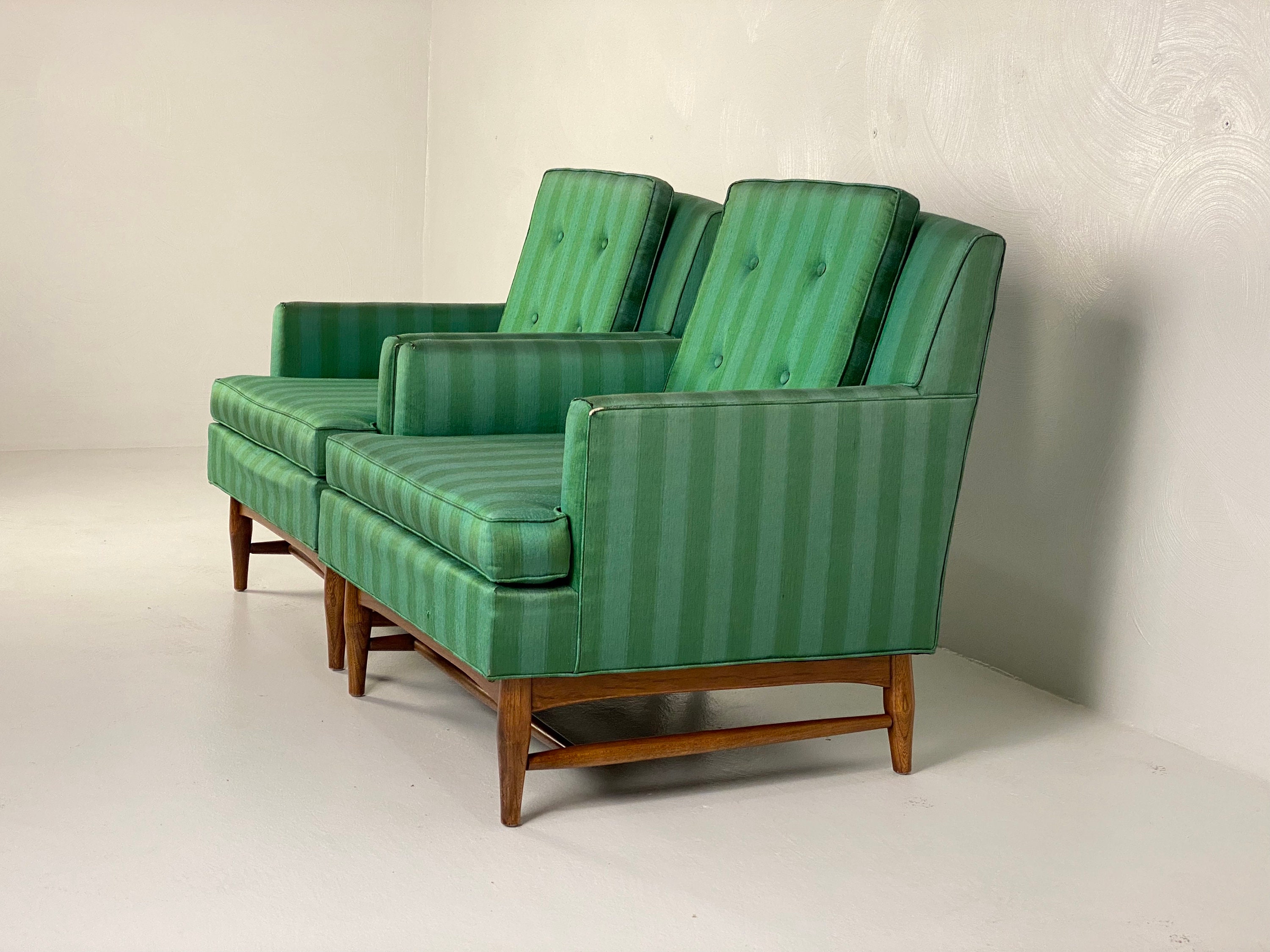 Here is a very nice and hard-to-find pair of high-quality lounge chairs in their original green-striped fabric by American of Martinsville, circa 1960s. Both chairs sit on a walnut wood frame with modern peg legs which ooze mid-century from every angle. These chairs are very well crafted and sit comfortably. The original upholstery does have a few signs of wear around the piping on the back corners and front armrests on both chairs. As seen in our last few photos, there is a consistent 2" tear on each armrest. Although clean and usable with some minor wear they would be an excellent candidate for reupholstering. Both lounge chairs are labeled by the maker.