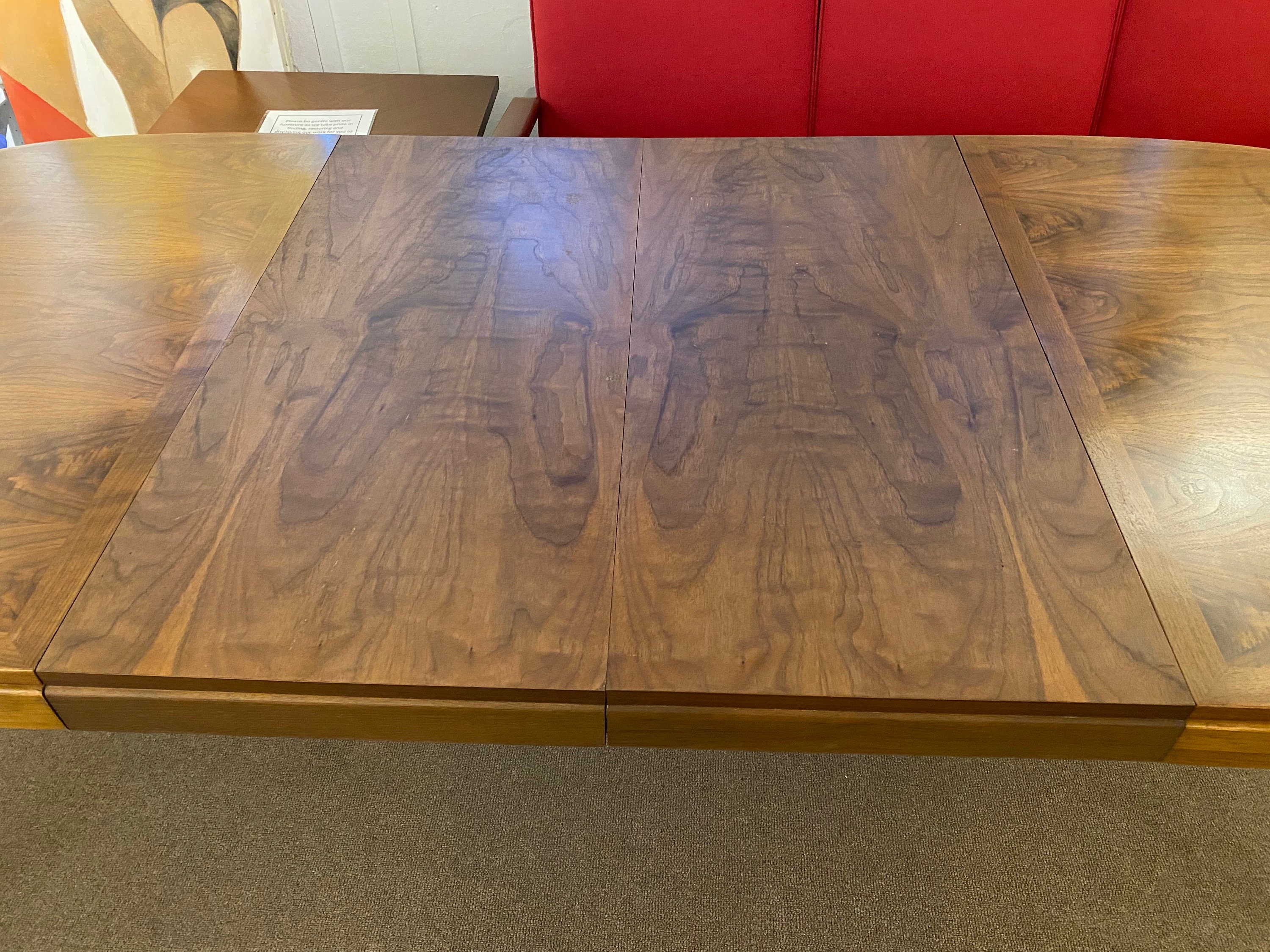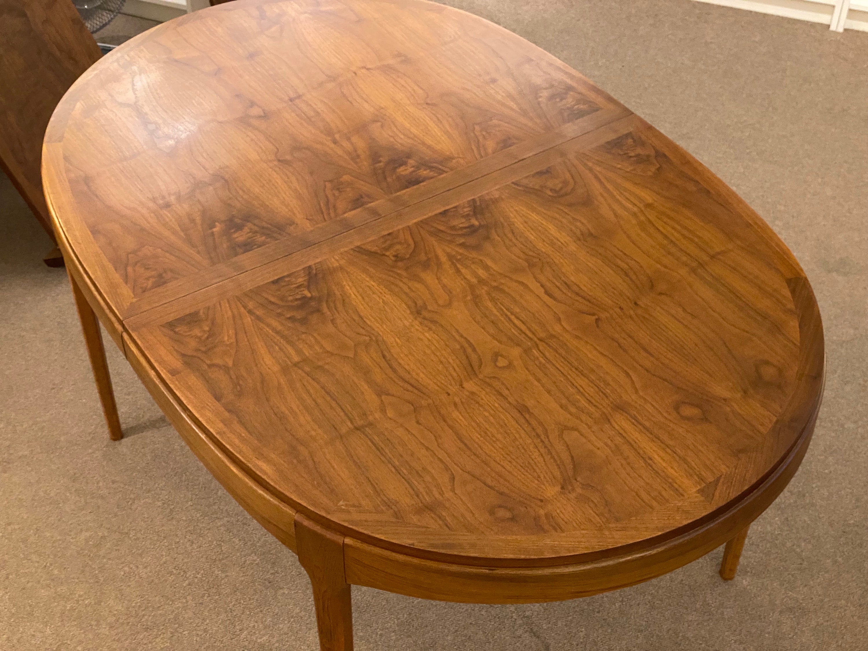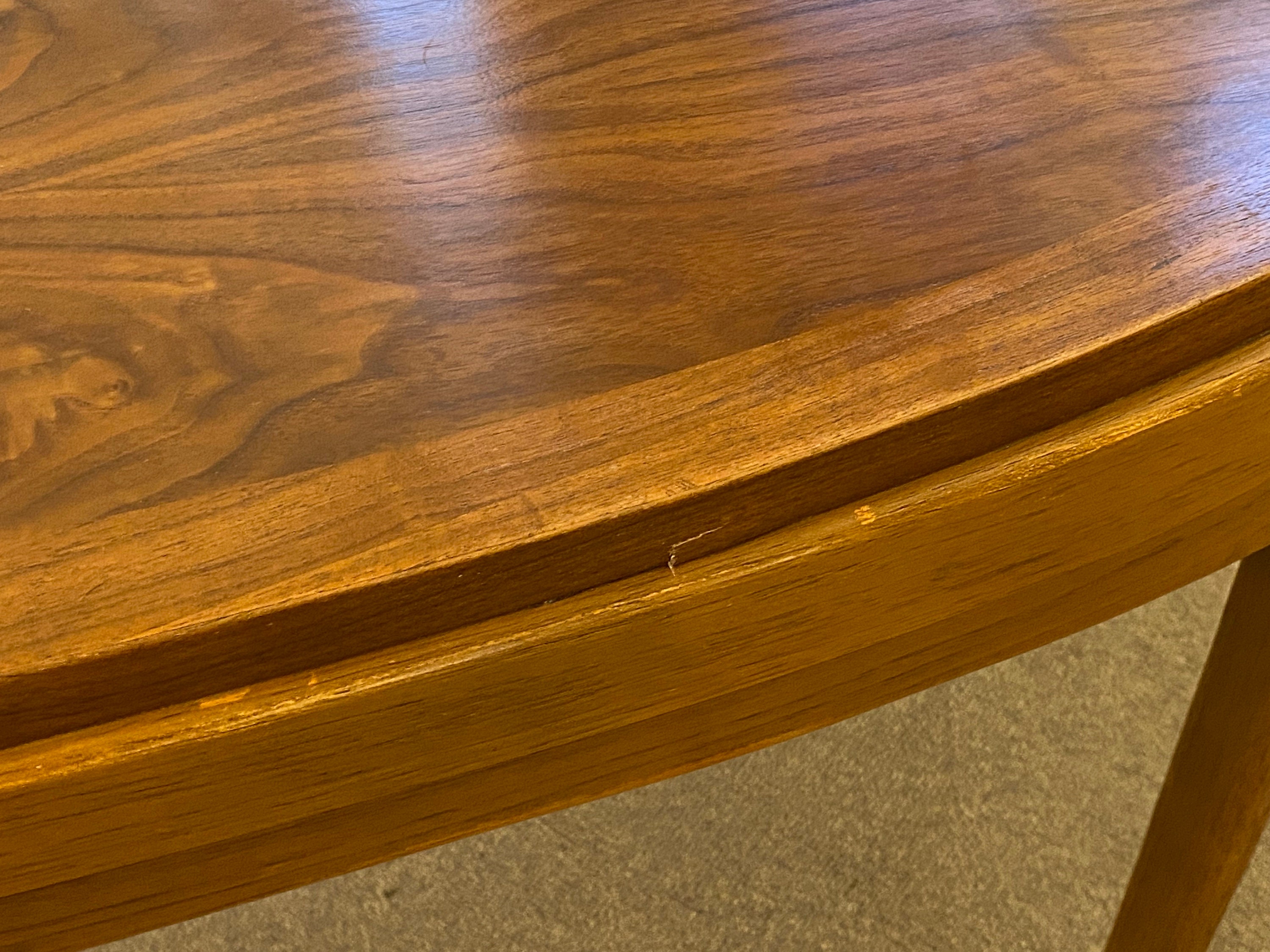 Here is a nicely preserved walnut dining table by Lane for their Rhythm collection, circa 1960s. This table showcases a beautiful wood grain and the tabletop is in original condition without any major issues. The table sits sturdily and holds up well when in use. This table does come with 2 apron leaves, these leaves were in storage for almost their entire lifetime and they are darker in color than the tabletop, they can be seen in our photos. One leaf does have a pinky nail size chip in the veneer on one corner. The tabletop does have a small part of the veneer pulling along the very edge, this does not seem to be loose or coming away from the table but we wanted to point that out in our last photo. Overall this table is in good condition for its age and was very well cared for during its lifetime. Please reach out if you have any further questions.