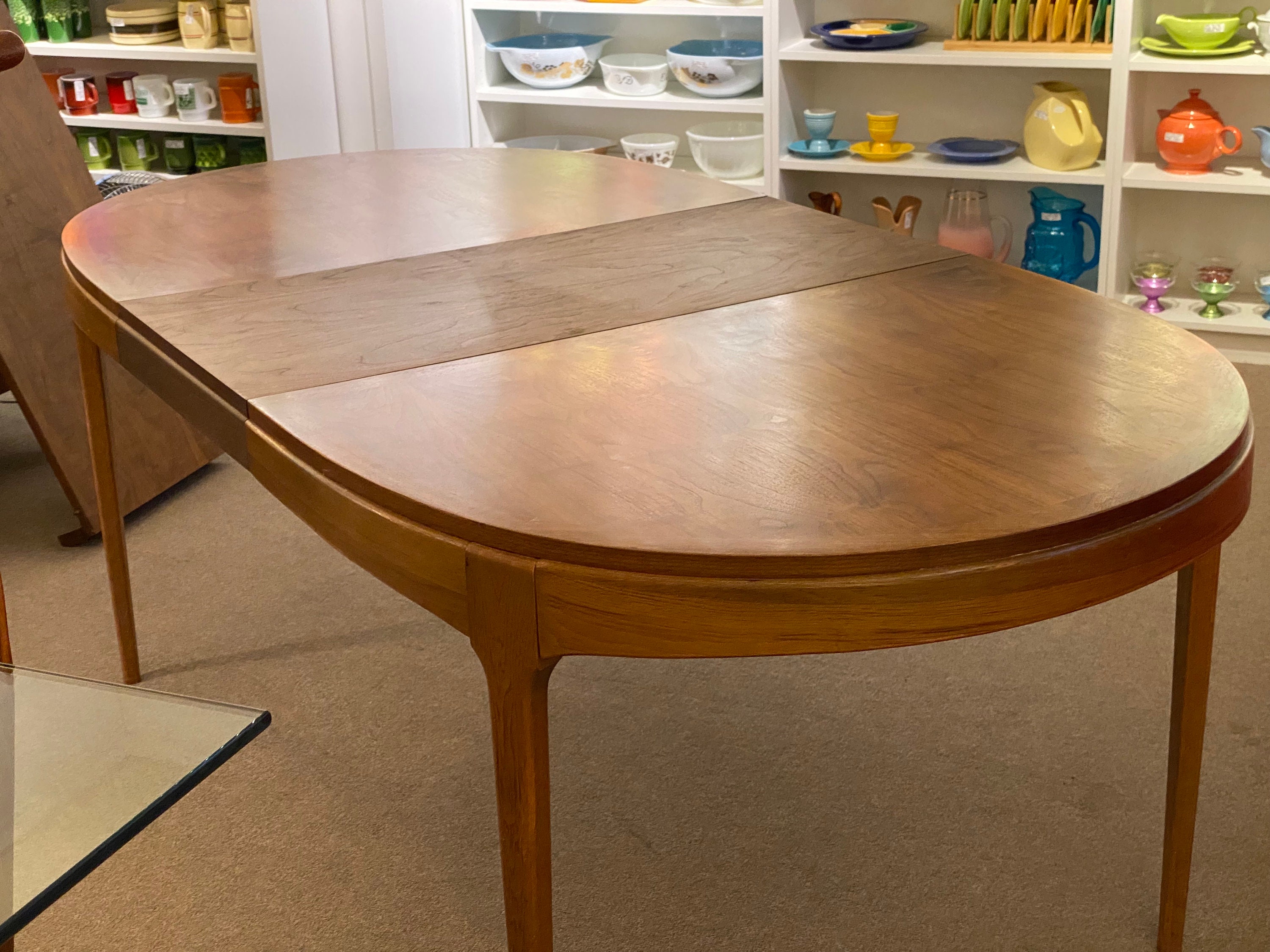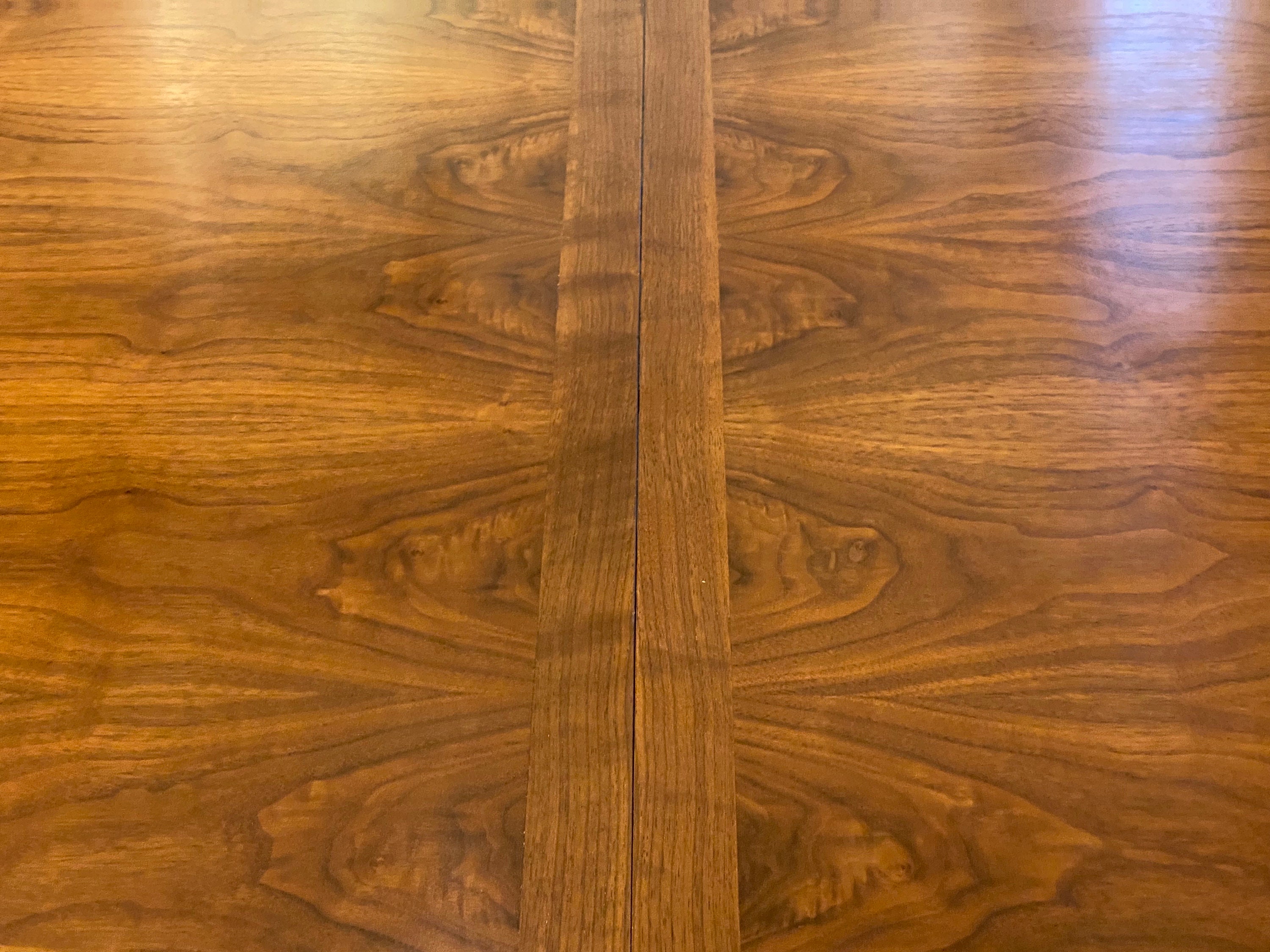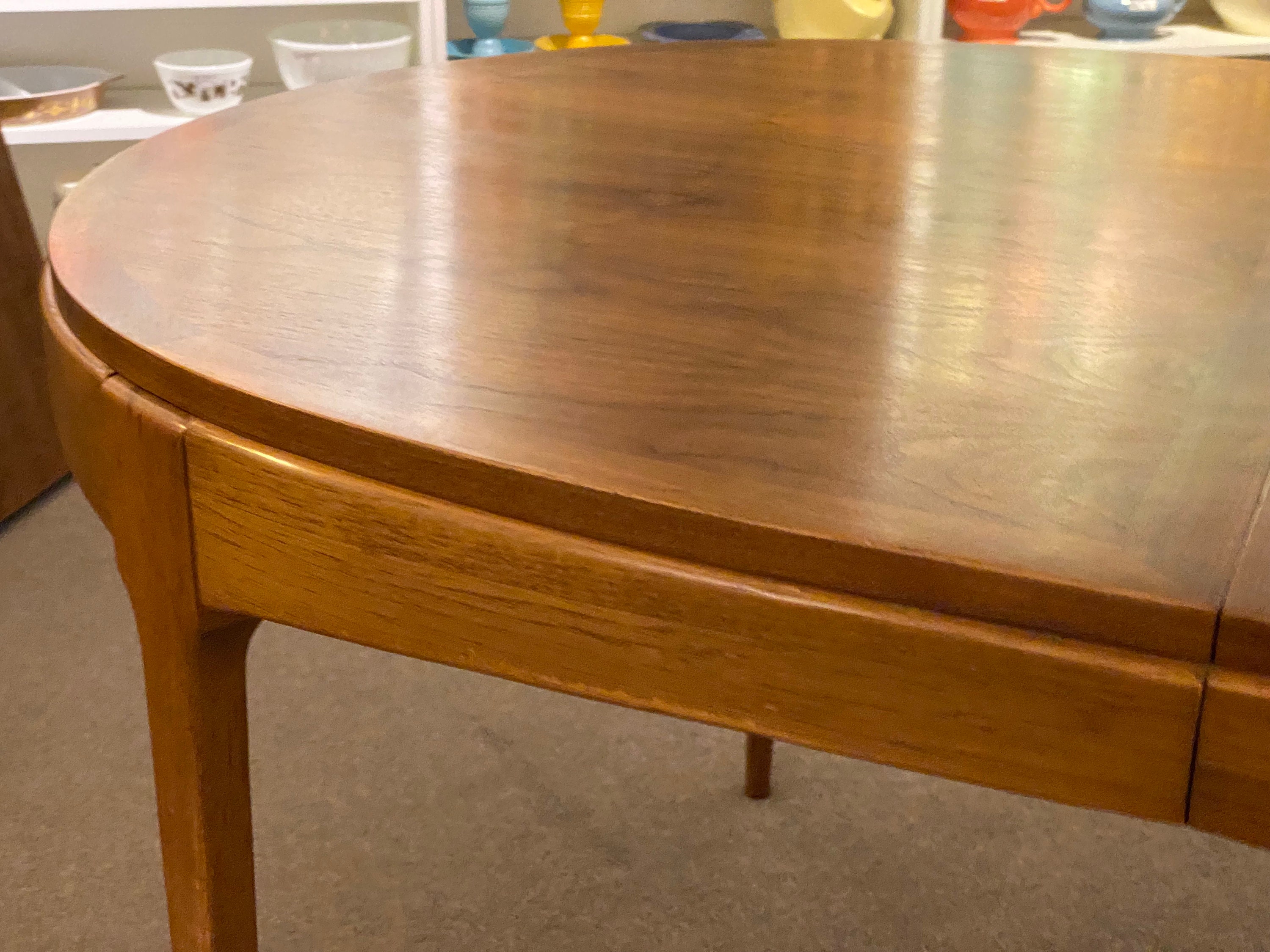 Here is a nicely preserved walnut dining table by Lane for their Rhythm collection, circa 1960s. This table showcases a beautiful wood grain and the tabletop is in original condition without any major issues. The table sits sturdily and holds up well when in use. This table does come with 2 apron leaves, these leaves were in storage for almost their entire lifetime and they are darker in color than the tabletop, they can be seen in our photos. One leaf does have a pinky nail size chip in the veneer on one corner. The tabletop does have a small part of the veneer pulling along the very edge, this does not seem to be loose or coming away from the table but we wanted to point that out in our last photo. Overall this table is in good condition for its age and was very well cared for during its lifetime. Please reach out if you have any further questions.