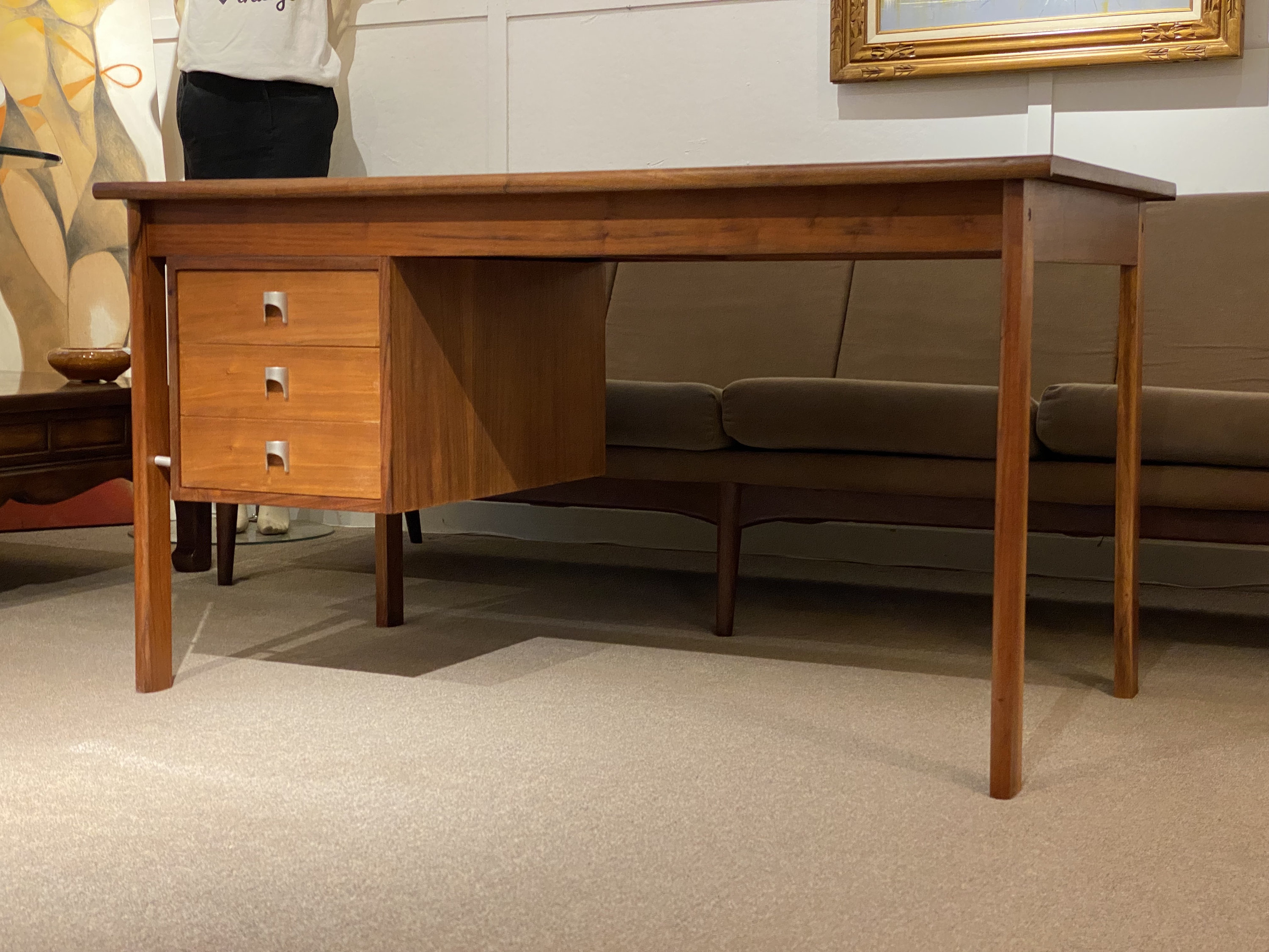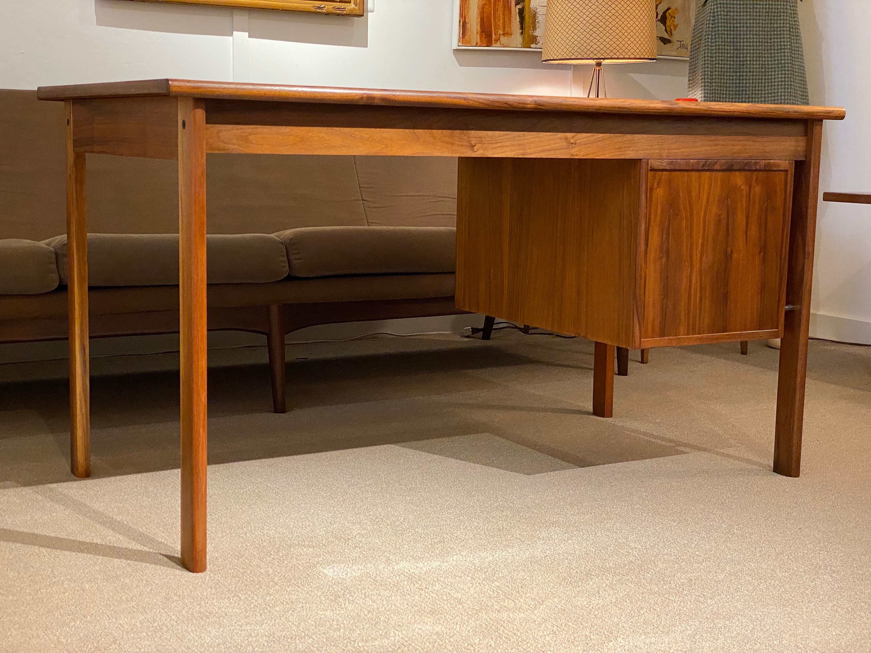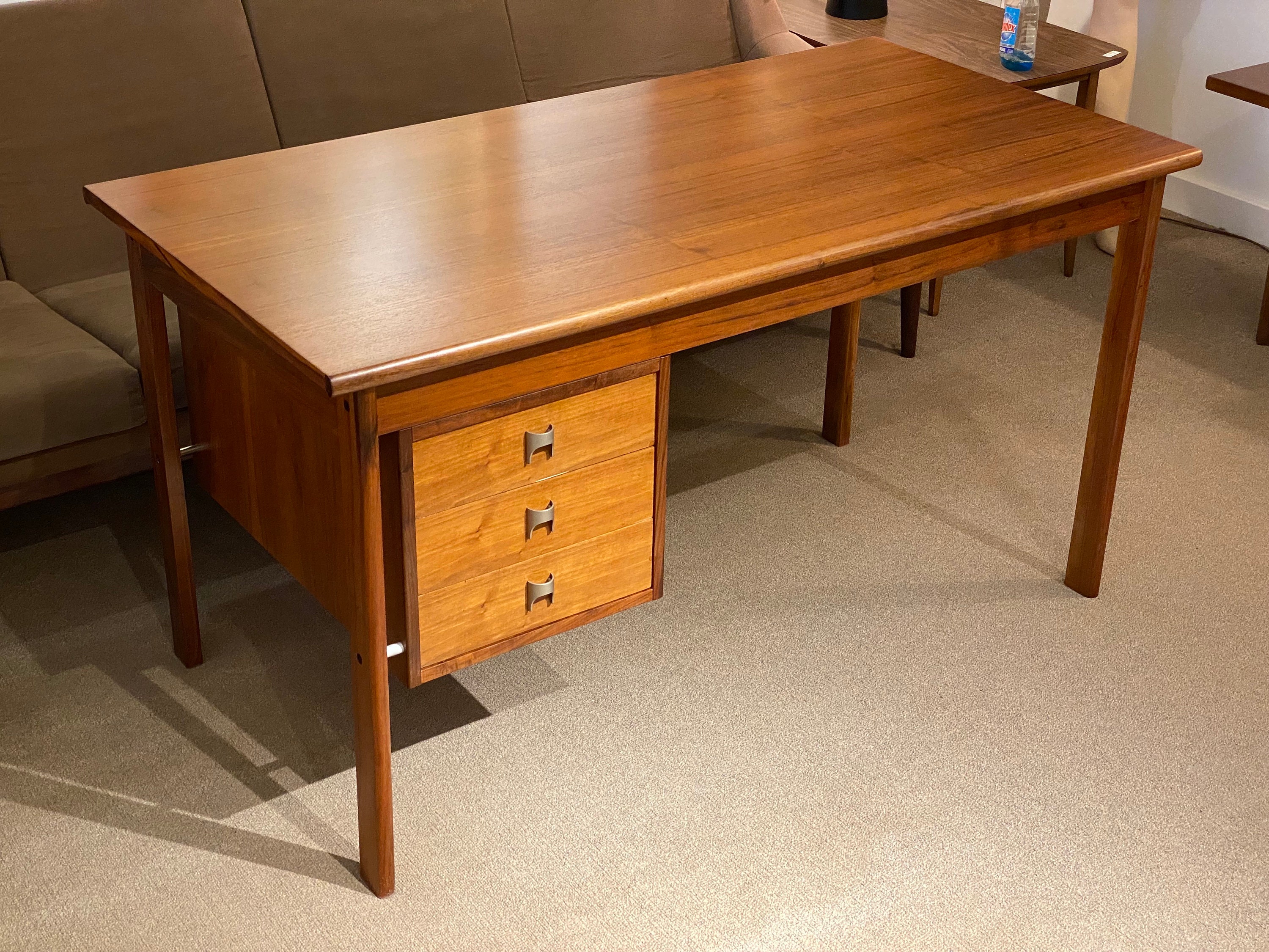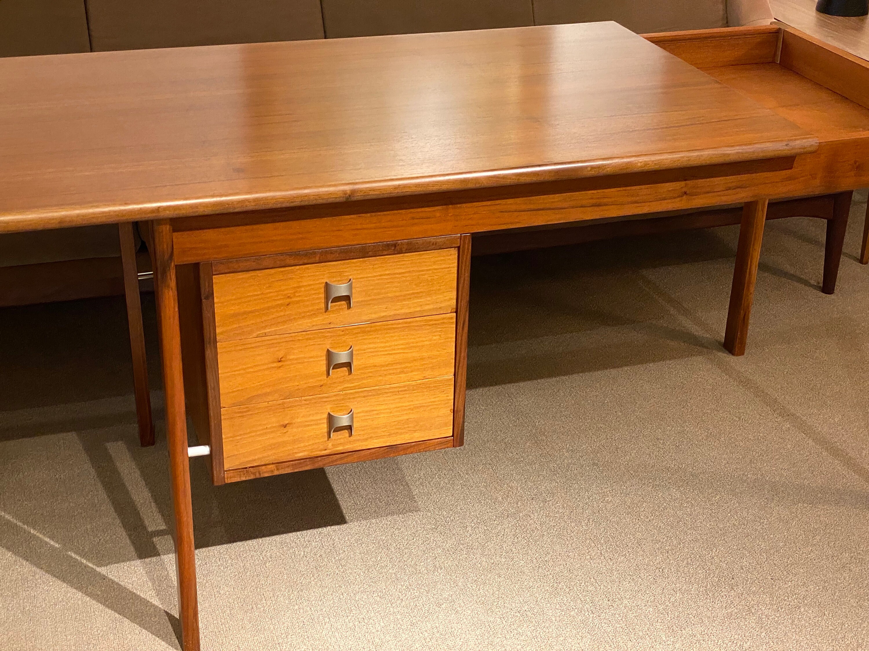 Here is a beautifully restored Danish teak desk by Peter Løvig Nielsen, circa 1960s. Løvig designed pieces were made from the finest woods available in the mid-century era, this particular desk showcases a stunning teak woodgrain throughout the piece, the tabletop in particular has a rich teak wood look along with a sliding feature that hides a compartment on each side underneath the desktop. A part of one wooden bracket underneath the desk which allows the desktop to slide was broken in half on one side but this doesn't affect the top from sliding smoothly with ease. We stripped and sanded this piece down to its bare wood to remove about 95% of the imperfections and gave the entire piece an oil-rubbed finish to bring out the wood grain. One of the chrome braces on the side of the drawers was replaced in the restoration process. The drawers all glide with ease and overall this piece is in good restored condition. This desk is marked "Made in Denmark".