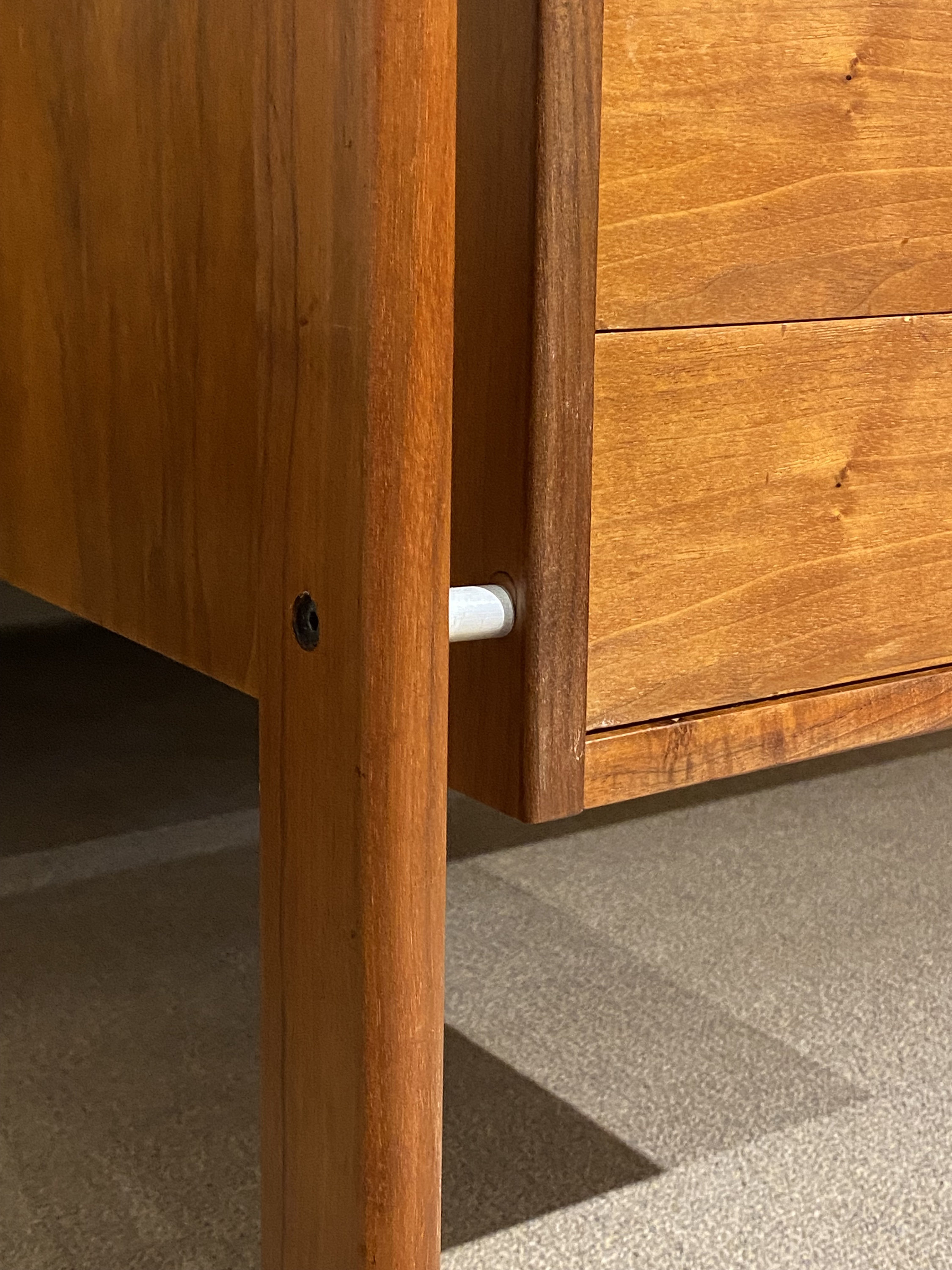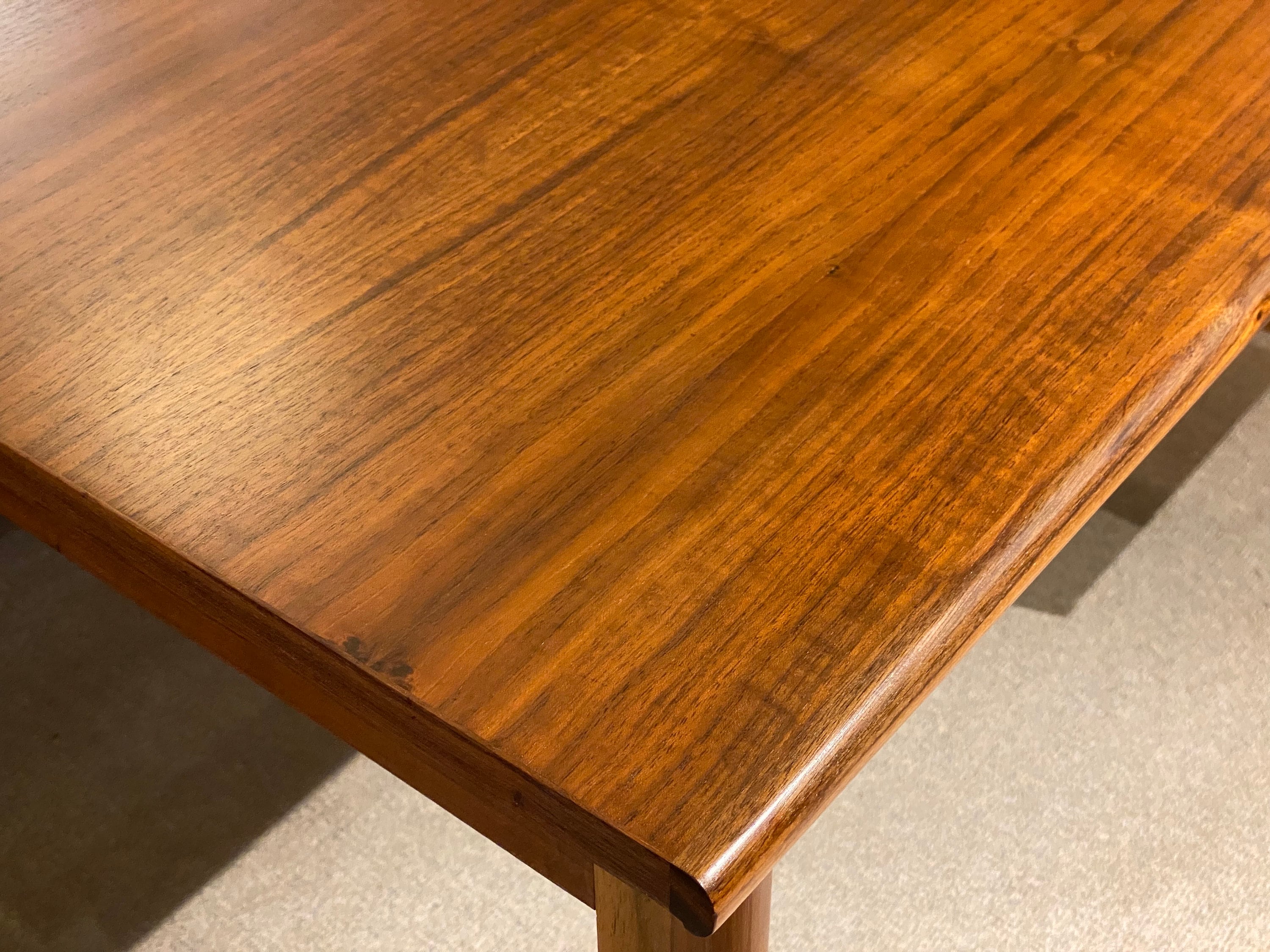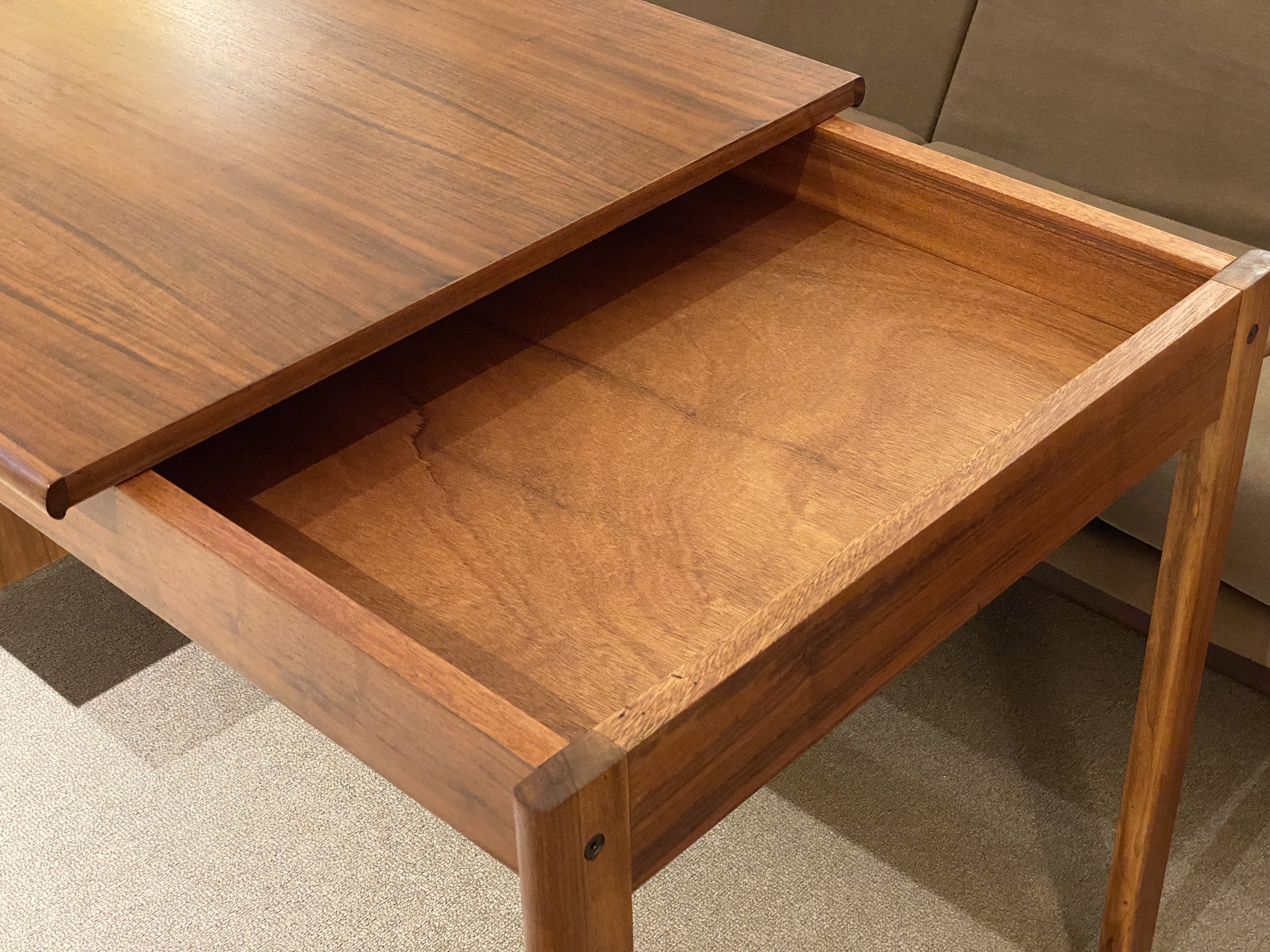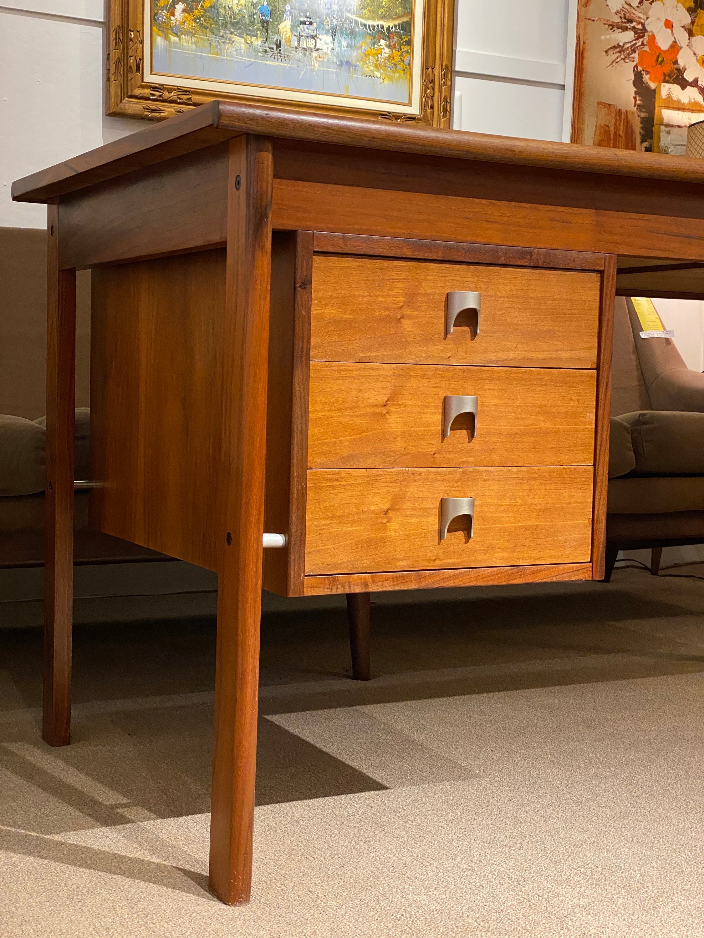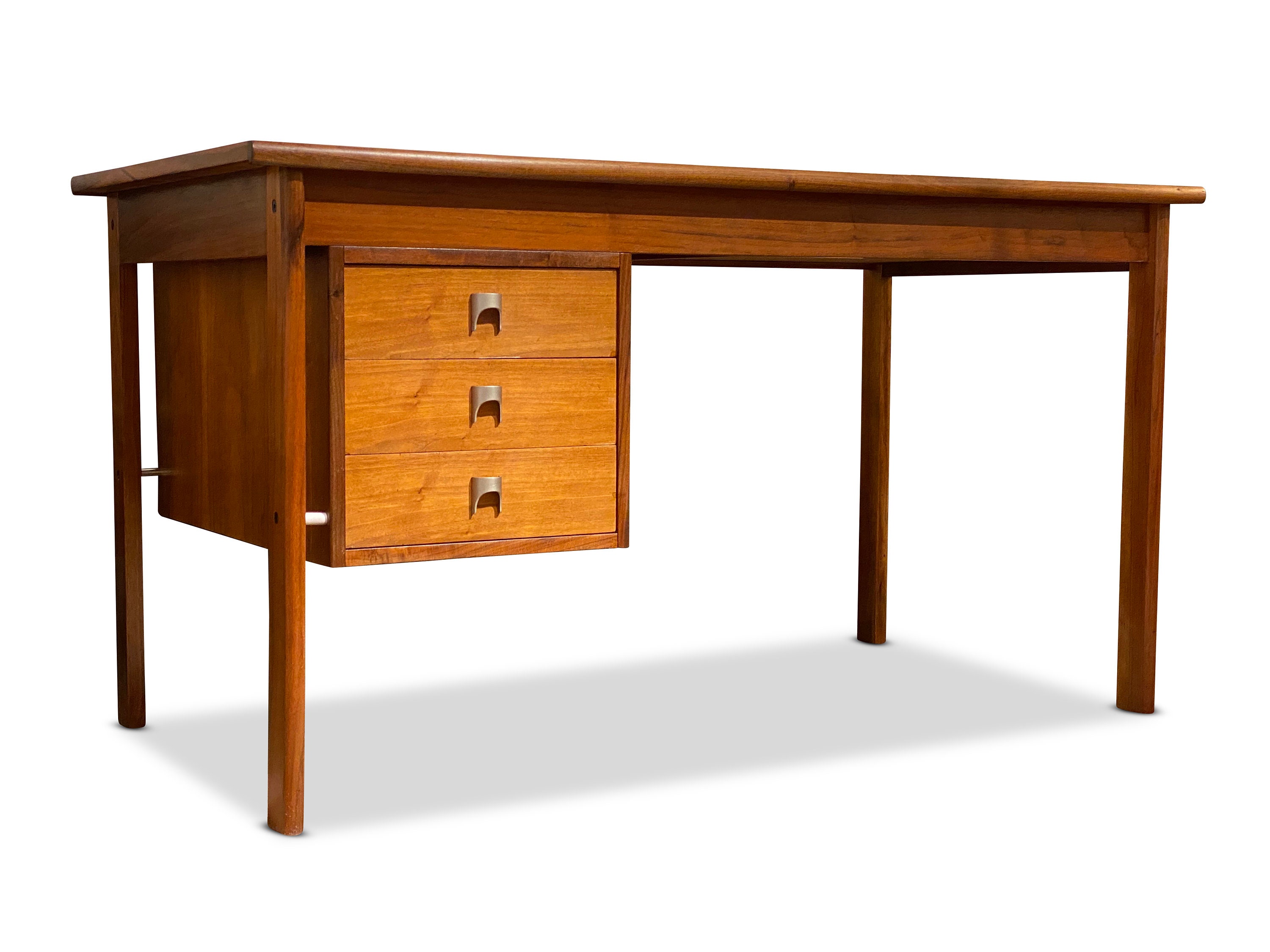 Here is a beautifully restored Danish teak desk by Peter Løvig Nielsen, circa 1960s. Løvig designed pieces were made from the finest woods available in the mid-century era, this particular desk showcases a stunning teak woodgrain throughout the piece, the tabletop in particular has a rich teak wood look along with a sliding feature that hides a compartment on each side underneath the desktop. A part of one wooden bracket underneath the desk which allows the desktop to slide was broken in half on one side but this doesn't affect the top from sliding smoothly with ease. We stripped and sanded this piece down to its bare wood to remove about 95% of the imperfections and gave the entire piece an oil-rubbed finish to bring out the wood grain. One of the chrome braces on the side of the drawers was replaced in the restoration process. The drawers all glide with ease and overall this piece is in good restored condition. This desk is marked "Made in Denmark".