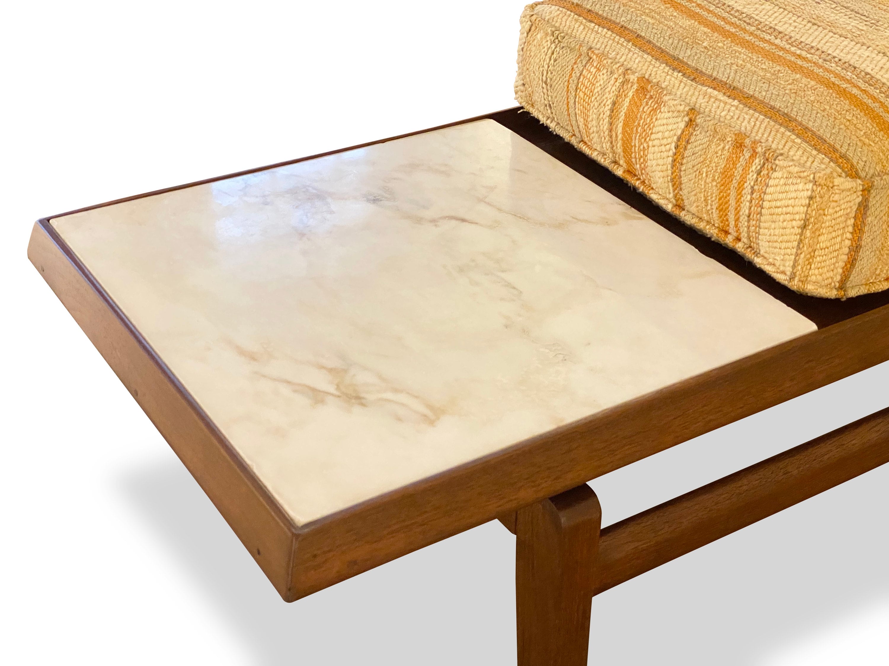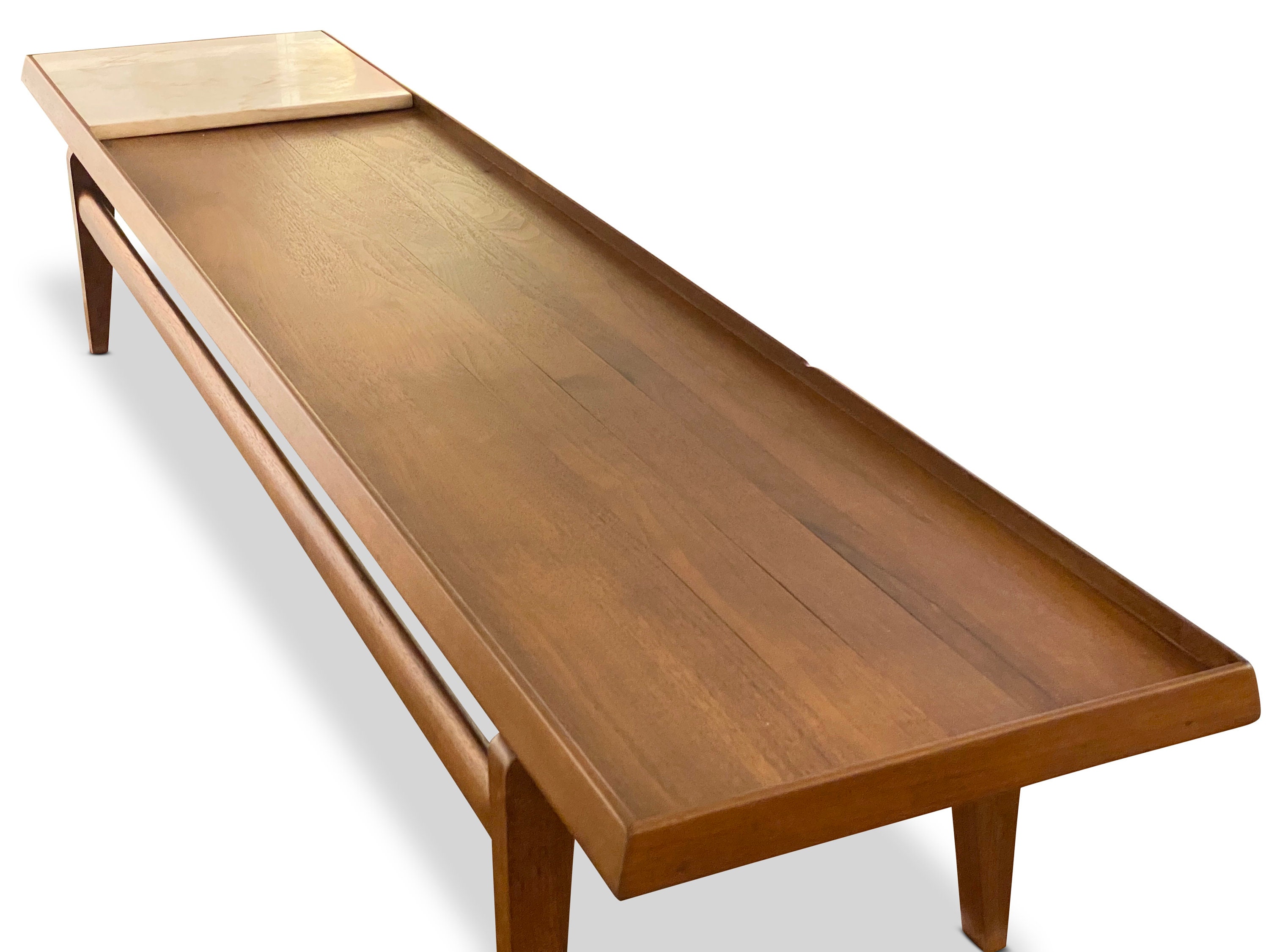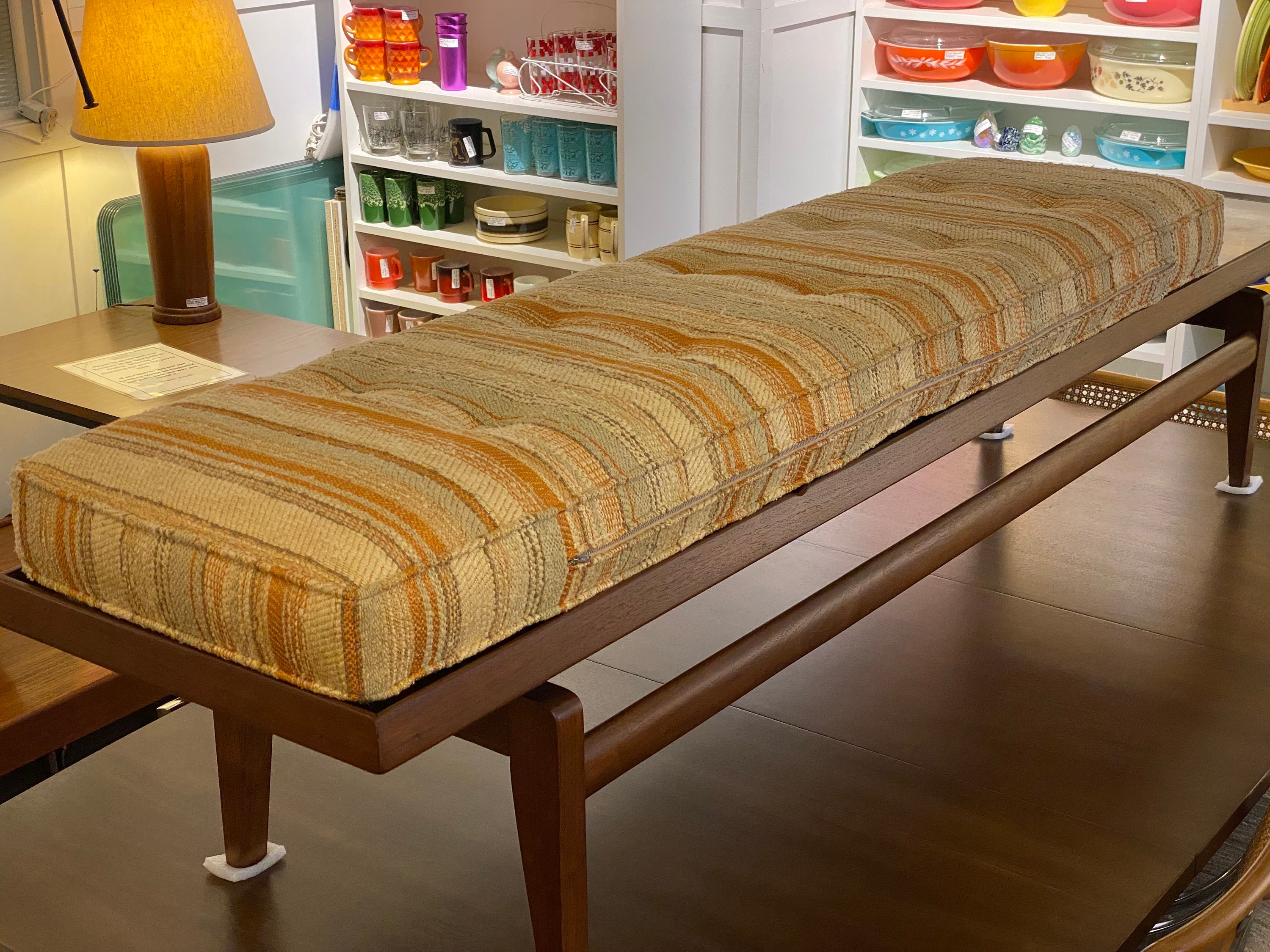 Here is a very nicely restored solid walnut 78" long custom bench, circa 1960s. This bench has a 16" x 16" solid piece of white marble on one side and a 61" long original cushion in good condition on the other side. This long bench was made from solid walnut wood and the woodgrain showcases very well throughout the piece. This bench was made locally in York by a carpenter who worked at a local furniture manufacturer in the early 1960s, this piece presents a similar design to benches by Jens Risom of that same era. There is a possibility that this piece was made at the Thonet factory here in York but according to the original owner he made this piece himself. This piece is heavy and was fully stripped down to the bare wood, sanded, and a new walnut finish applied. We also added 2 new dowels to the interior of one leg and this piece sits very sturdily. The marble was polished to bring out its shine but it does show some wear from age. The 61" long cushion is free from tears or stains and is in decent condition for its age. Our photos do not do this piece justice and if you are looking for a long bench that oozes mid-century modern check this out soon. Please reach out if you have any questions - thank you!