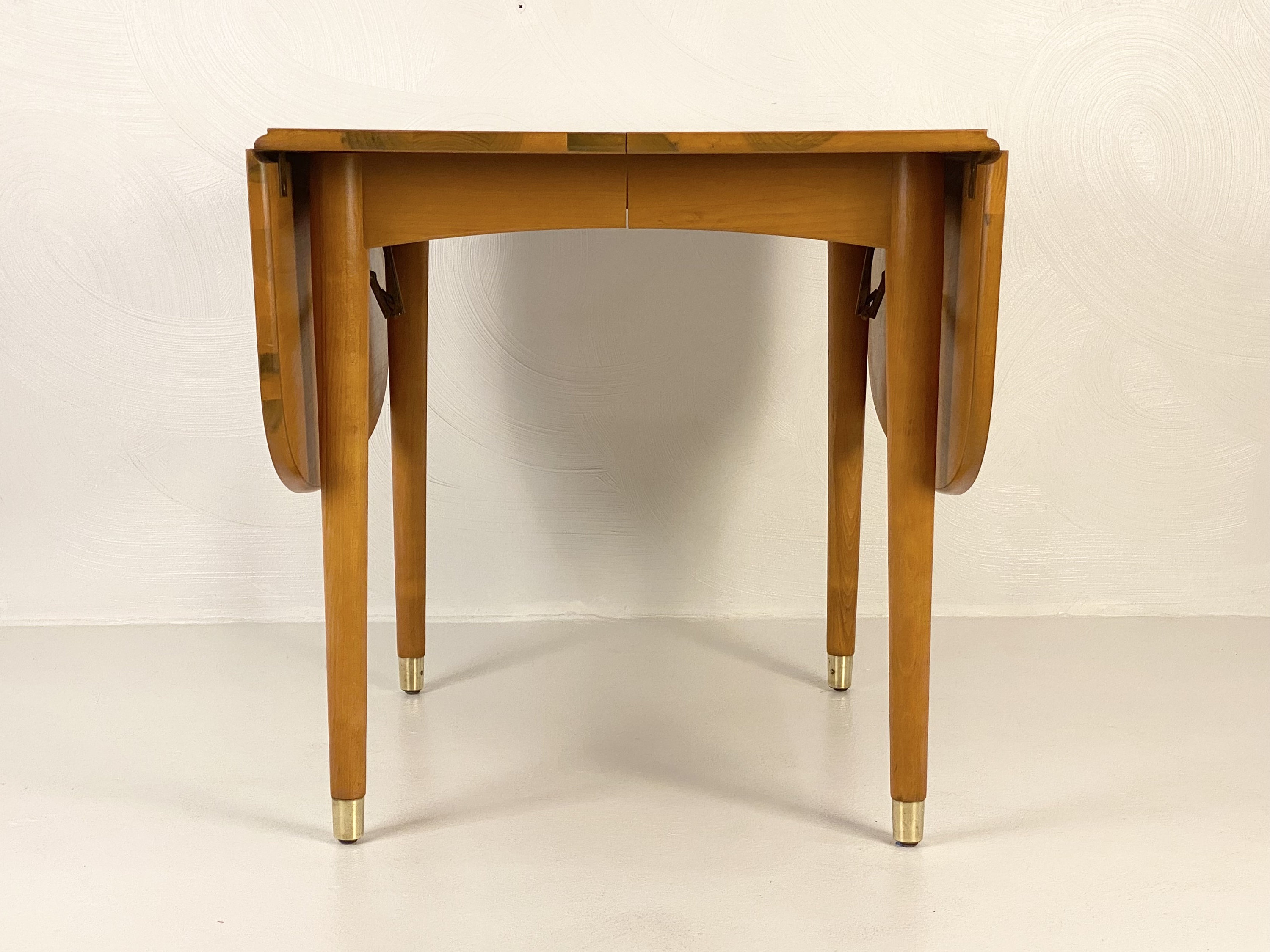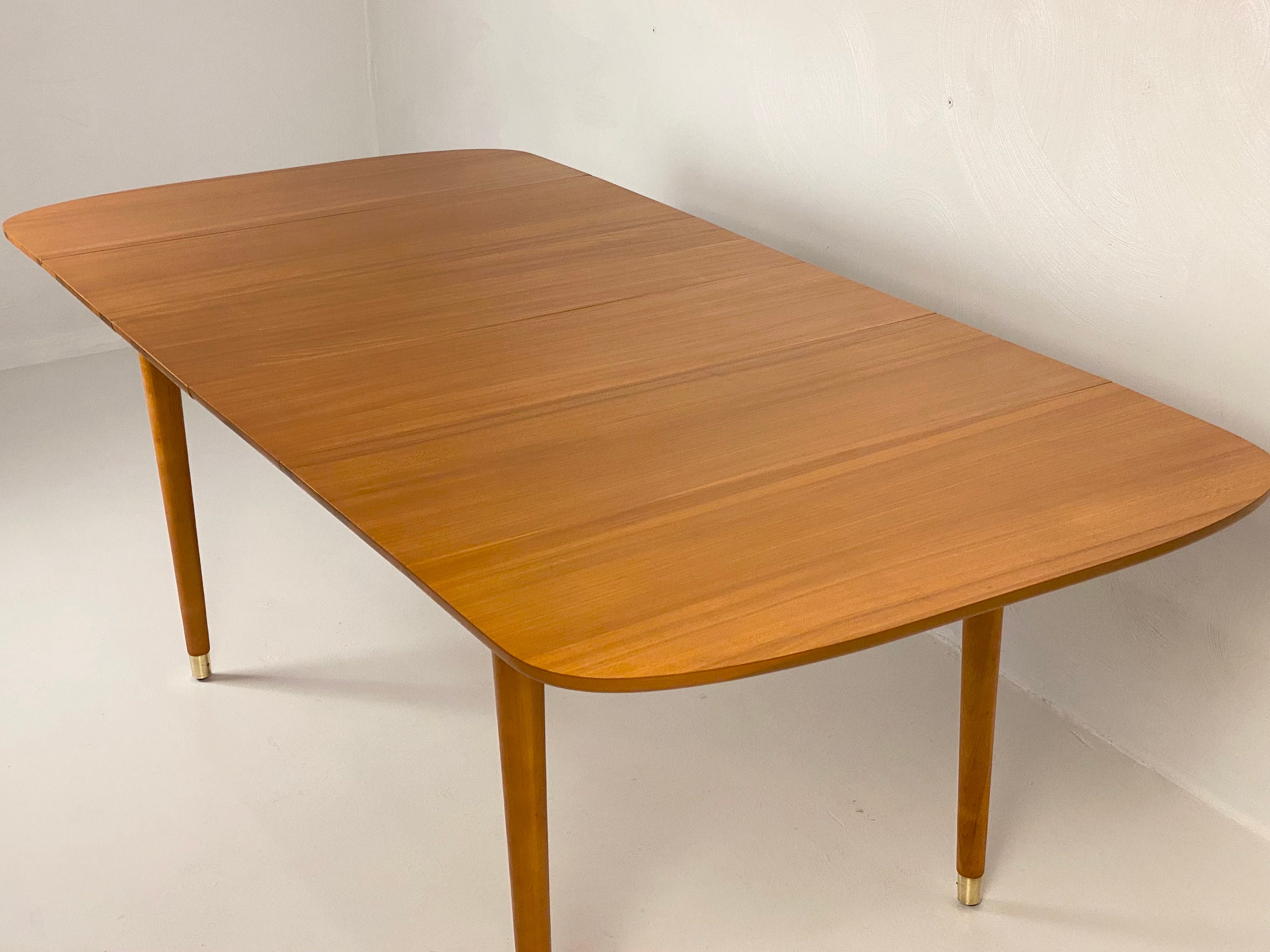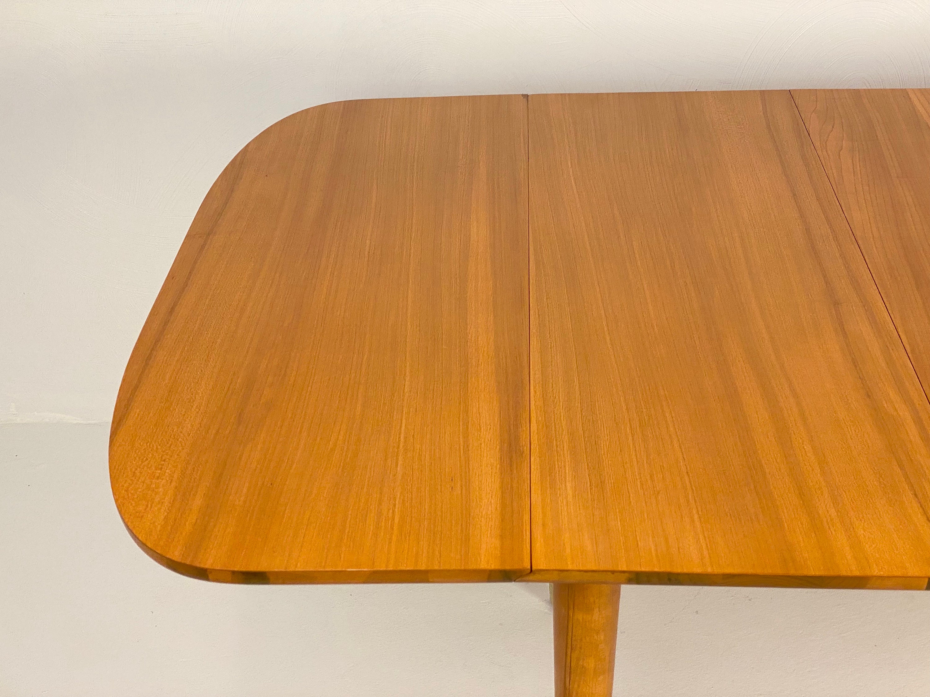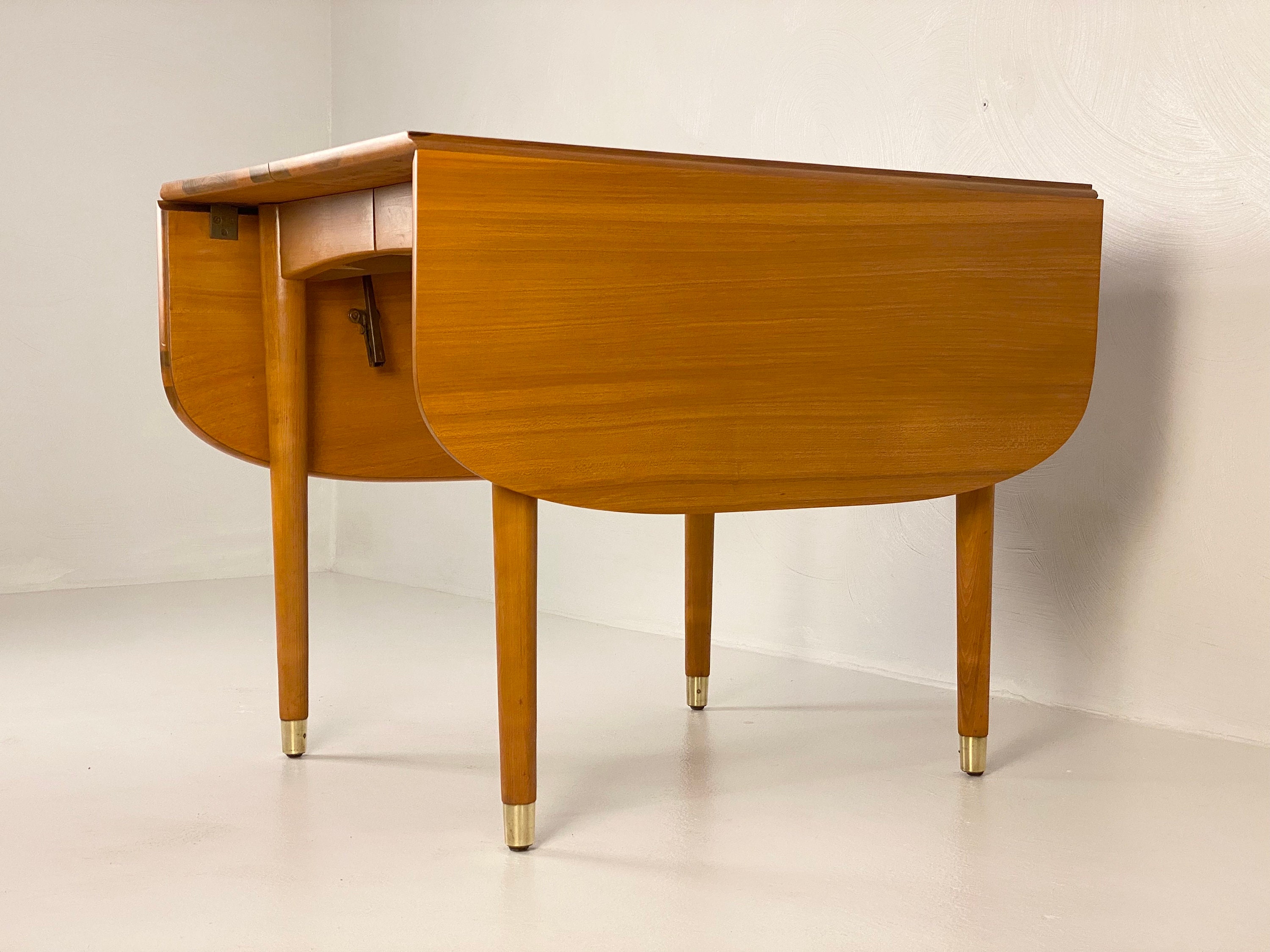Here is a fully restored drop leaf extension dining table by Milo Baughman for Drexel, Circa 1950s. This extension drop leaf dining table was restored to match its original look and feel. In the restoration process, we removed any scratches or blemishes on both the table and the 2 leaf inserts. There is one very small bit of wear on one side of the table that can be seen in our last image but overall this piece turned out very nice. This piece was designed by Milo Baughman for Drexel's "New Today's Living" line in the 1950s. Crafted from elm wood and showcasing a very clean simple design, exceptional bookmatched woodgrain, and superior quality throughout the piece. This table would be perfect for a smaller dining room or apartment as it can be configured in many different ways allowing it to be fully extended to 80" in length when entertaining. The leg tips are solid brass which adds a hint of elegance to the design and the leg tips cleaned up very well. The table top does sit sturdily, the center and drop leaves do close easily and the table retains its original factory latch underneath along with the Drexel markings. Please feel free to reach out if you have any further questions on this piece and thanks for looking!