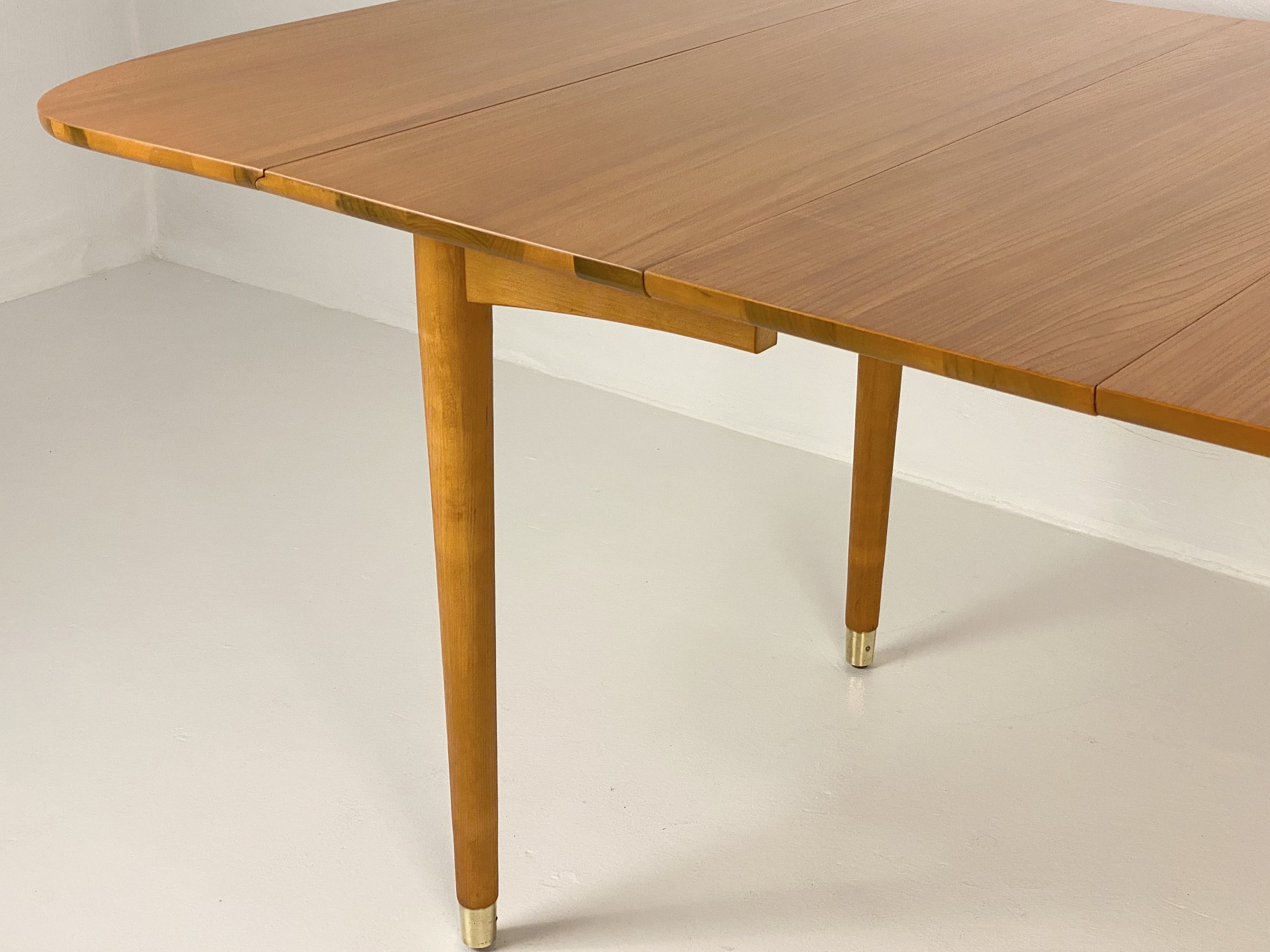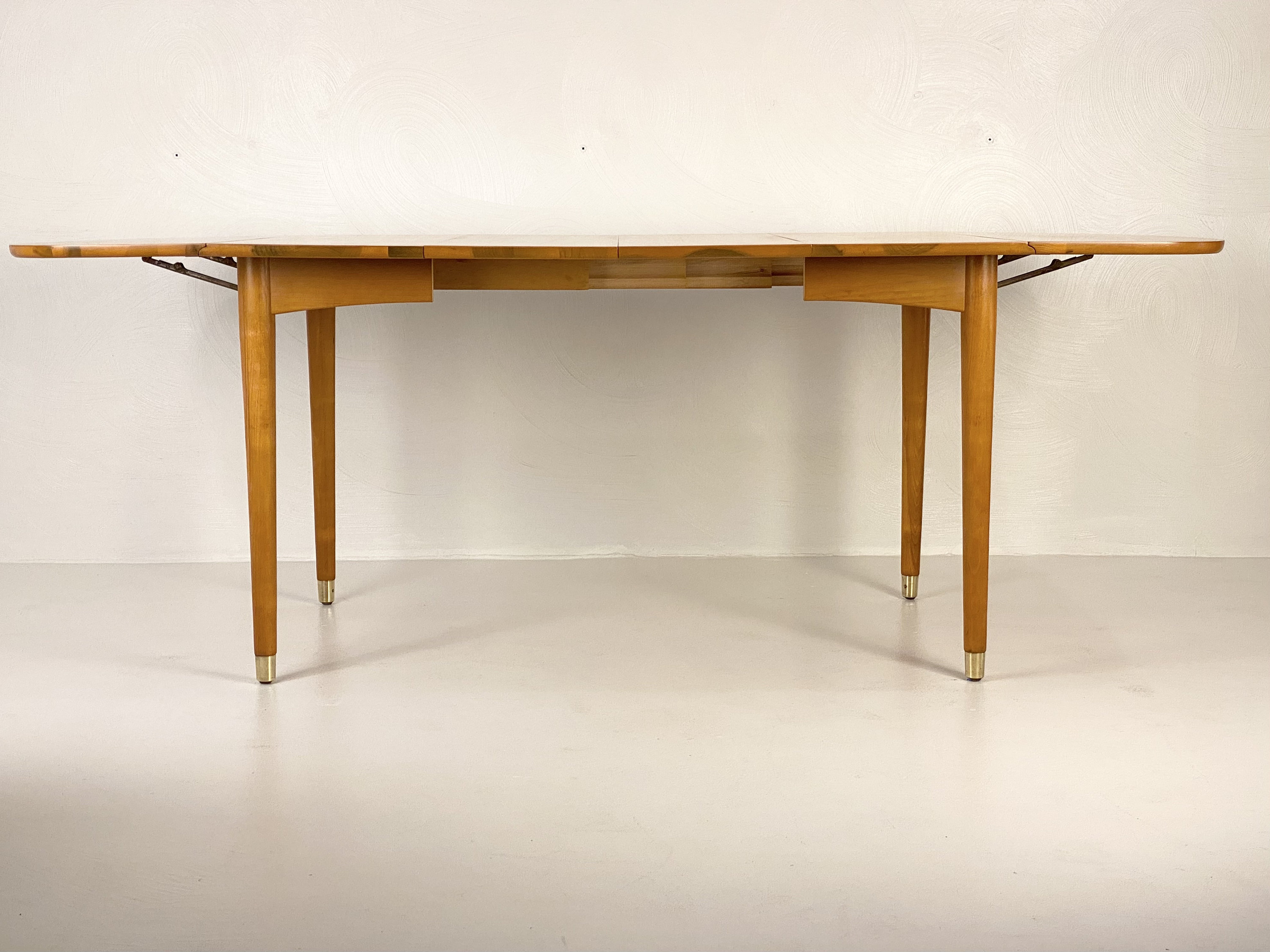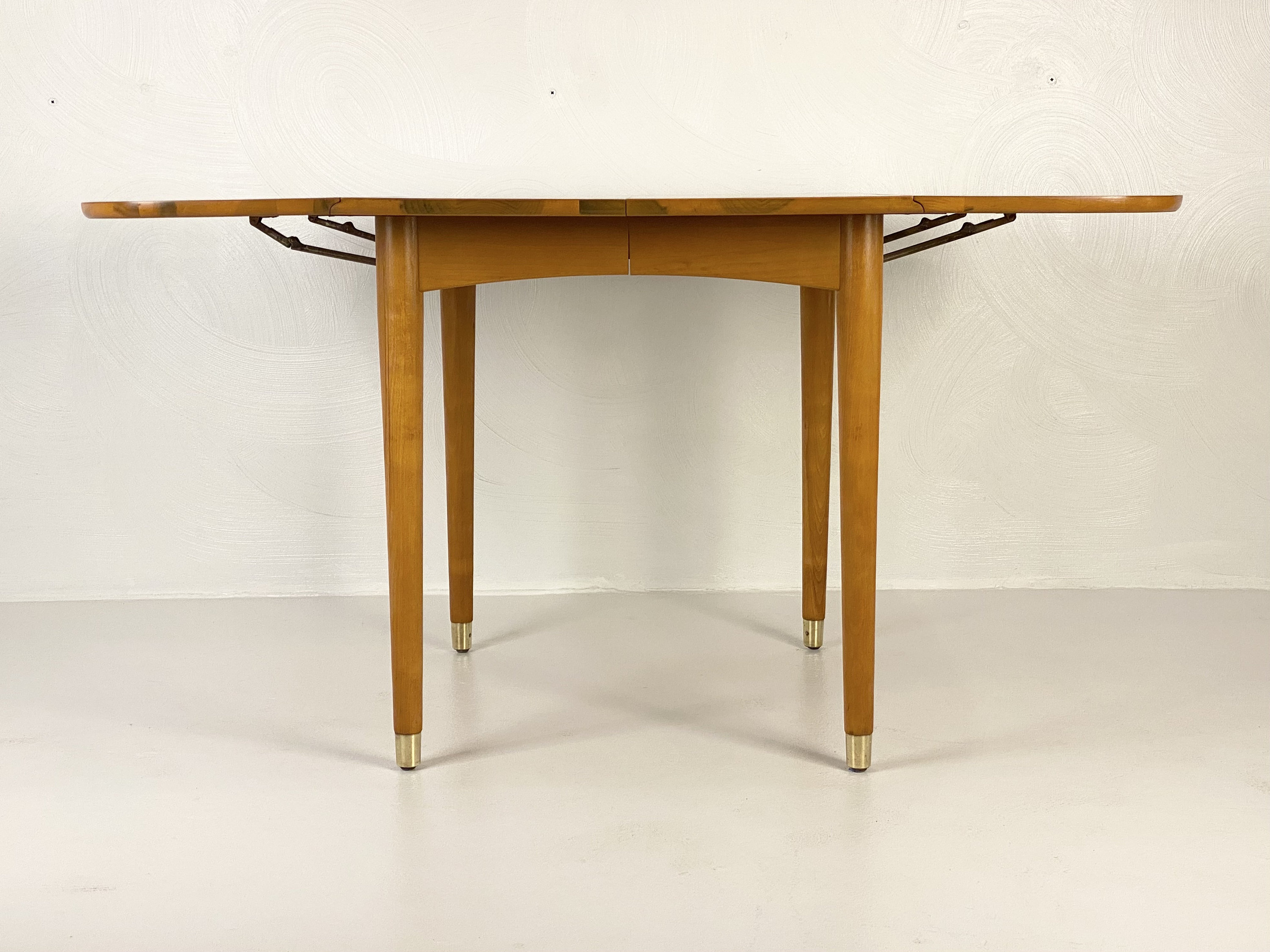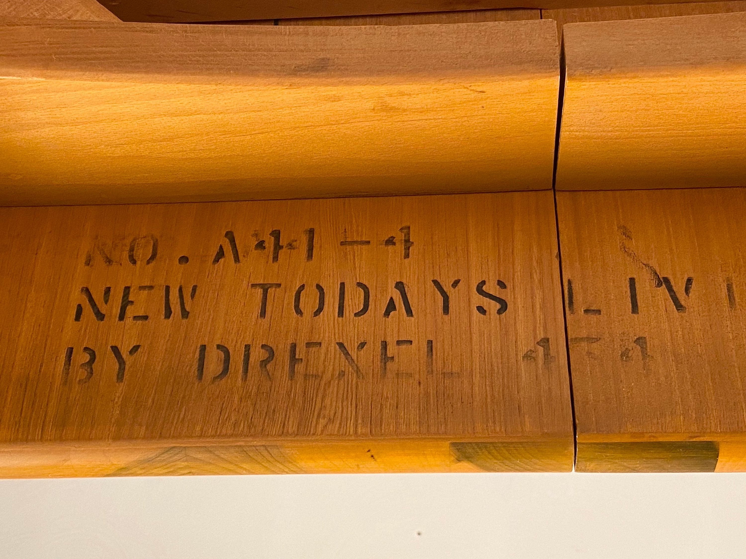 Here is a fully restored drop leaf extension dining table by Milo Baughman for Drexel, Circa 1950s. This extension drop leaf dining table was restored to match its original look and feel. In the restoration process, we removed any scratches or blemishes on both the table and the 2 leaf inserts. There is one very small bit of wear on one side of the table that can be seen in our last image but overall this piece turned out very nice. This piece was designed by Milo Baughman for Drexel's "New Today's Living" line in the 1950s. Crafted from elm wood and showcasing a very clean simple design, exceptional bookmatched woodgrain, and superior quality throughout the piece. This table would be perfect for a smaller dining room or apartment as it can be configured in many different ways allowing it to be fully extended to 80" in length when entertaining. The leg tips are solid brass which adds a hint of elegance to the design and the leg tips cleaned up very well. The table top does sit sturdily, the center and drop leaves do close easily and the table retains its original factory latch underneath along with the Drexel markings. Please feel free to reach out if you have any further questions on this piece and thanks for looking!