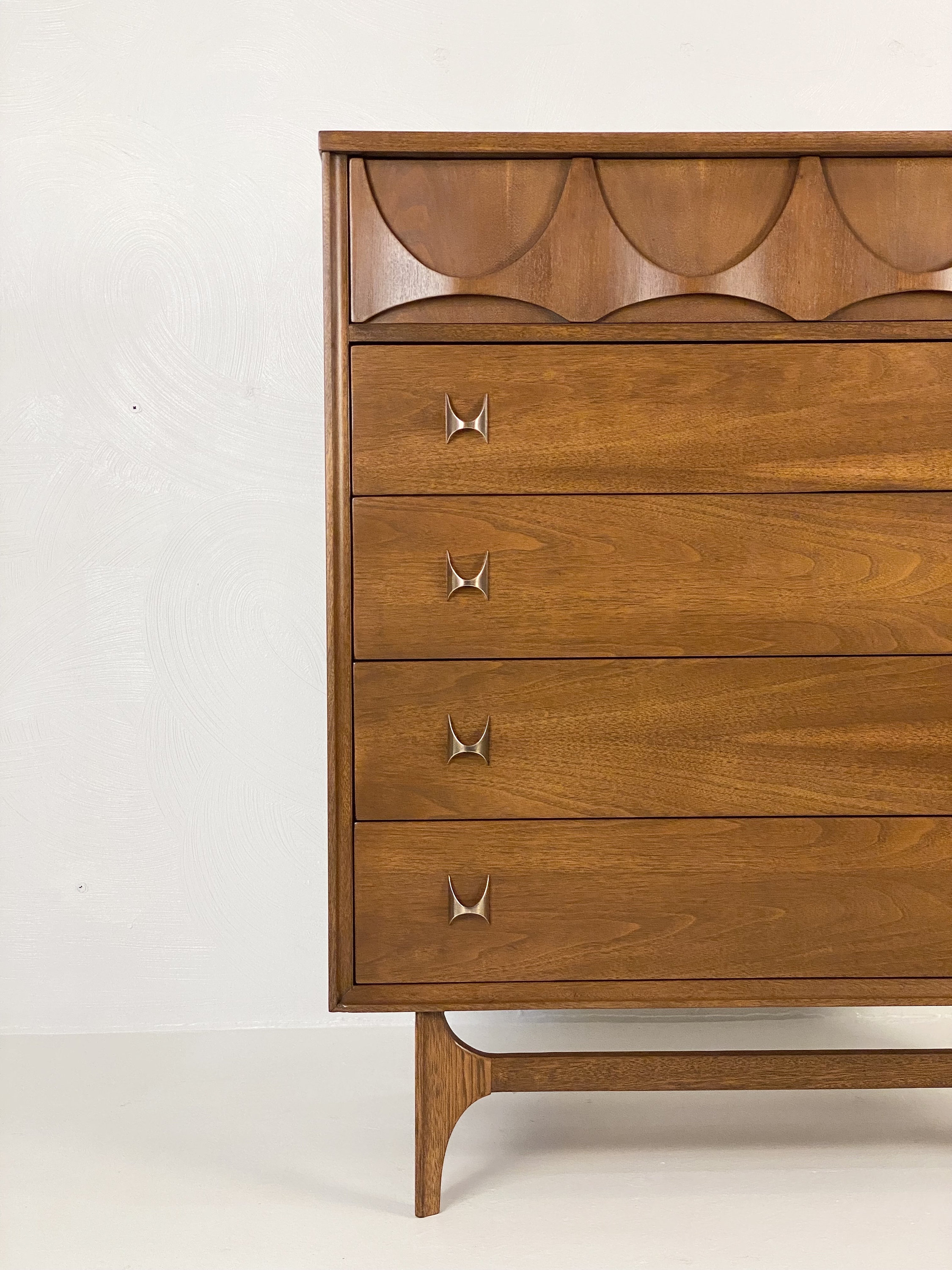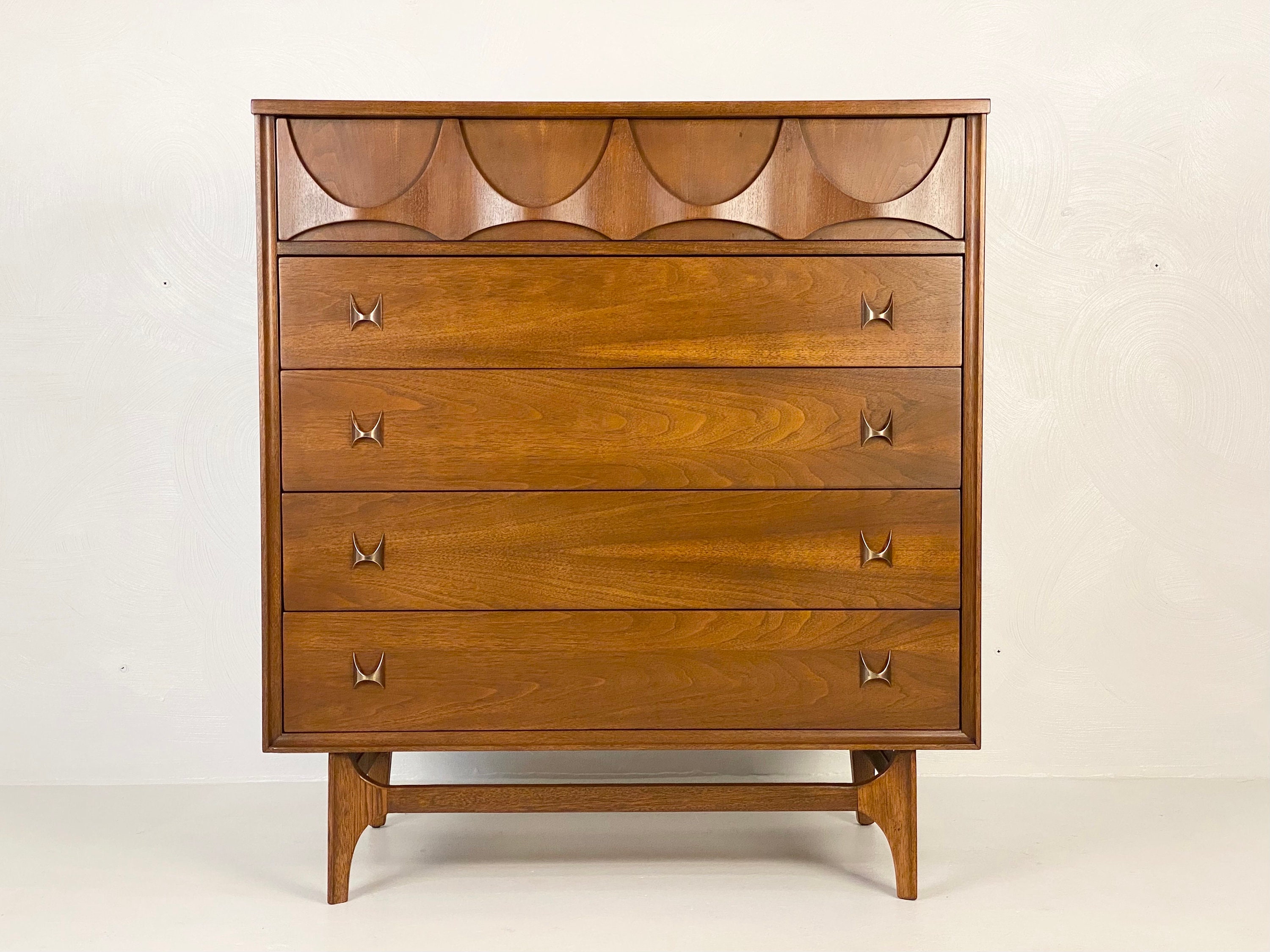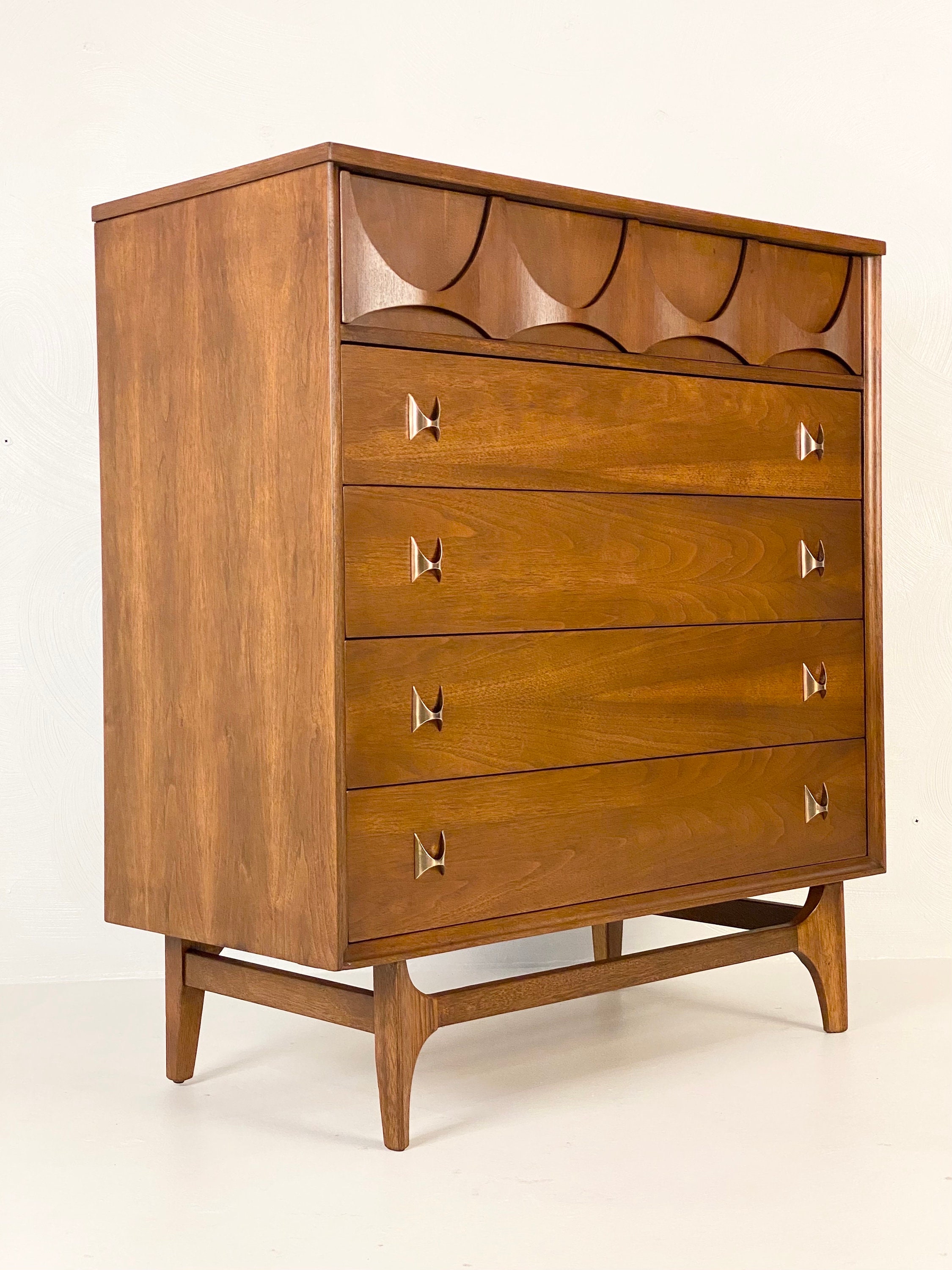 Here is a very nicely restored walnut chest of drawers (model 6130-40) by Broyhill for their Brasilia line, circa 1960s. This 4-drawer chest by Broyhill needs no introduction and the restoration turned out very well so there are very minimal items to note on the condition. During the restoration process, we inspected the piece thoroughly for any structural issues, we cleaned the piece inside and out before deciding what steps were next in our process. The original finish on this piece was too far gone so we gave this piece a complete restoration, stripping down to the bare wood, sanding, and then adding a walnut toner to bring out the beautiful woodgrain throughout. We then added a durable finish to protect the piece for many years to come. All drawer pulls were cleaned before being given a light polish with some steel wool to bring back their shine without damaging their integrity. The only notes on the restoration are a small nick/dent in the wood in the bottom left corner of the front edging that we will point out in our last image. Overall this piece is in good restored condition and retains its original markings. Please reach out if you have any questions and thanks for looking!