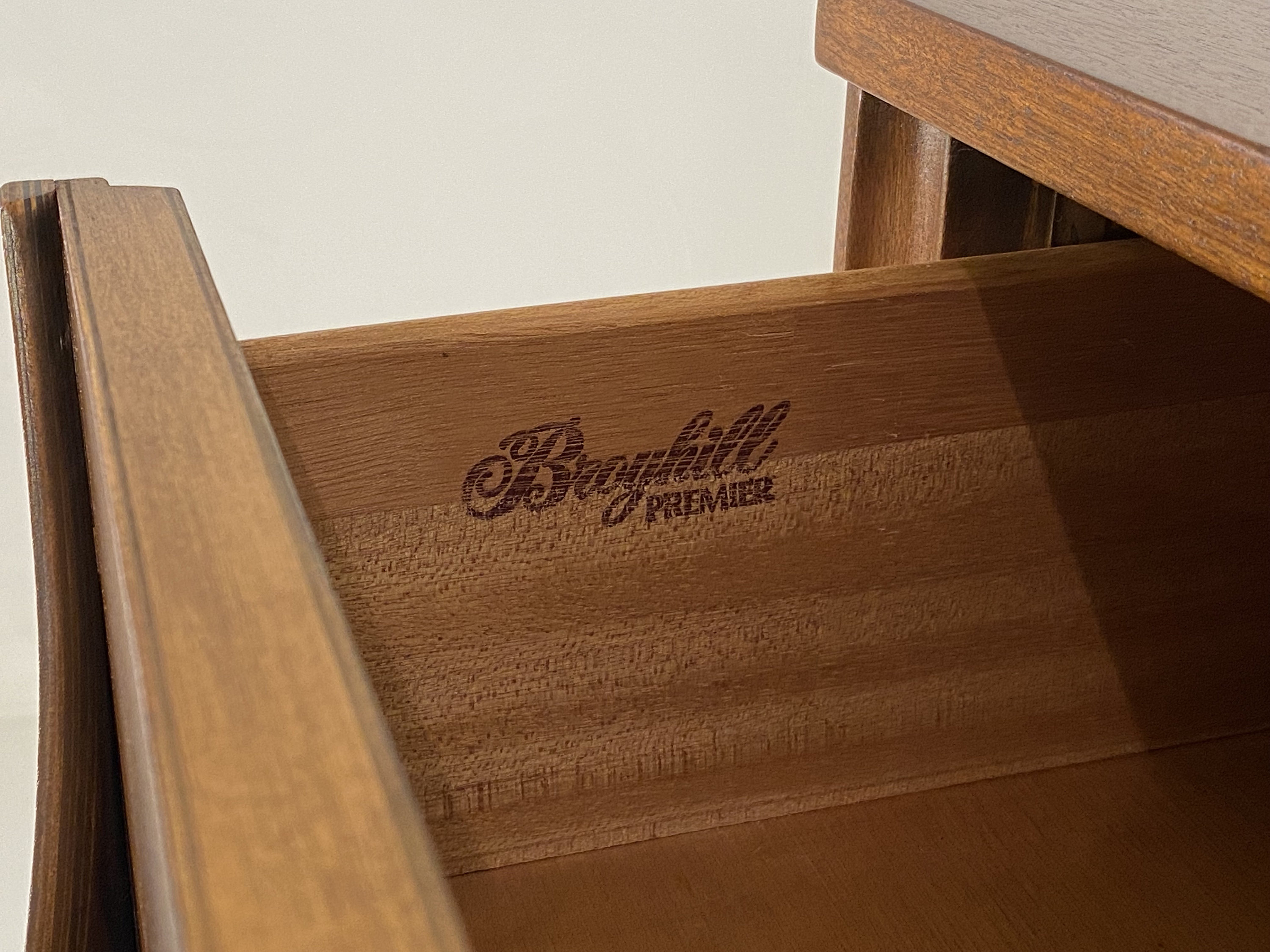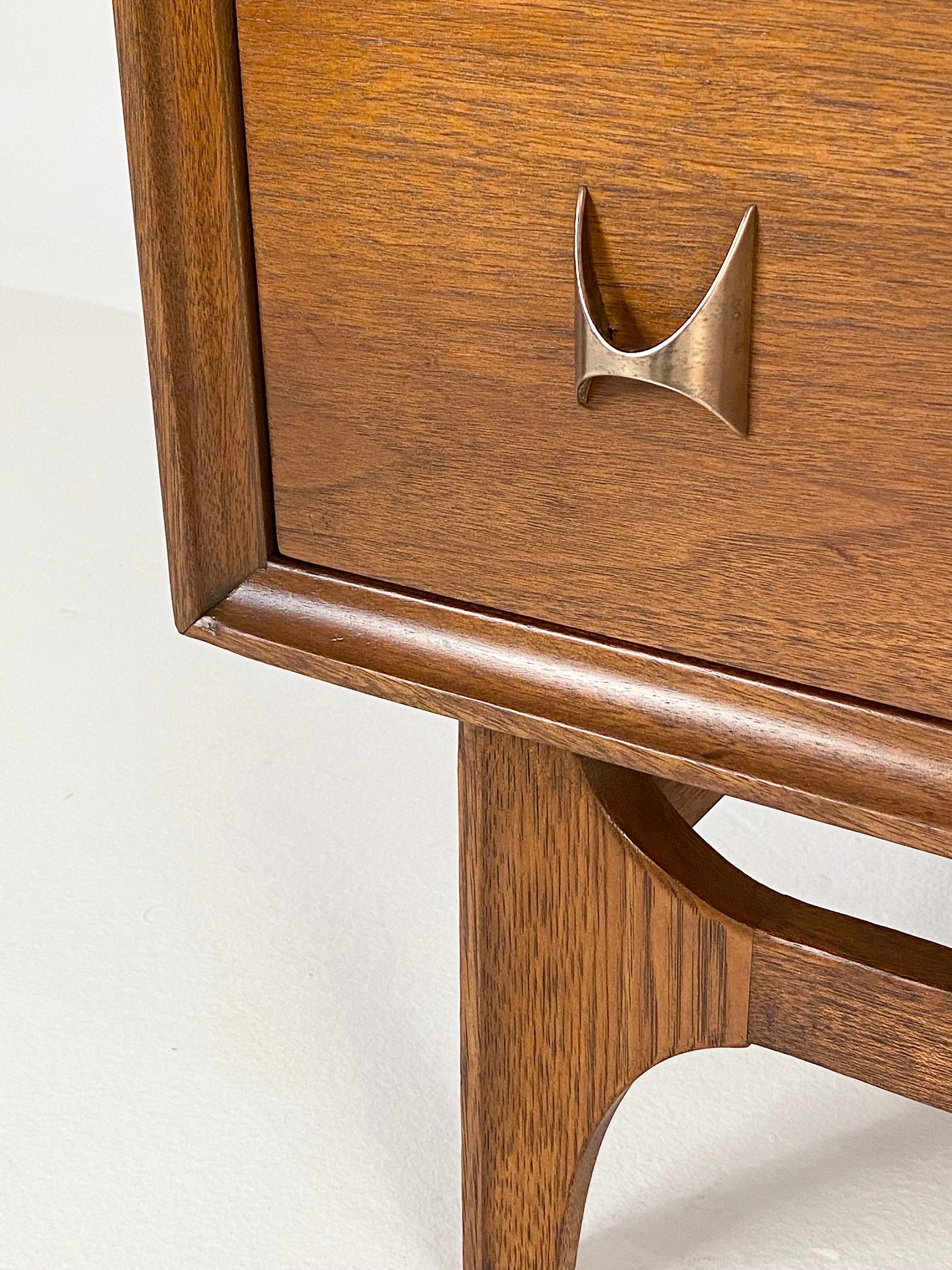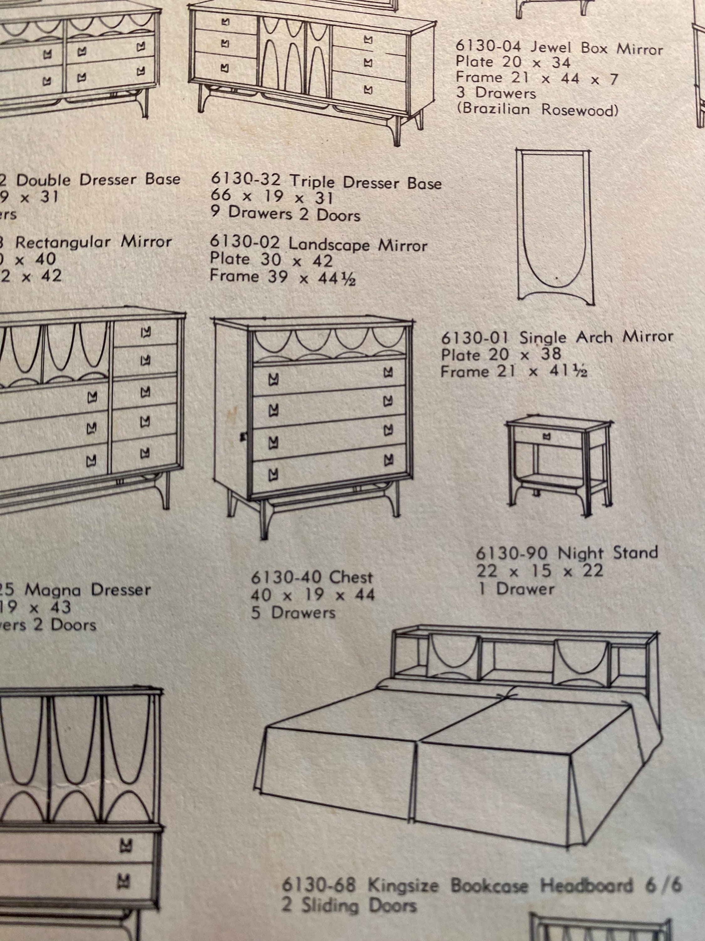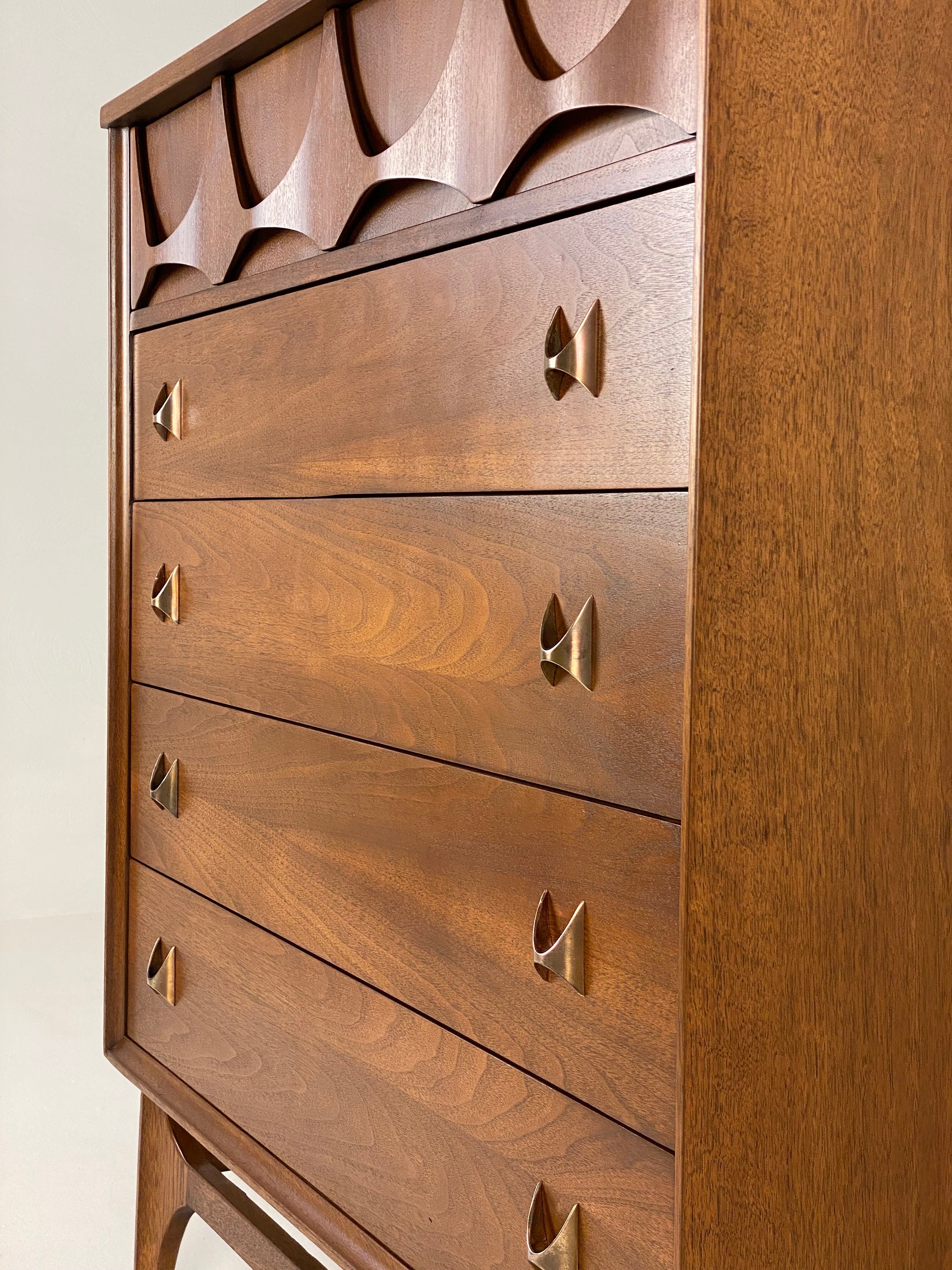Here is a very nicely restored walnut chest of drawers (model 6130-40) by Broyhill for their Brasilia line, circa 1960s. This 4-drawer chest by Broyhill needs no introduction and the restoration turned out very well so there are very minimal items to note on the condition. During the restoration process, we inspected the piece thoroughly for any structural issues, we cleaned the piece inside and out before deciding what steps were next in our process. The original finish on this piece was too far gone so we gave this piece a complete restoration, stripping down to the bare wood, sanding, and then adding a walnut toner to bring out the beautiful woodgrain throughout. We then added a durable finish to protect the piece for many years to come. All drawer pulls were cleaned before being given a light polish with some steel wool to bring back their shine without damaging their integrity. The only notes on the restoration are a small nick/dent in the wood in the bottom left corner of the front edging that we will point out in our last image. Overall this piece is in good restored condition and retains its original markings. Please reach out if you have any questions and thanks for looking!