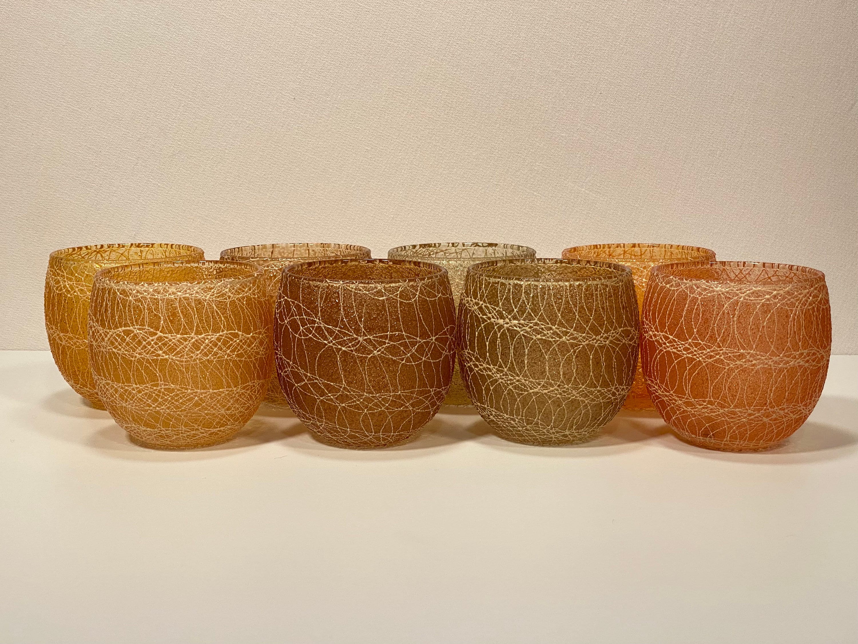 Beautiful set of eight Color Craft Shat-R-Pruf Roly Poly Glasses. NO cracks or chips. Hand washing STRONGLY advised, but definitely do not put these in a "heated" dry dishwasher. Each glass measures approximately 3.5" wide and 3.25" tall. Color is vibrant on all eight glasses with no signs of wear. Please see photos for condition and decide for yourself as all sales are final. Thanks!