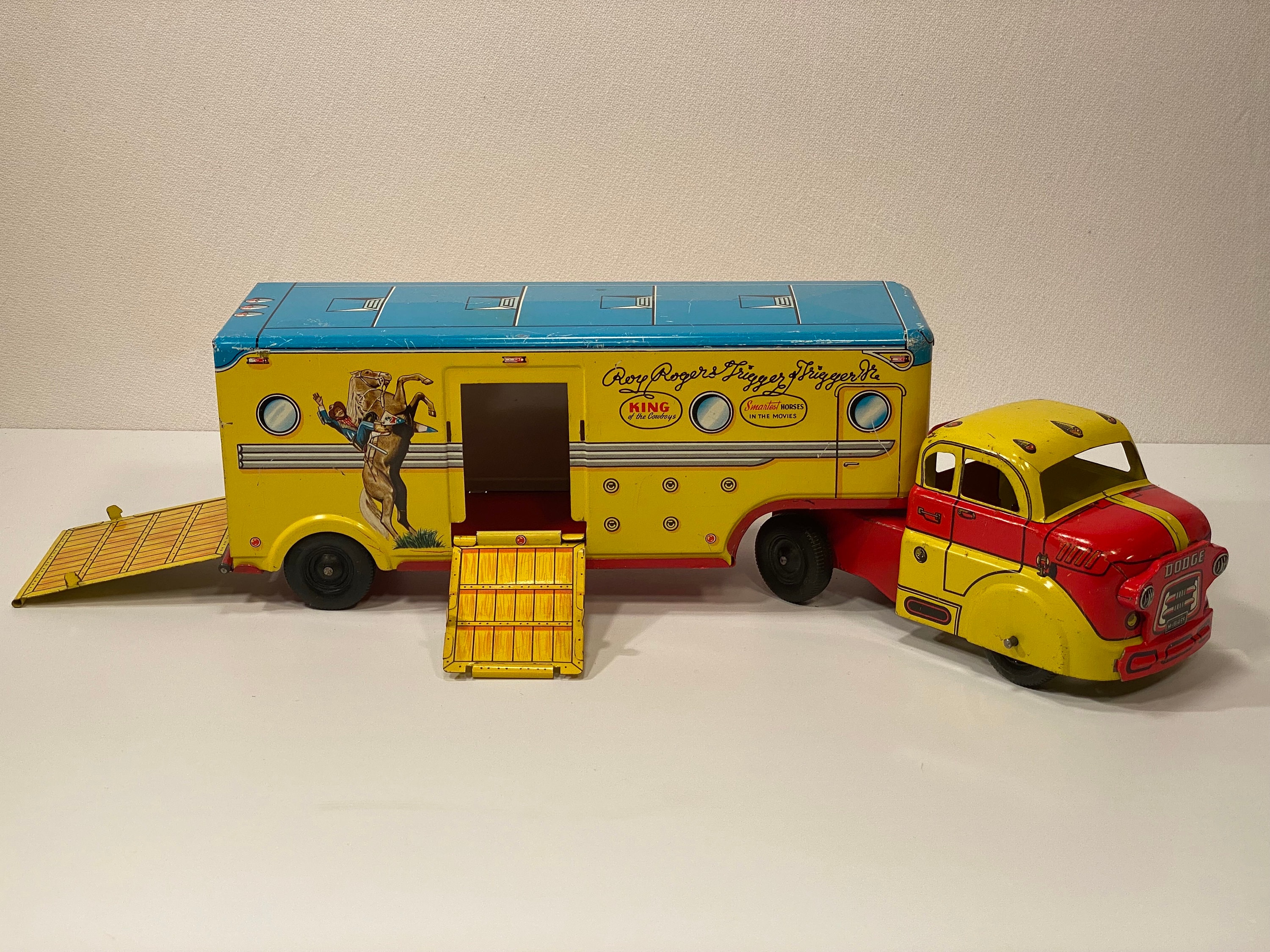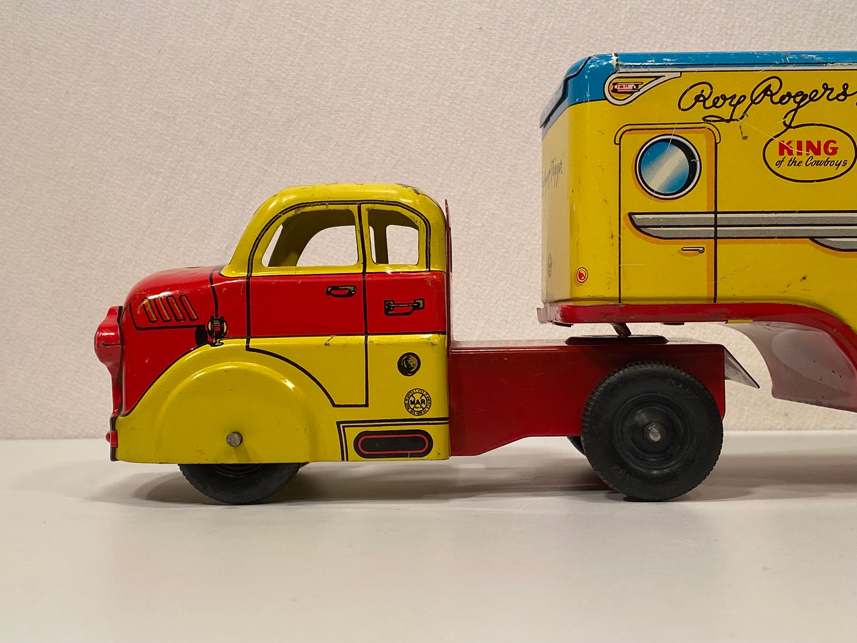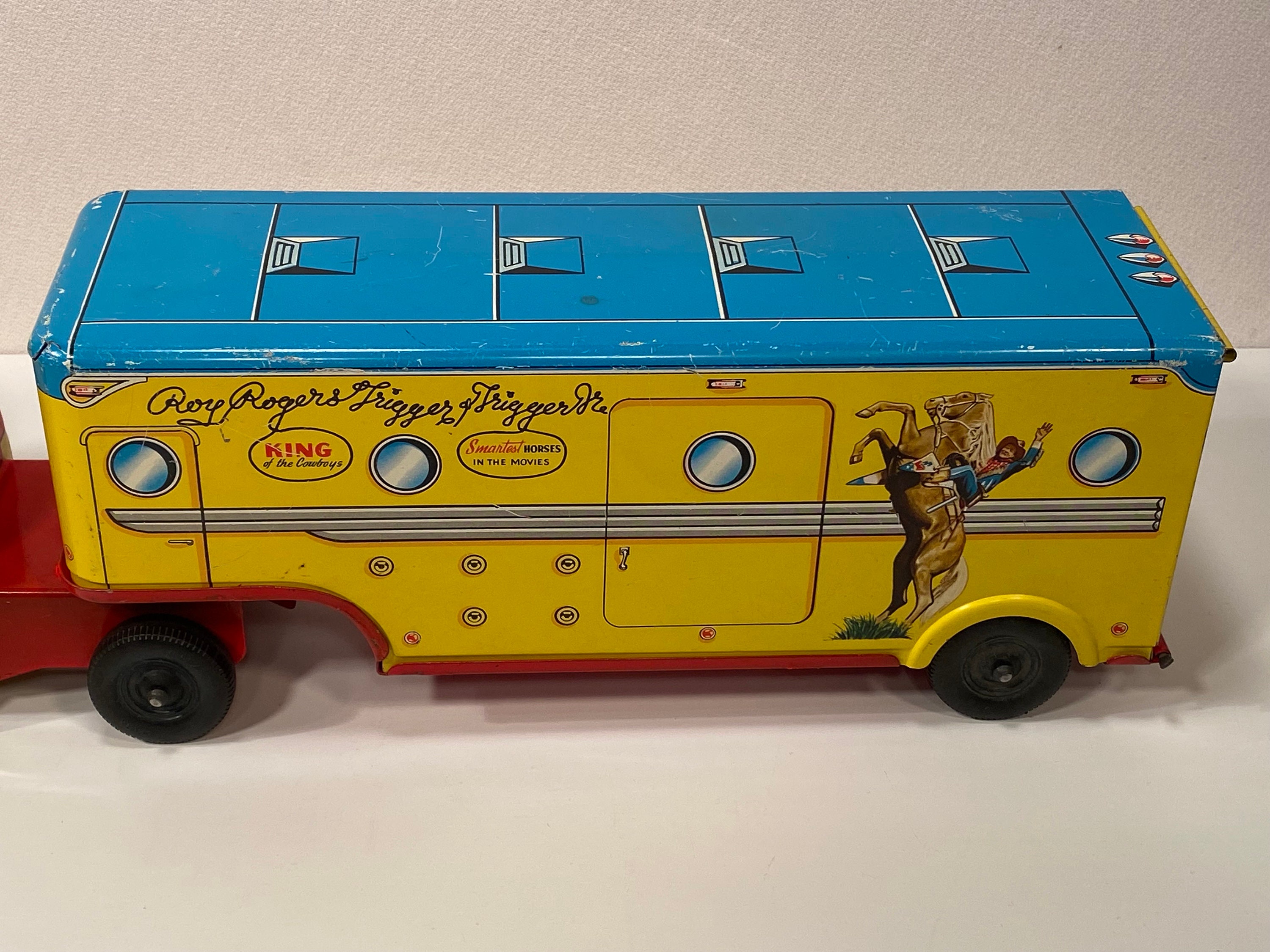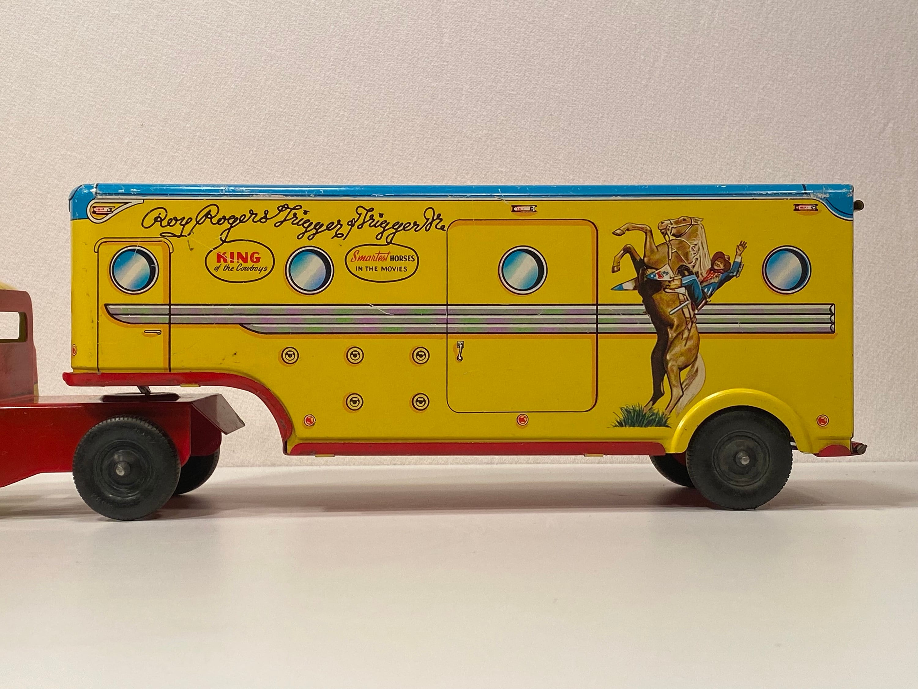 Marx Roy Rogers and Trigger Tin Litho Toy Dodge Truck and Trailer in very good condition with no dents or rust. Color is vibrant with some scuffs/scratches in the finish that we've highlighted in the photos. However, this is in very good condition for its age in our opinion. Wheels turn smoothly as they should. Has the round Marx label to the right of the driver door on the truck. Measures approximately 15.5" long, 4.5" tall, and 3.5" wide/thick. Please see photos for condition and decide for yourself as all sales are final.
