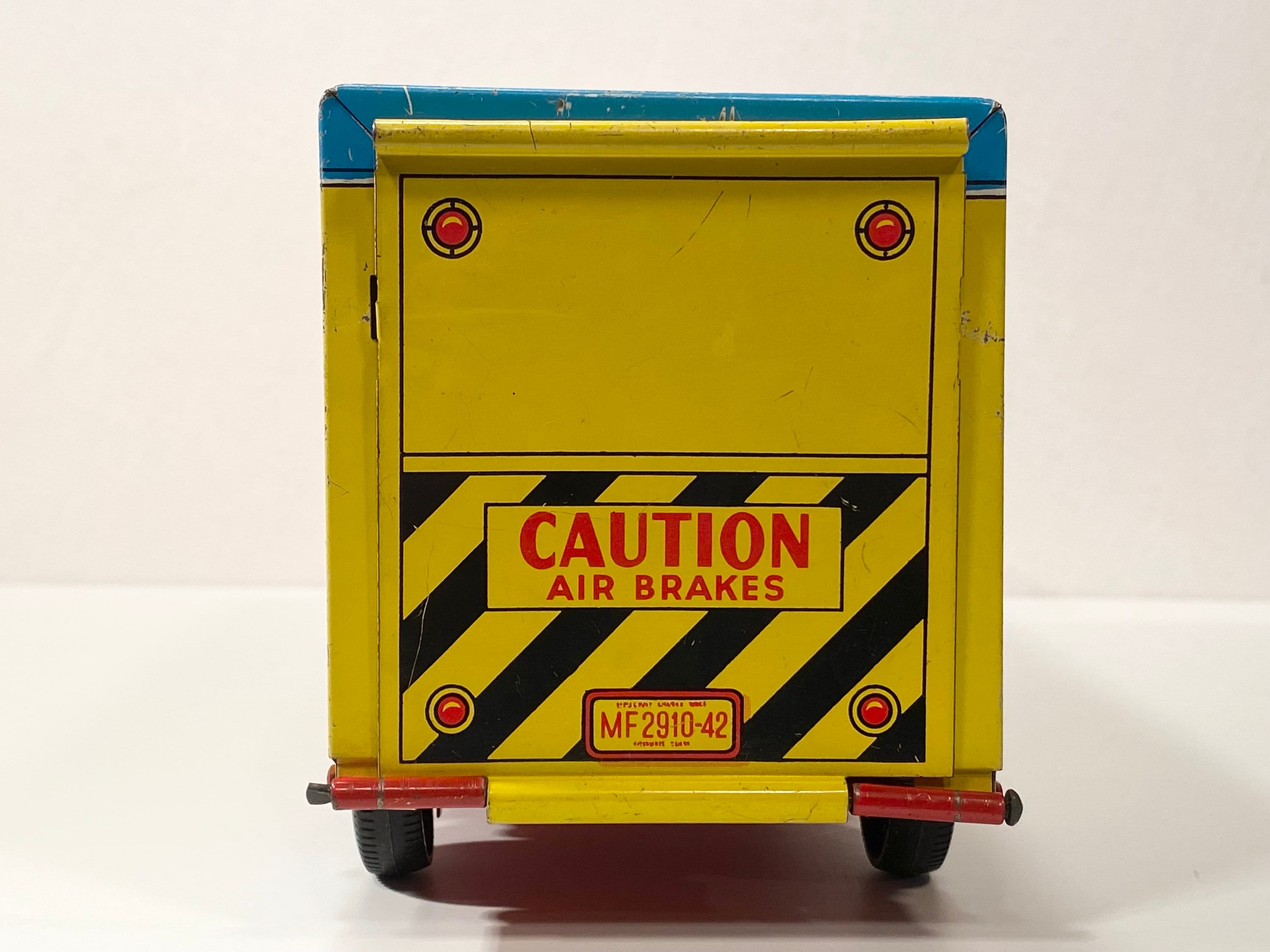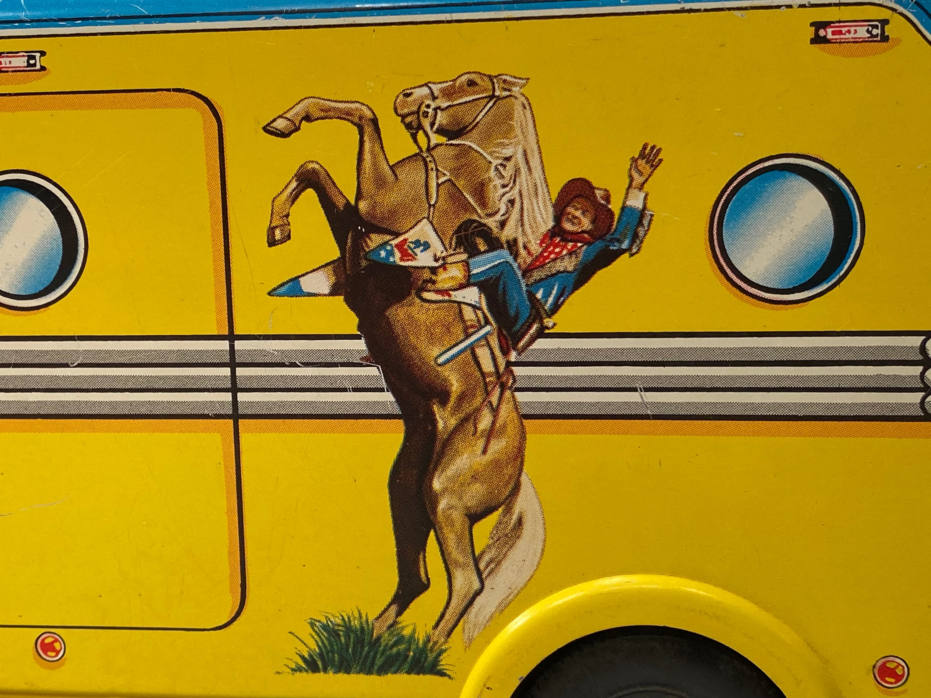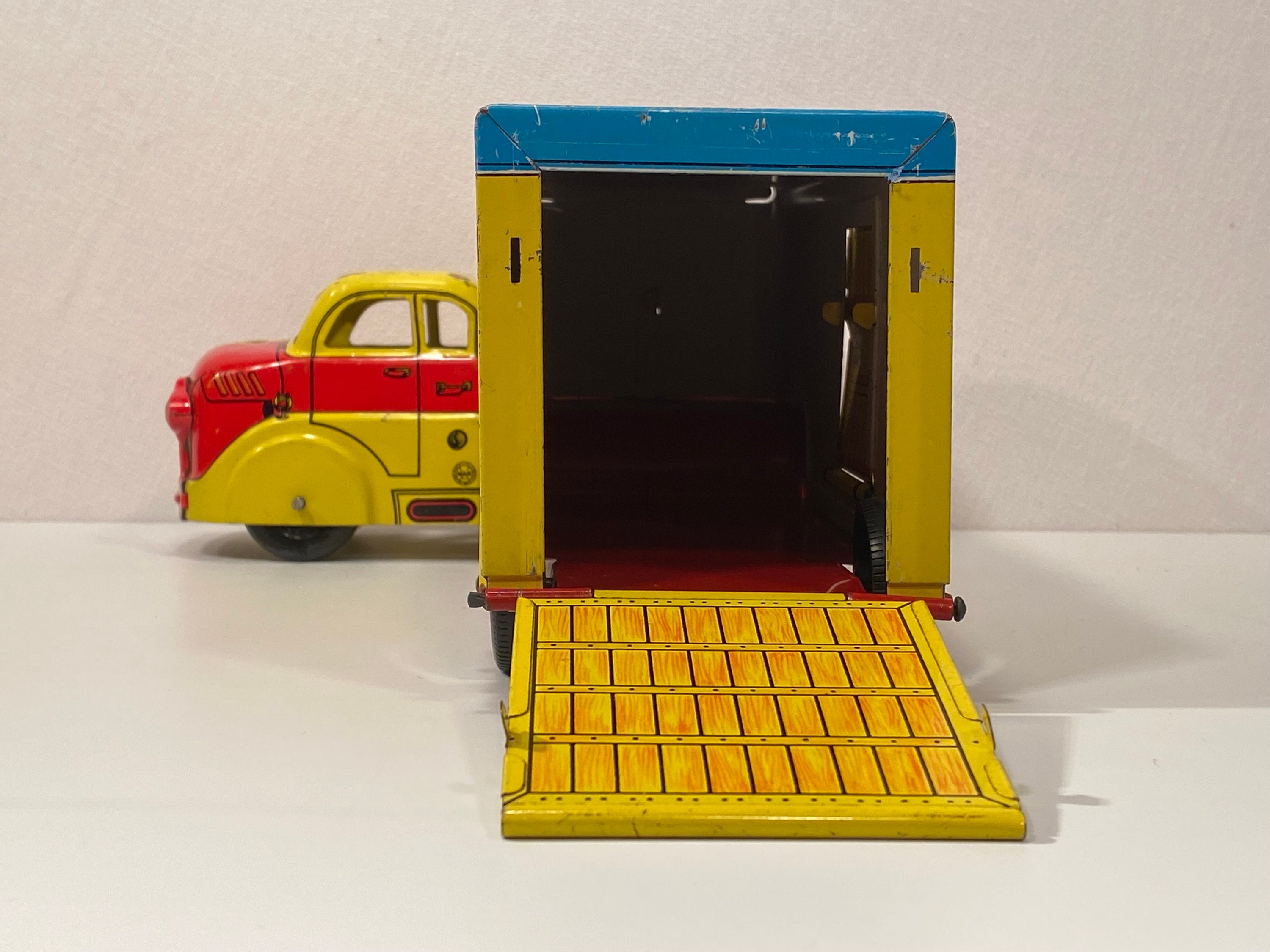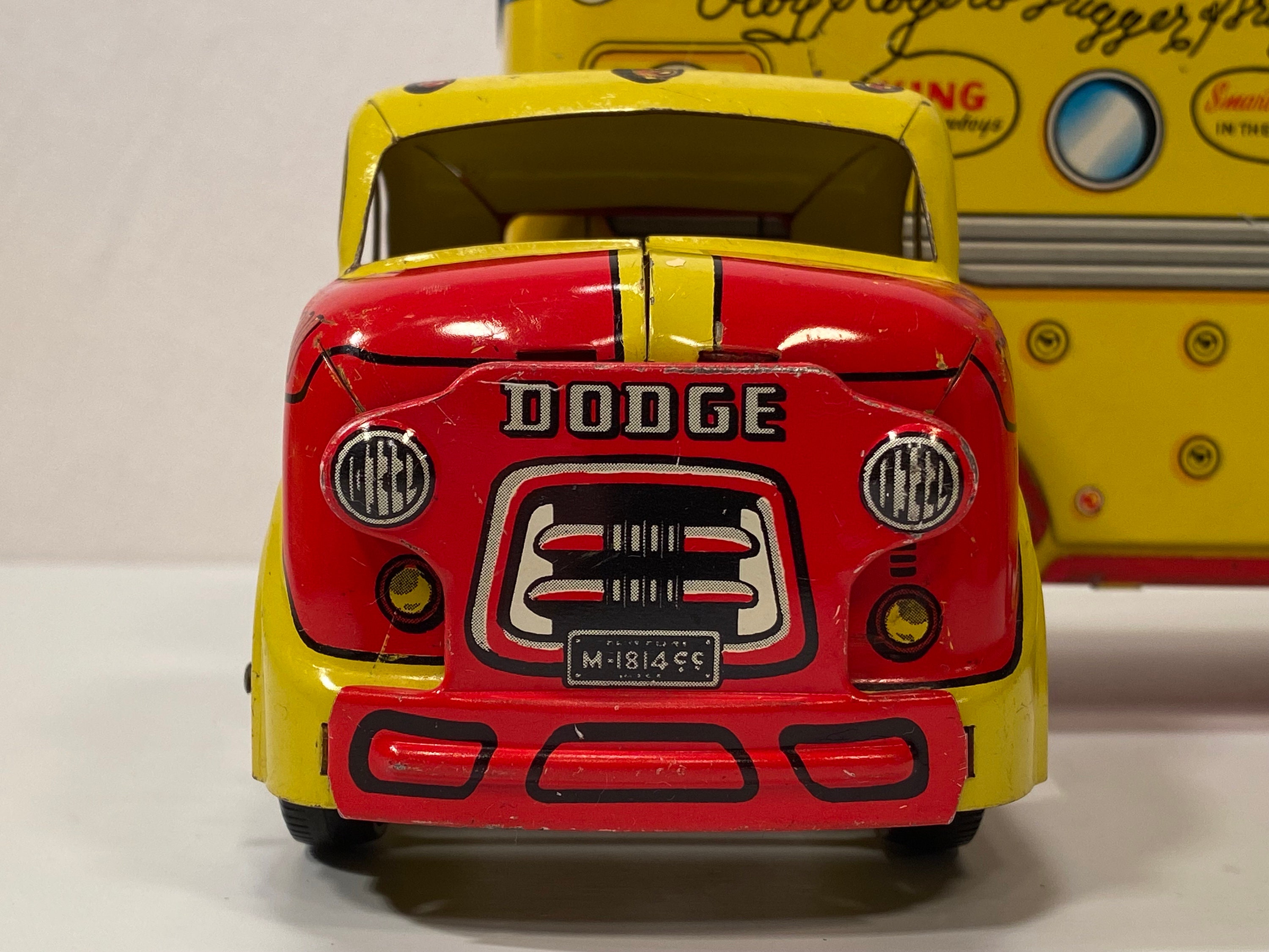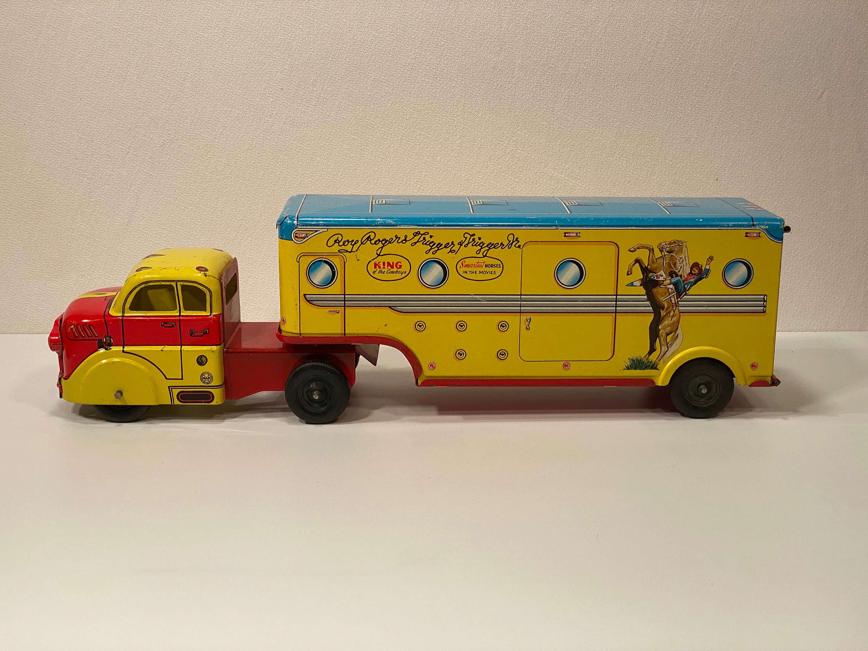 Marx Roy Rogers and Trigger Tin Litho Toy Dodge Truck and Trailer in very good condition with no dents or rust. Color is vibrant with some scuffs/scratches in the finish that we've highlighted in the photos. However, this is in very good condition for its age in our opinion. Wheels turn smoothly as they should. Has the round Marx label to the right of the driver door on the truck. Measures approximately 15.5" long, 4.5" tall, and 3.5" wide/thick. Please see photos for condition and decide for yourself as all sales are final.
