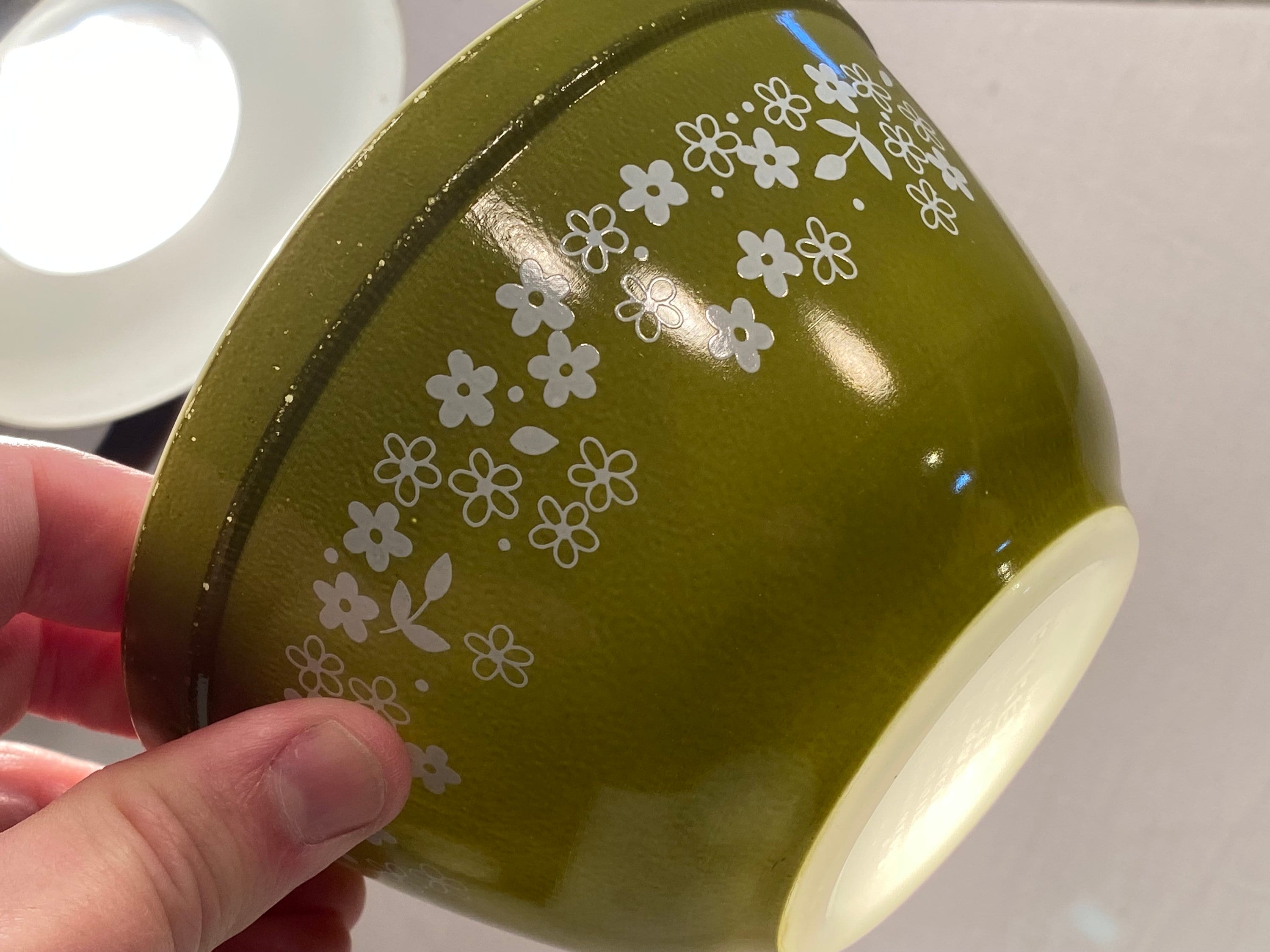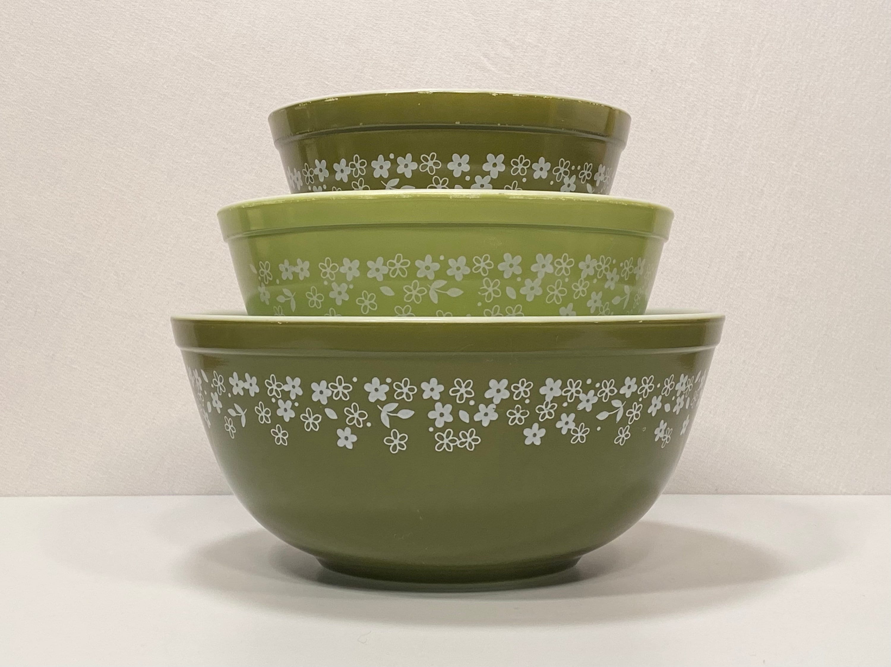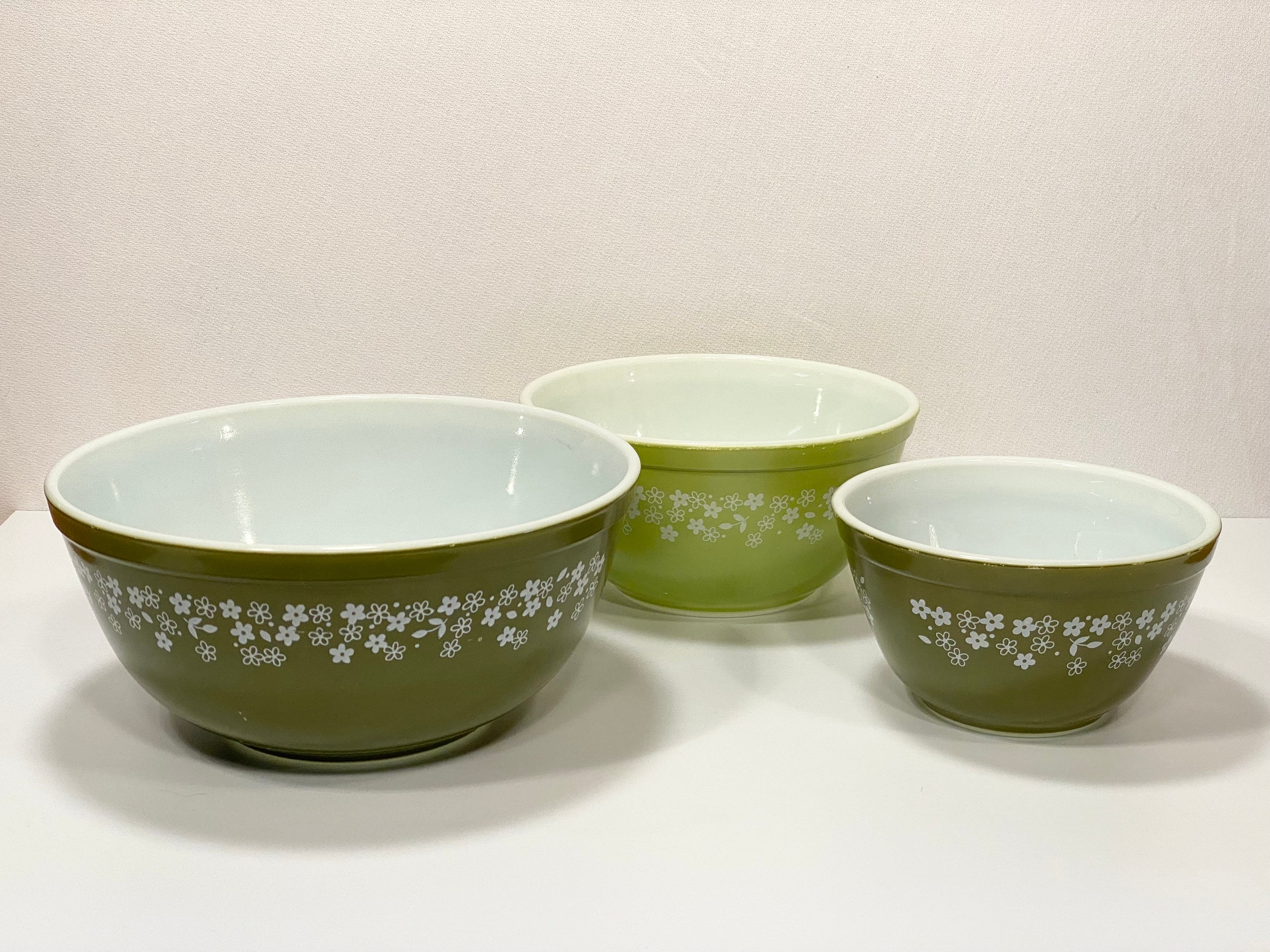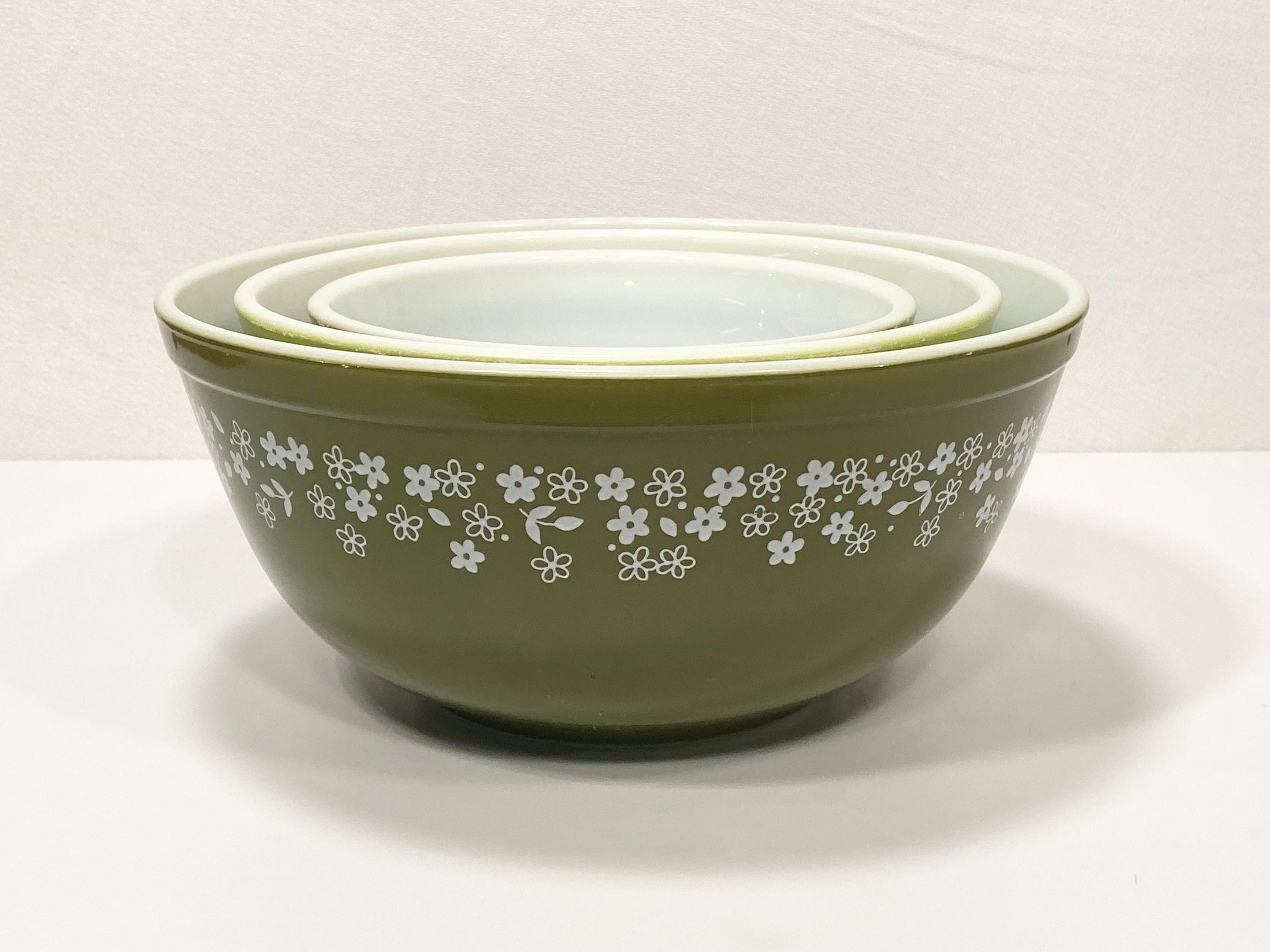 Complete Pyrex Spring Blossom #300 Mixing Bowl Set. This is the 1979 redesign version of Spring Blossom. Includes 401, 402, 403 model bowls. This was a complete set, the Spring Blossom 1979 Redesign never made or sold a #404 four quart bowl. Good condition with no cracks or chips. Color is vibrant with some lights scuffs on each bowl that can only be seen when held up to bright direct light which we've done in the pictures. Please see photos for condition and decide for yourself as all sales are final.