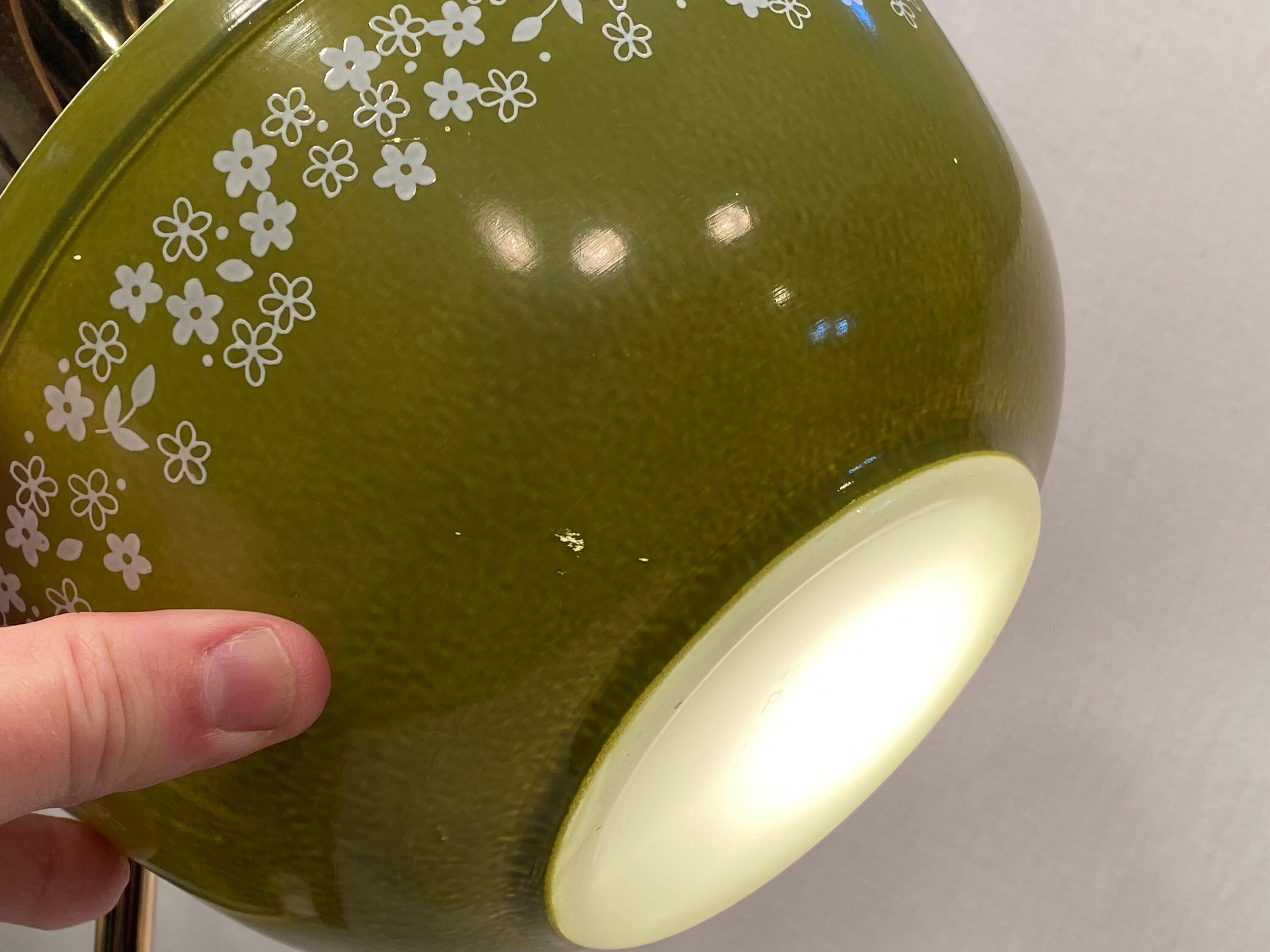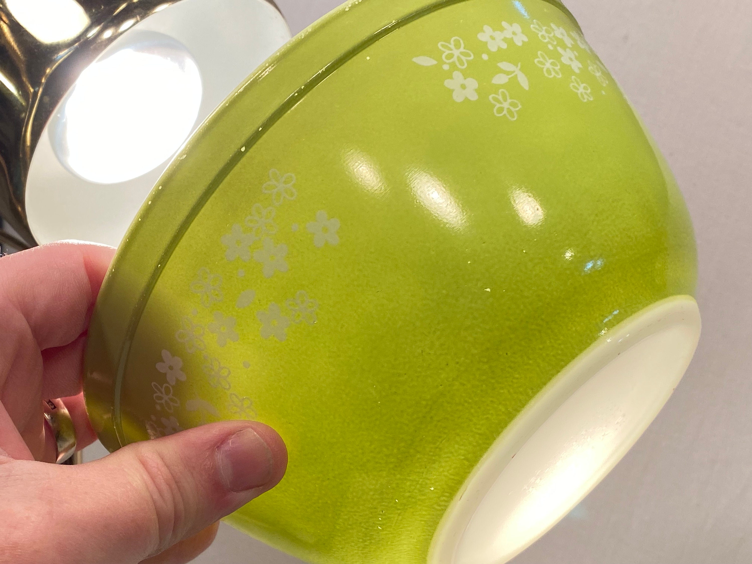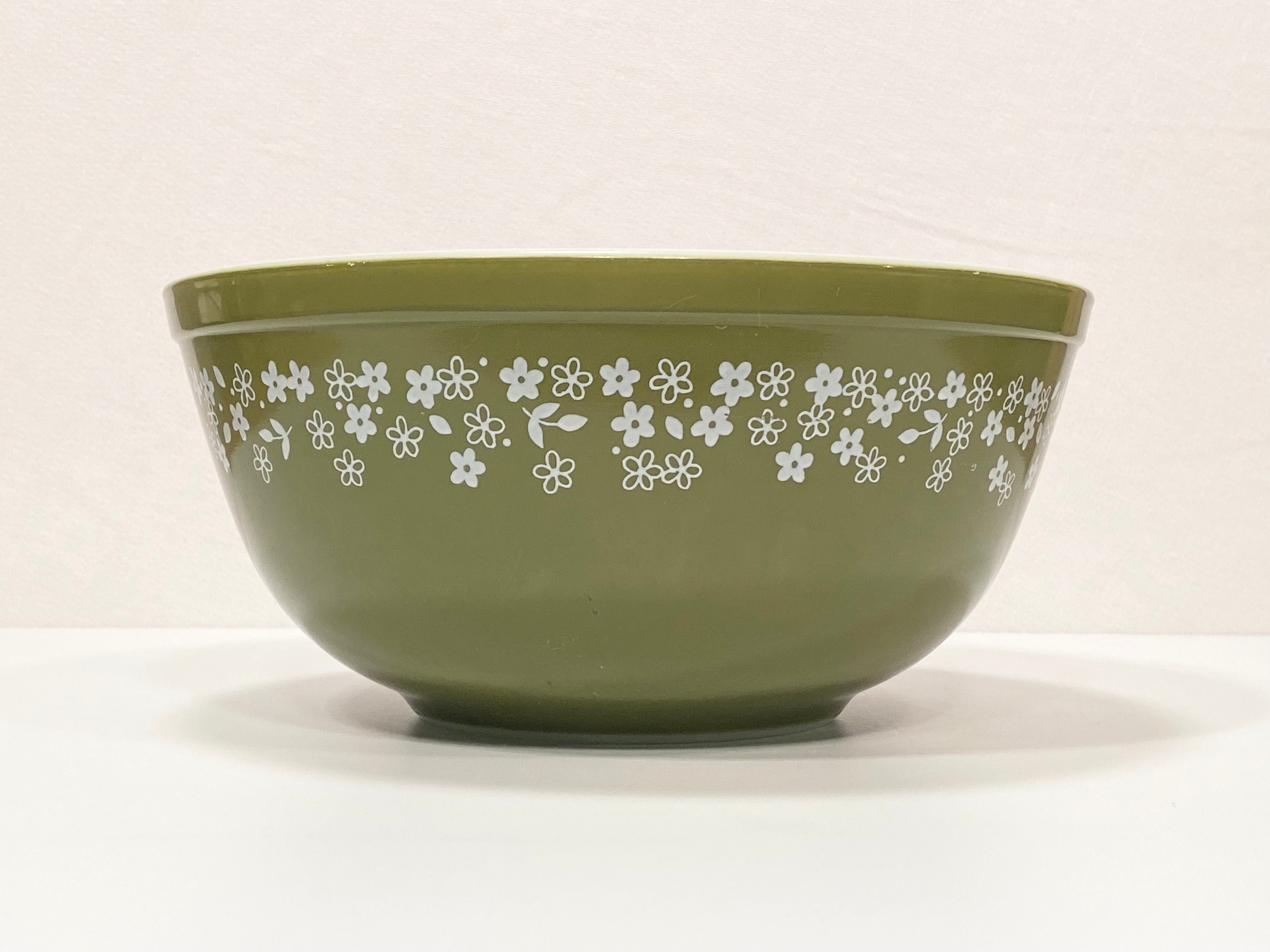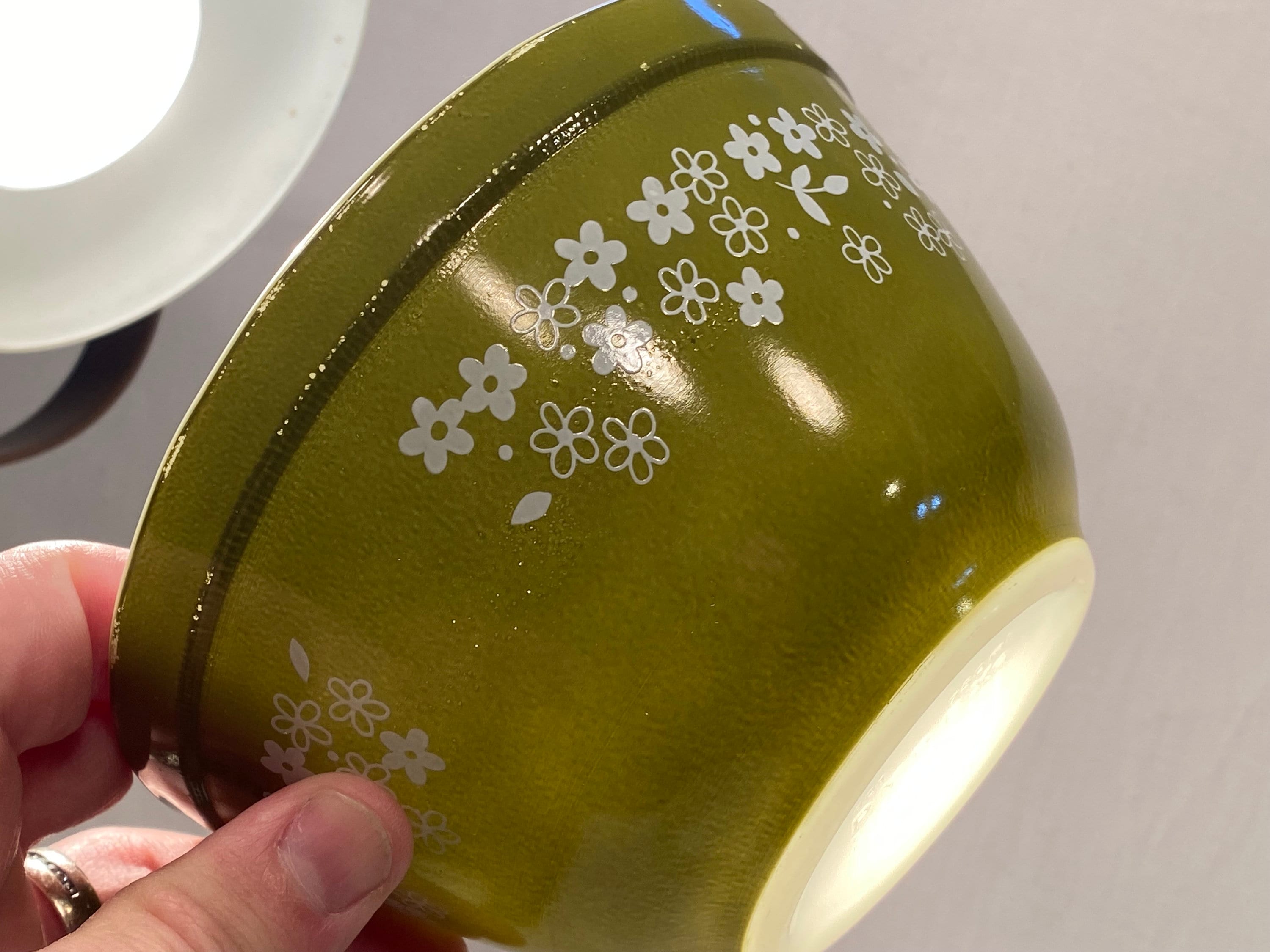 Complete Pyrex Spring Blossom #300 Mixing Bowl Set. This is the 1979 redesign version of Spring Blossom. Includes 401, 402, 403 model bowls. This was a complete set, the Spring Blossom 1979 Redesign never made or sold a #404 four quart bowl. Good condition with no cracks or chips. Color is vibrant with some lights scuffs on each bowl that can only be seen when held up to bright direct light which we've done in the pictures. Please see photos for condition and decide for yourself as all sales are final.