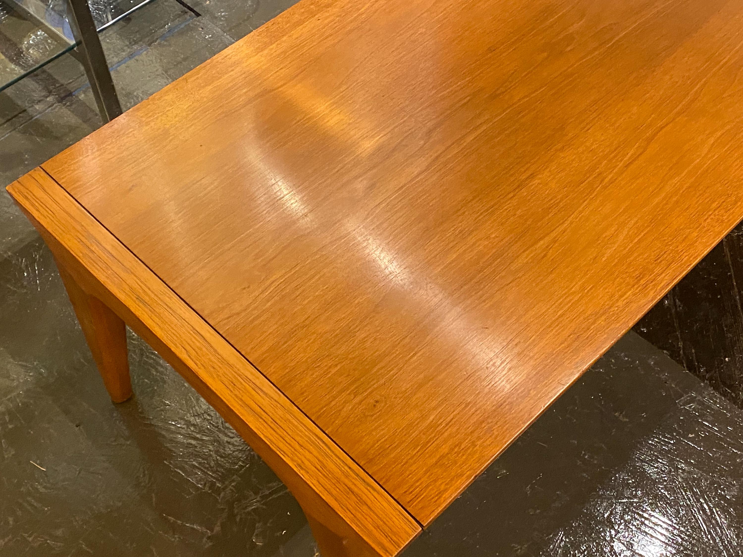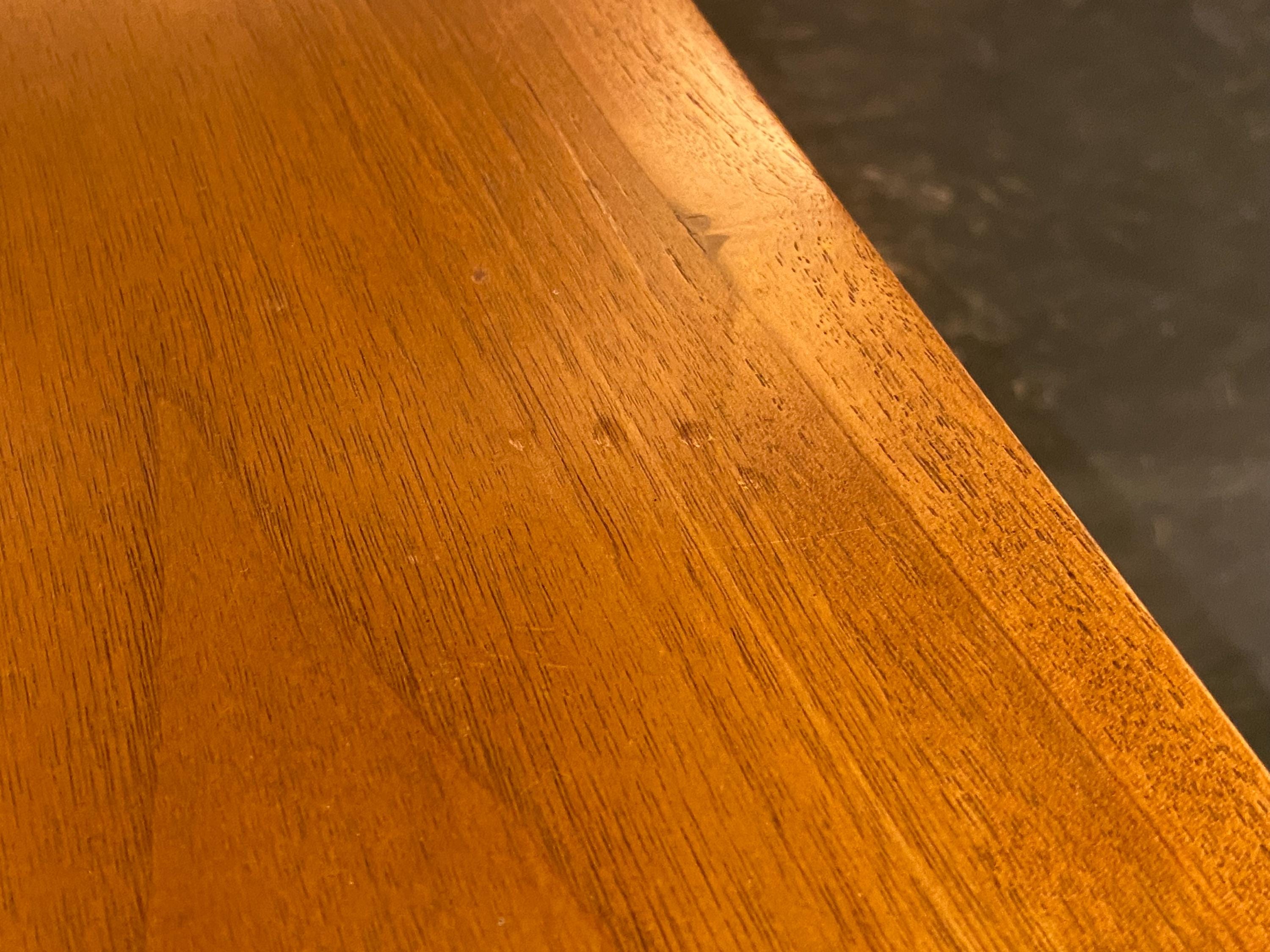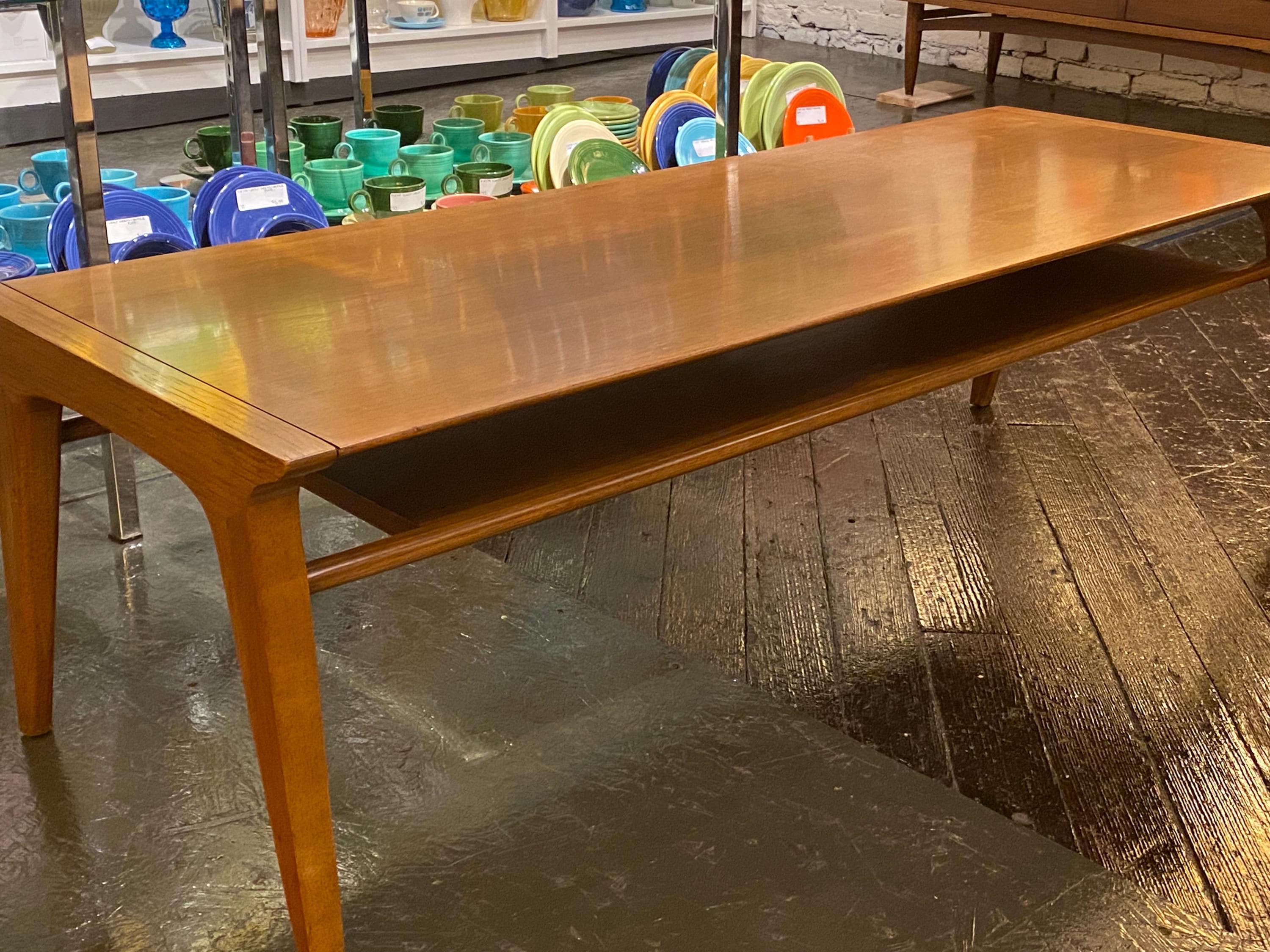 Here is a very nice all-original coffee table by Drexel for their Profile line, circa 1960s. This coffee table showcases a very unique style of modern design and is made from walnut wood. The modern streamlined design would make this a great asset to any mid-century, modern-inspired home. This table features a long magazine shelf underneath the top and this does have a small amount of wear. Overall, this table is in good original condition with very minimal signs of wear from use. Please see our last few images for details on the tabletop condition.