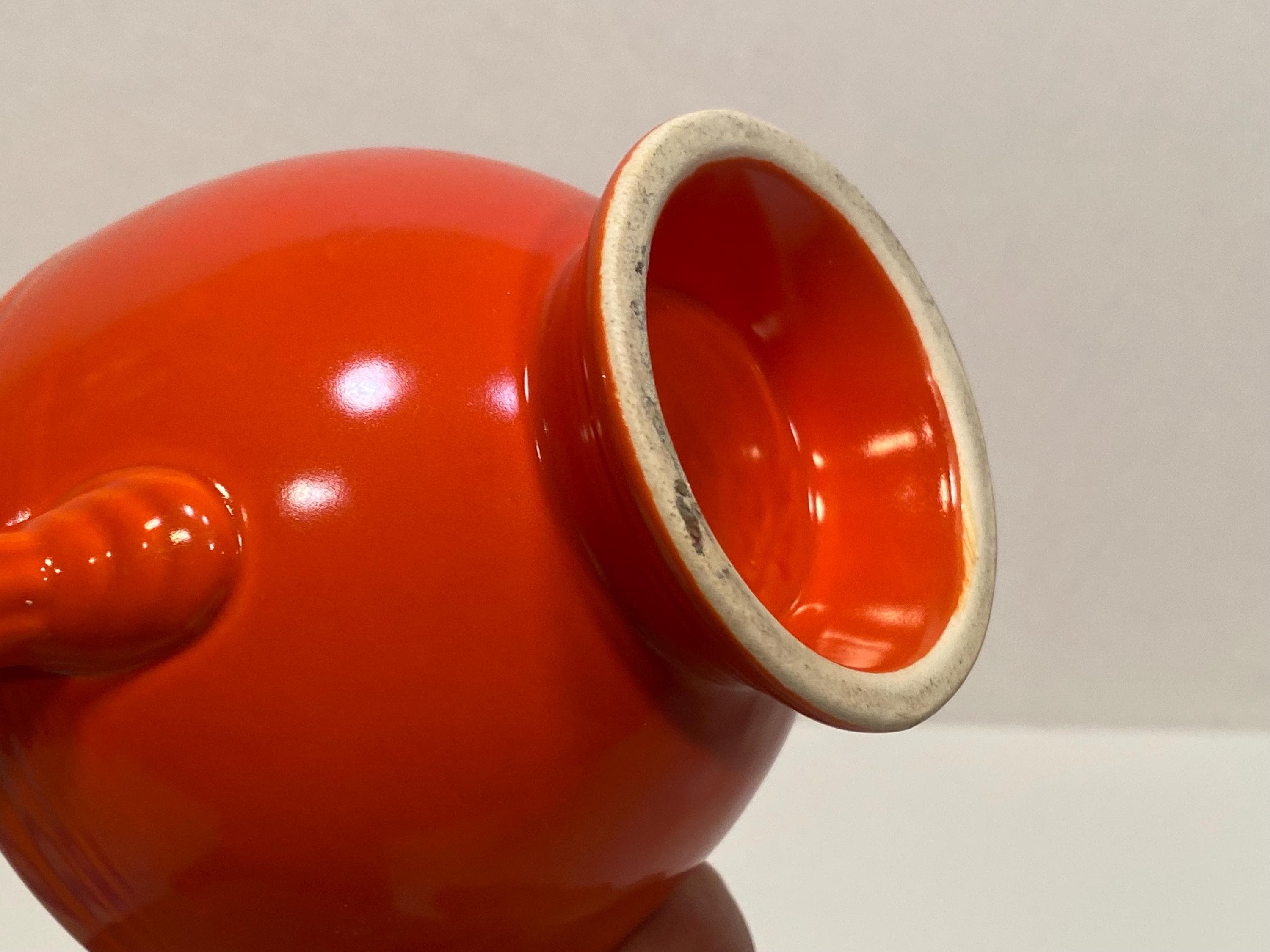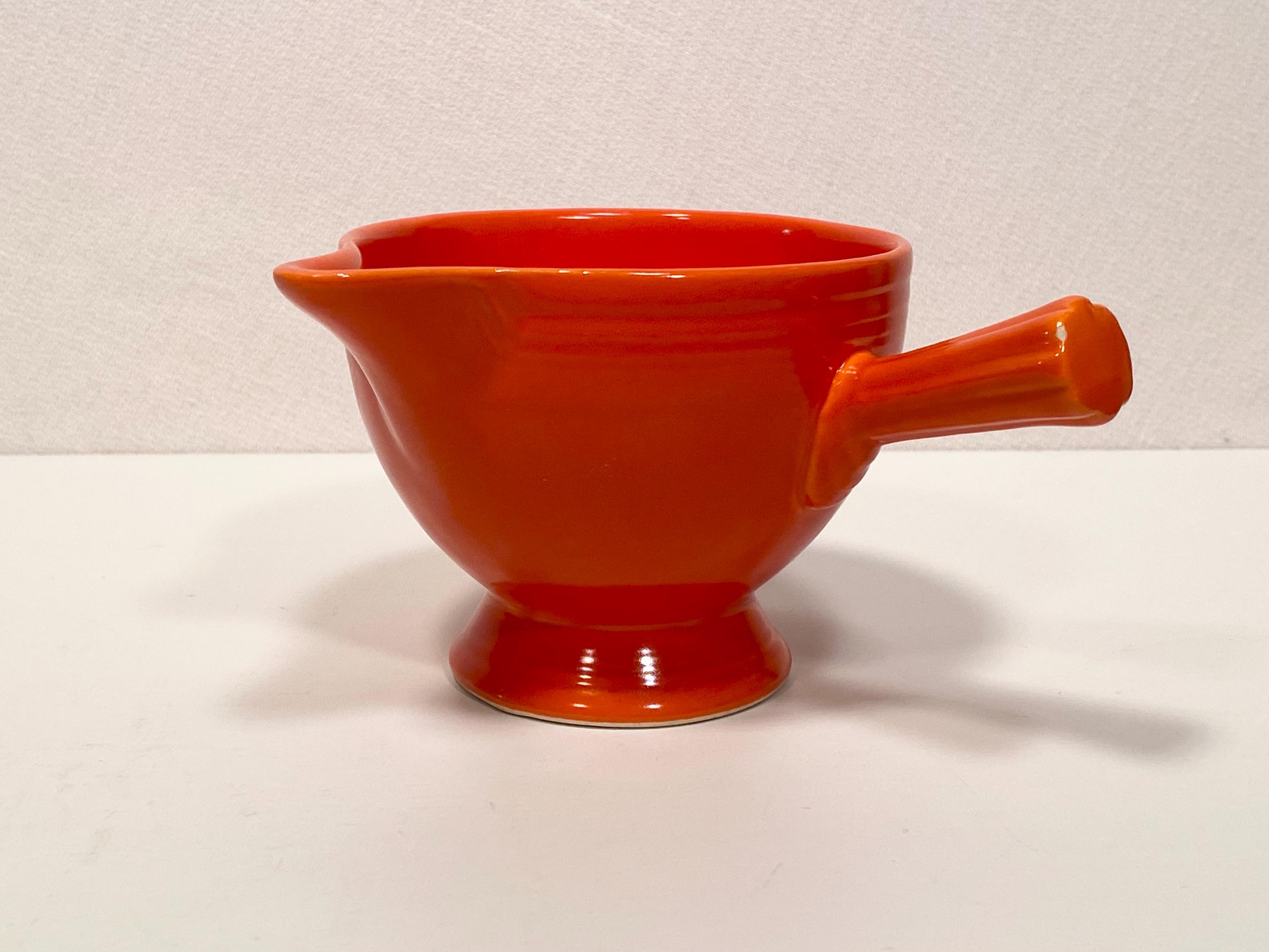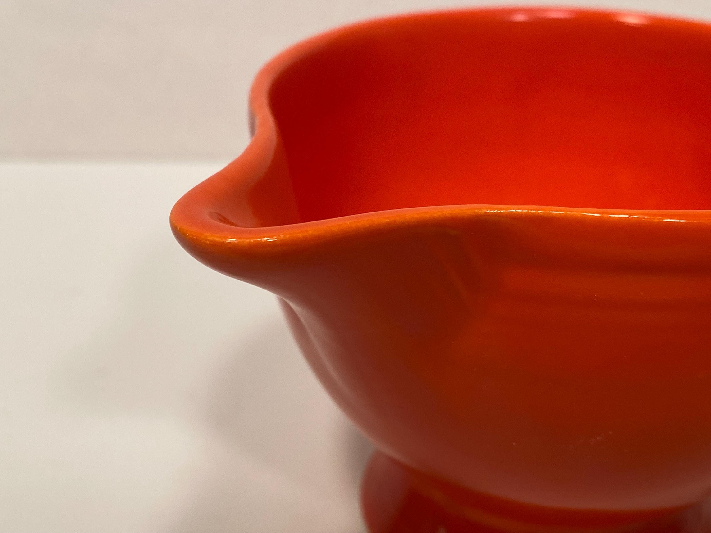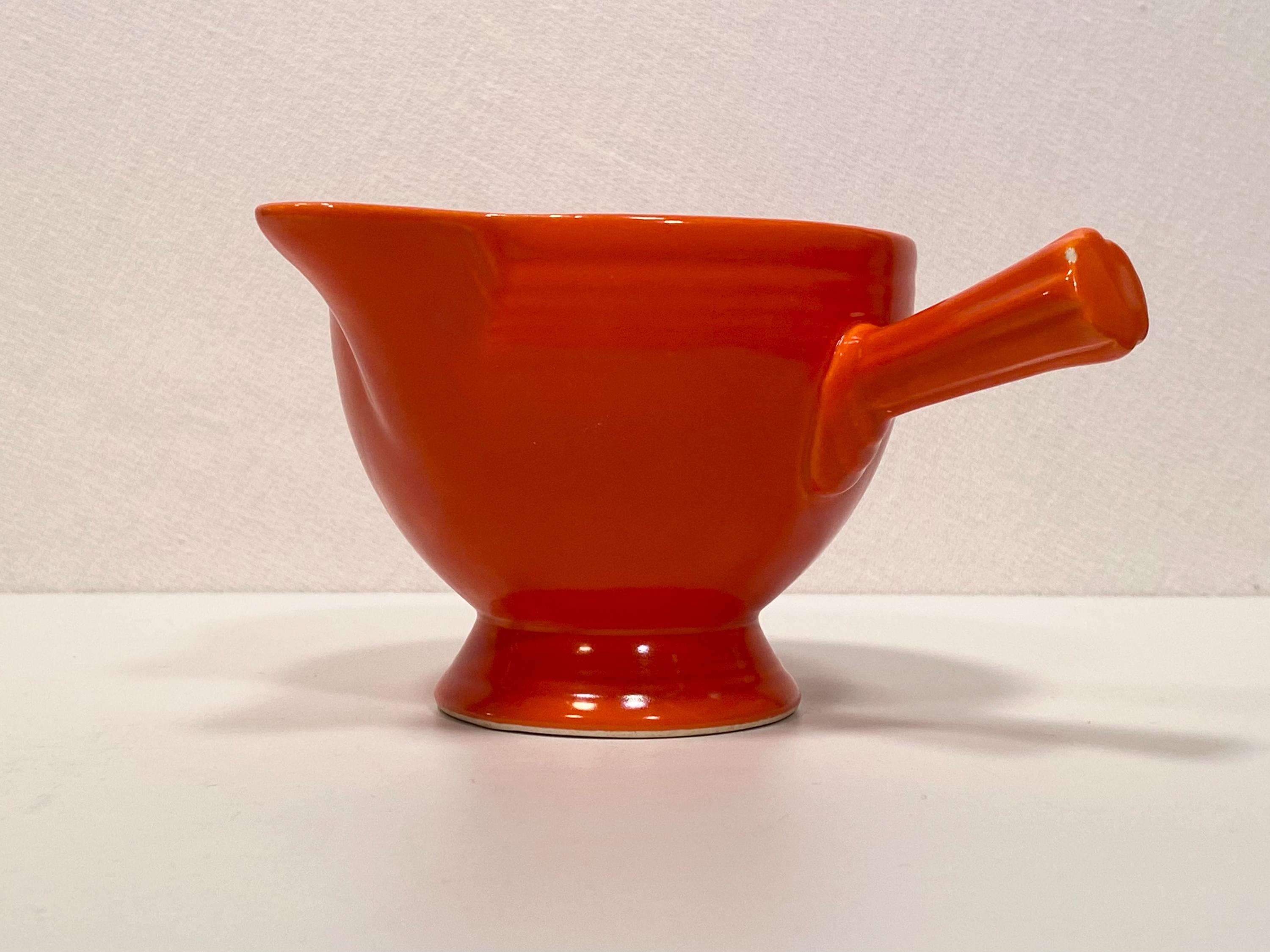 Circa 1936-1938: The stick handle is an early and rare design element in the fiesta pottery line. The After Dinner Coffeepot was already designed when Rhead was working on a creamer, so the stick handle fell into a perfect compliment. This version would only be produced for a little over two years. Slip cast in two pieces with the handle attatched by hand, this piece would be replaced by the ring handled creamer by the summer of 1938. The vintage fiesta stick handled creamer is a great early piece of vintage fiesta pottery representing the earliest part of the tableware line. Great condition with no cracks or chips. Great for display or use everyday for a cracker dish, serving dish, snack tray, etc. ***Smallest flea bite in the glaze on the end of the handle which can be seen highlighted in the last photo. Please see photos for condition and decide for yourself as all sales are final.