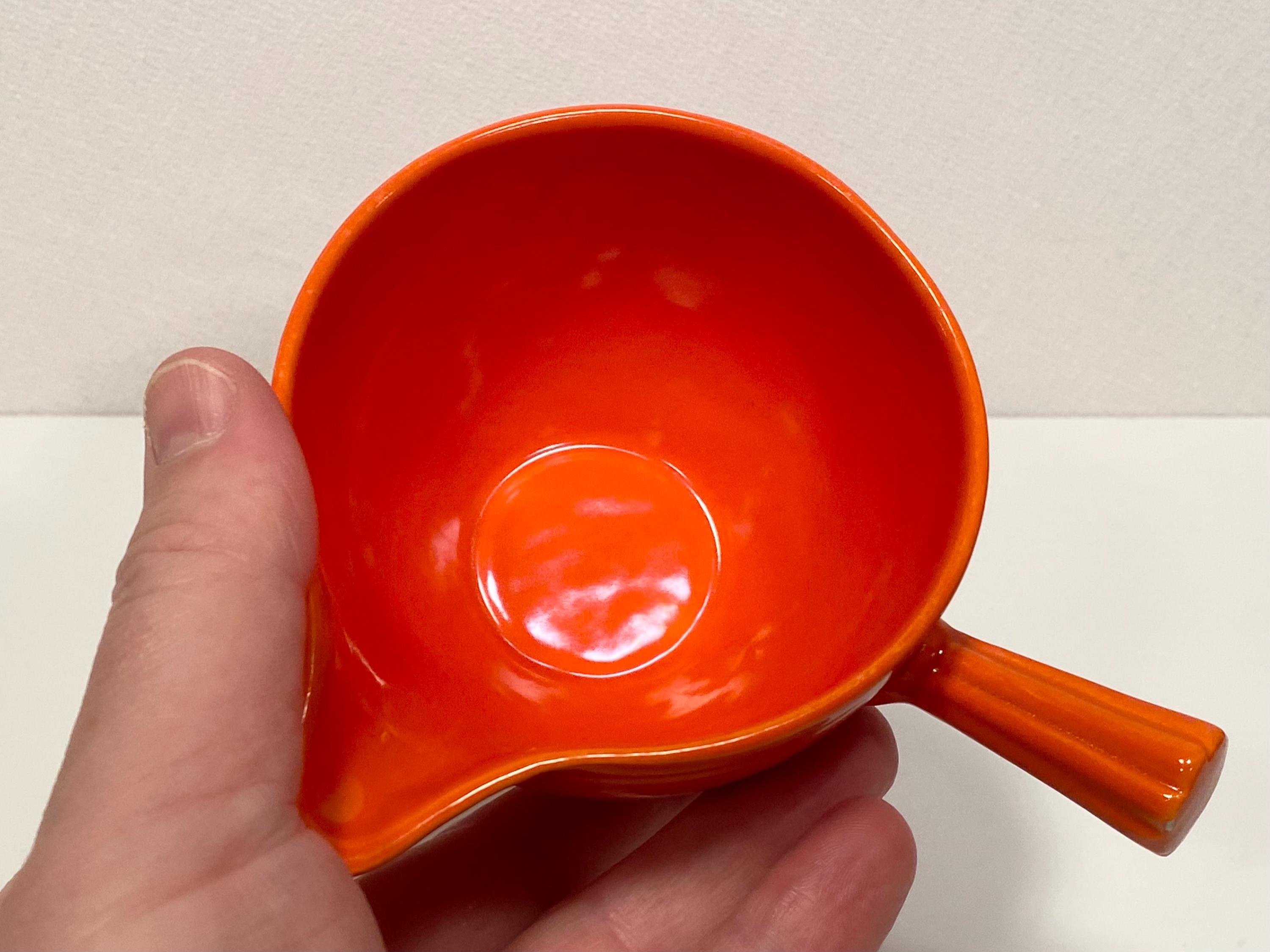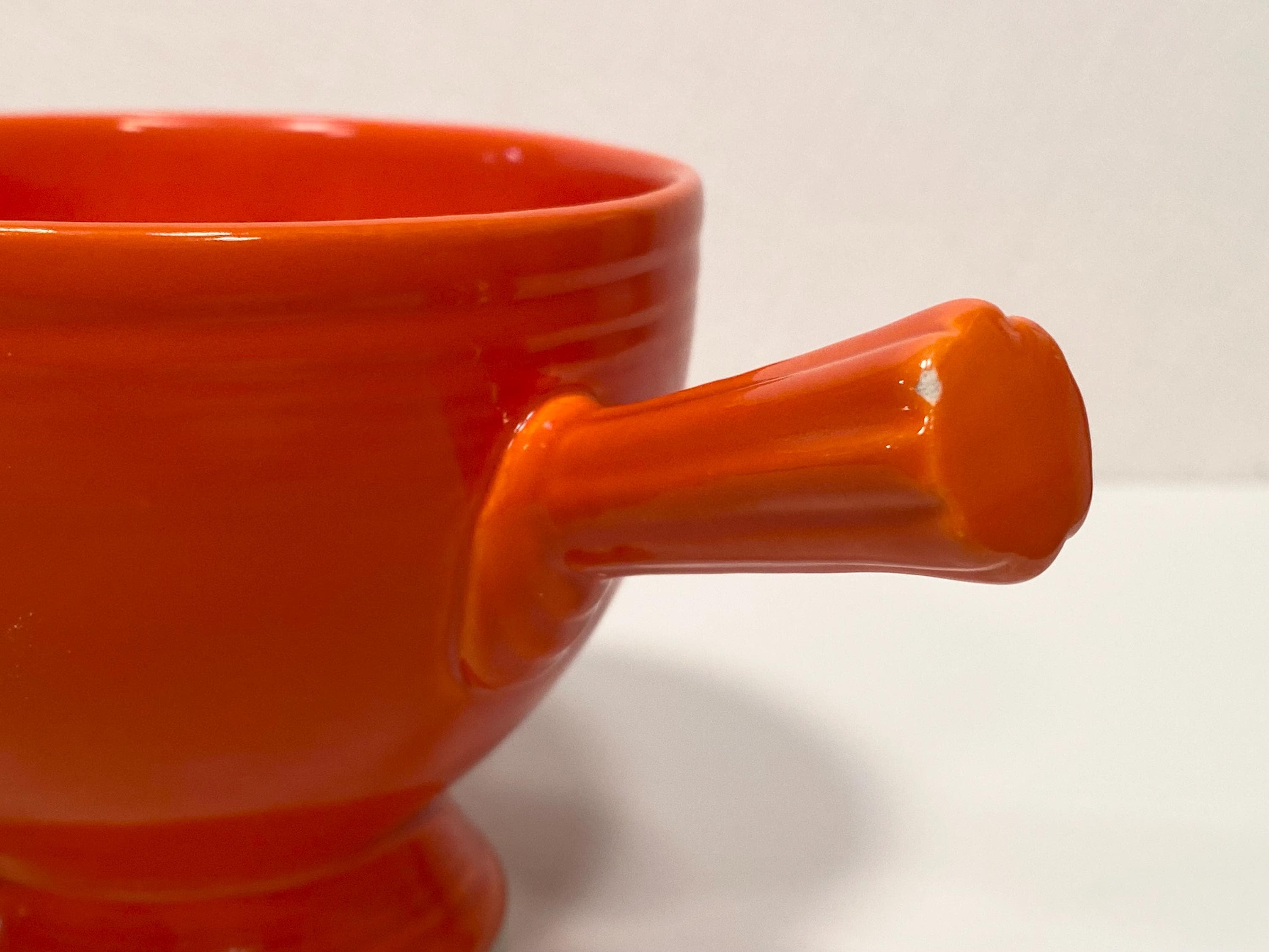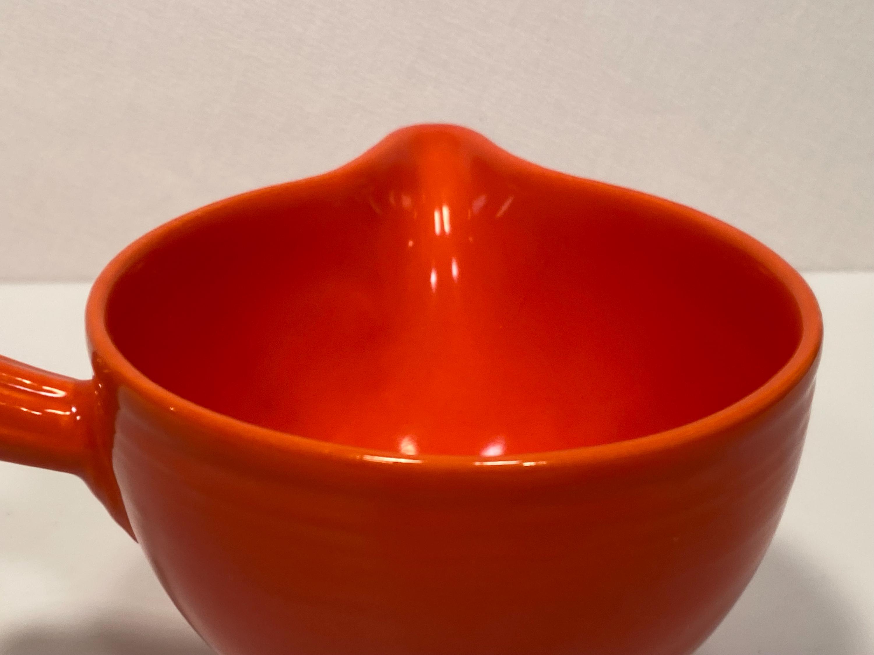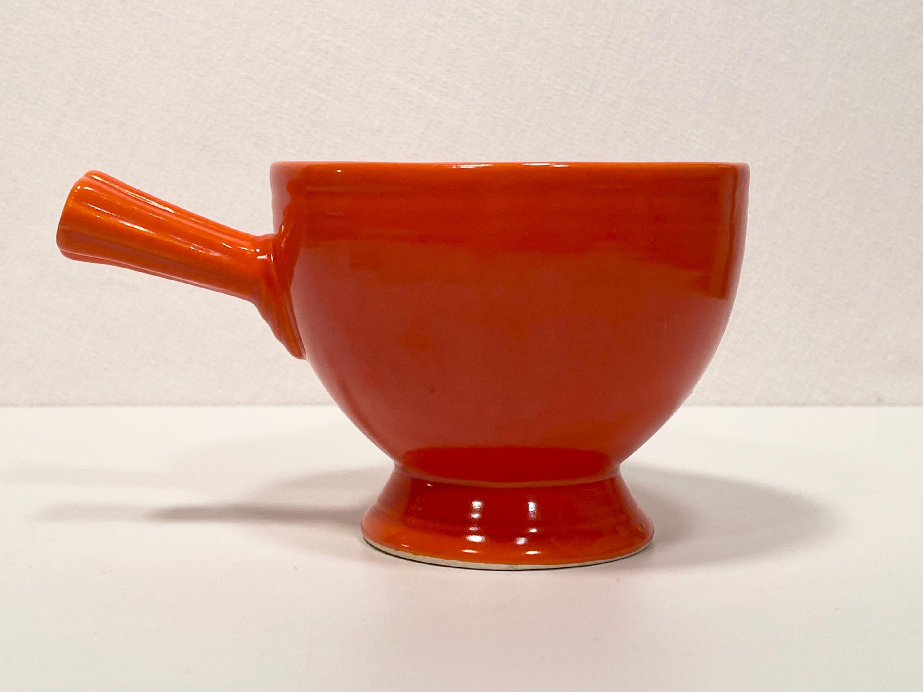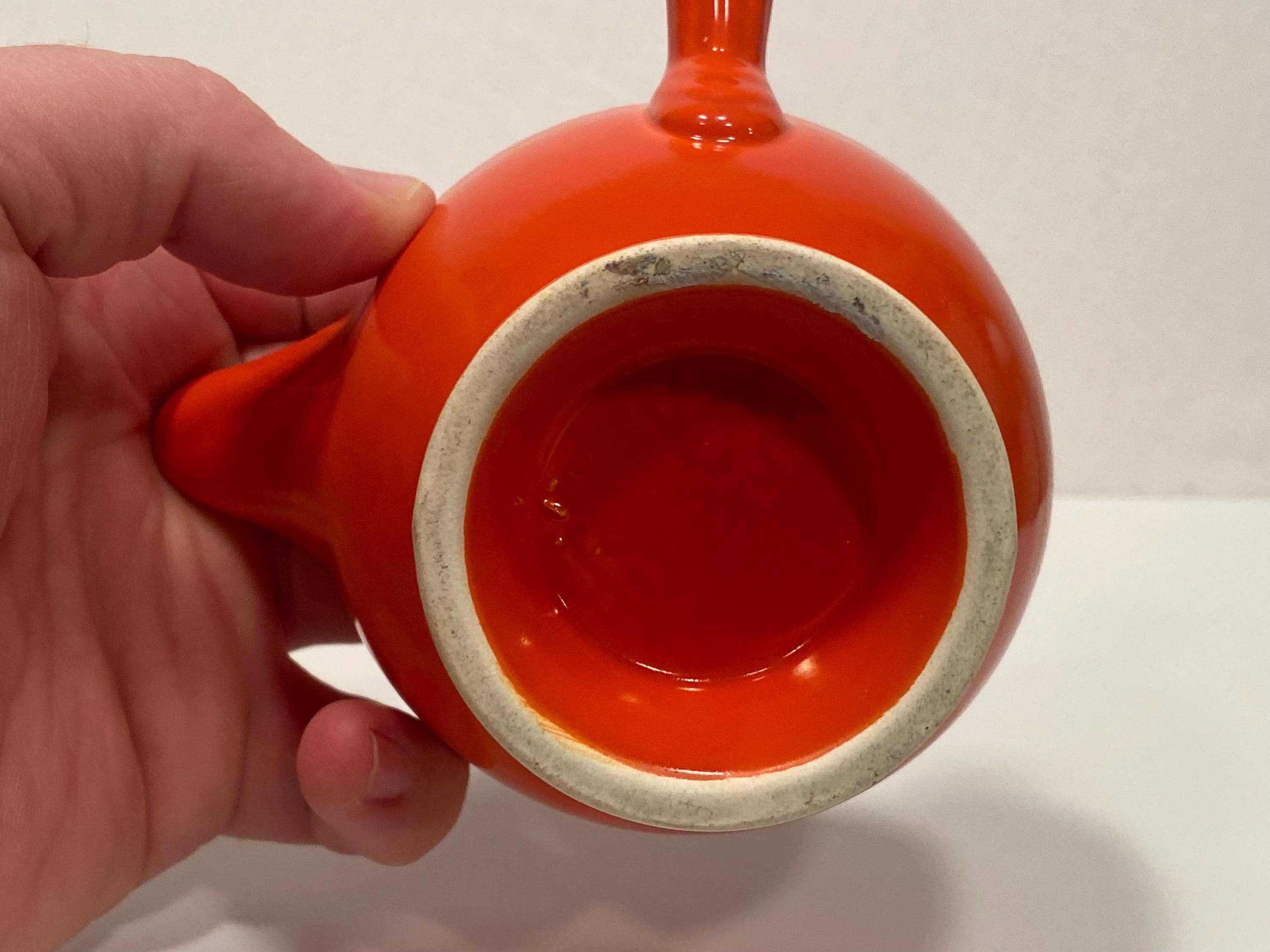 Circa 1936-1938: The stick handle is an early and rare design element in the fiesta pottery line. The After Dinner Coffeepot was already designed when Rhead was working on a creamer, so the stick handle fell into a perfect compliment. This version would only be produced for a little over two years. Slip cast in two pieces with the handle attatched by hand, this piece would be replaced by the ring handled creamer by the summer of 1938. The vintage fiesta stick handled creamer is a great early piece of vintage fiesta pottery representing the earliest part of the tableware line. Great condition with no cracks or chips. Great for display or use everyday for a cracker dish, serving dish, snack tray, etc. ***Smallest flea bite in the glaze on the end of the handle which can be seen highlighted in the last photo. Please see photos for condition and decide for yourself as all sales are final.