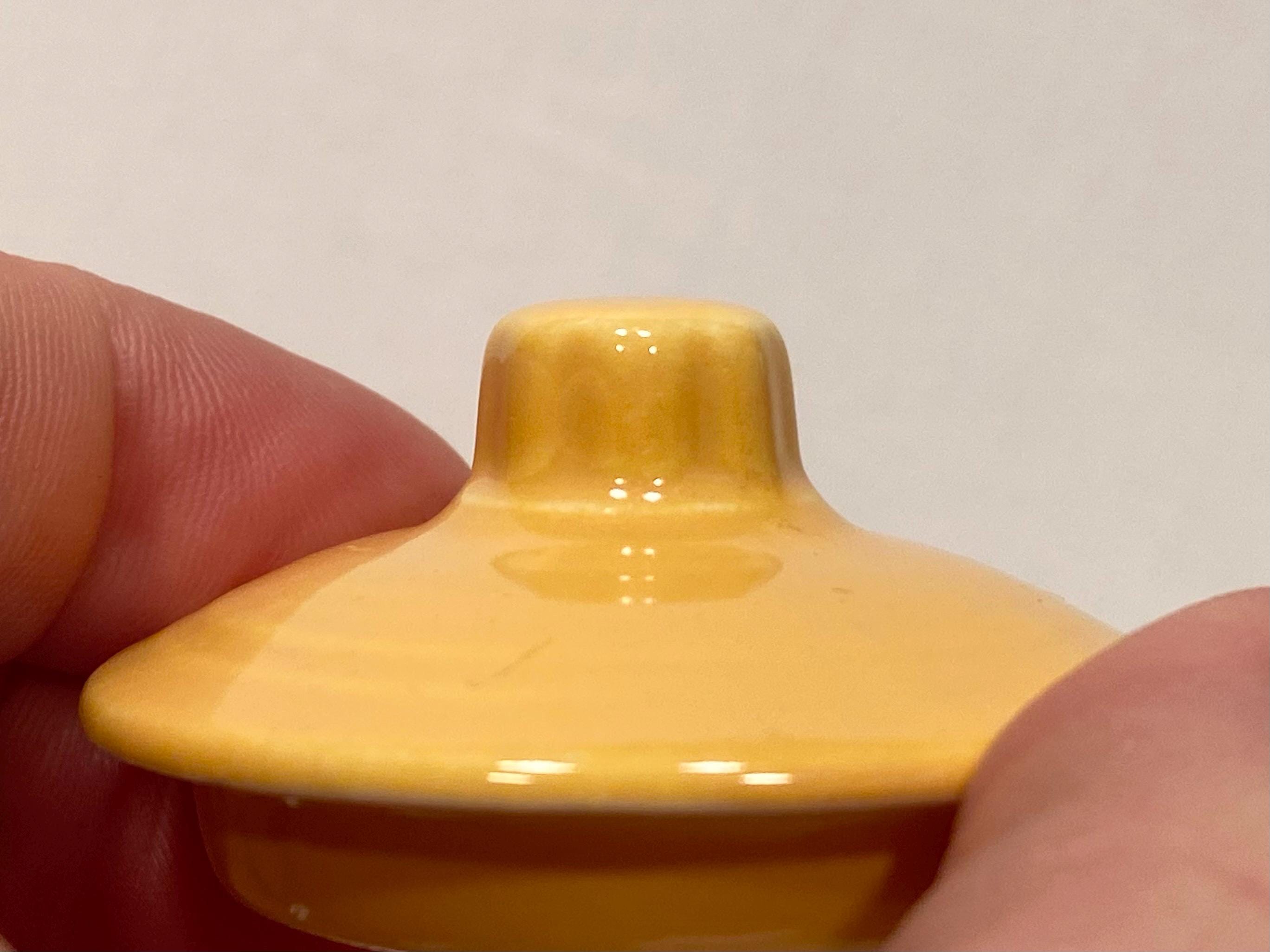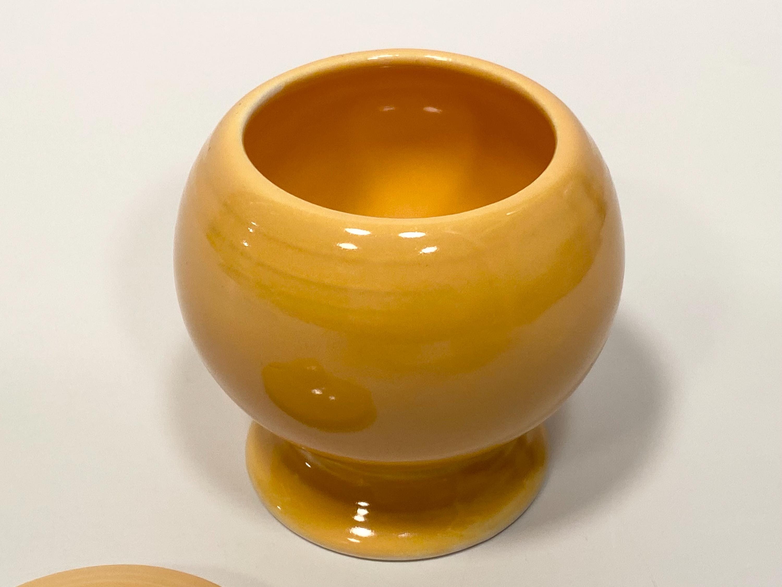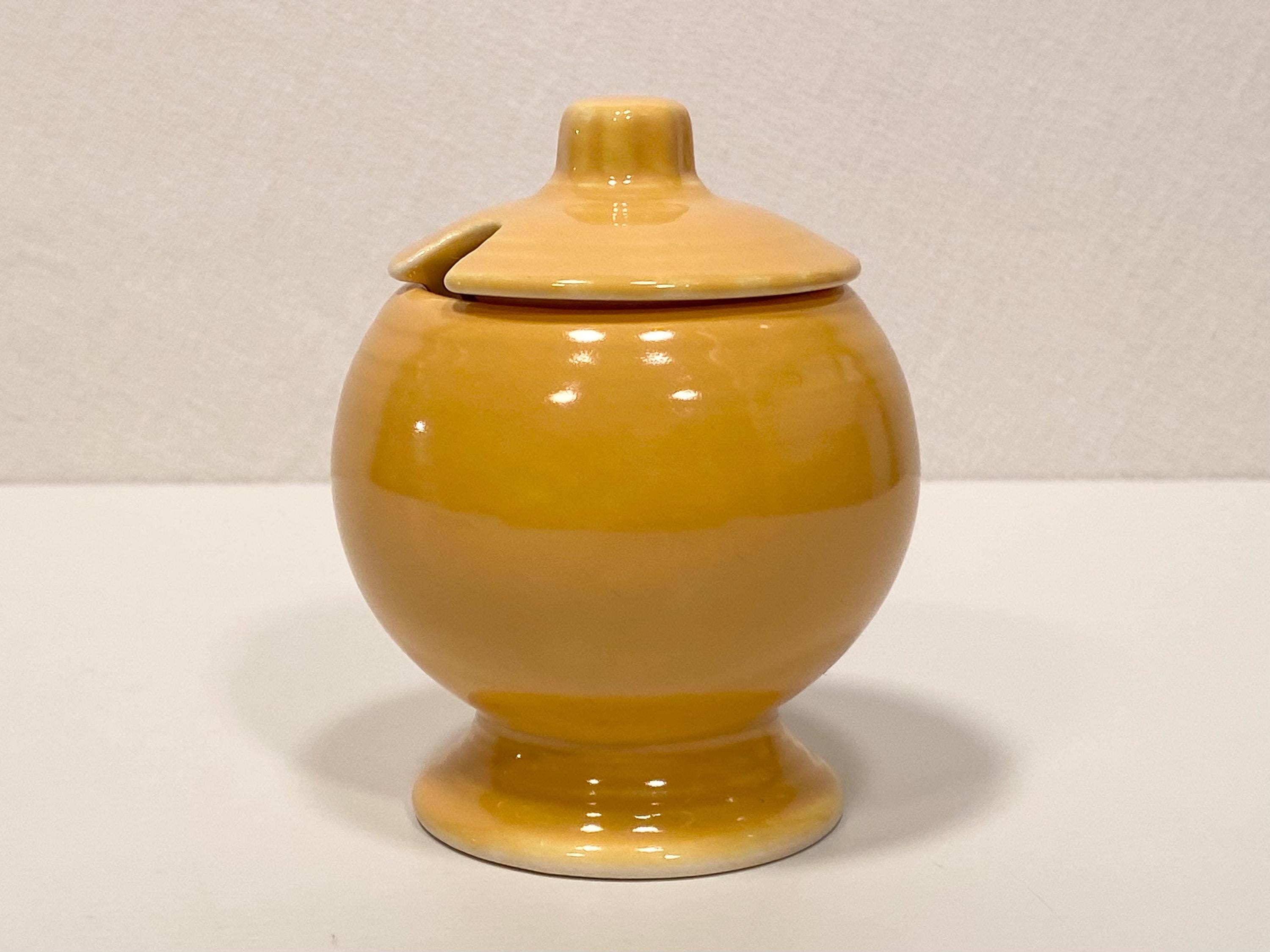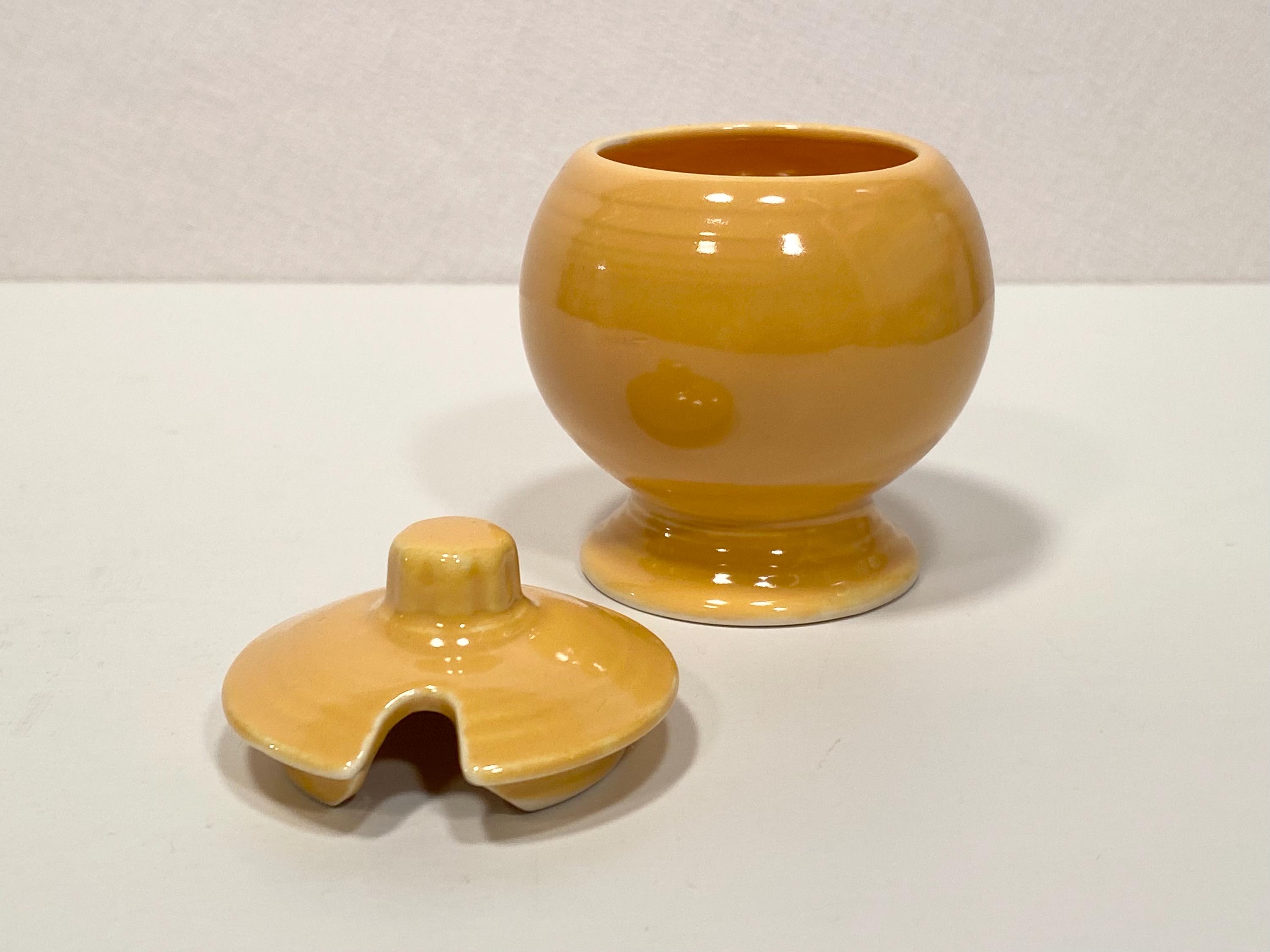 Fiesta Yellow Covered Mustard Jar in very good condition with no cracks or major chips. One small "flea bite" in the underside of the lid, but it can not be seen when sitting upright. Great for display or use everyday for storing mustard or other spreadable condiments or dips. Approximately 2 1/2" wide by 3 1/16" tall. Please see photos for condition and decide for yourself as all sales are final.