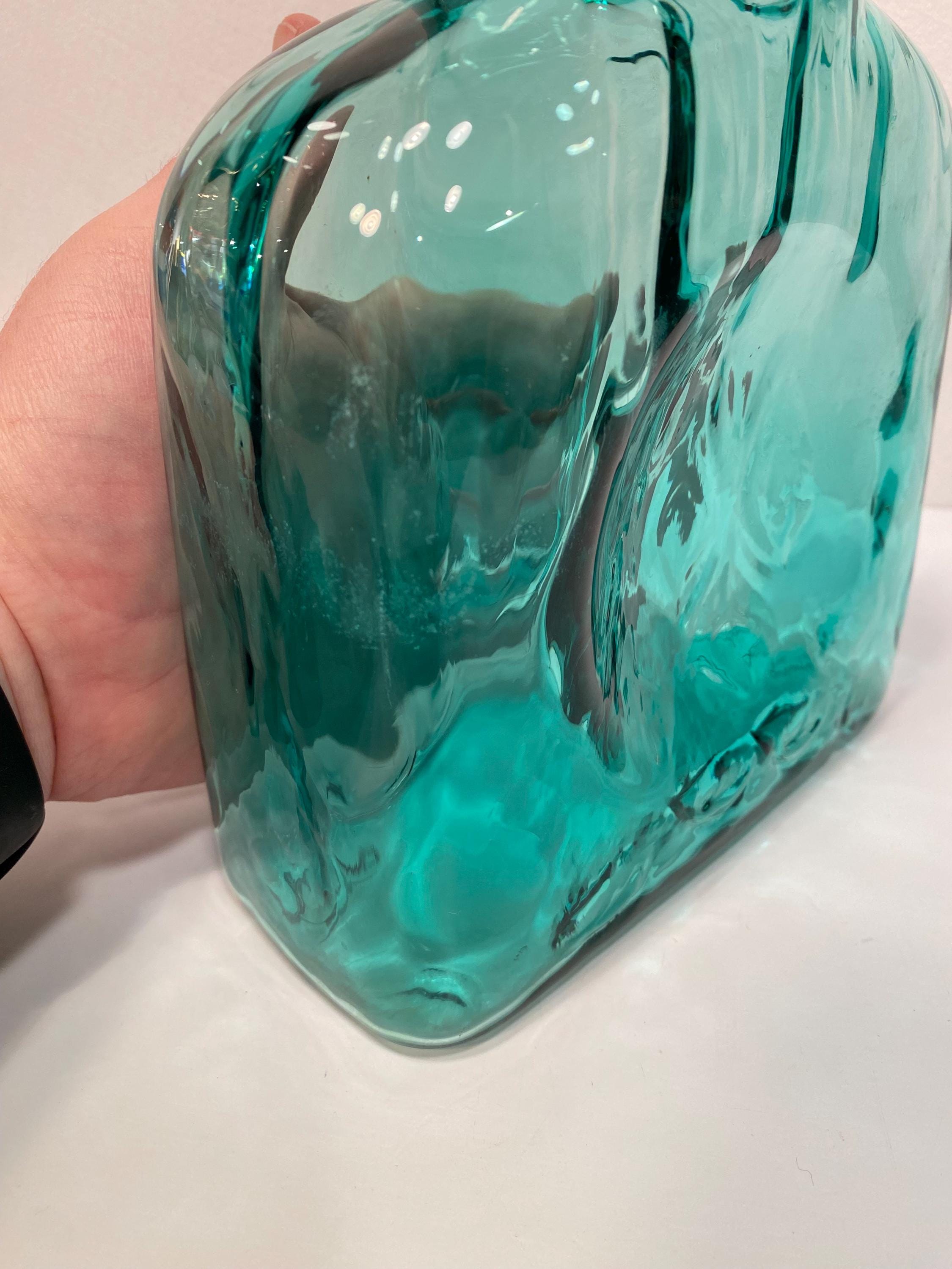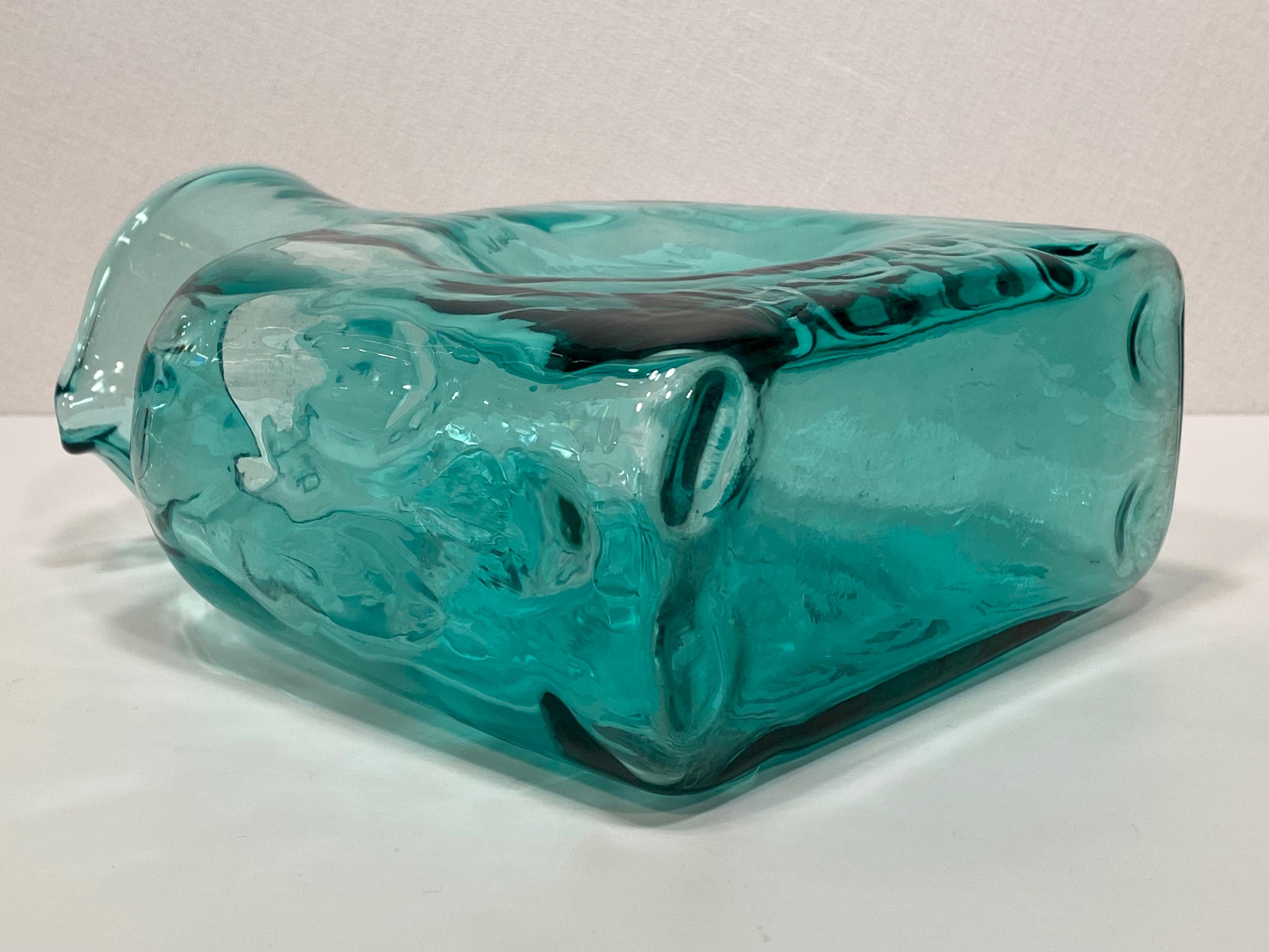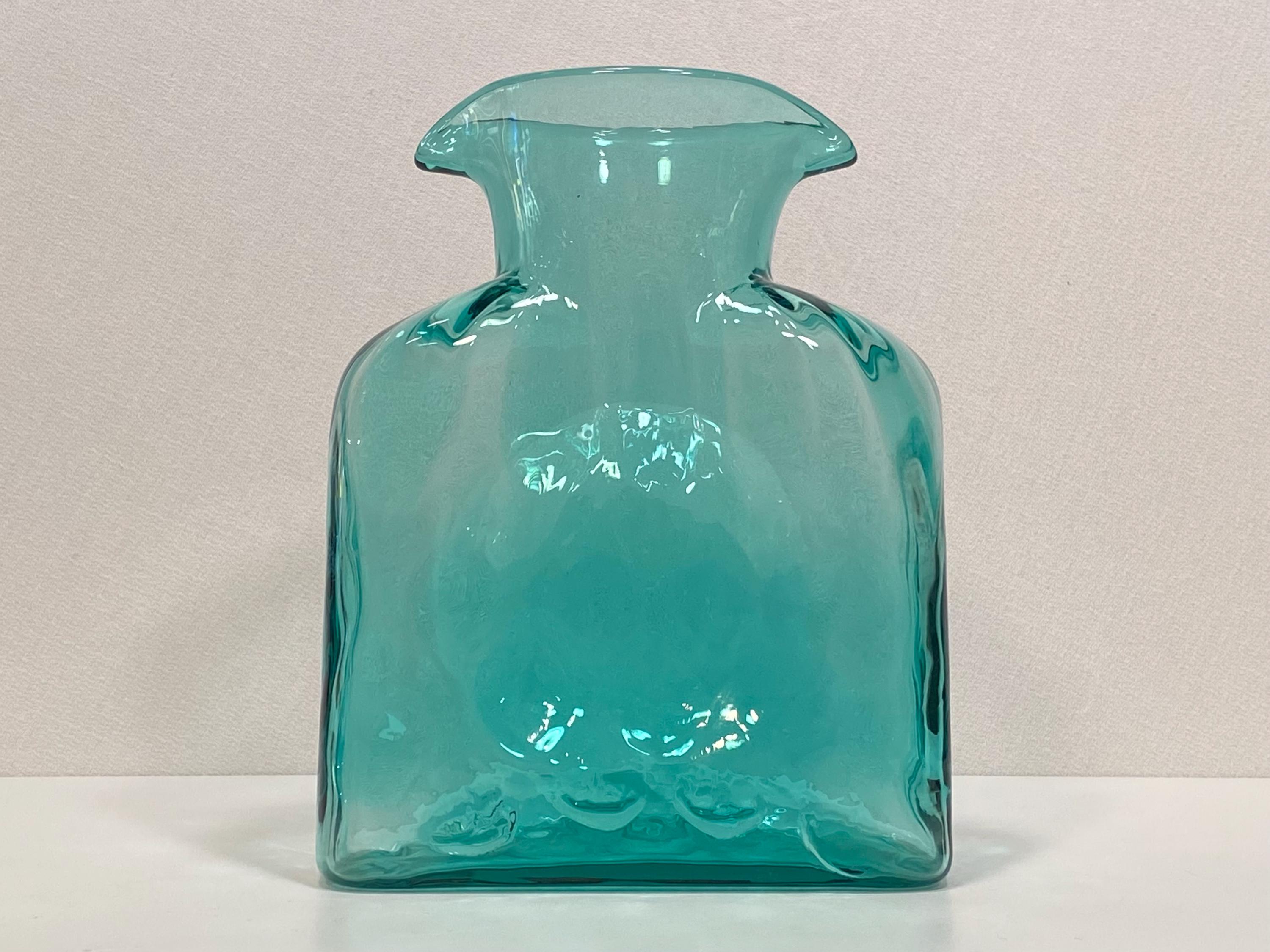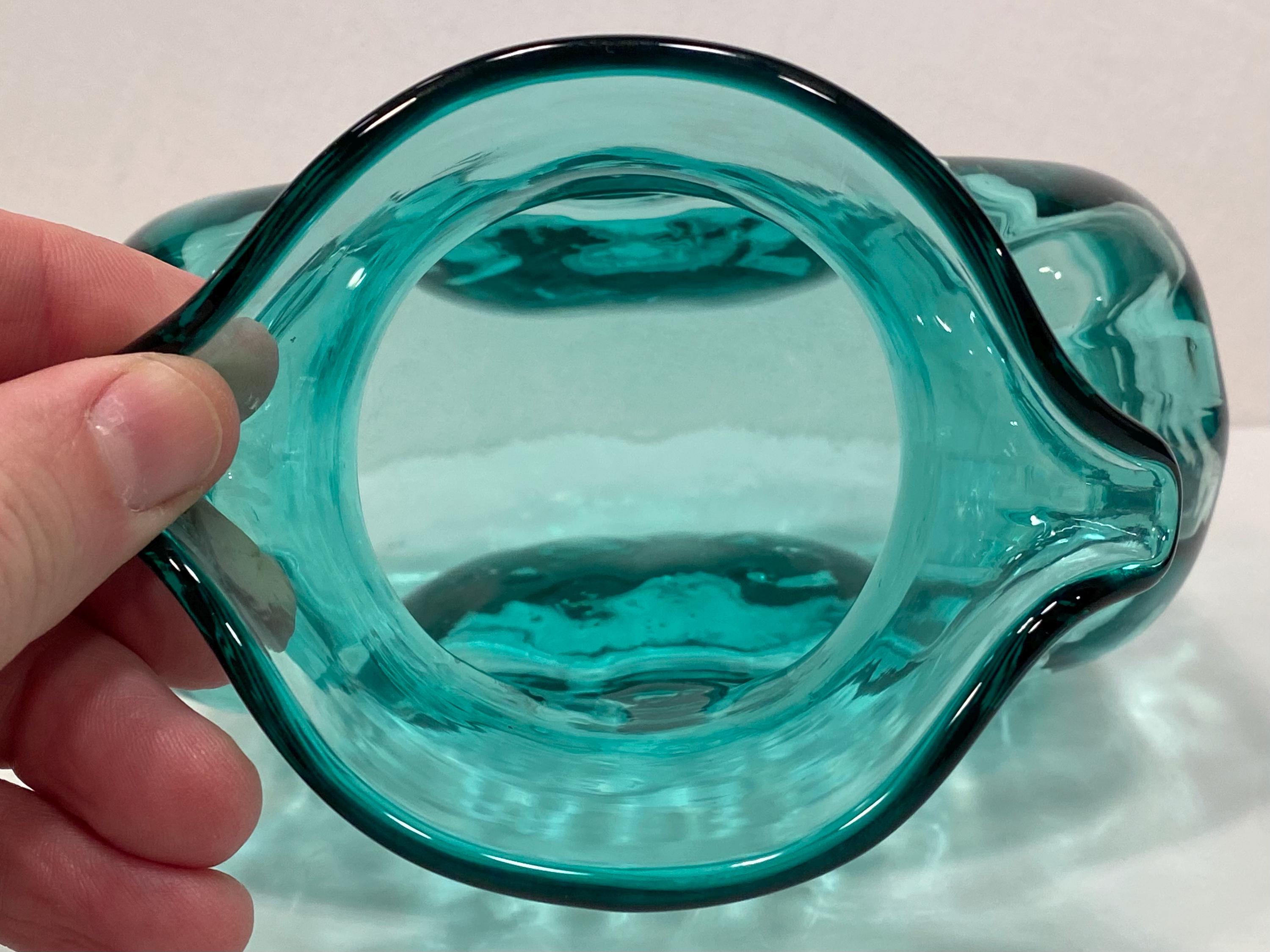Blenko Sea Green Double Spout Pitcher in good condition with no cracks or chips. Color is vibrant with some very light/negligible water spots on the inside. It was very hard to get to show up in photos, but see last 2 pics for reference. Stands at approximately 8.5" tall, 6.5" wide, and 3" deep. Please see photos for condition and decide for yourself as all sales are final.