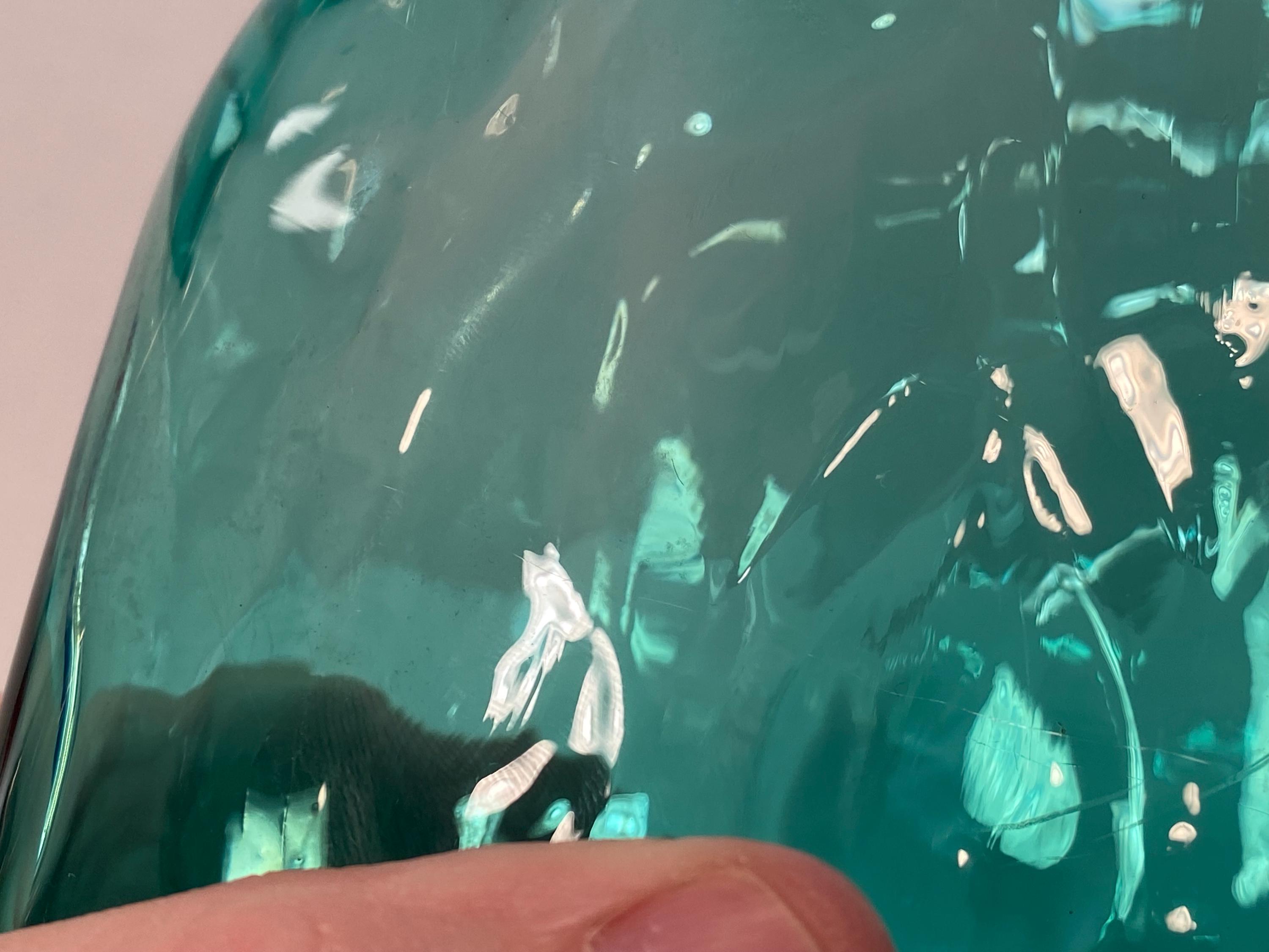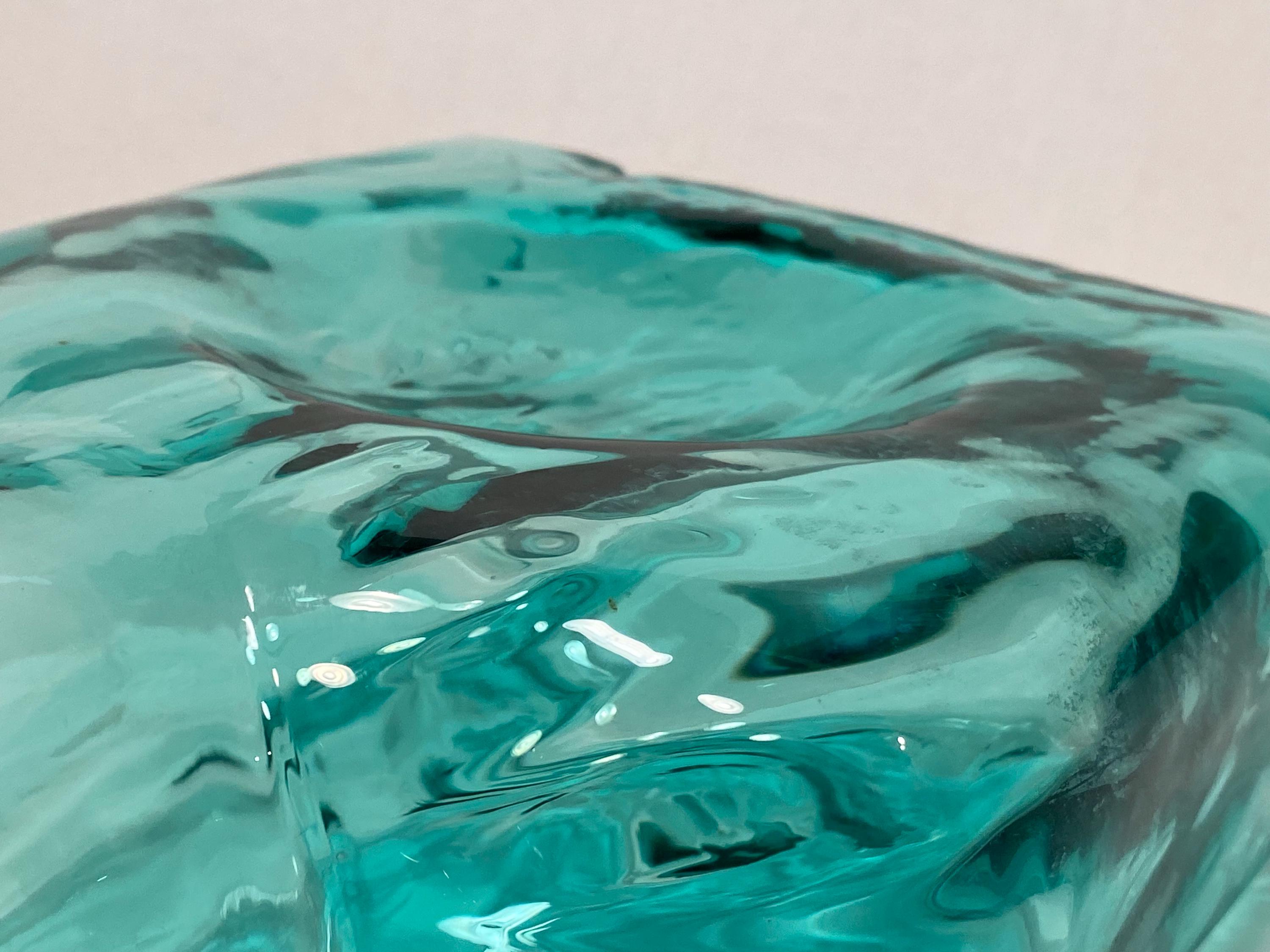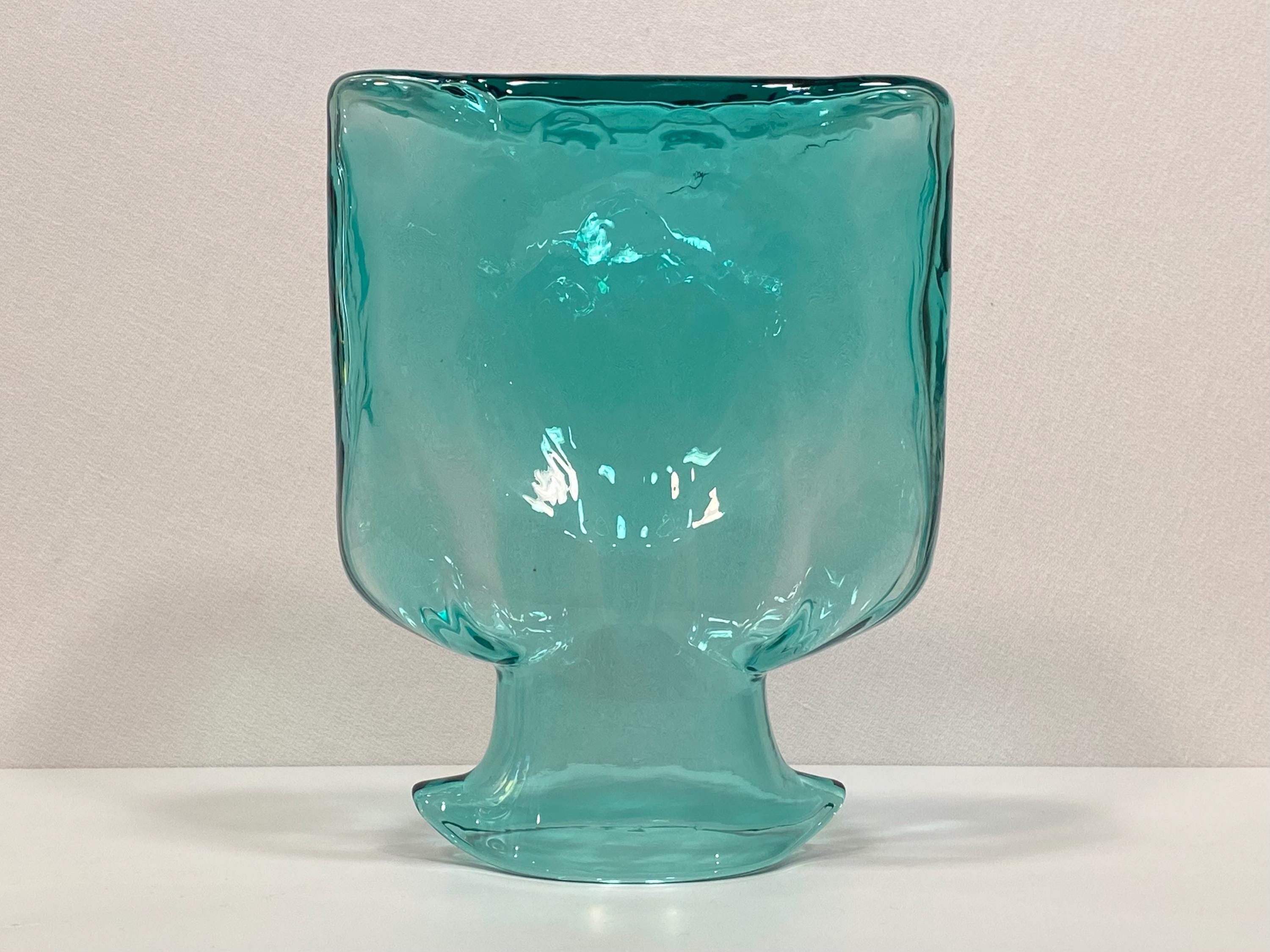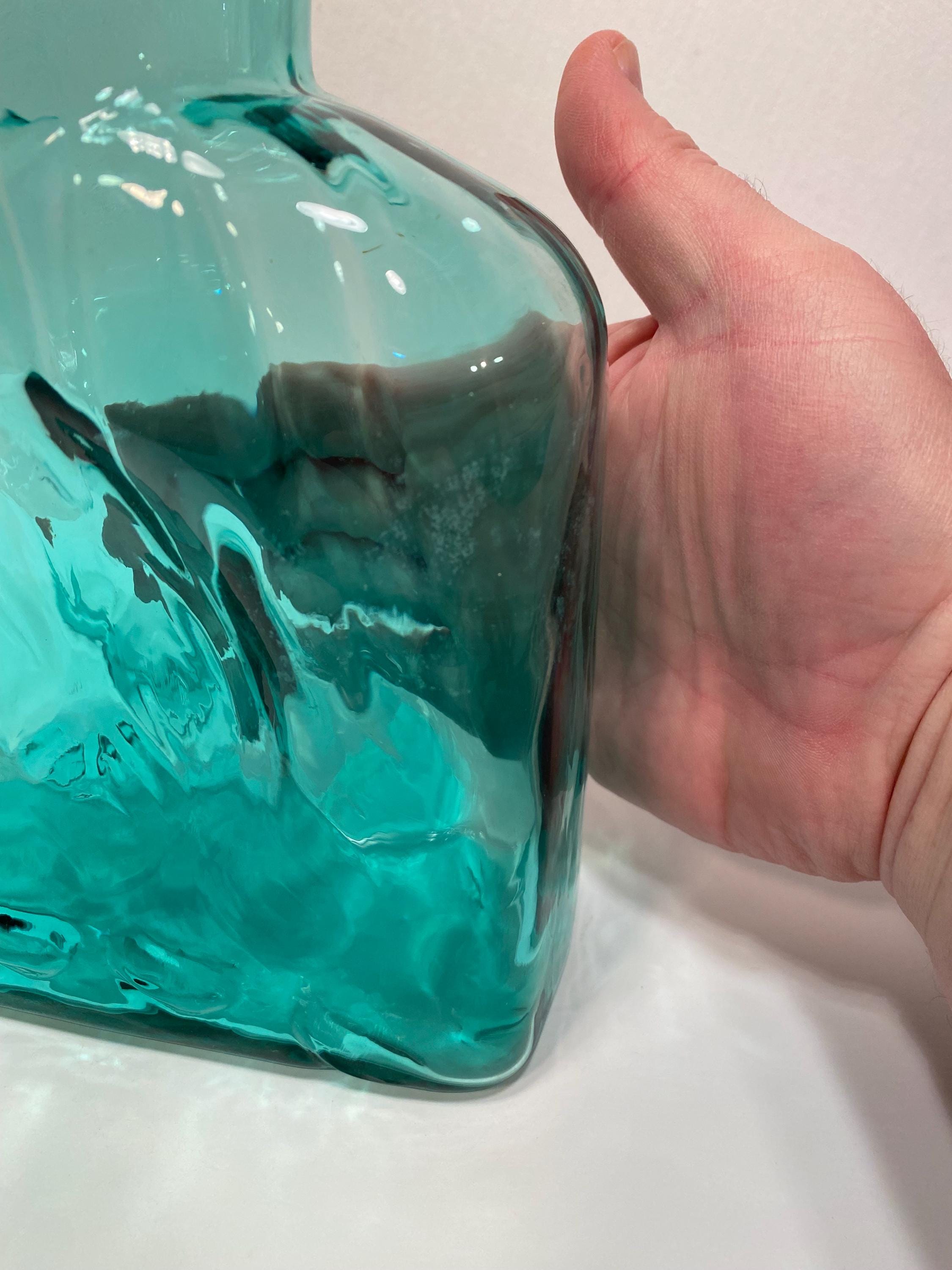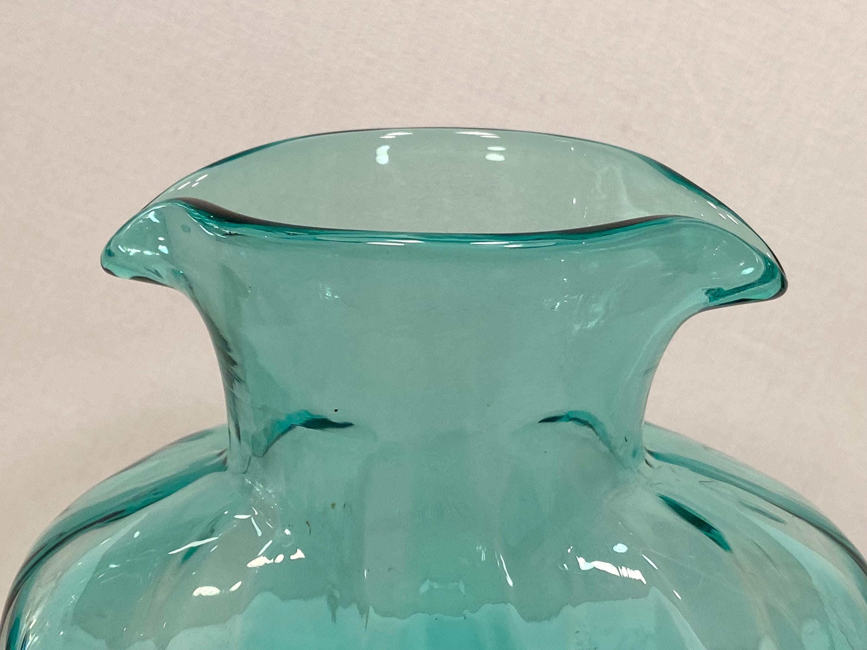 Blenko Sea Green Double Spout Pitcher in good condition with no cracks or chips. Color is vibrant with some very light/negligible water spots on the inside. It was very hard to get to show up in photos, but see last 2 pics for reference. Stands at approximately 8.5" tall, 6.5" wide, and 3" deep. Please see photos for condition and decide for yourself as all sales are final.