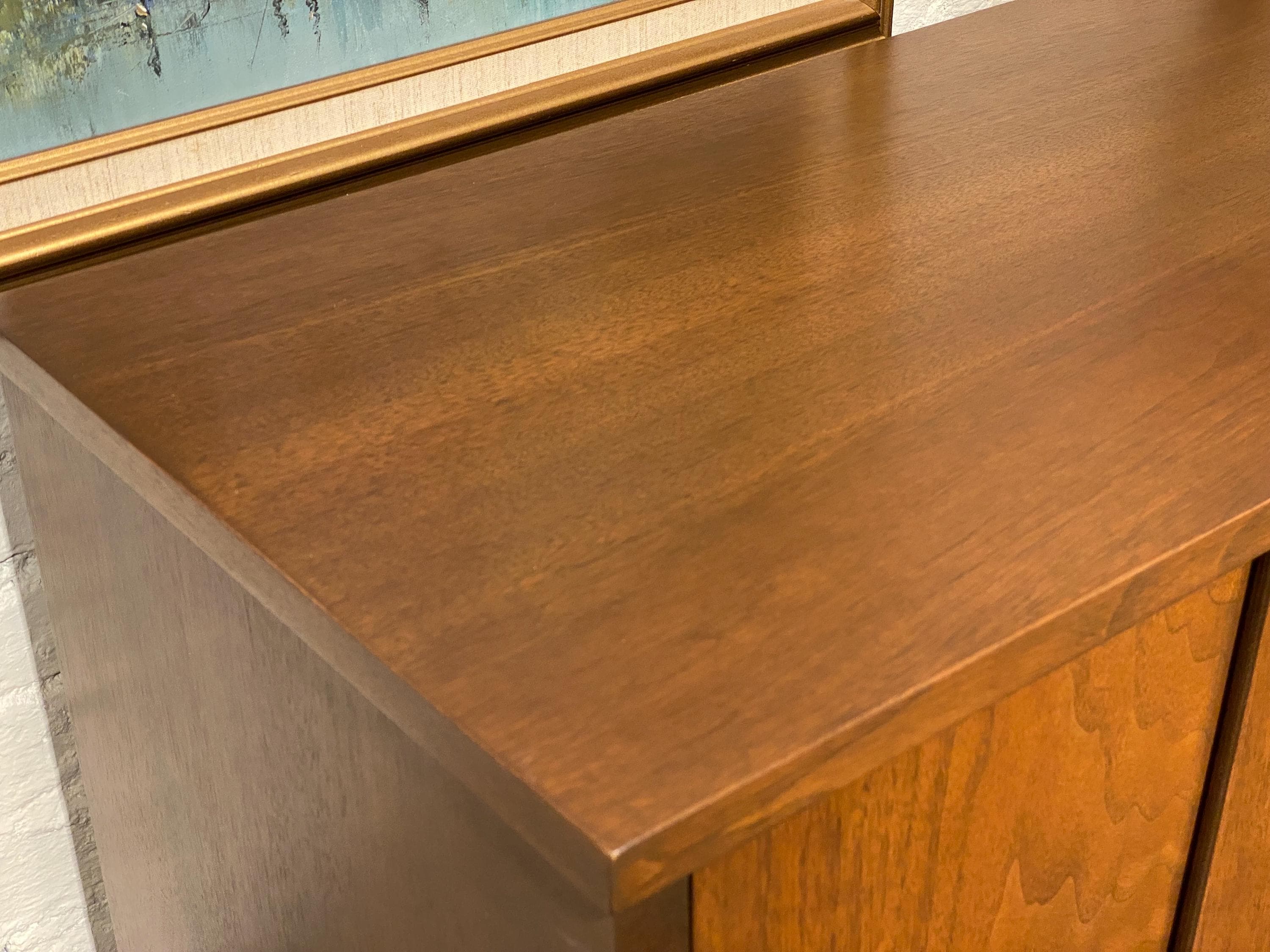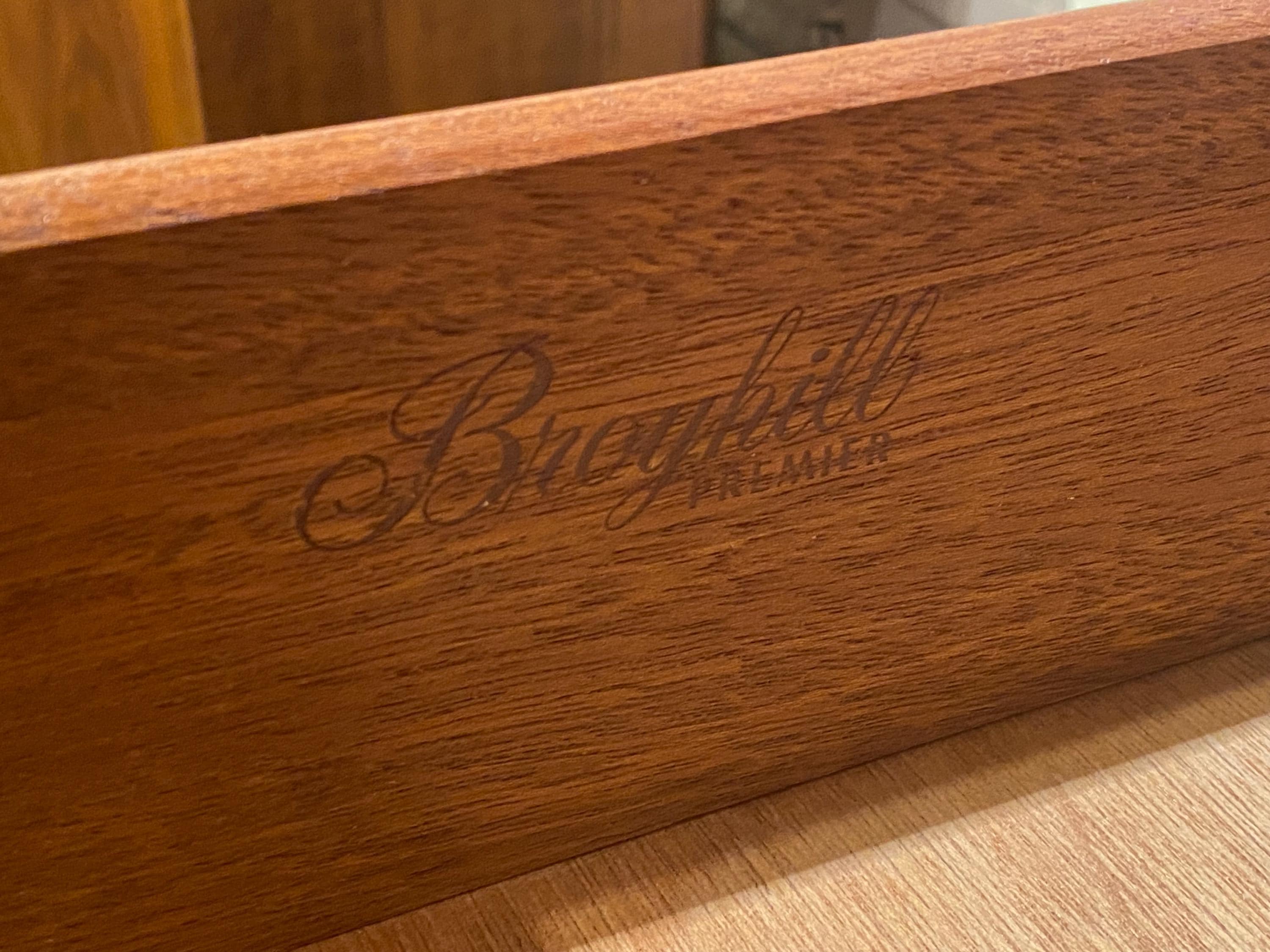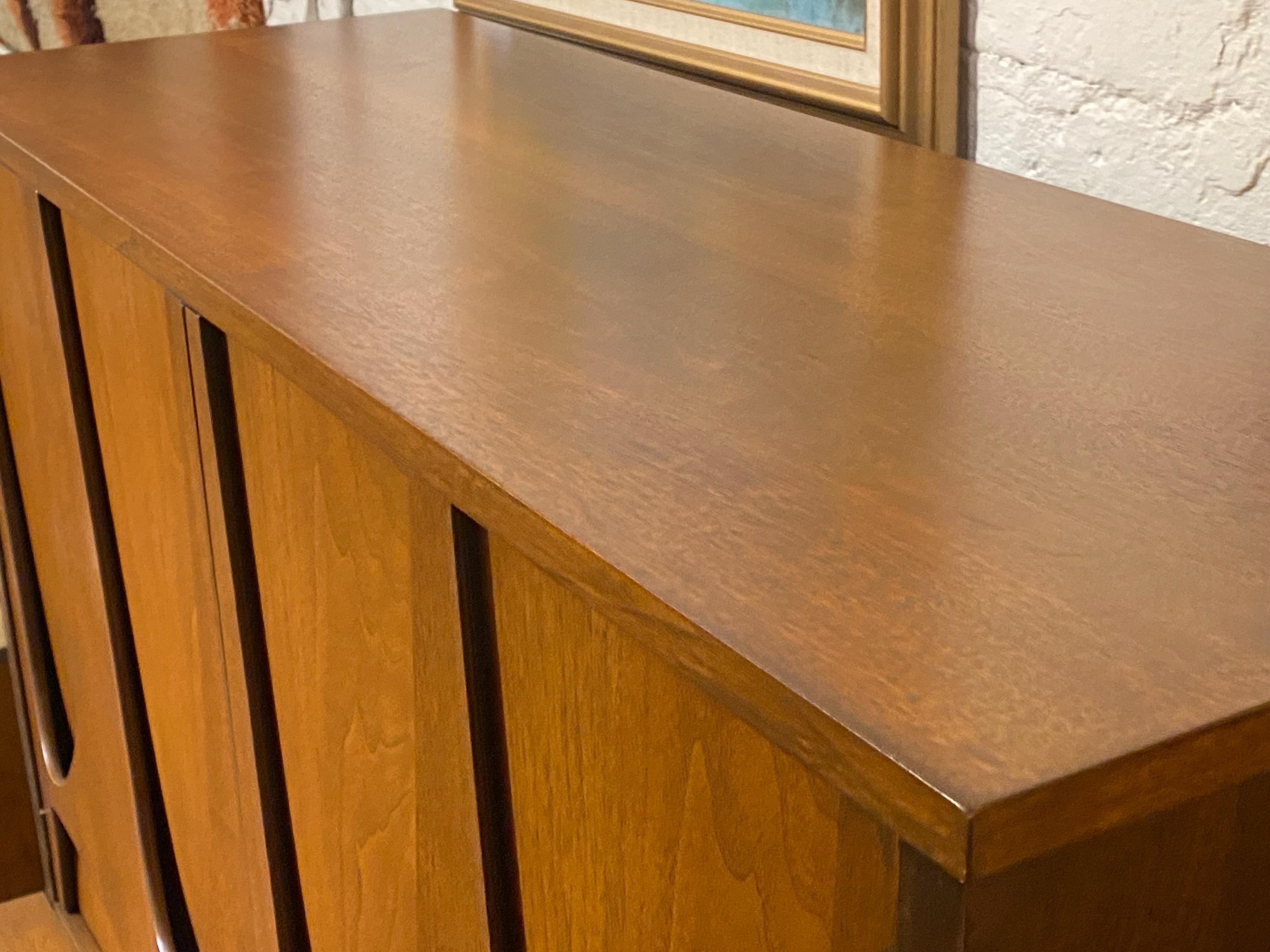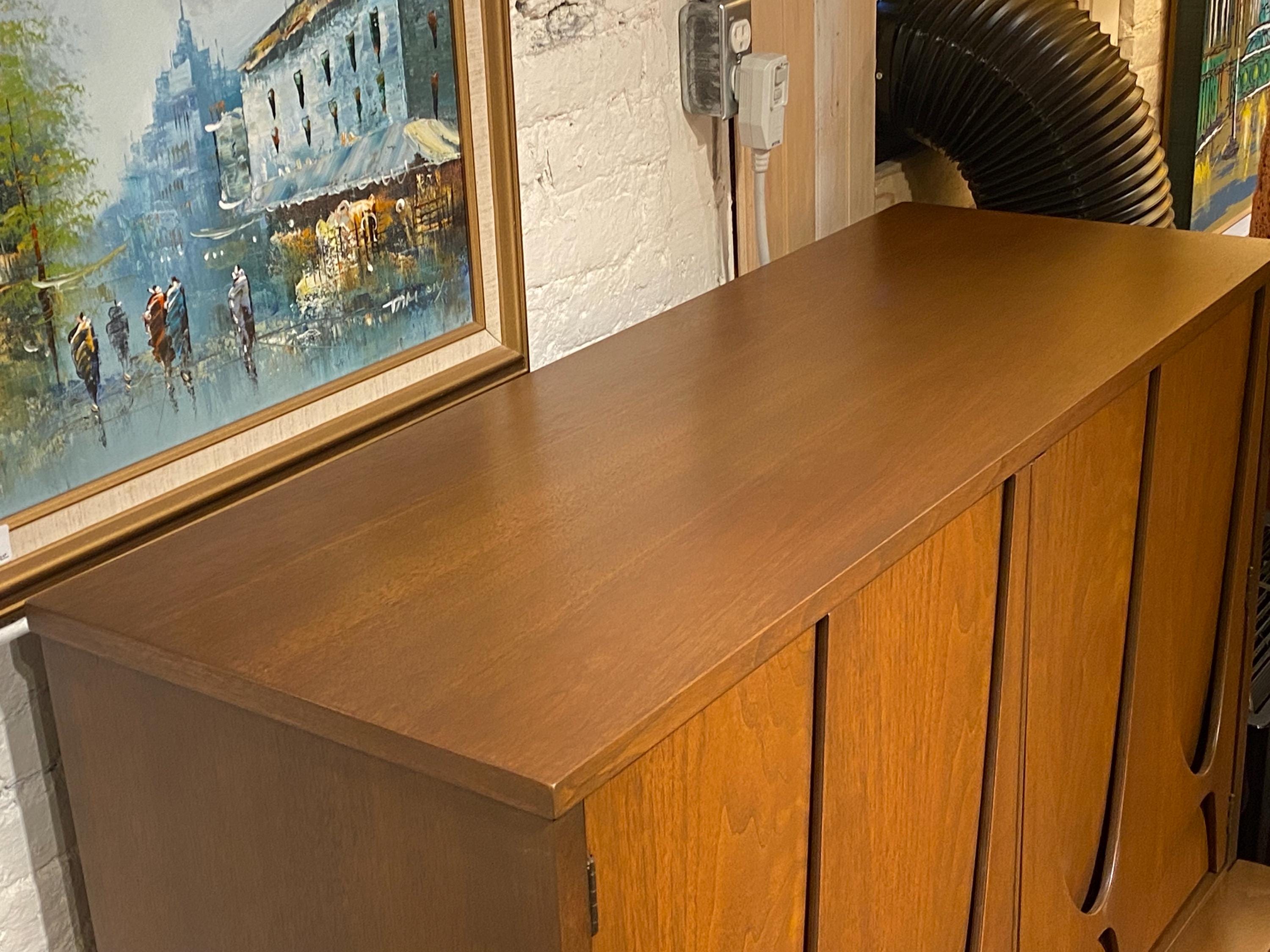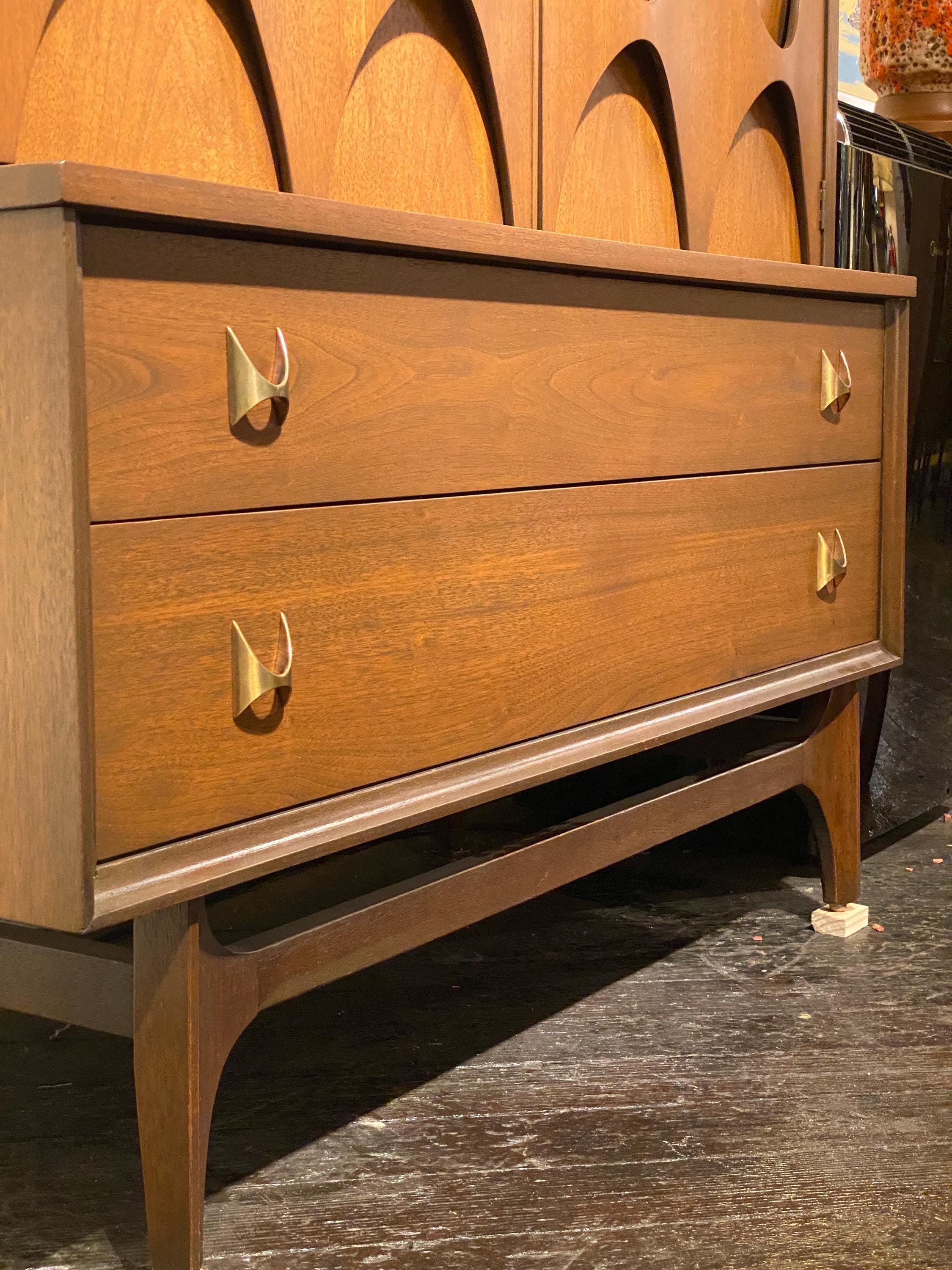 Here is a beautiful walnut gentleman’s chest by Broyhill for their Brasilia line, circa 1960s. If you are looking for something stylish with lots of storage options, then this piece is for you. All drawers glide smoothly, and this piece was given a full makeover in our workshop to bring back its original look. This piece came from a pet-free and smoke-free home. This piece looks great and has very minimal signs of wear. Please reach out if you have any questions. This piece is in good restored condition.