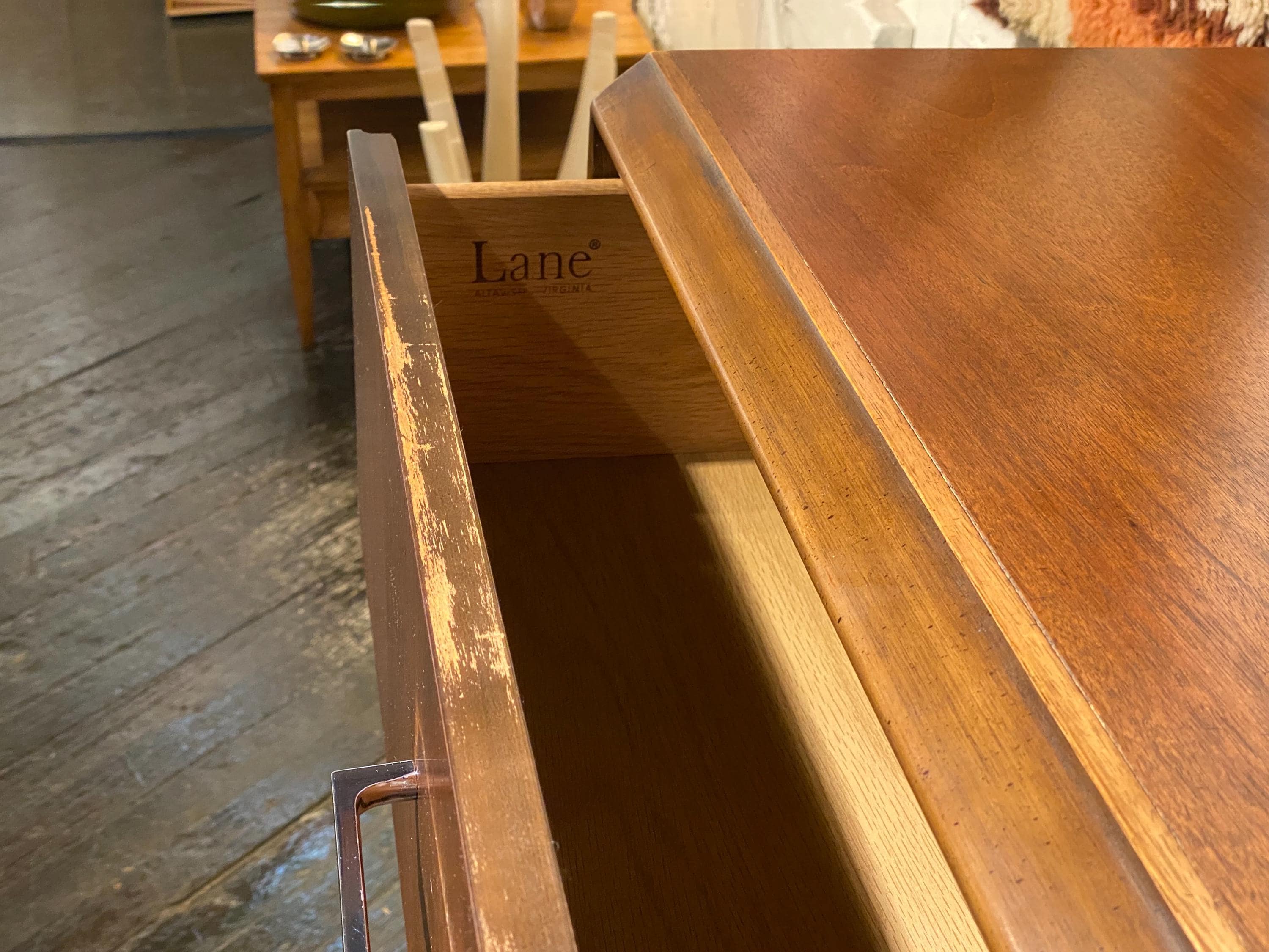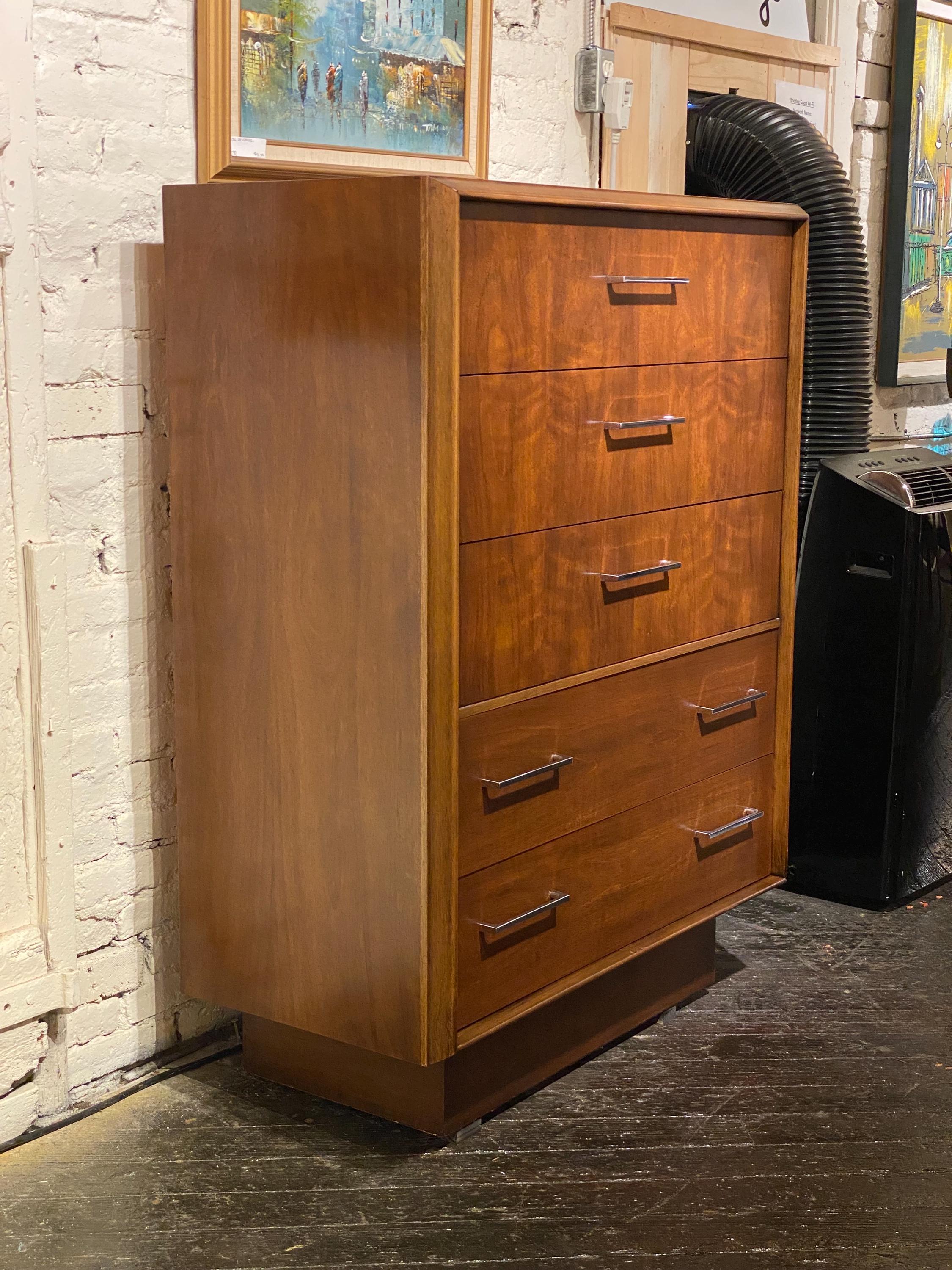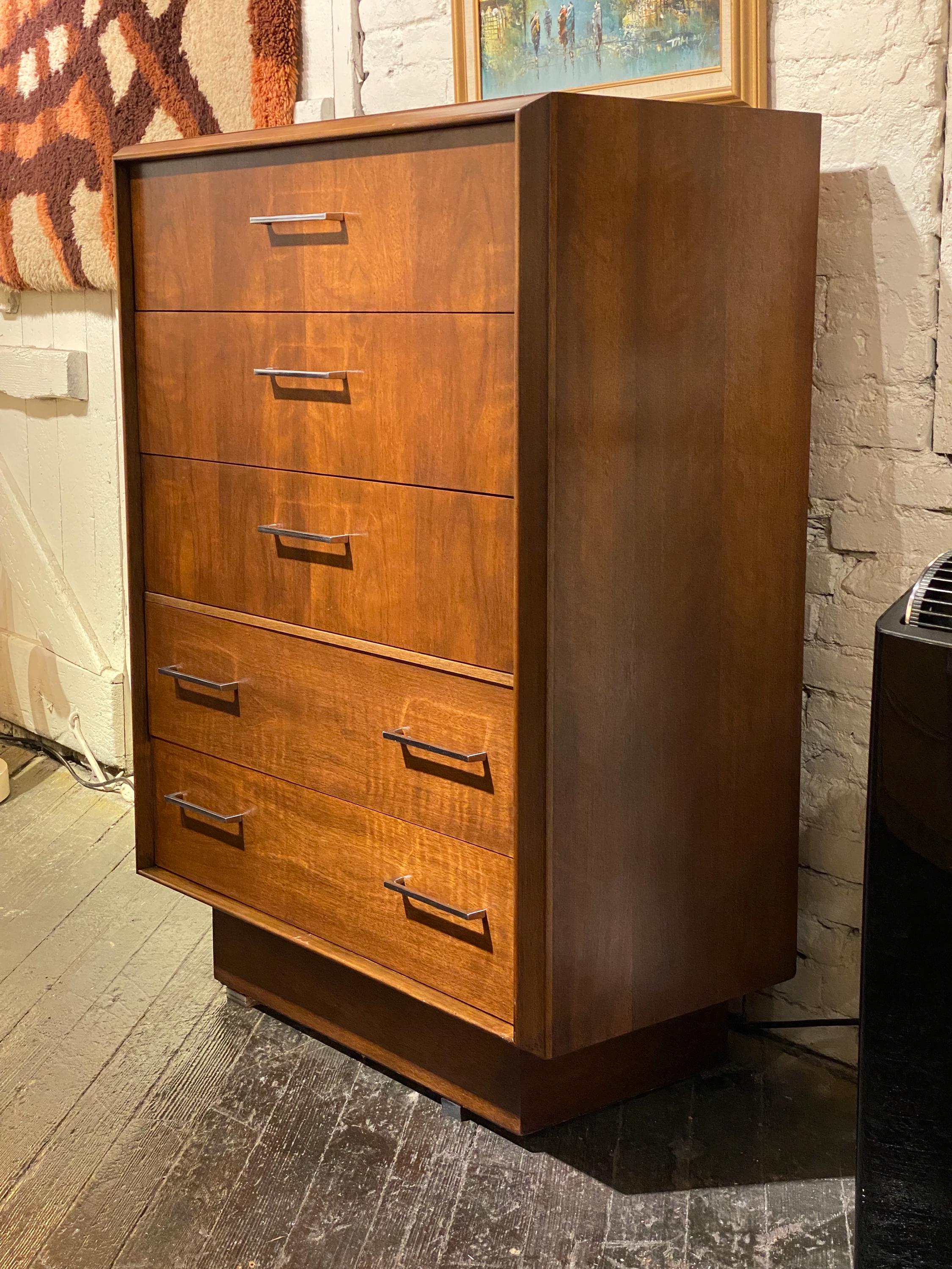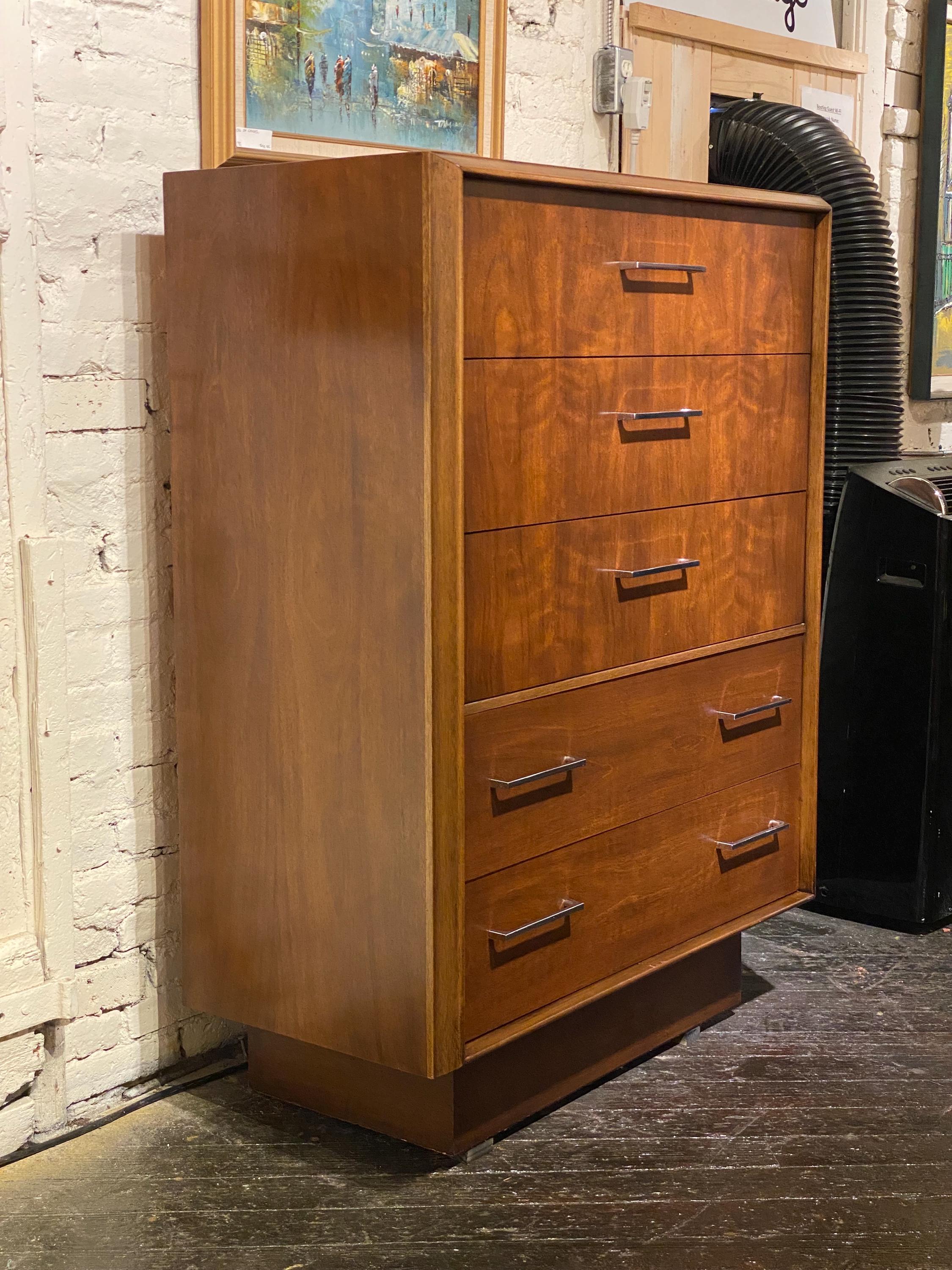 Lane tall 5-drawer chest of drawers in walnut, circa 1971. This piece was made to last, and it shows. The pieces boast Lanes' transition from the 1960s peg legs to the platform base of the 1970s. All 5 drawers are deep and offer lots of storage. The walnut grain pops from every angle on this chest of drawers. The piece is marked by its maker, and all 5 drawers operate as they should. We gave this piece a thorough cleaning inside and out to restore its original look. As the finish was in great original condition, we left it as is. A few things to note: the very bottom of the inside lip has two scratches from the bottom drawer being removed and hitting the frame. The top drawer has some wear on the inside top of the drawer front, which can be seen when the drawer is open. Please see our last few images for more details.