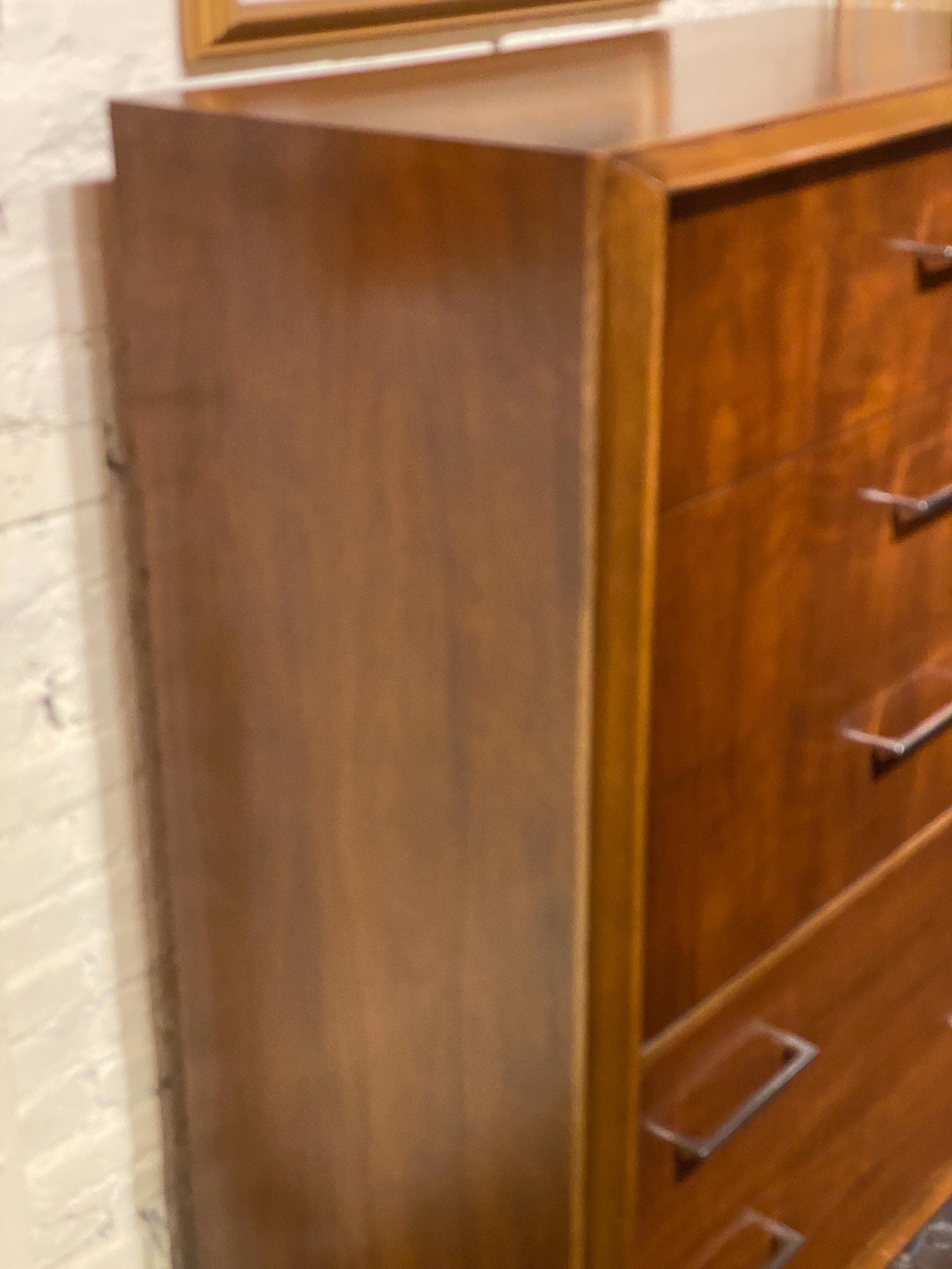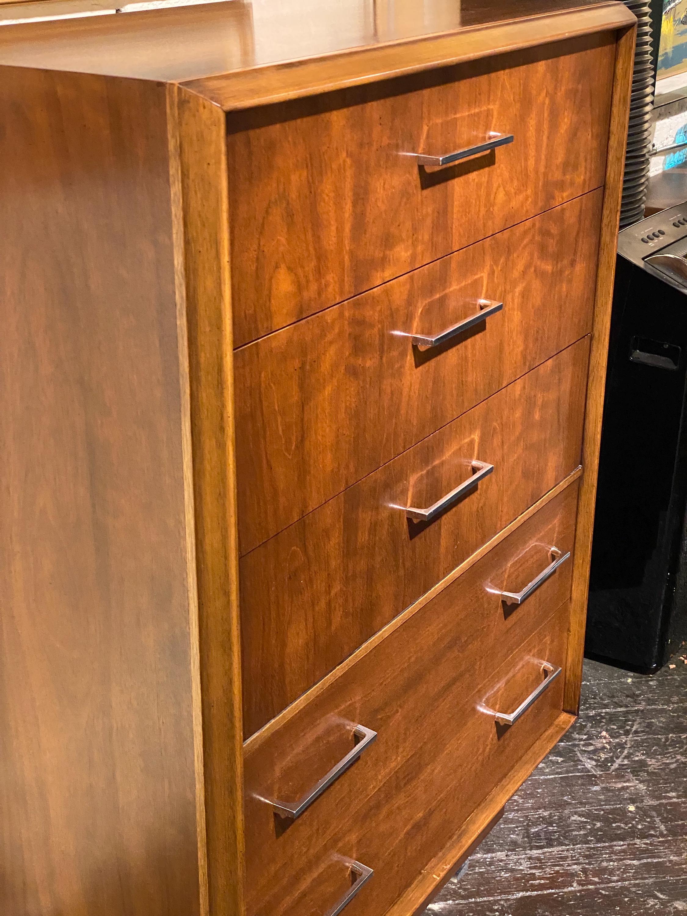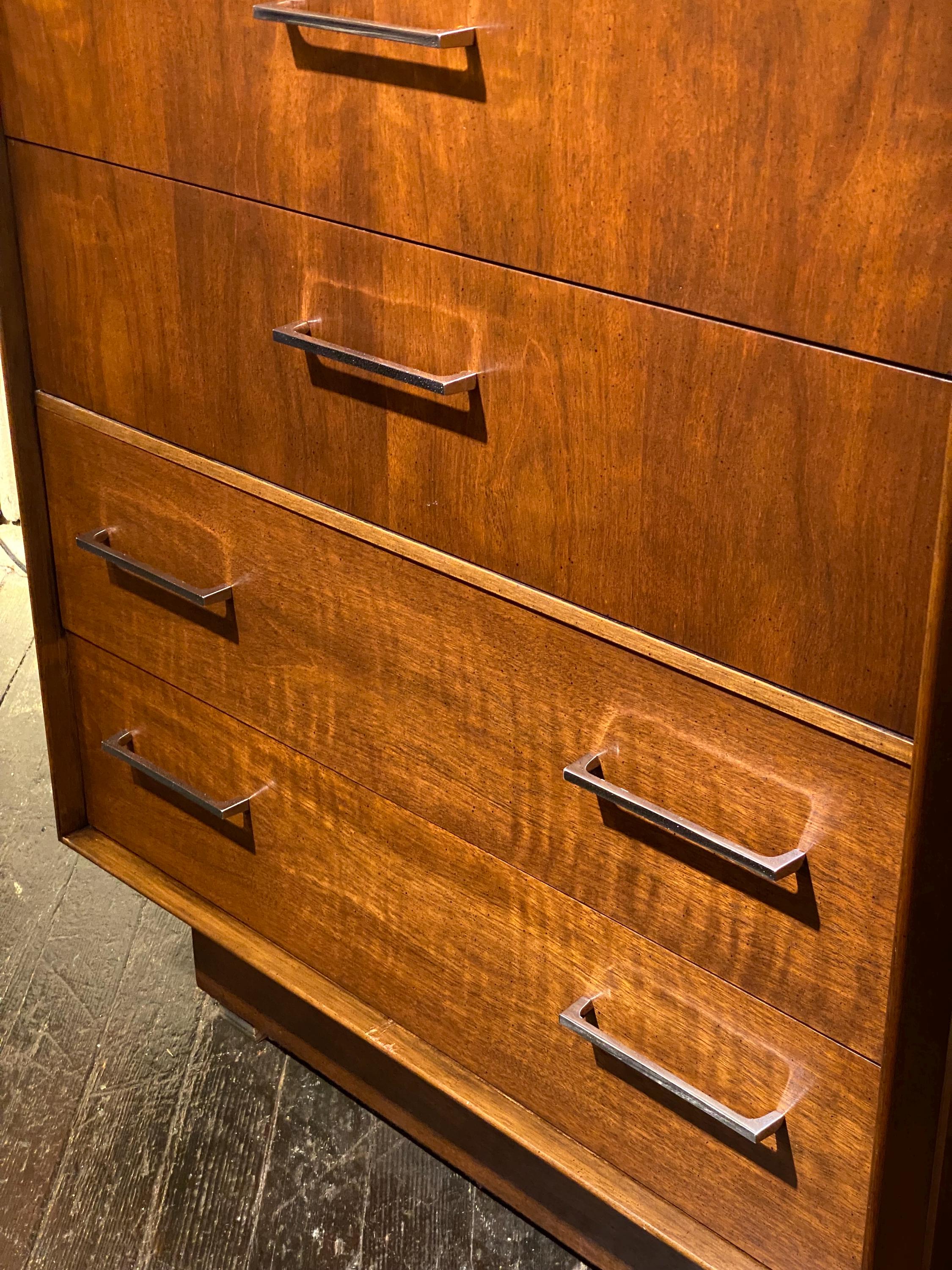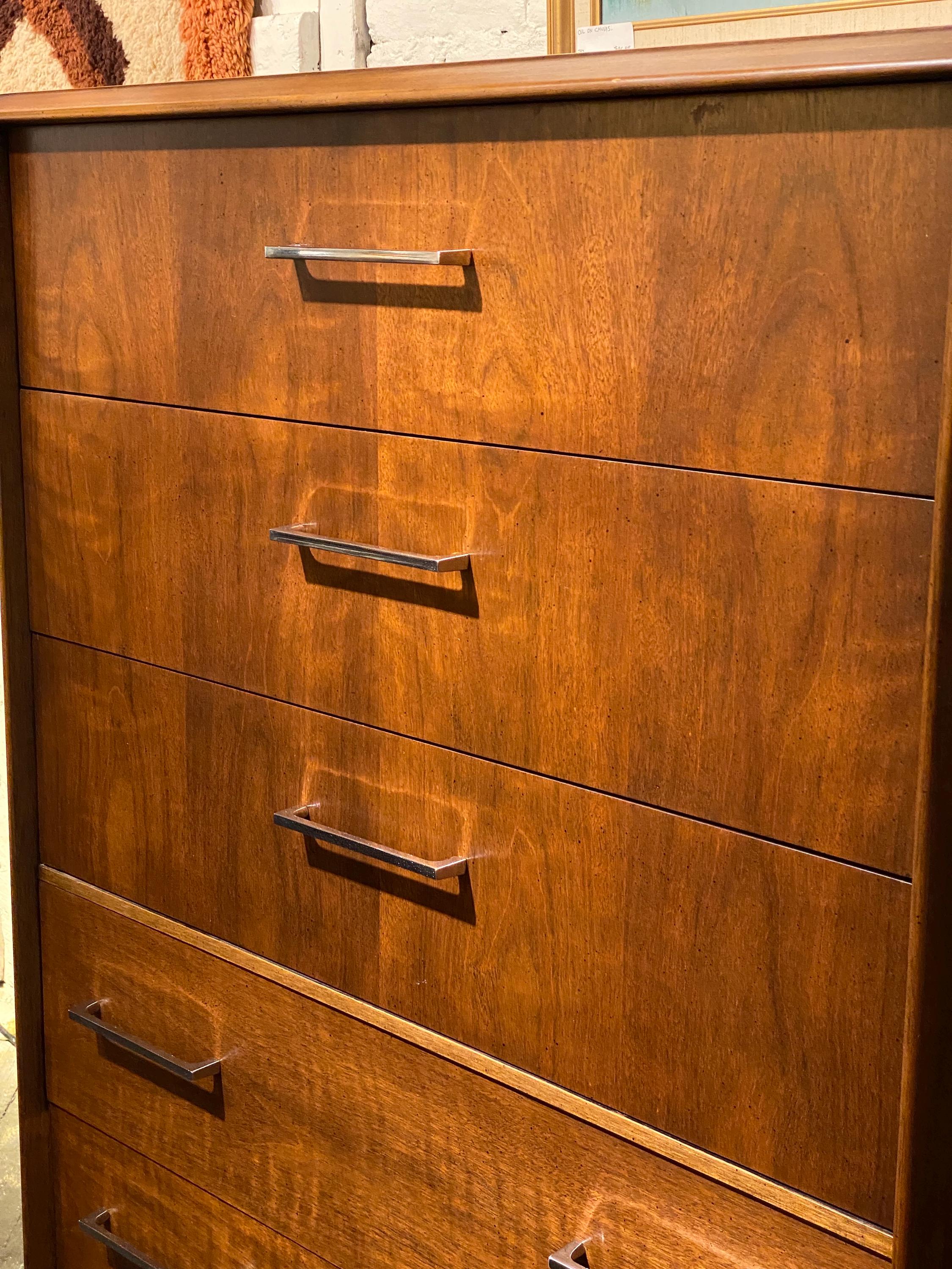 Lane tall 5-drawer chest of drawers in walnut, circa 1971. This piece was made to last, and it shows. The pieces boast Lanes' transition from the 1960s peg legs to the platform base of the 1970s. All 5 drawers are deep and offer lots of storage. The walnut grain pops from every angle on this chest of drawers. The piece is marked by its maker, and all 5 drawers operate as they should. We gave this piece a thorough cleaning inside and out to restore its original look. As the finish was in great original condition, we left it as is. A few things to note: the very bottom of the inside lip has two scratches from the bottom drawer being removed and hitting the frame. The top drawer has some wear on the inside top of the drawer front, which can be seen when the drawer is open. Please see our last few images for more details.