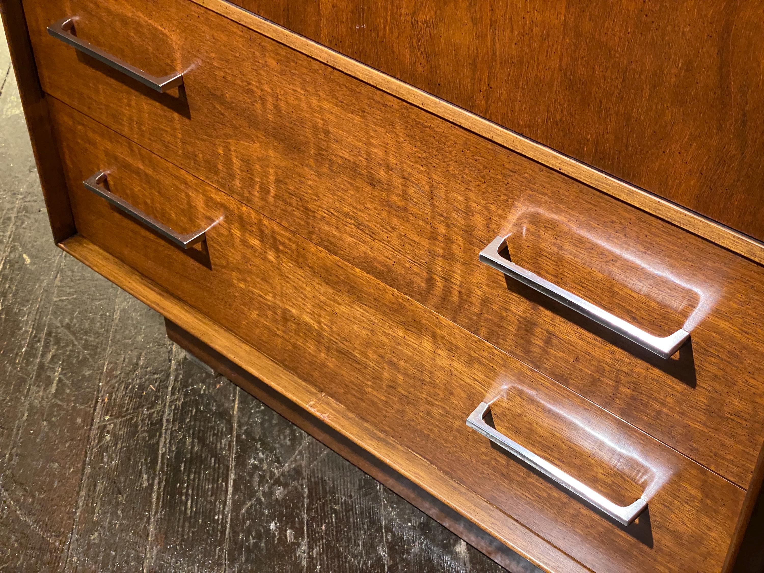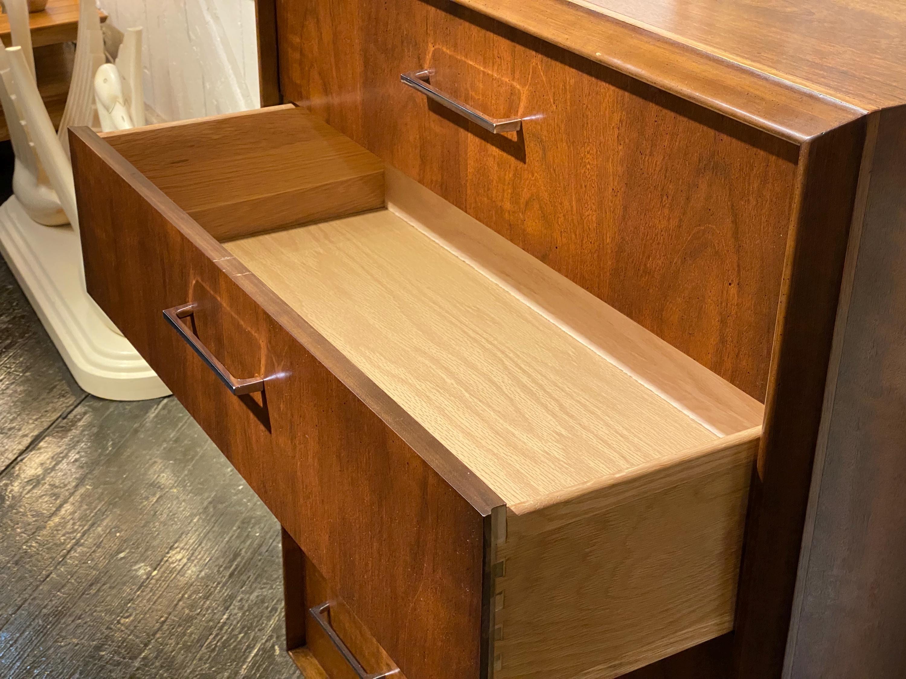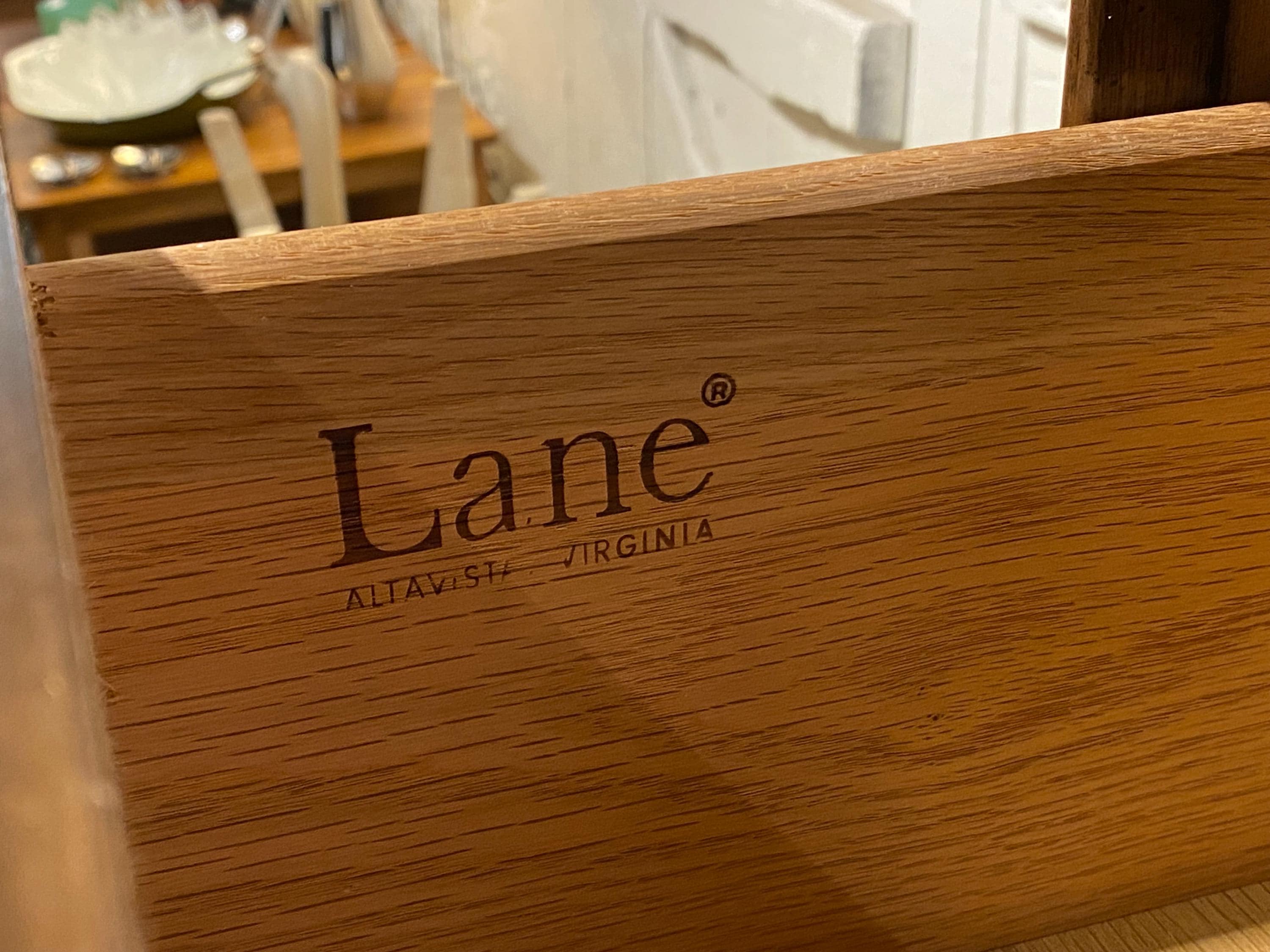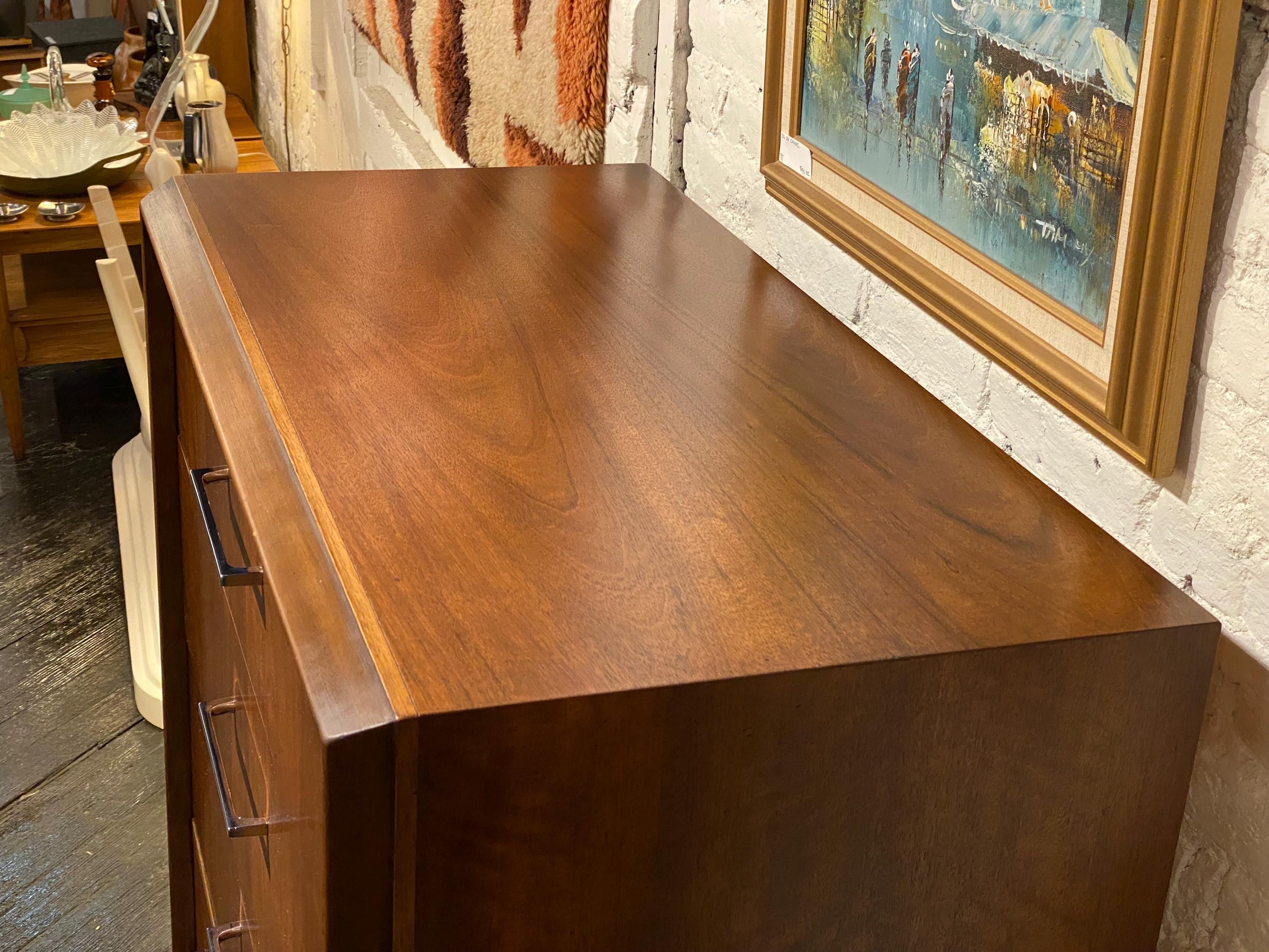 Lane tall 5-drawer chest of drawers in walnut, circa 1971. This piece was made to last, and it shows. The pieces boast Lanes' transition from the 1960s peg legs to the platform base of the 1970s. All 5 drawers are deep and offer lots of storage. The walnut grain pops from every angle on this chest of drawers. The piece is marked by its maker, and all 5 drawers operate as they should. We gave this piece a thorough cleaning inside and out to restore its original look. As the finish was in great original condition, we left it as is. A few things to note: the very bottom of the inside lip has two scratches from the bottom drawer being removed and hitting the frame. The top drawer has some wear on the inside top of the drawer front, which can be seen when the drawer is open. Please see our last few images for more details.
