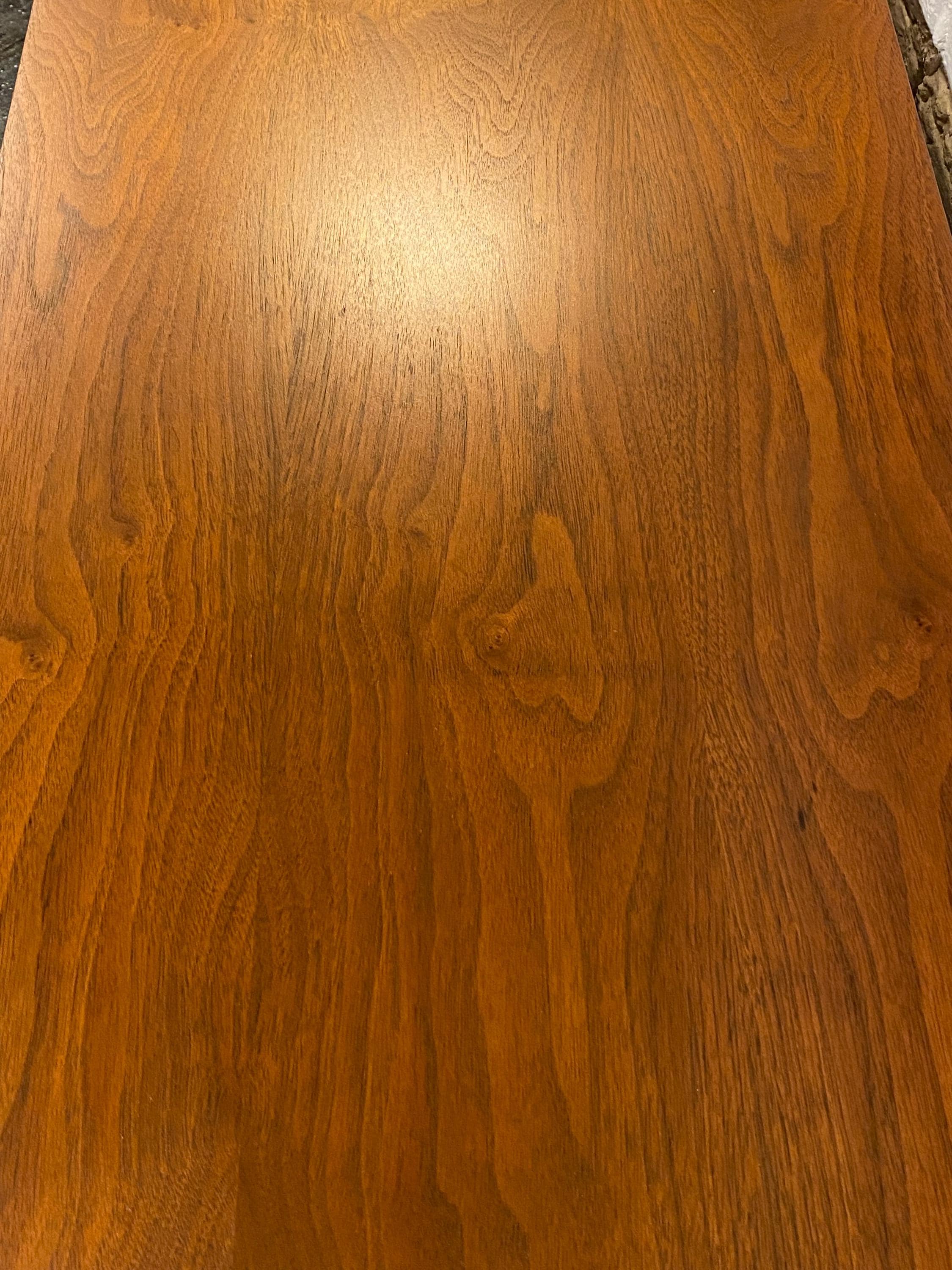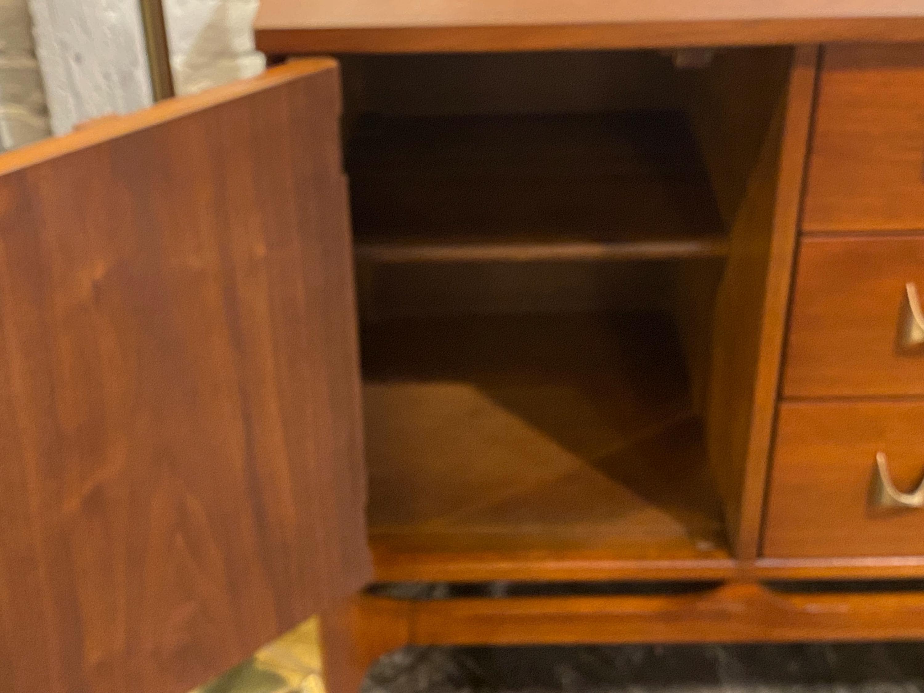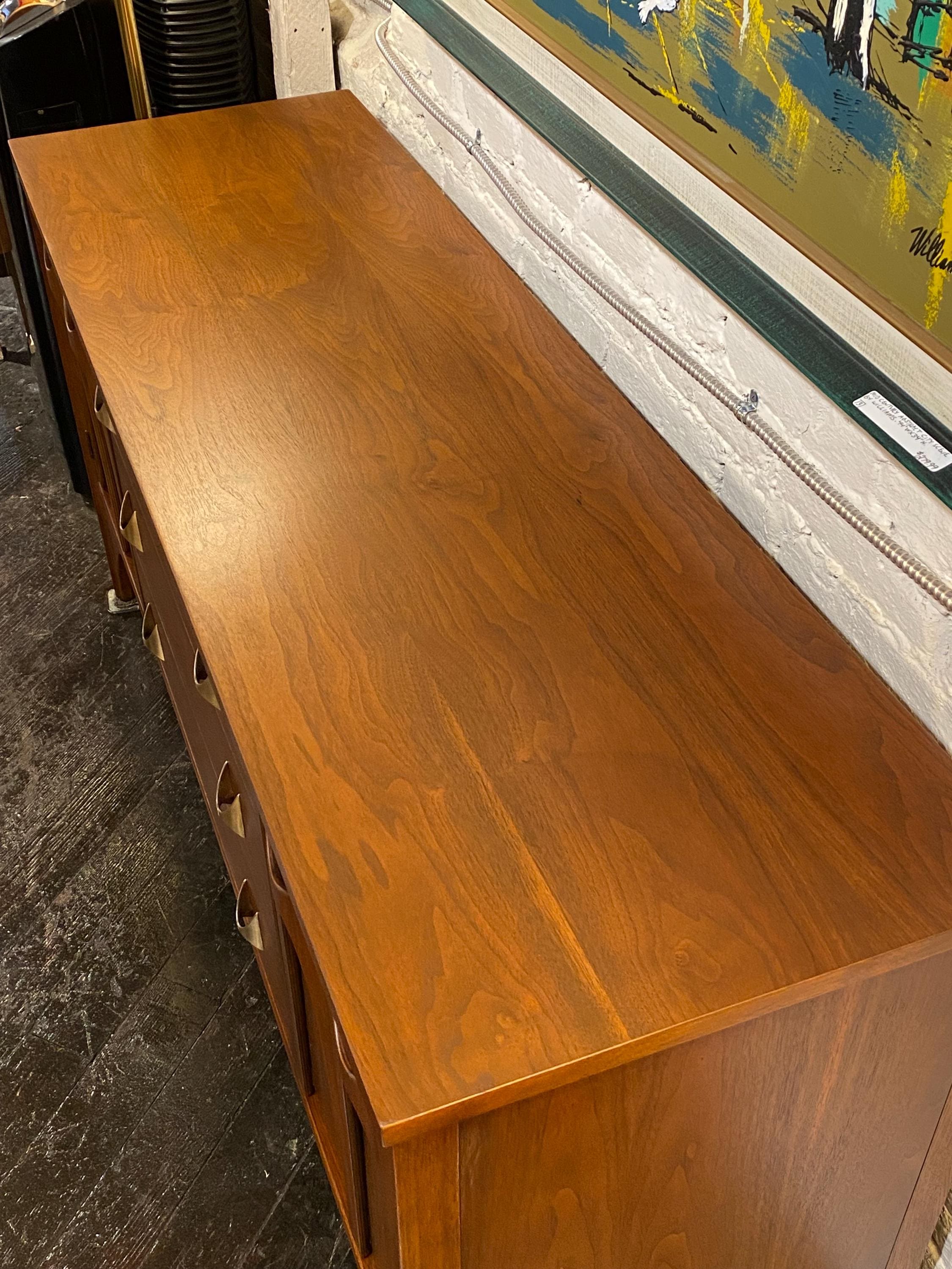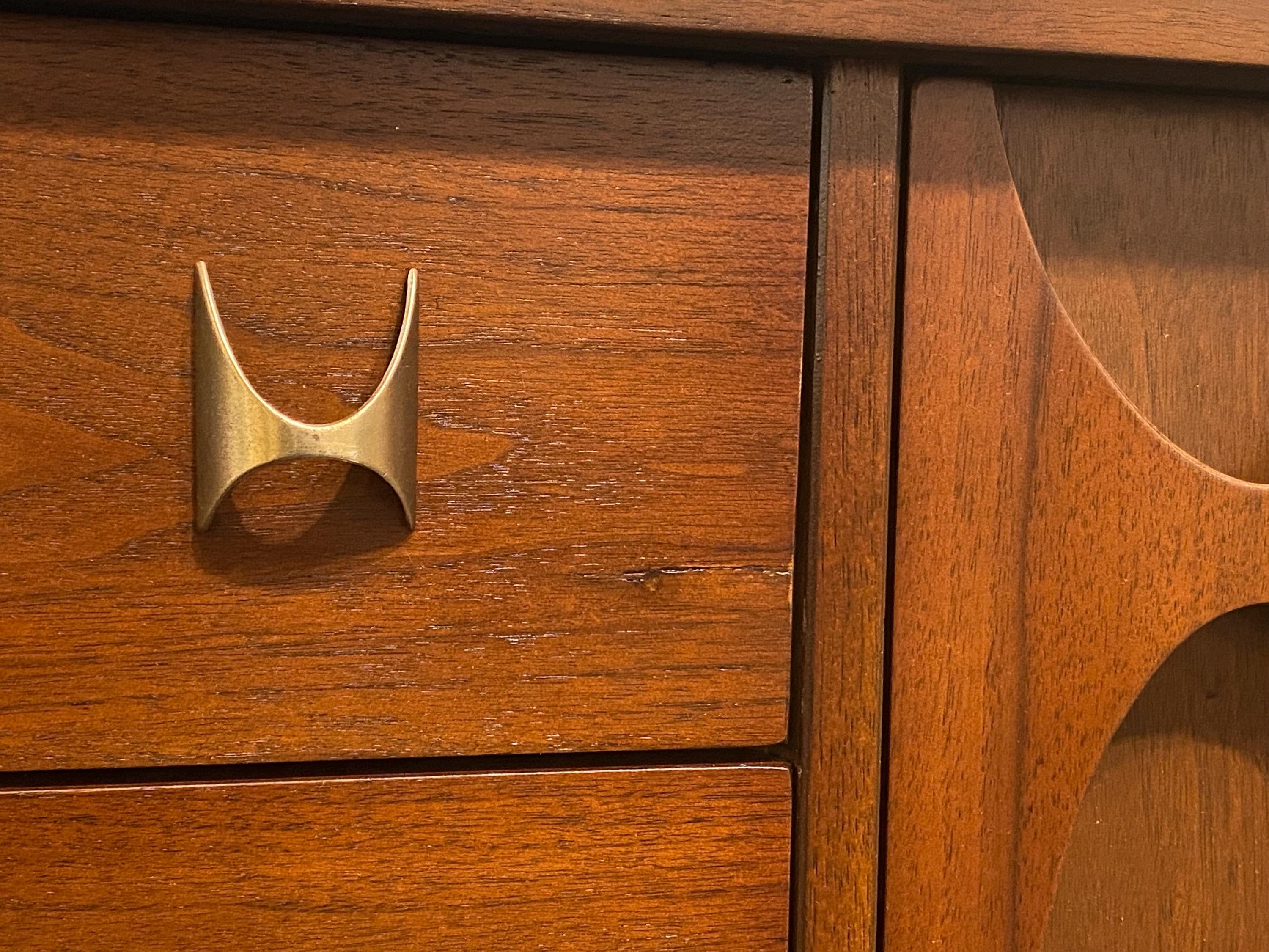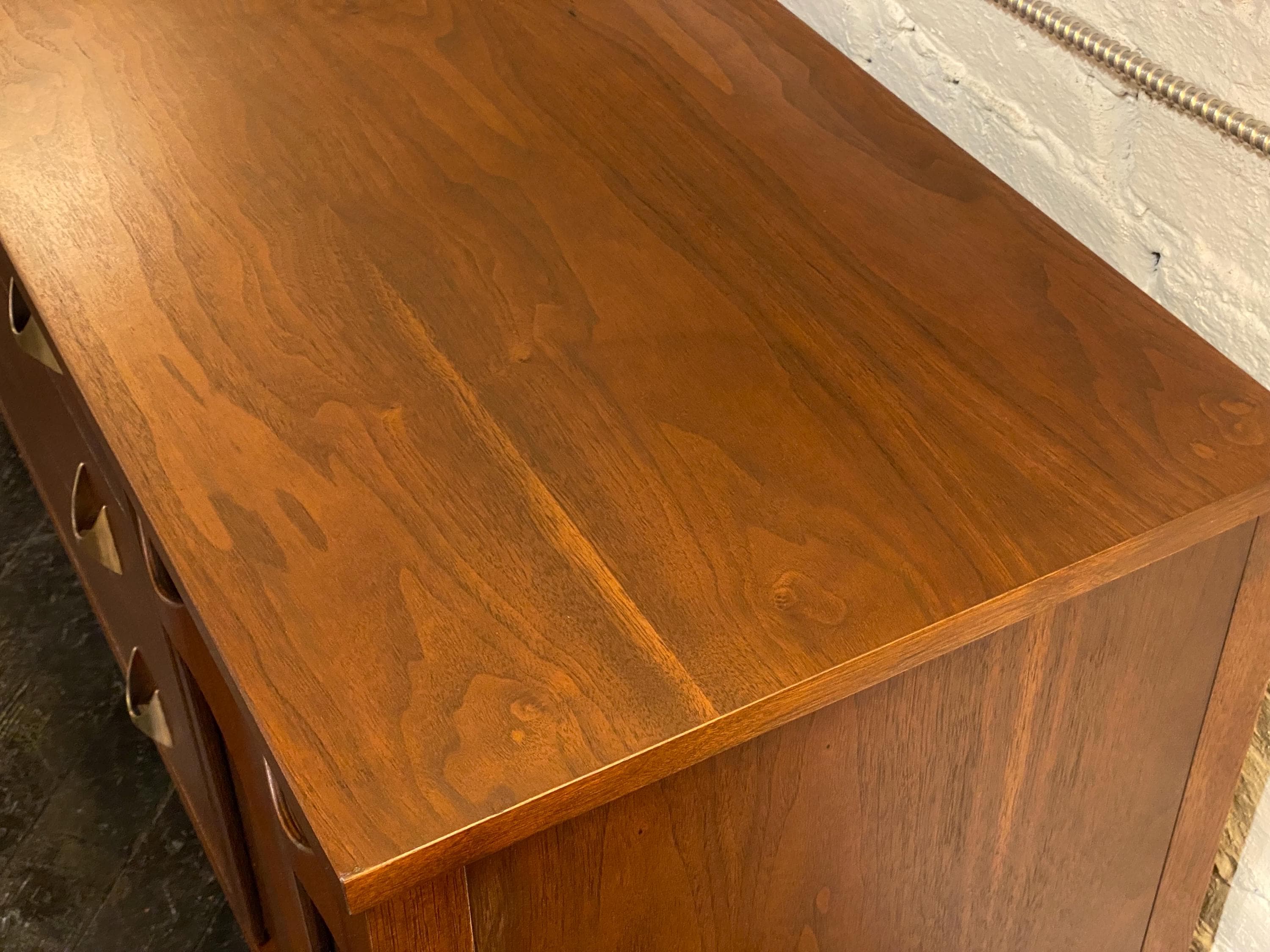 What you need to know about this piece: it was restored in-house, we have been restoring Brasilia pieces for over a decade, and we try to match the piece as close to its original finish as possible. The piece was in a smoker's home, and we did work on deodorizing the piece for several months. The piece now does not have a strong smoky odor, but if you are sensitive to smells, we wanted to point this out first. We removed the original finish, and after a lengthy process, we added a new walnut finish. This did come out with a slightly reddish tone to the walnut and does match the original look and feel. The top drawer did have a 2" long crack in the veneer front. We did repair this, and you can see a small line on the drawer front. Please see our last image for more details. Overall, the piece came out very nicely after the restoration, and it is ready for its next chapter.
