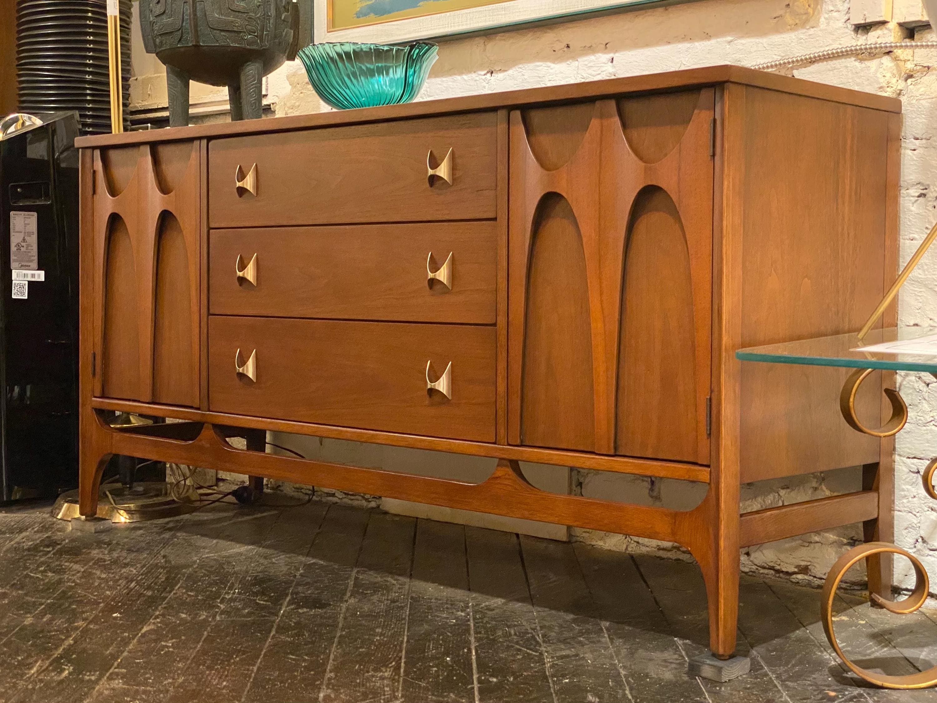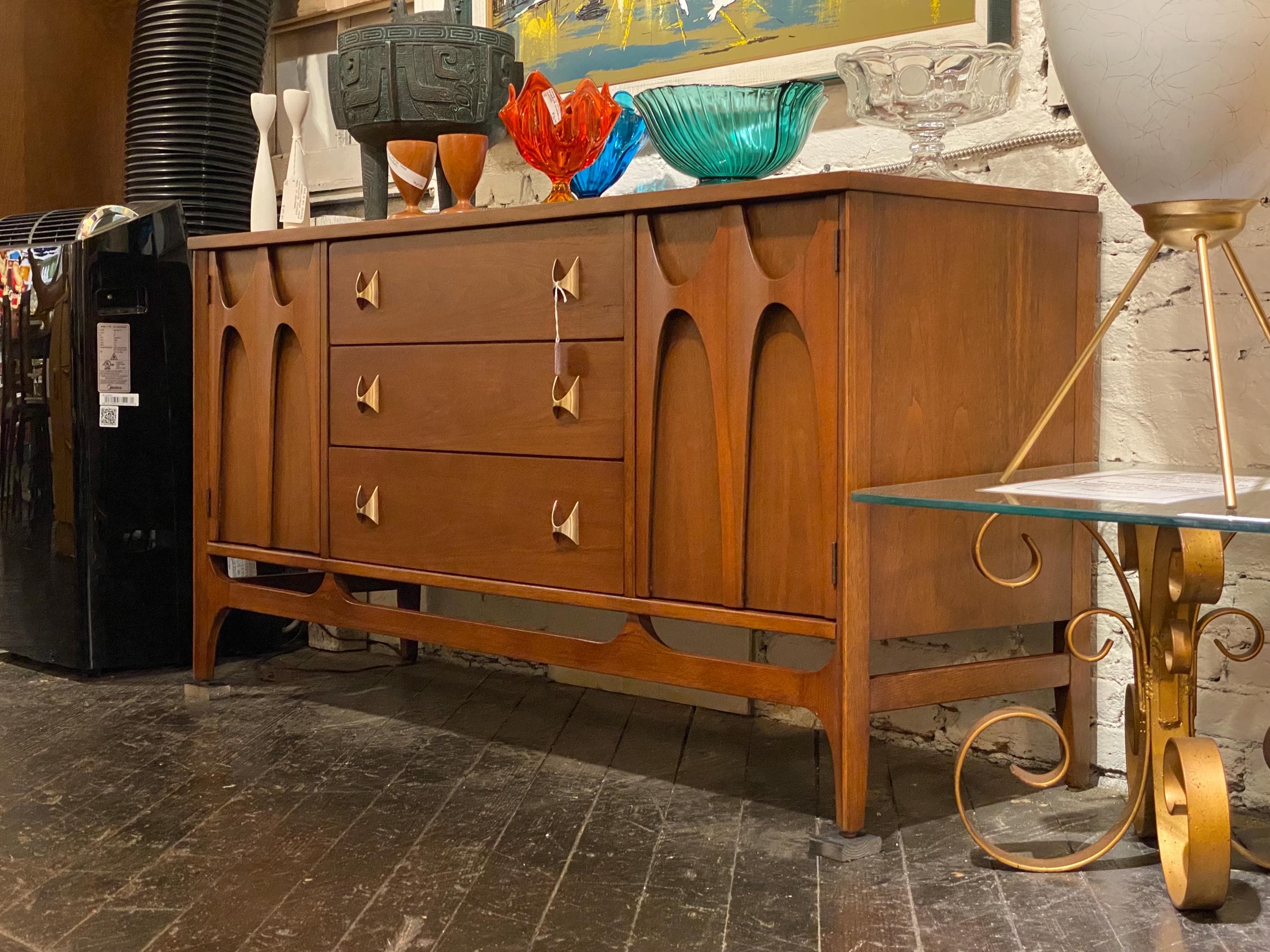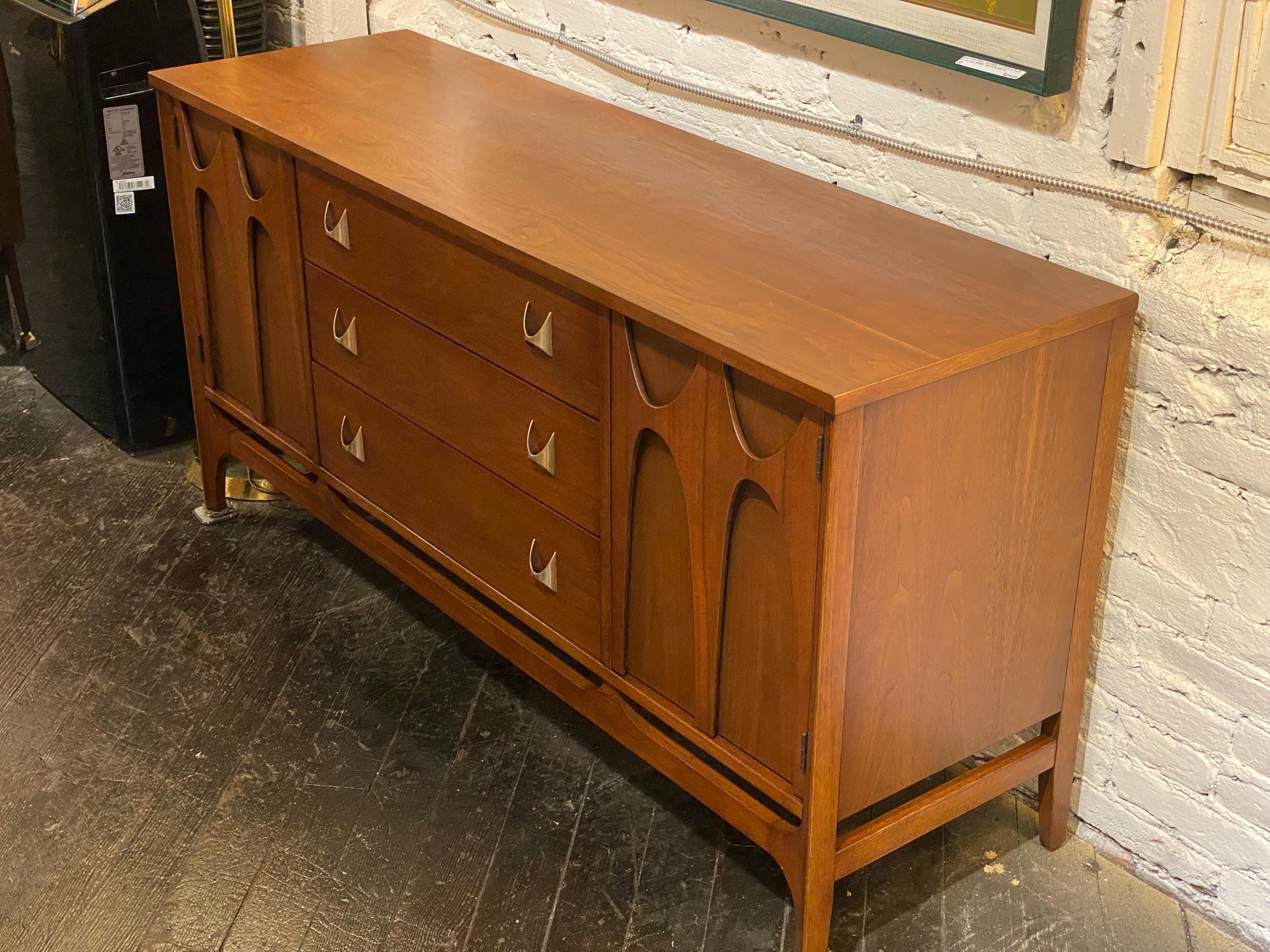 Broyhill Brasilia credenza in walnut with the signature Brasilia drawer pulls. Made by Broyhill Premier in the 1960s, this piece showcases the best of American mid-century modern design. This credenza has three drawers that open and close as they should in the center and two closed compartments on either side with a half-depth fixed shelf.