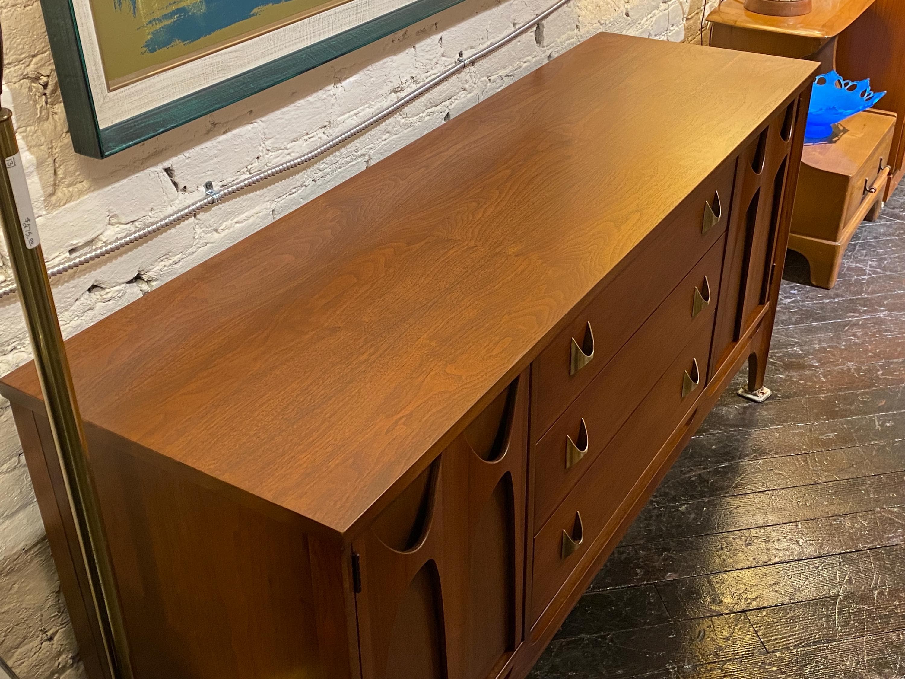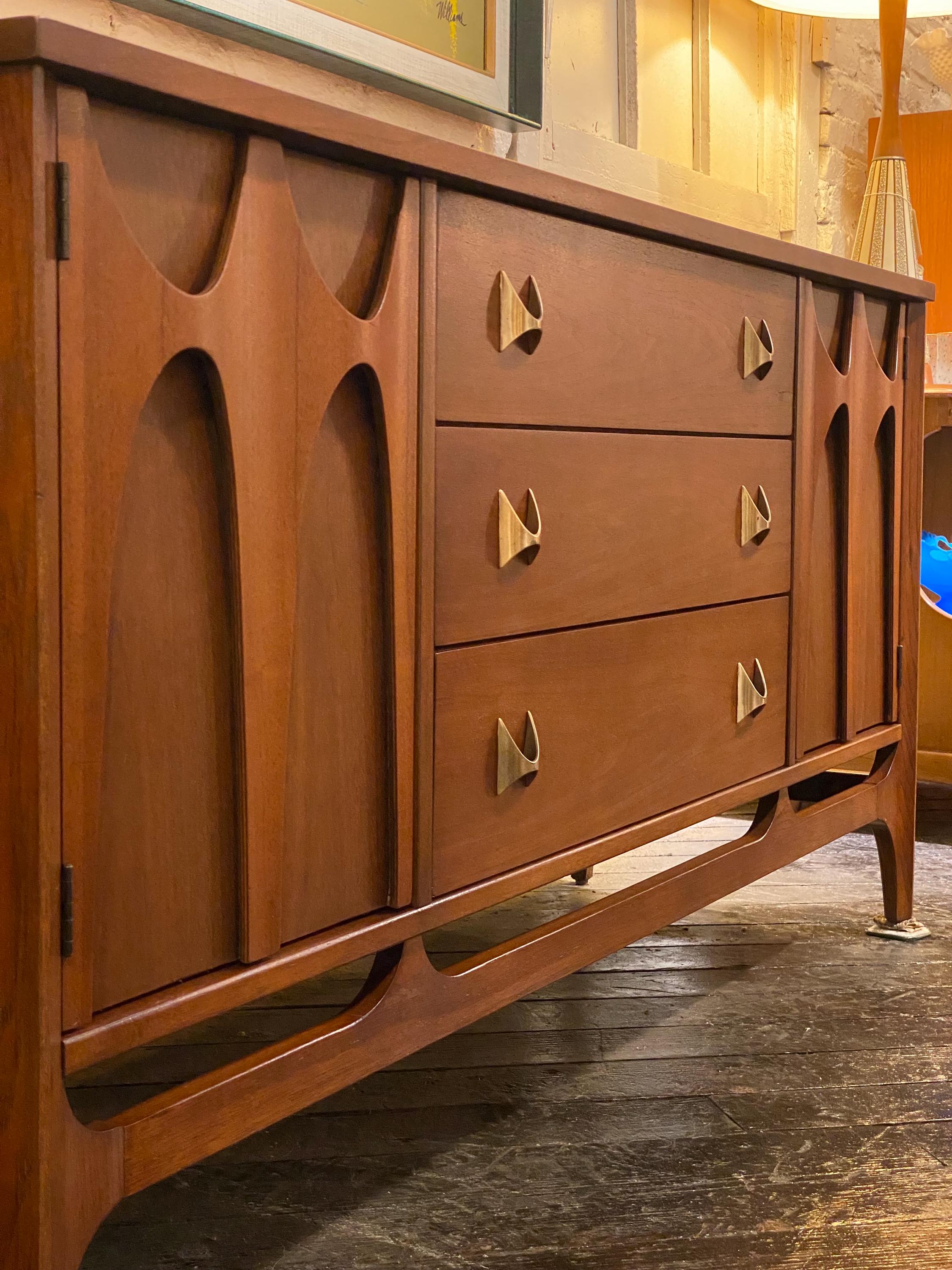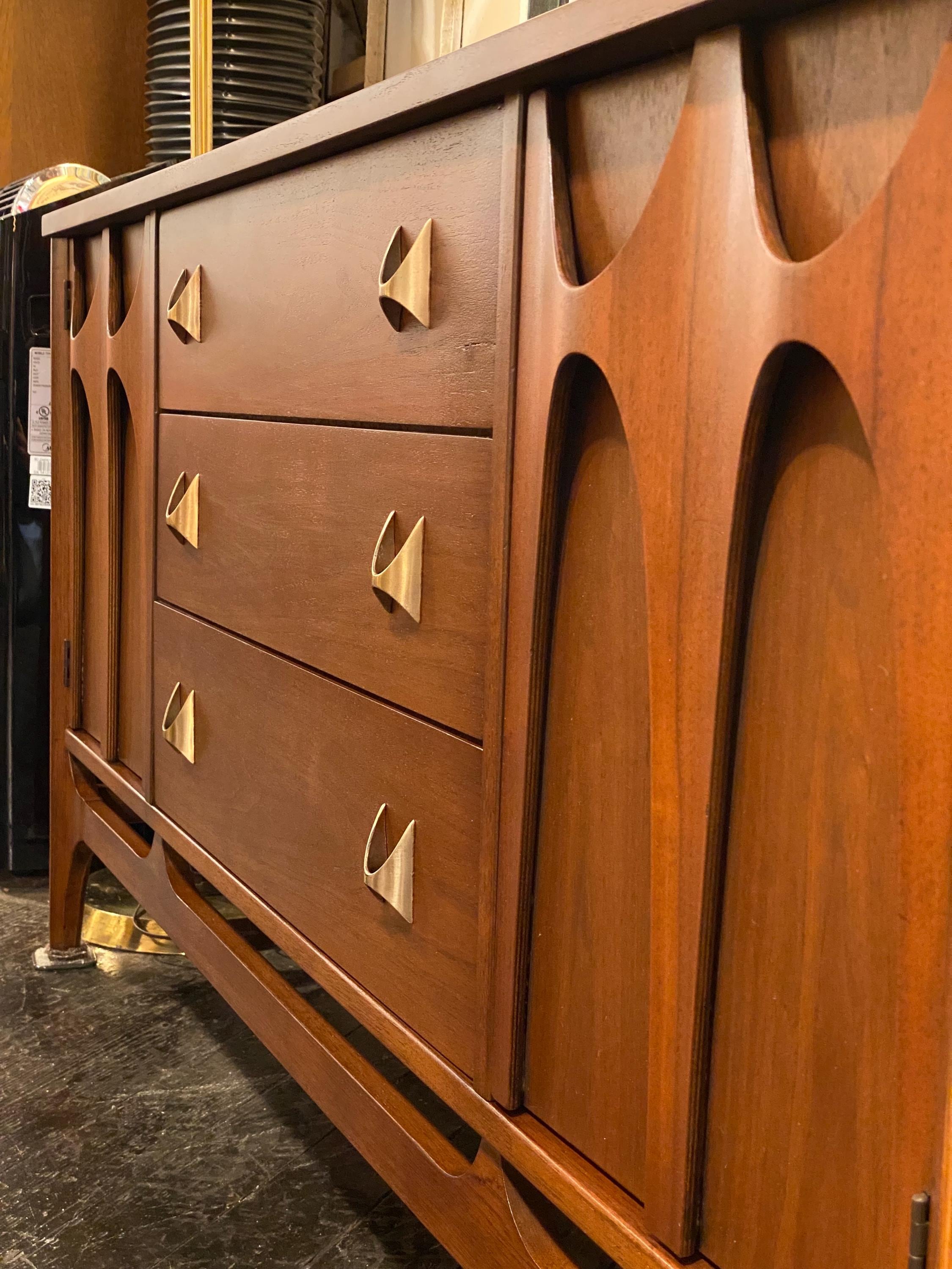 Broyhill Brasilia credenza in walnut with the signature Brasilia drawer pulls. Made by Broyhill Premier in the 1960s, this piece showcases the best of American mid-century modern design. This credenza has three drawers that open and close as they should in the center and two closed compartments on either side with a half-depth fixed shelf.