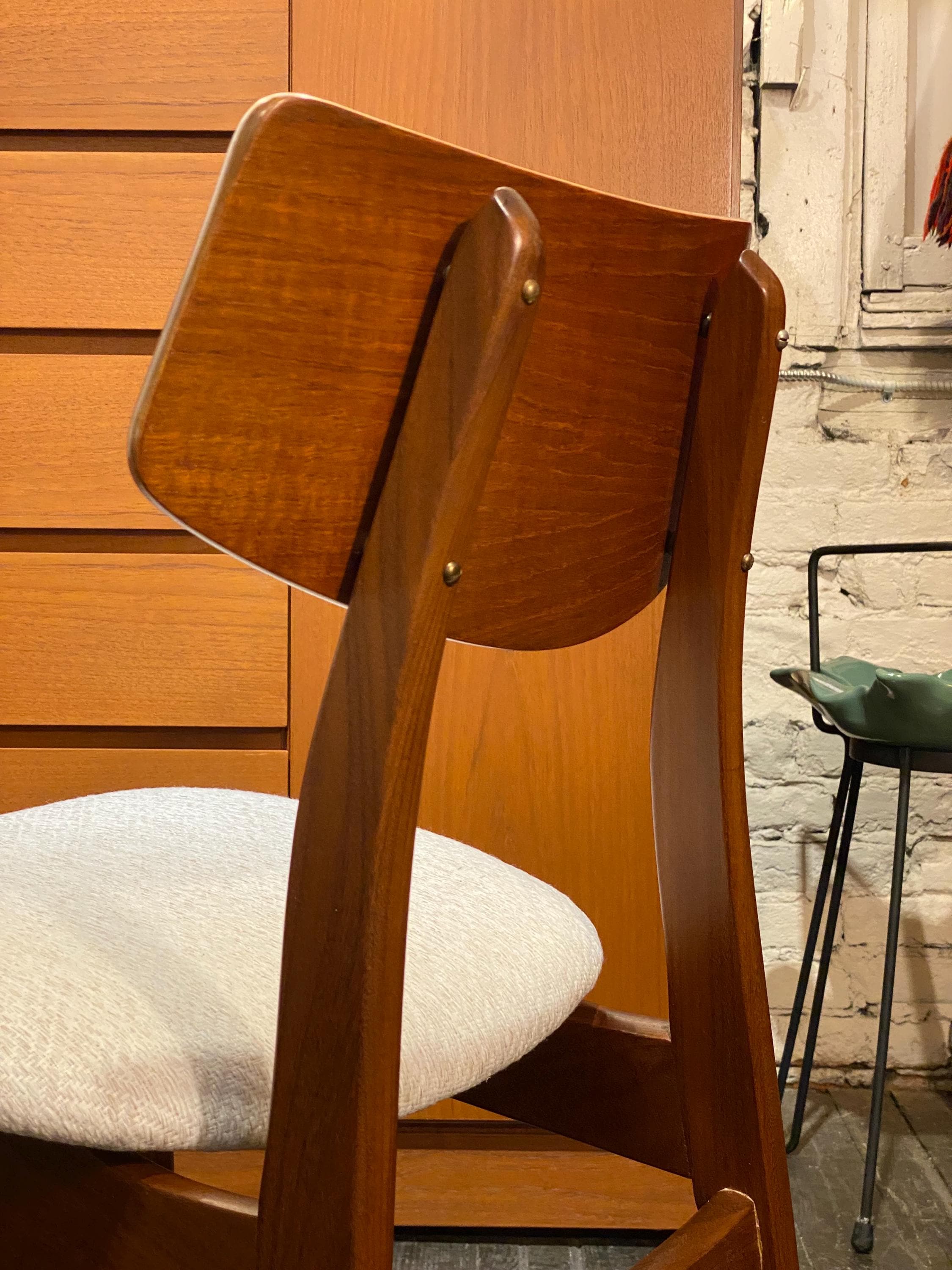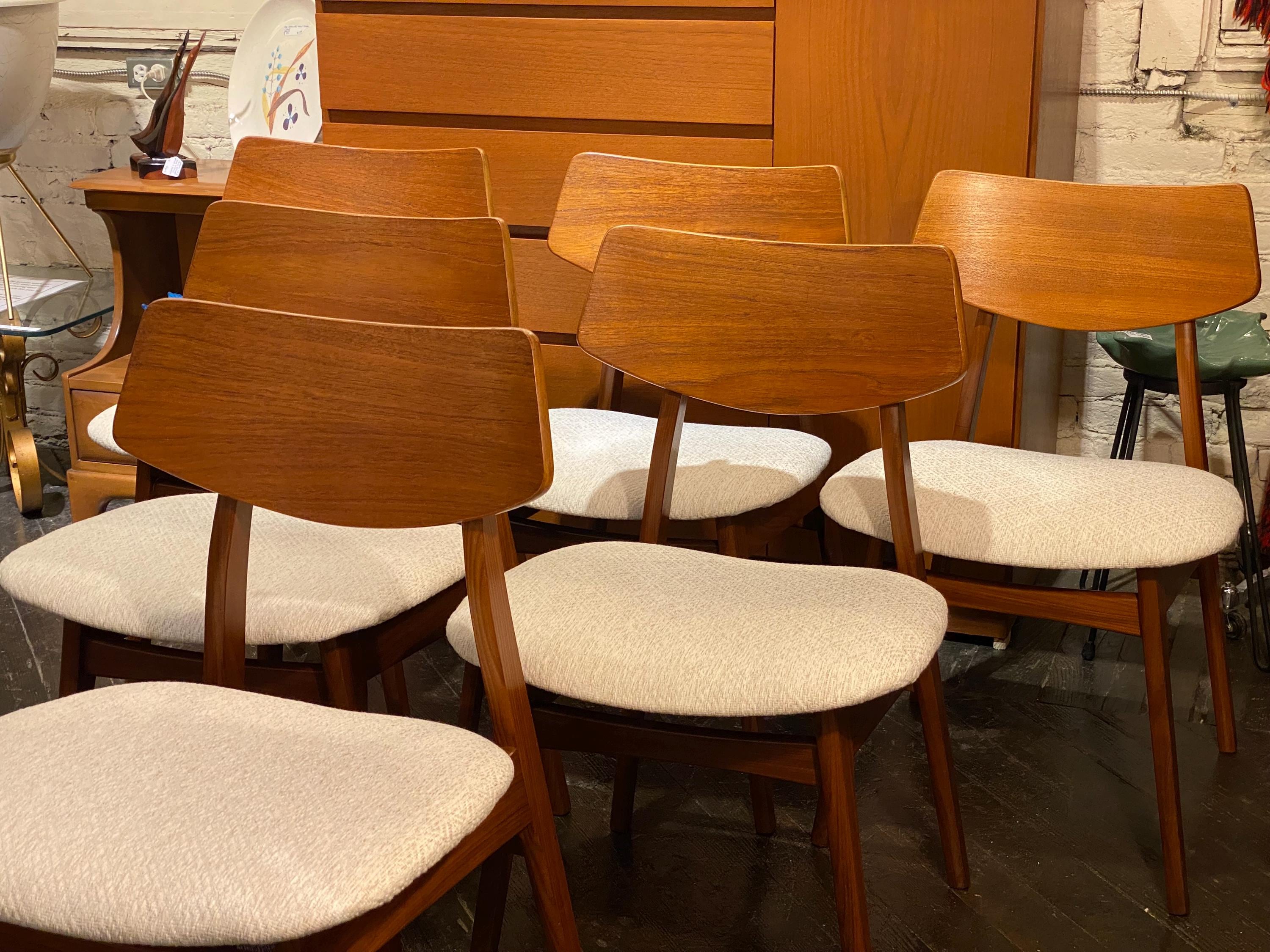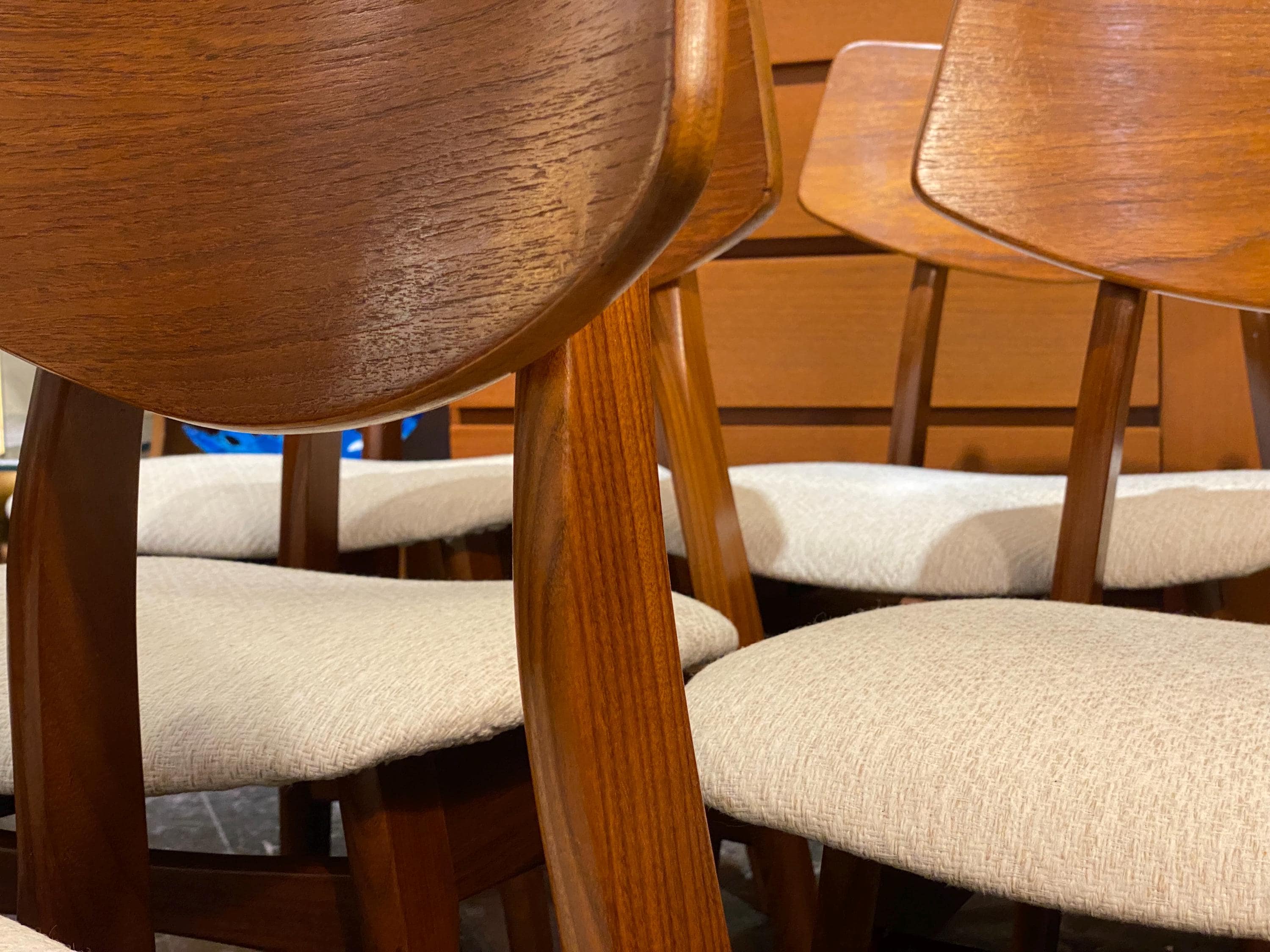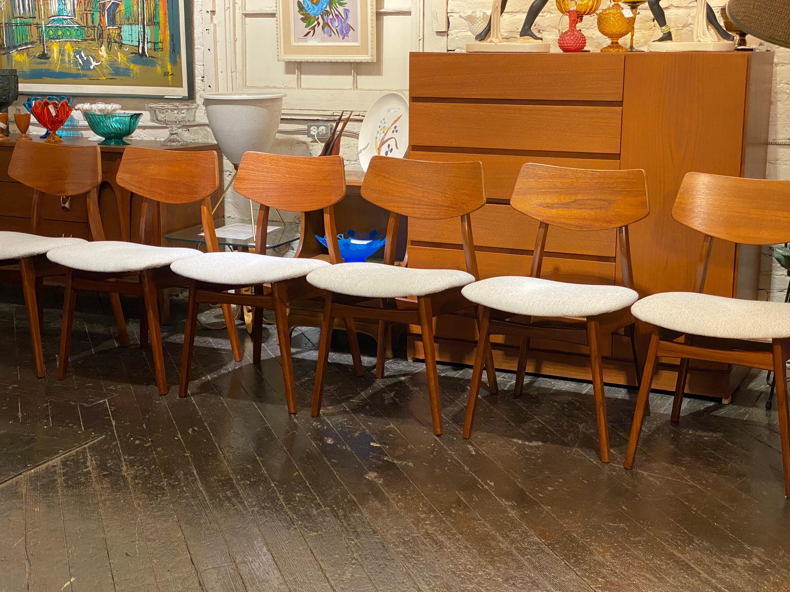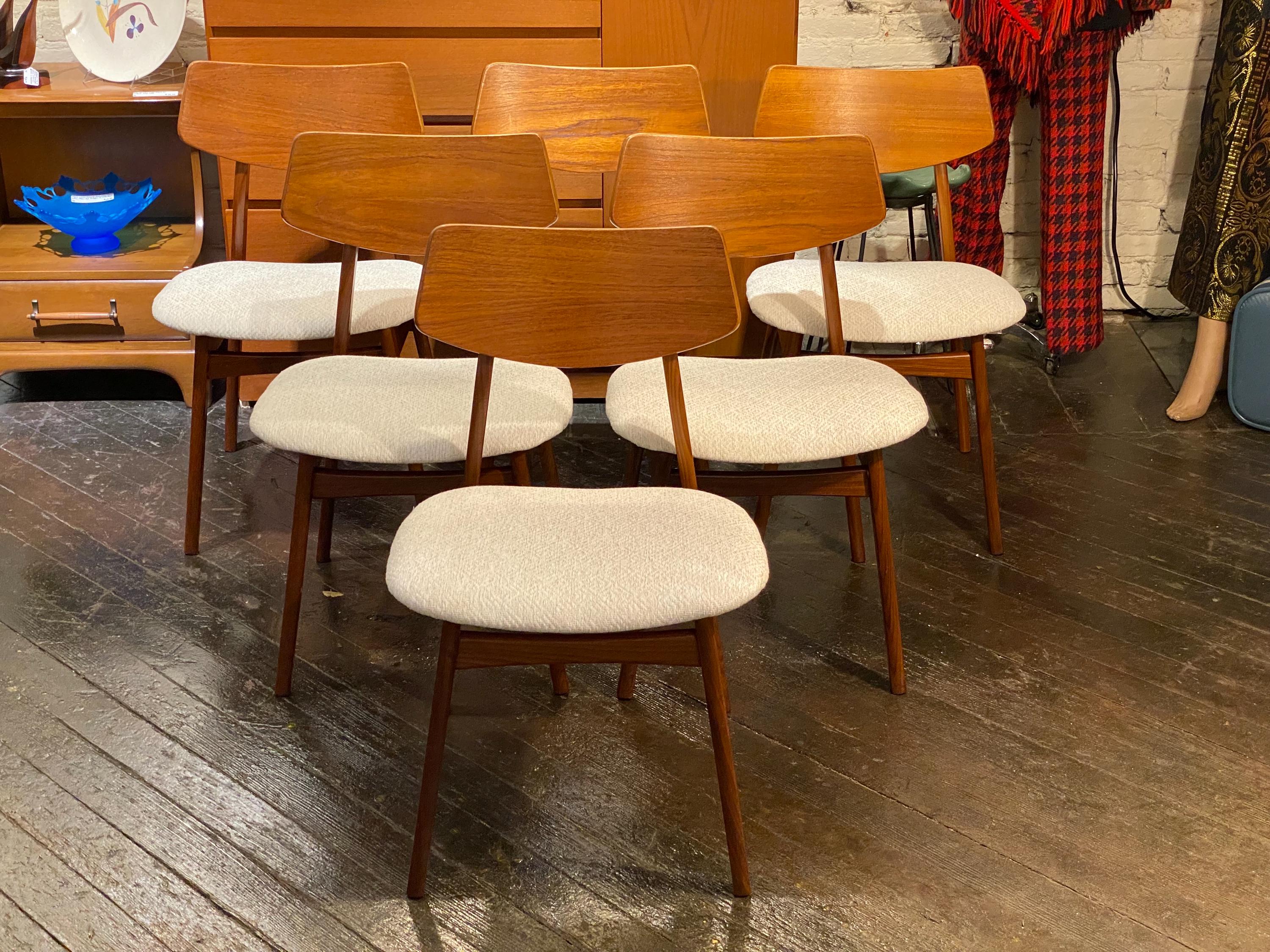 Set of six (6) Danish-made afromosia teak dining chairs with new upholstery, circa late 1950s. These chairs are stunning and showcase some of the best features in Danish Modern design from the mid-century era. The chair design allows the chair to hug you as you sit for an unbelievably comfortable dining experience. Each chair frame was taken apart and freshly glued to ensure they all sit sturdily. The seats were carefully recovered in a high-end white textured fabric before throughout polishing each chair frame to bring back its original shine.  The woodgrain is amazing throughout the chair frames. These are unmarked, and the only exact matches we have found are to listings from Holland. Two of the chairs had moving stickers on the legs, which indicate that they were shipped to the US with a family at some stage in their lifetime. Please feel free to reach out if you have any questions, and thanks for looking!
