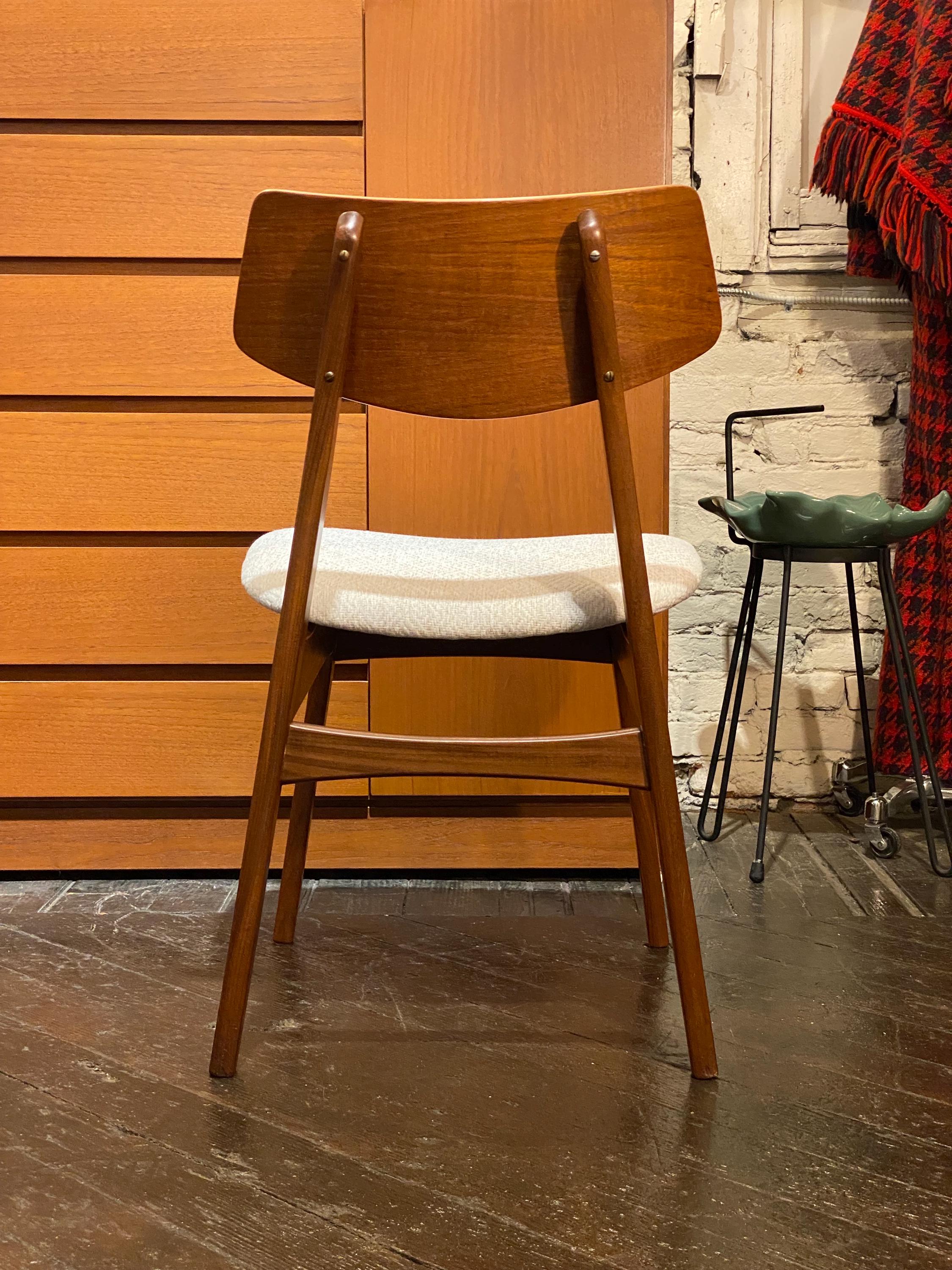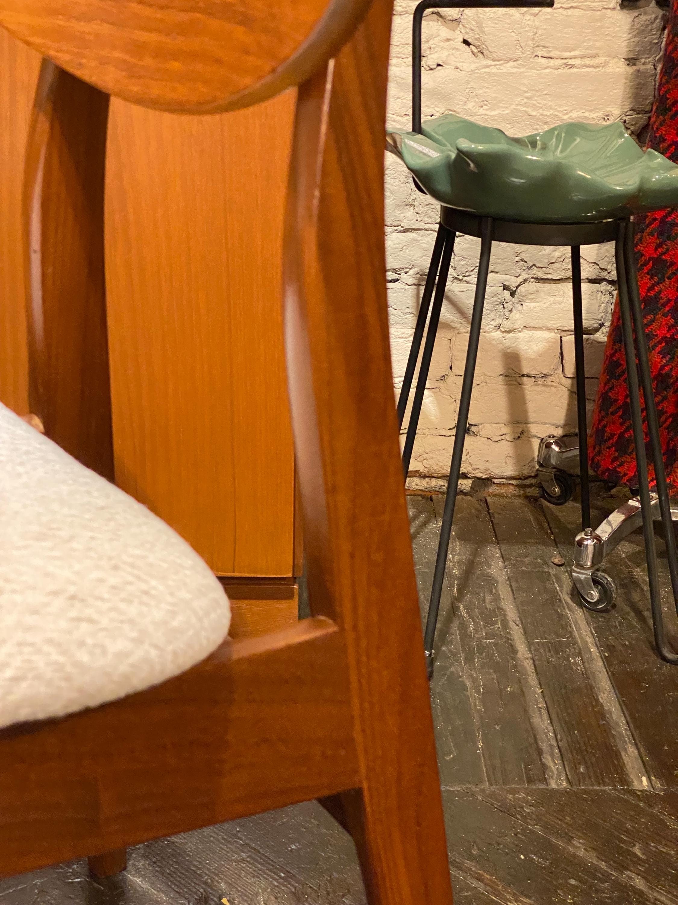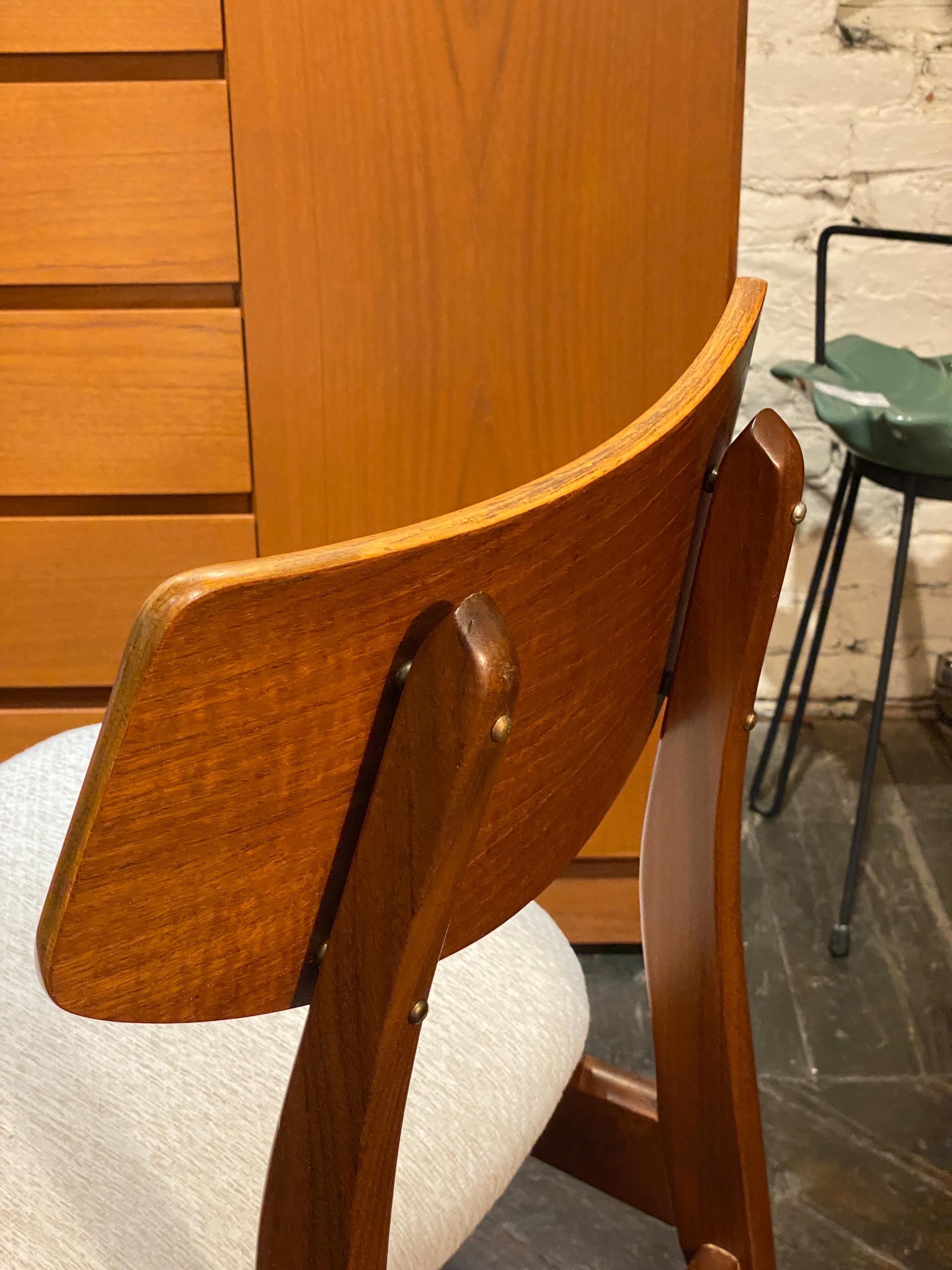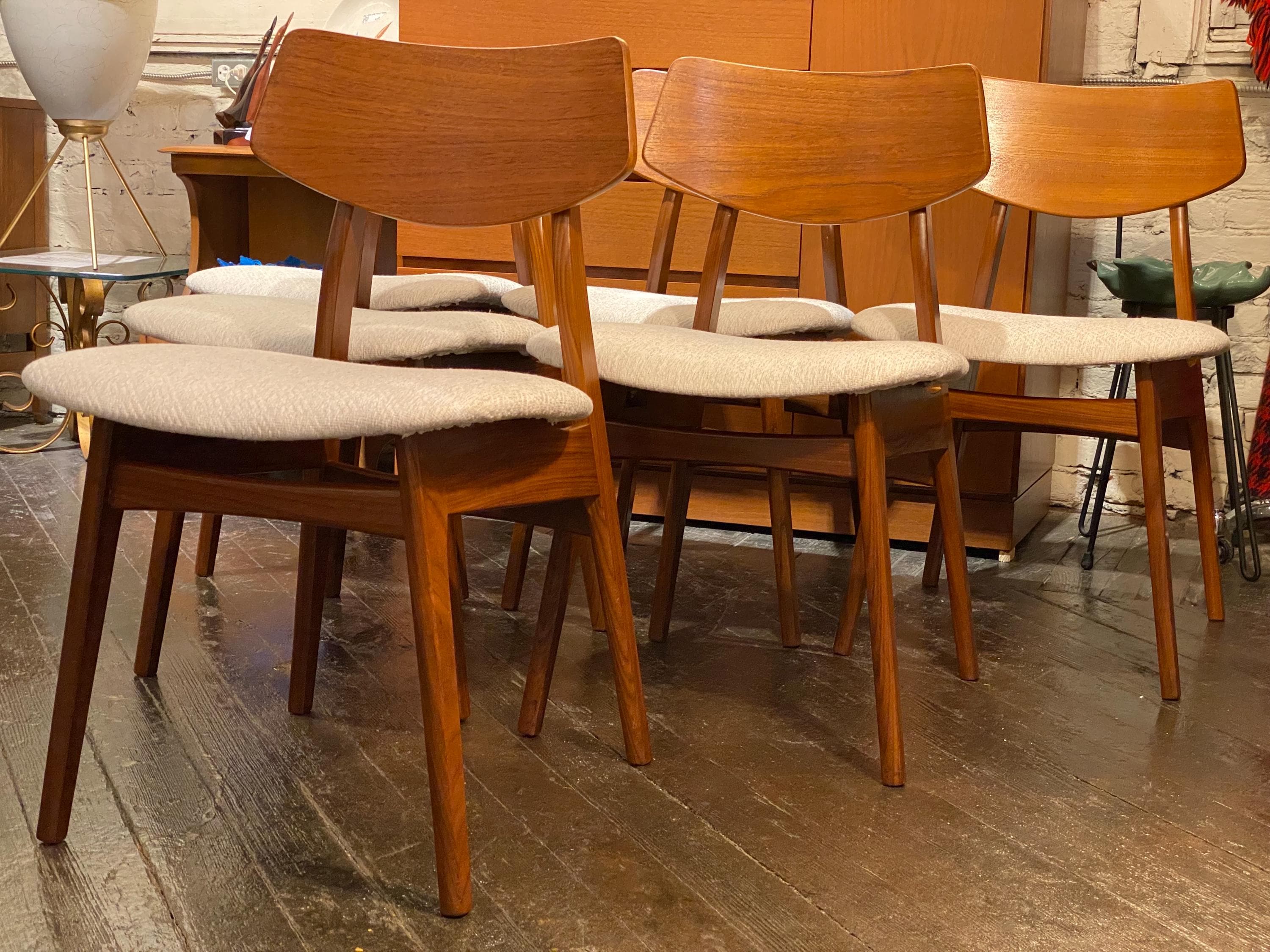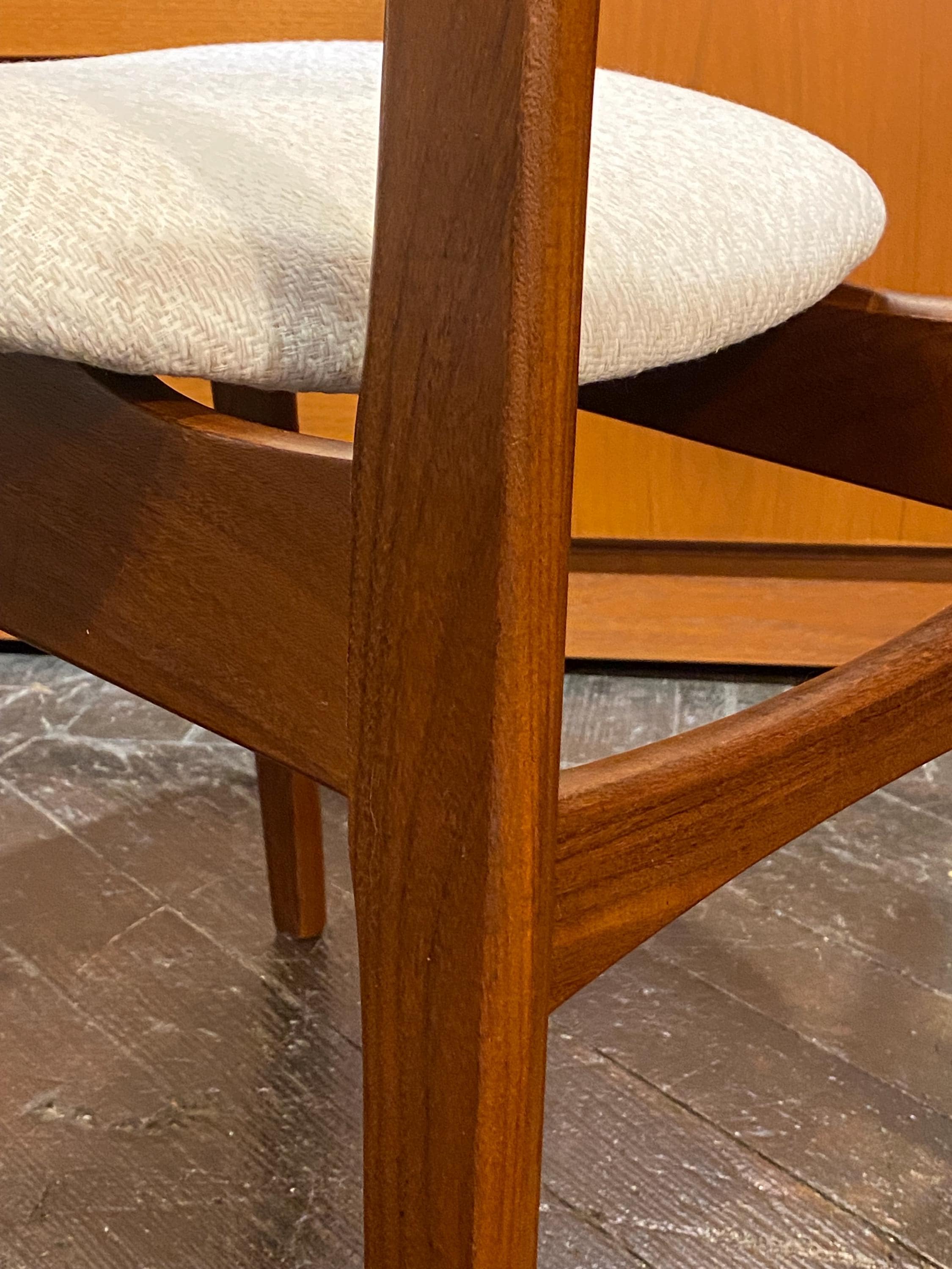 Set of six (6) Danish-made afromosia teak dining chairs with new upholstery, circa late 1950s. These chairs are stunning and showcase some of the best features in Danish Modern design from the mid-century era. The chair design allows the chair to hug you as you sit for an unbelievably comfortable dining experience. Each chair frame was taken apart and freshly glued to ensure they all sit sturdily. The seats were carefully recovered in a high-end white textured fabric before throughout polishing each chair frame to bring back its original shine.  The woodgrain is amazing throughout the chair frames. These are unmarked, and the only exact matches we have found are to listings from Holland. Two of the chairs had moving stickers on the legs, which indicate that they were shipped to the US with a family at some stage in their lifetime. Please feel free to reach out if you have any questions, and thanks for looking!