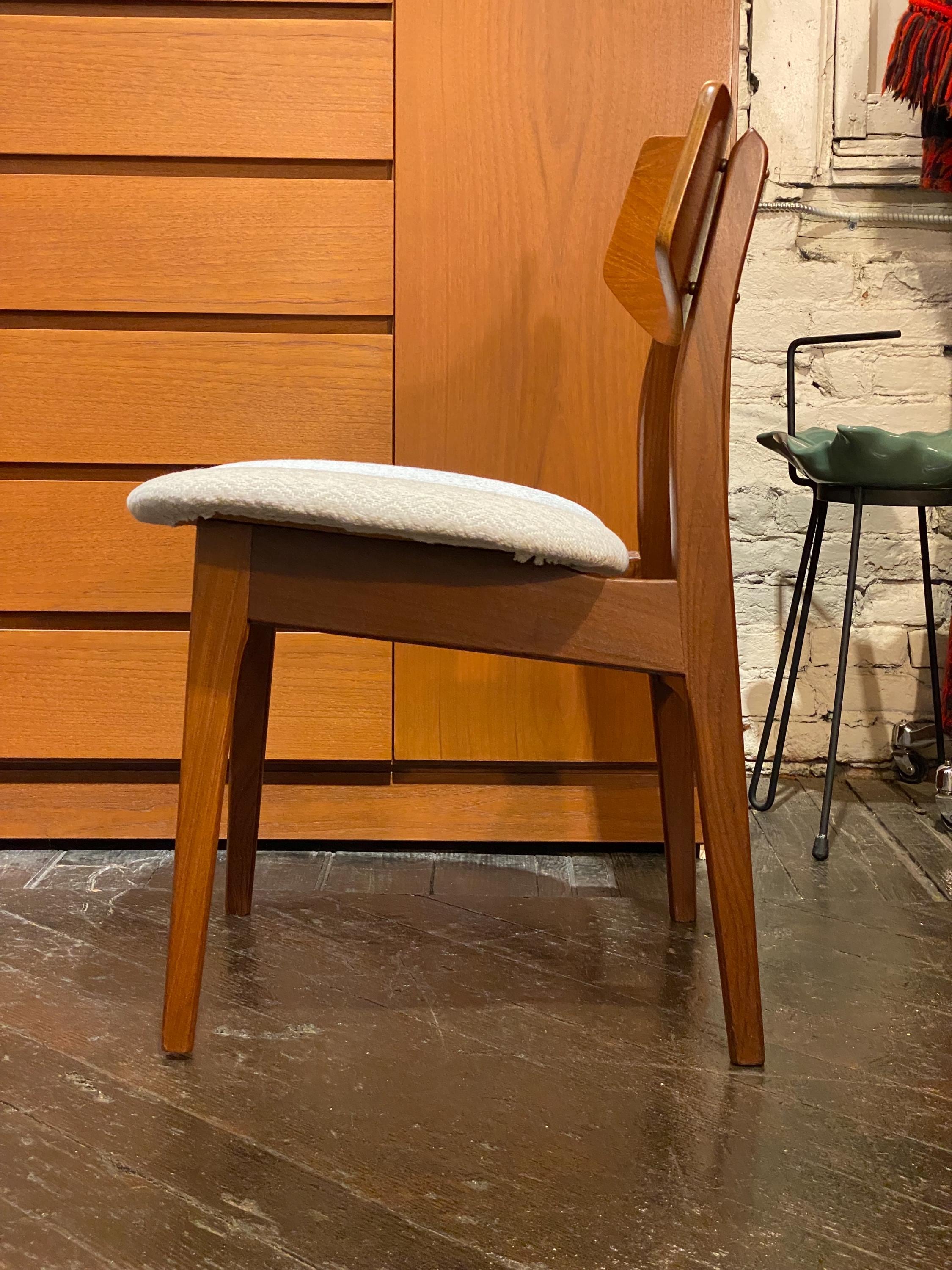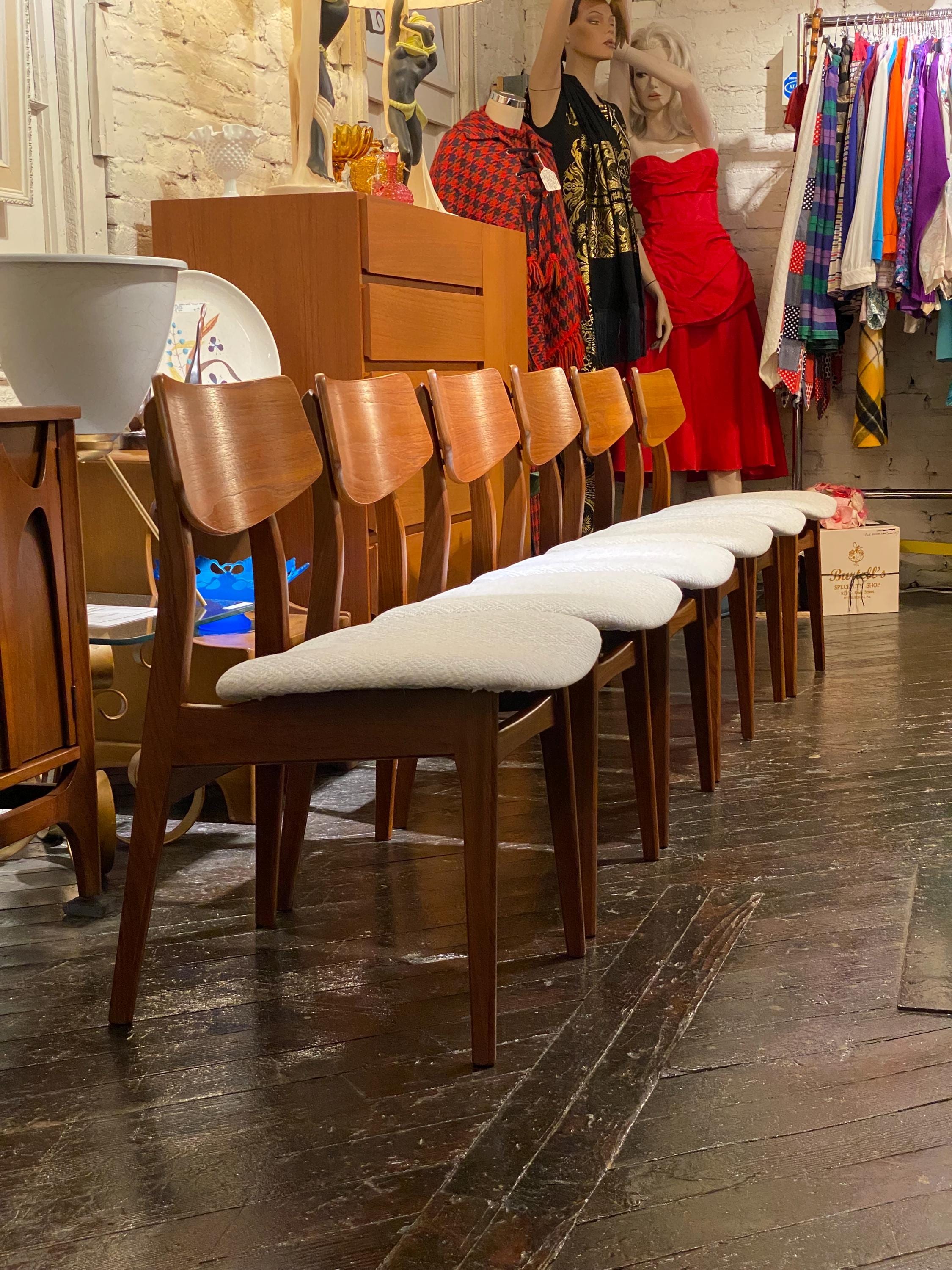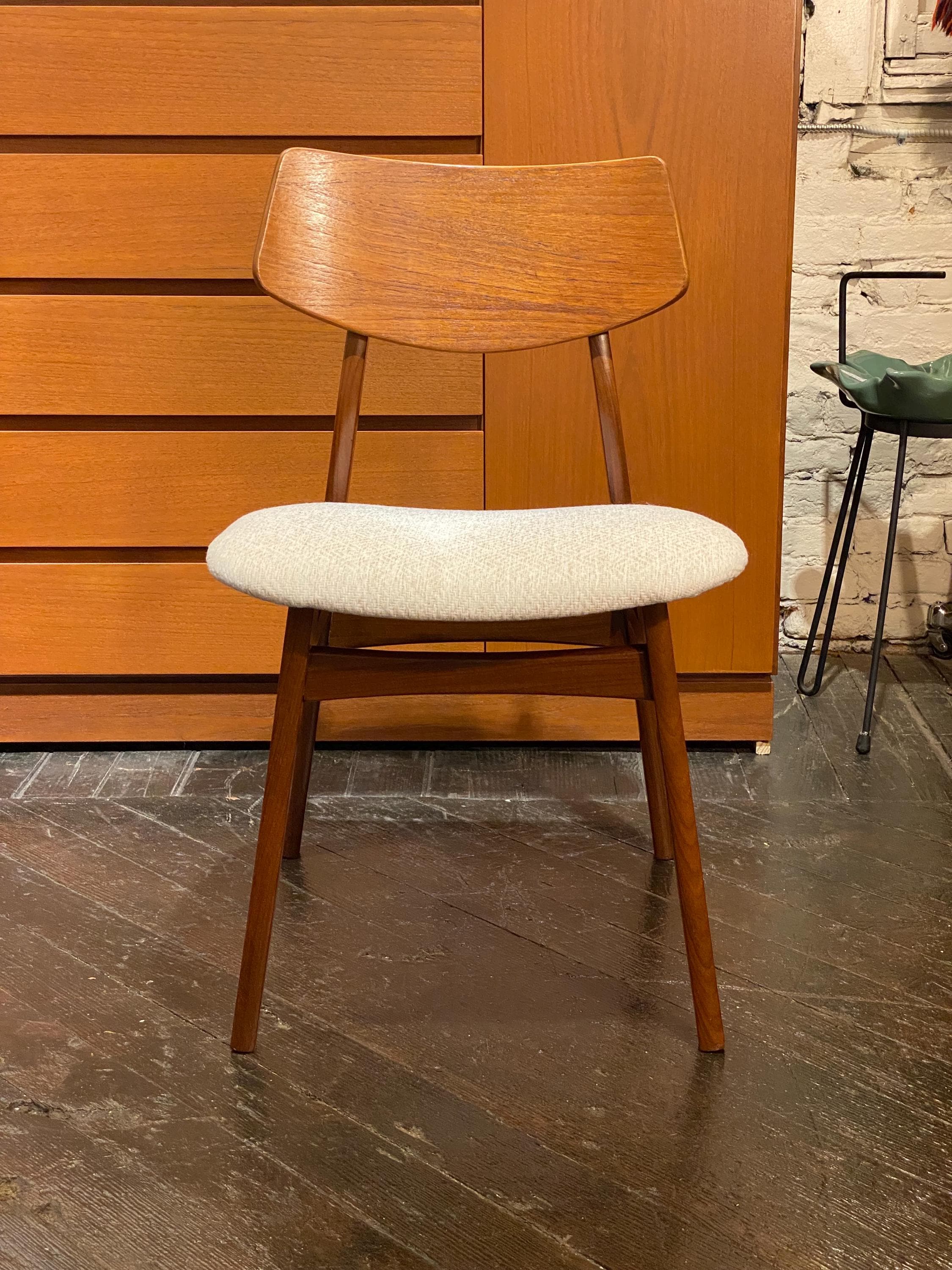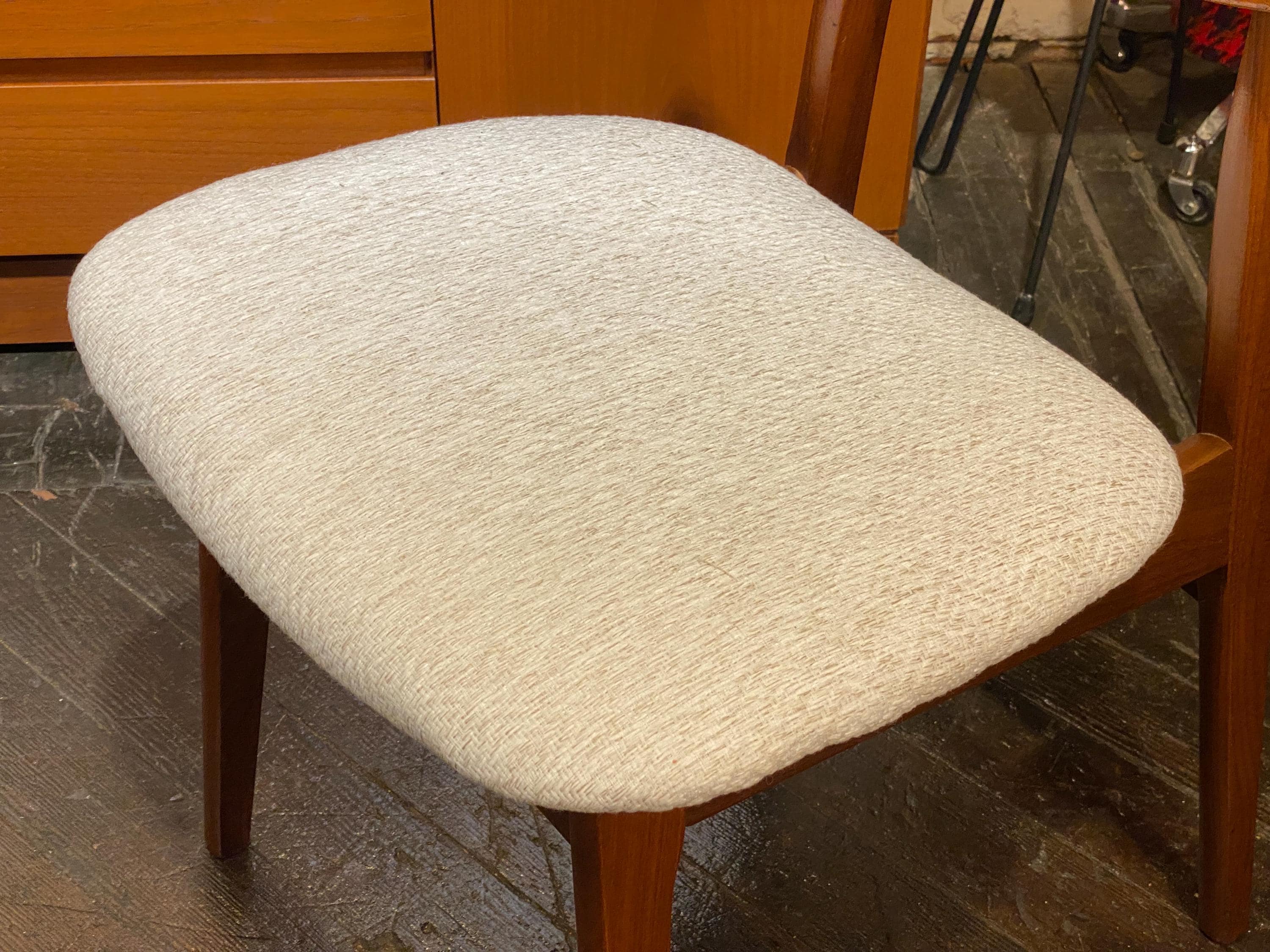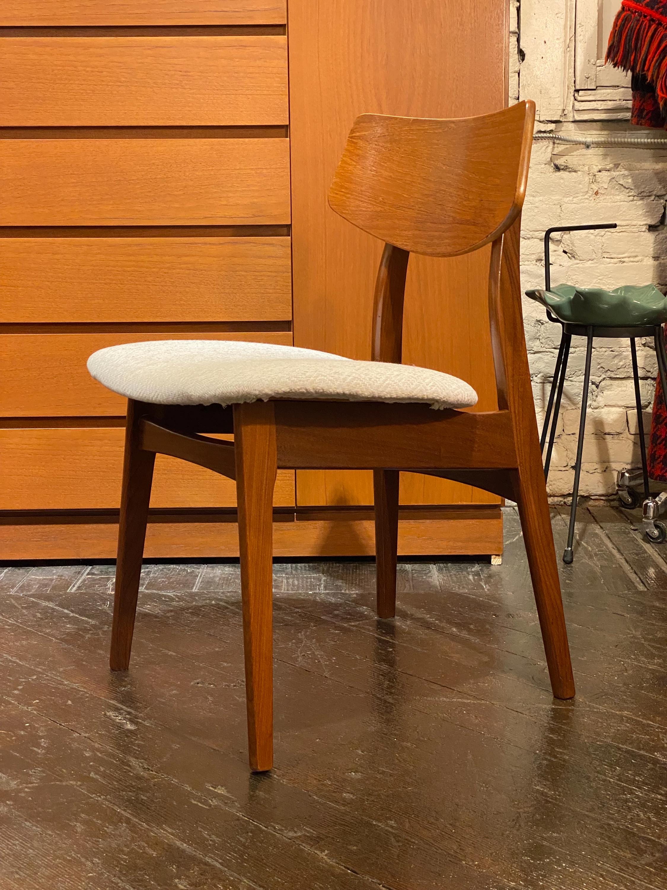 Set of six (6) Danish-made afromosia teak dining chairs with new upholstery, circa late 1950s. These chairs are stunning and showcase some of the best features in Danish Modern design from the mid-century era. The chair design allows the chair to hug you as you sit for an unbelievably comfortable dining experience. Each chair frame was taken apart and freshly glued to ensure they all sit sturdily. The seats were carefully recovered in a high-end white textured fabric before throughout polishing each chair frame to bring back its original shine.  The woodgrain is amazing throughout the chair frames. These are unmarked, and the only exact matches we have found are to listings from Holland. Two of the chairs had moving stickers on the legs, which indicate that they were shipped to the US with a family at some stage in their lifetime. Please feel free to reach out if you have any questions, and thanks for looking!