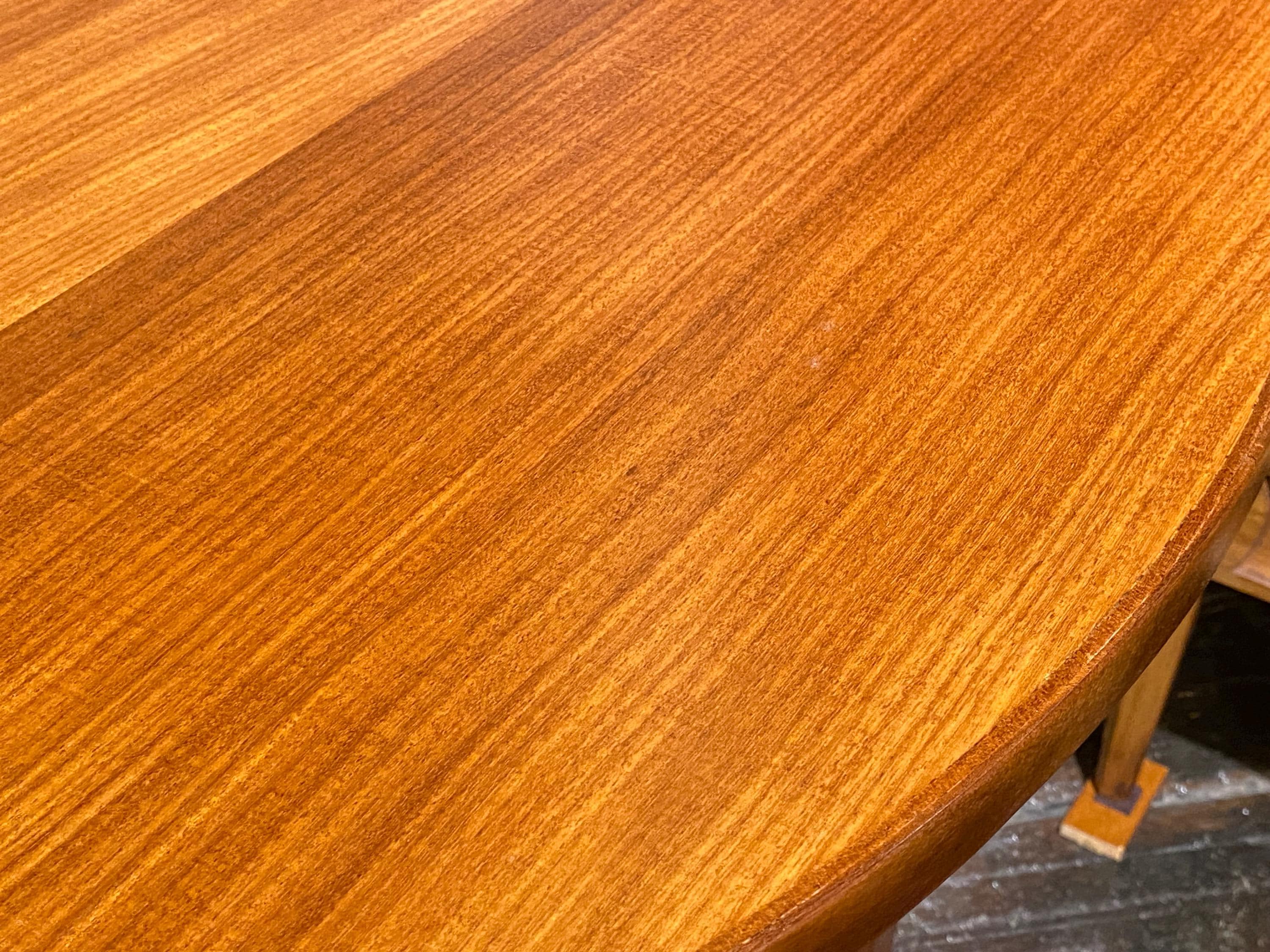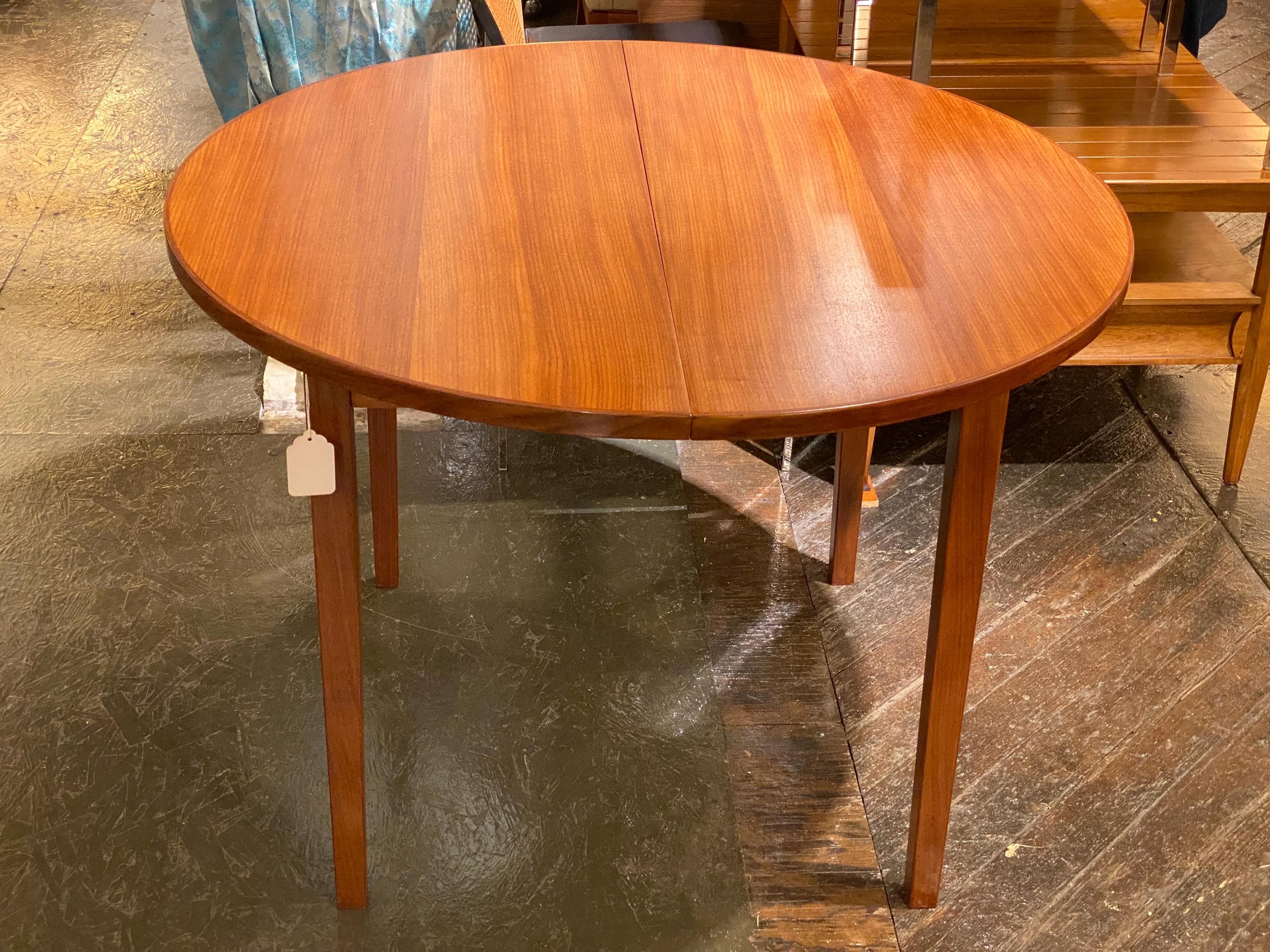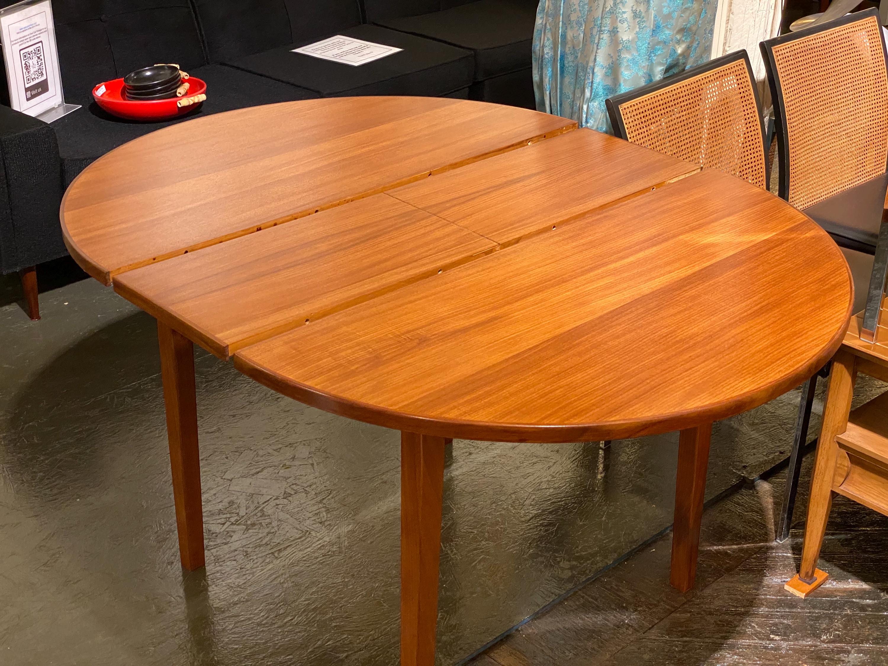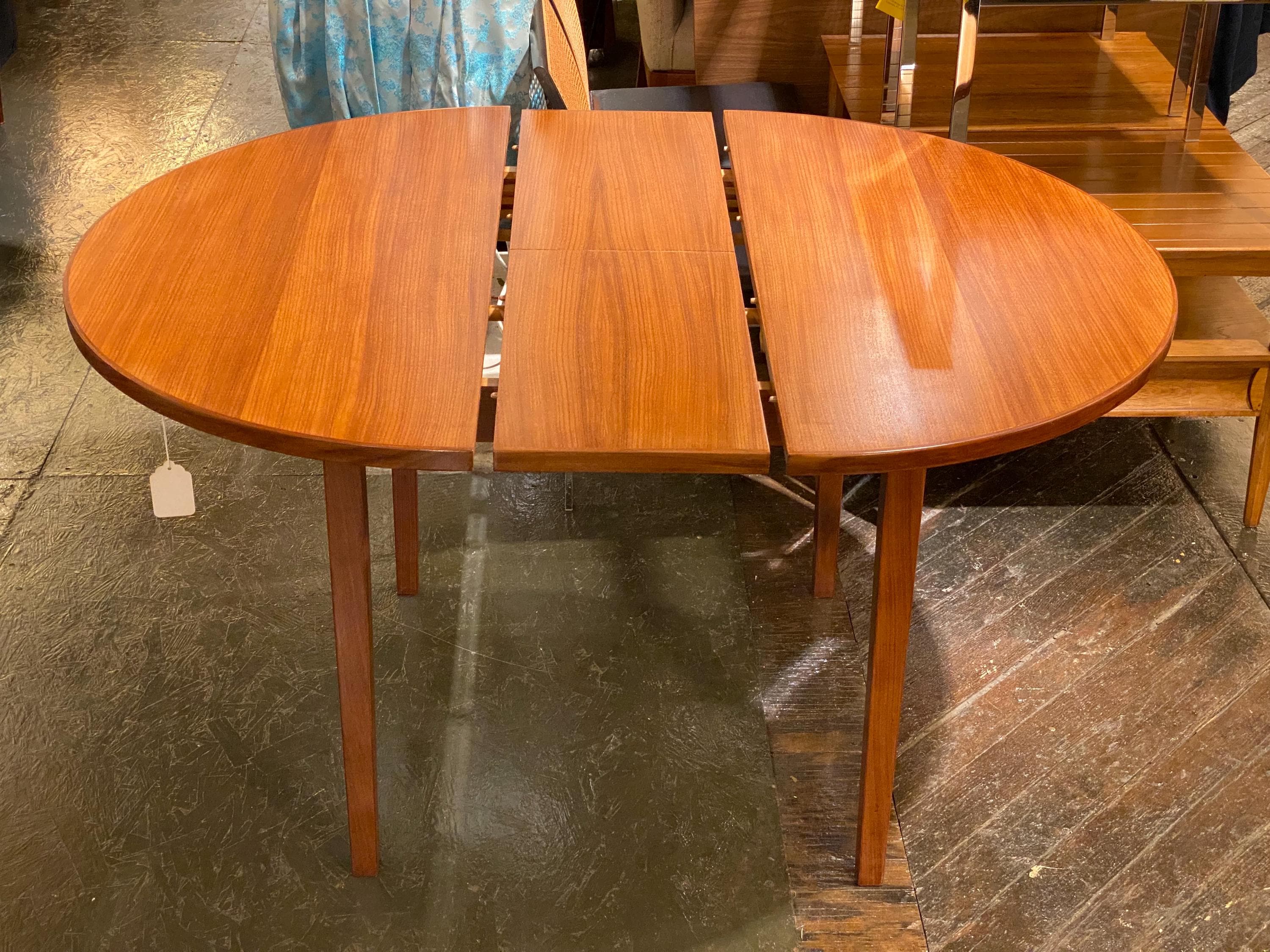 Round Danish afrormosia teak extending dining table with a butterfly leaf, circa 1950s. This very nice and compact Danish dining table would be ideal for a smaller dining room or apartment. This table has a butterfly or folding (11.25" wide) leaf that folds up and sits inside the table. The afromosia teak was used in earlier mid-century Danish design and has a buttery look and feel to the wood, plus the woodgrain is stunning from every angle. This is a very simple but elegant table, and without the leaf it sits 4 people, adding the leaf it sits 4 comfortably for a large meal, or would fit 6 people if needed, while extending to 52.5" in length. This table is unmarked, but it did have international moving stickers suggesting it was moved by a family from Europe to the US. The table top was fully restored, and it looks great. Please reach out if you have any questions, and thanks for looking!