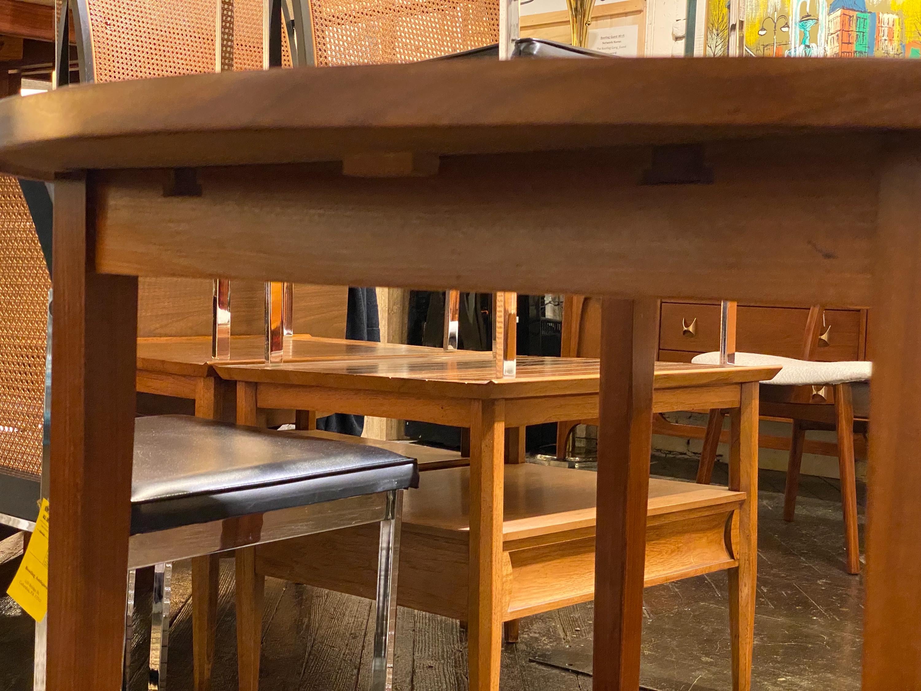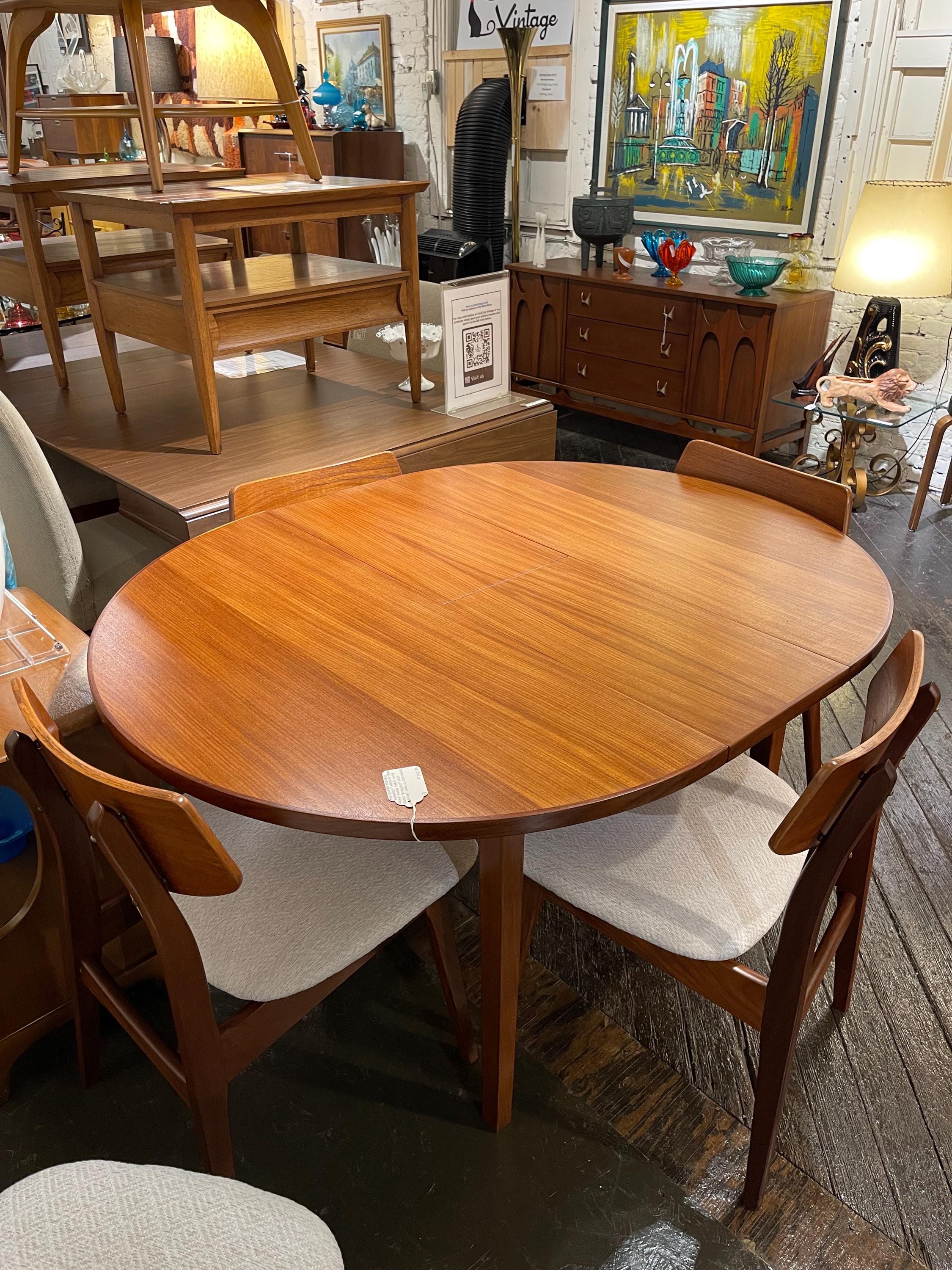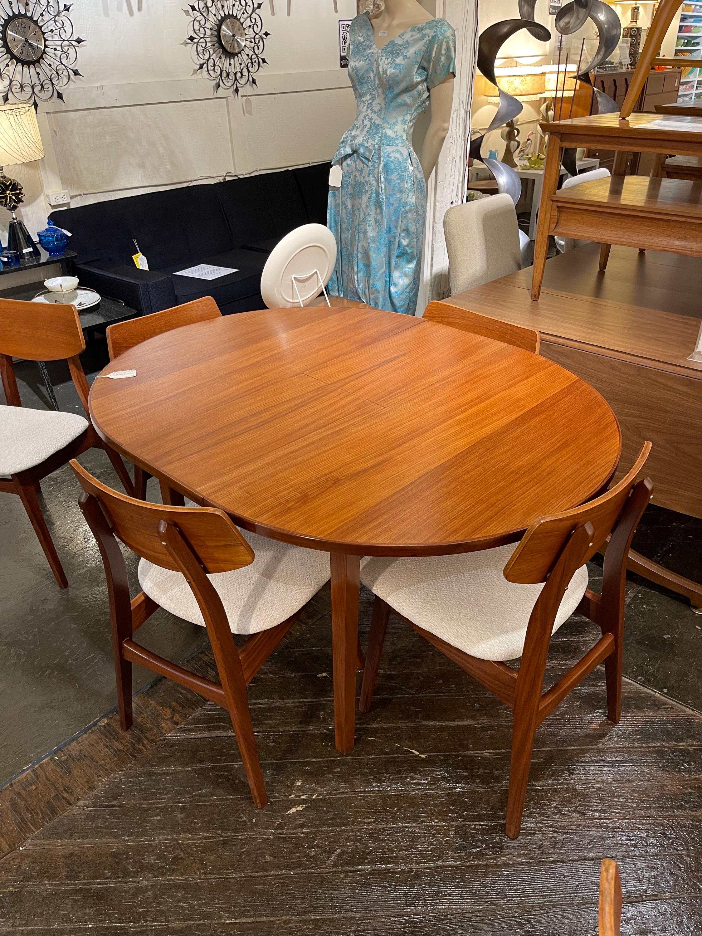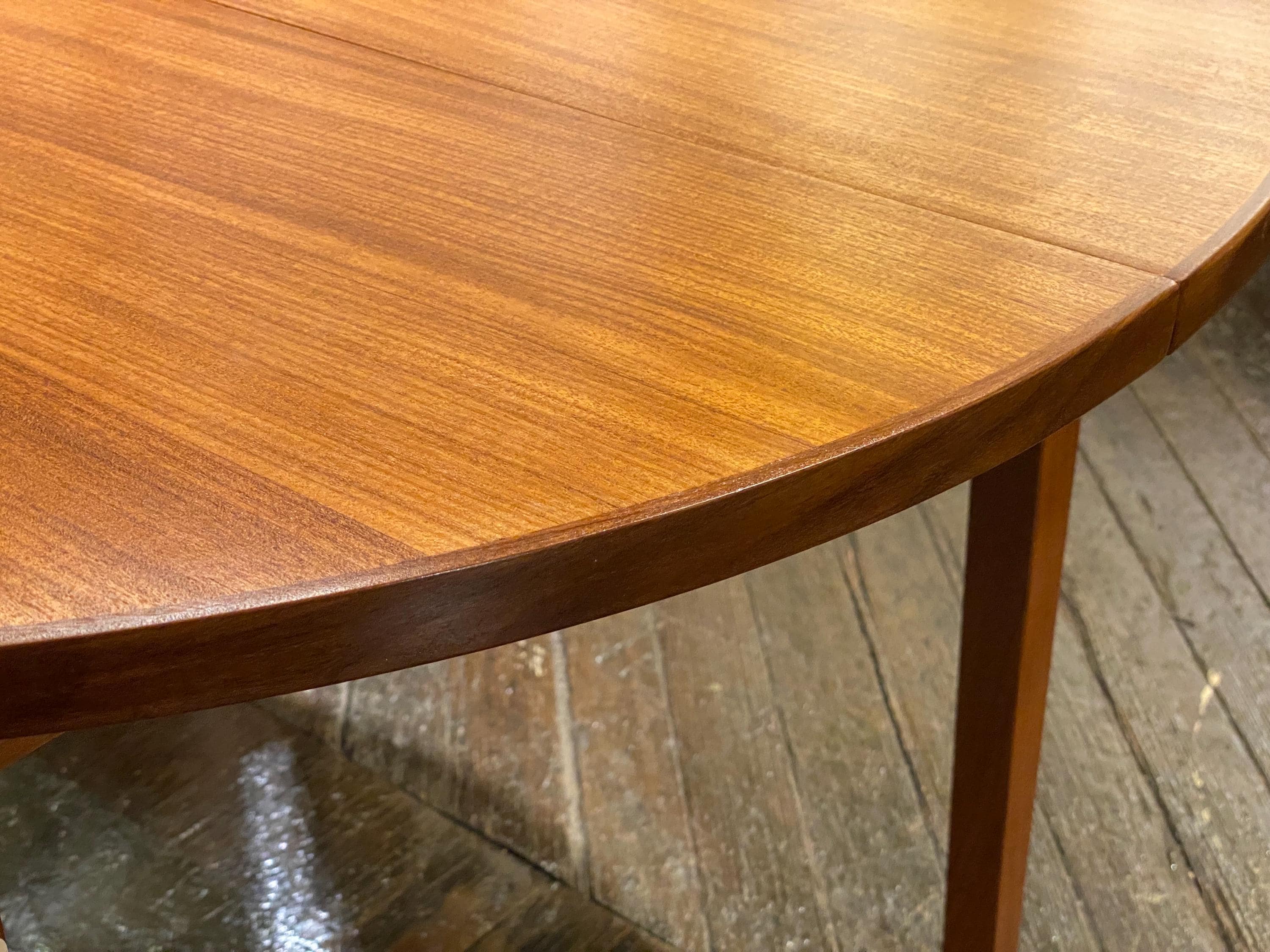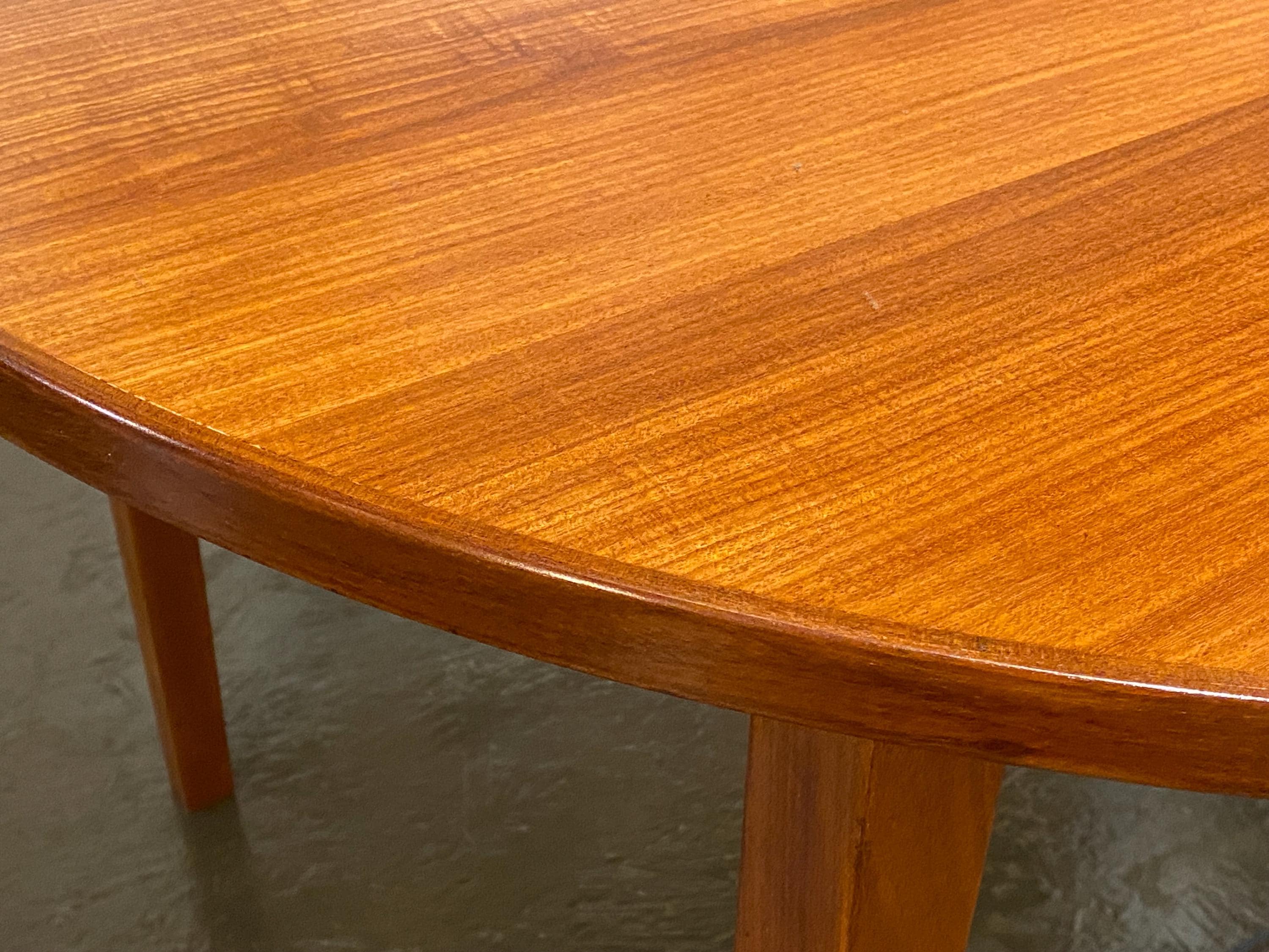 Round Danish afrormosia teak extending dining table with a butterfly leaf, circa 1950s. This very nice and compact Danish dining table would be ideal for a smaller dining room or apartment. This table has a butterfly or folding (11.25" wide) leaf that folds up and sits inside the table. The afromosia teak was used in earlier mid-century Danish design and has a buttery look and feel to the wood, plus the woodgrain is stunning from every angle. This is a very simple but elegant table, and without the leaf it sits 4 people, adding the leaf it sits 4 comfortably for a large meal, or would fit 6 people if needed, while extending to 52.5" in length. This table is unmarked, but it did have international moving stickers suggesting it was moved by a family from Europe to the US. The table top was fully restored, and it looks great. Please reach out if you have any questions, and thanks for looking!
