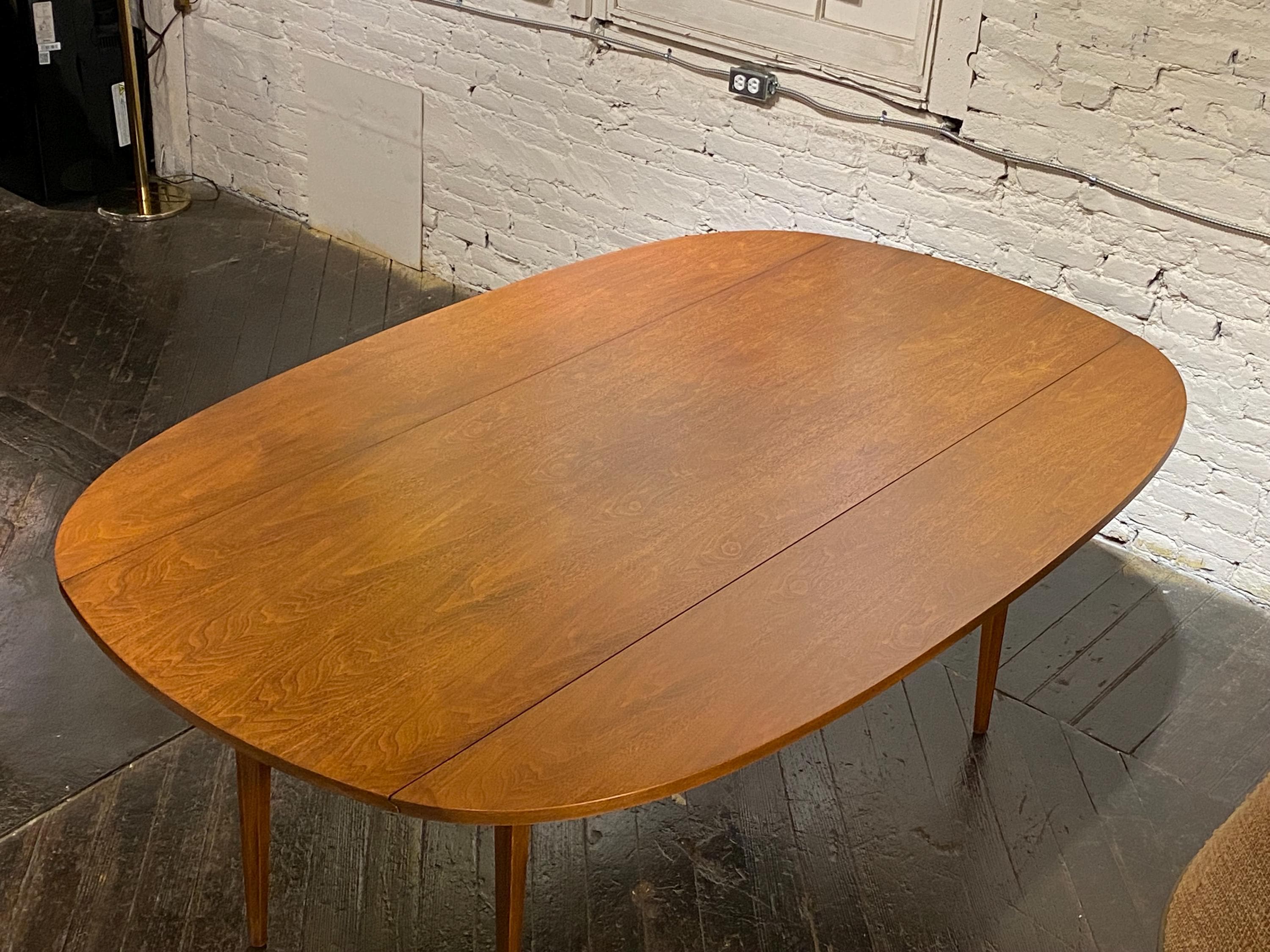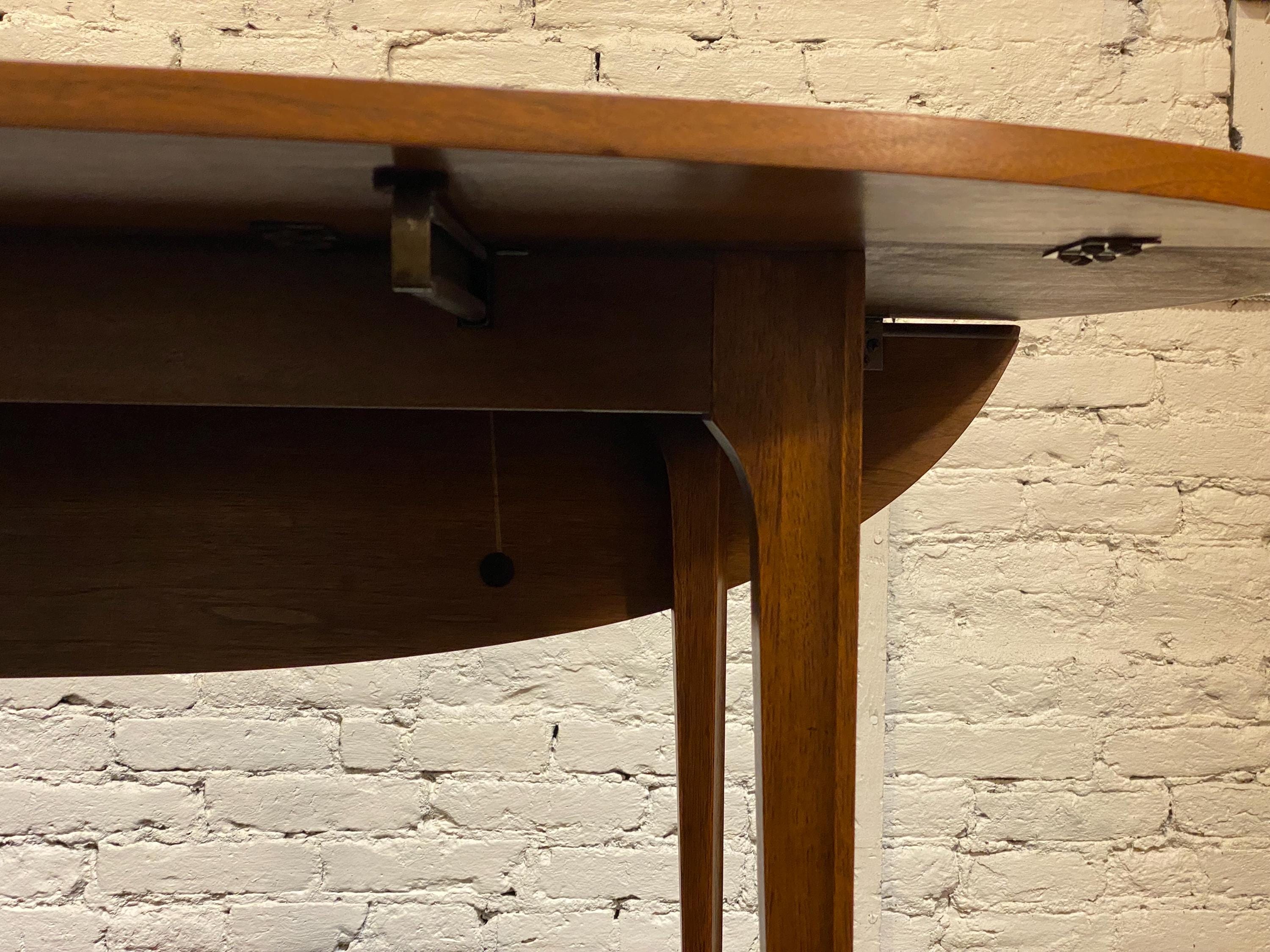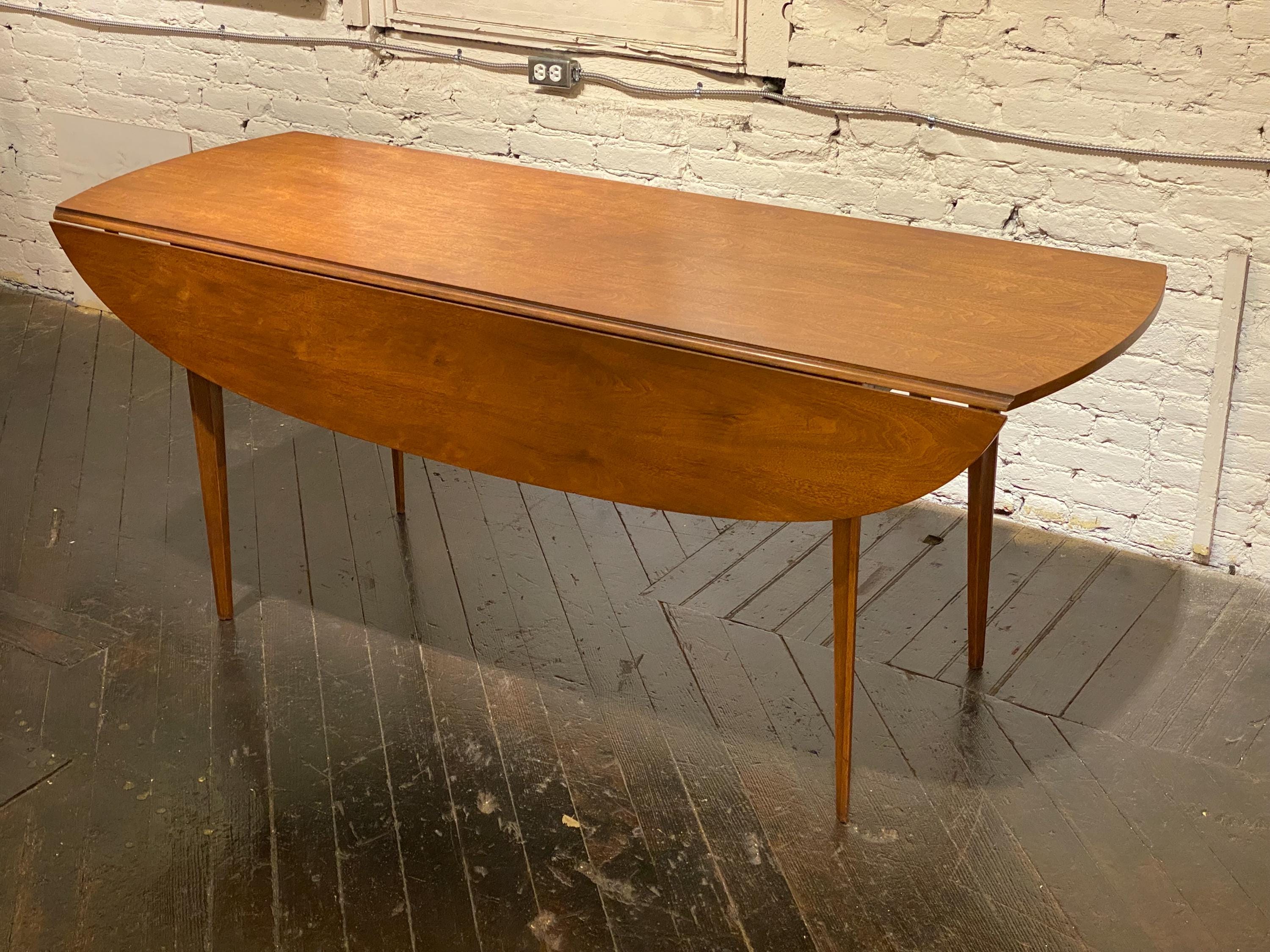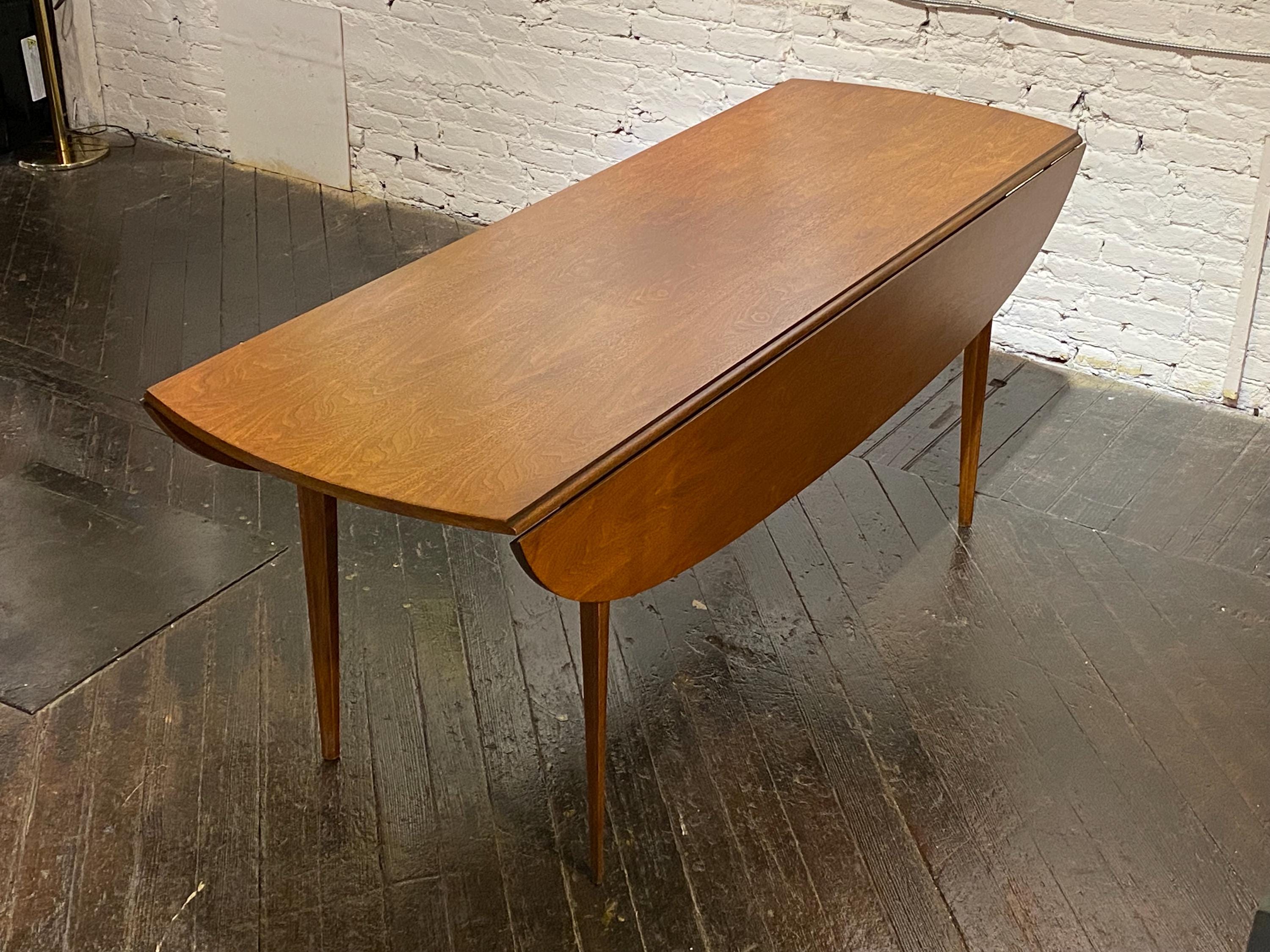 Now available is this stunning and hard-to-find Broyhill Brasilia Harvest table #6140-46. This table is 6 feet long and when opened it reaches 46" wide, and when closed it is 24" wide. This table was intended to be used for feeding a large group, and it can also be placed against a wall and used as a buffet/sideboard if needed. The table works well, each leaf operates as it should, one leaf is missing a hinge, but the other 4 hinges operate the eave with ease. The tabletop was stripped, sanded, and restored with a new walnut finish to bring out its original look and feel. The piece showcases the finely sculpted walnut Brasilia table legs, and it sits sturdily with no issues. Please check out our images and reach out if you have questions. Thanks for looking!