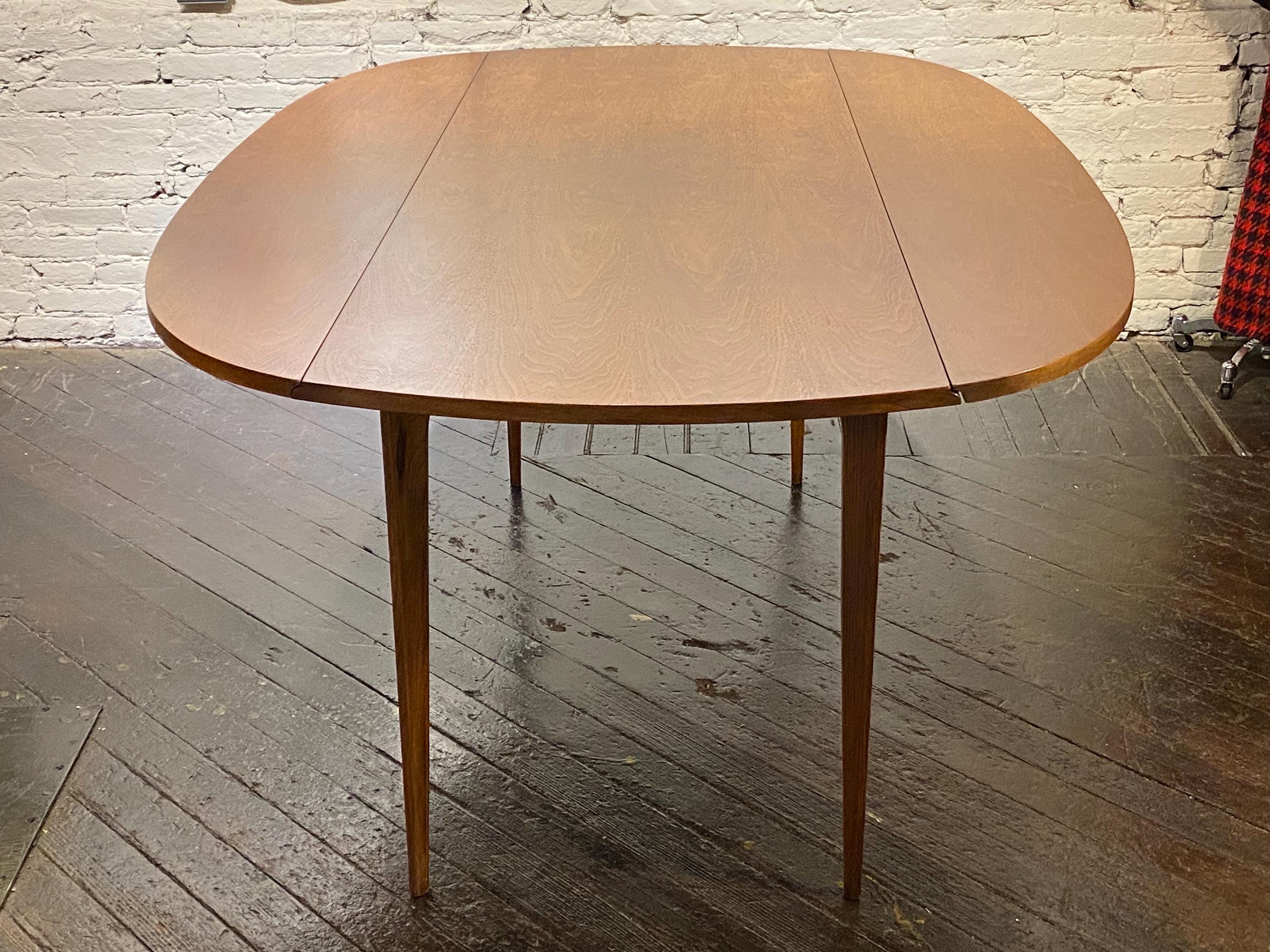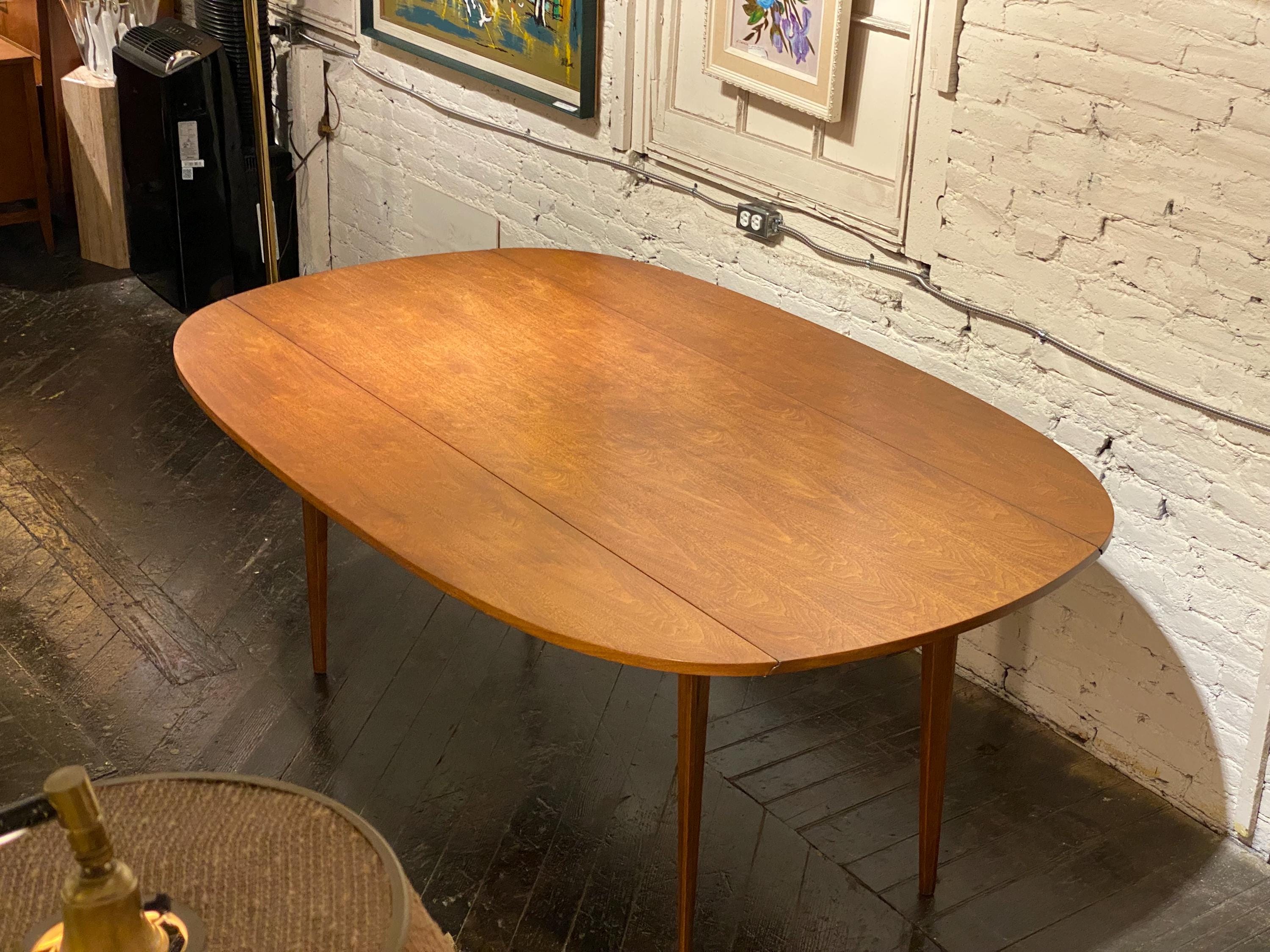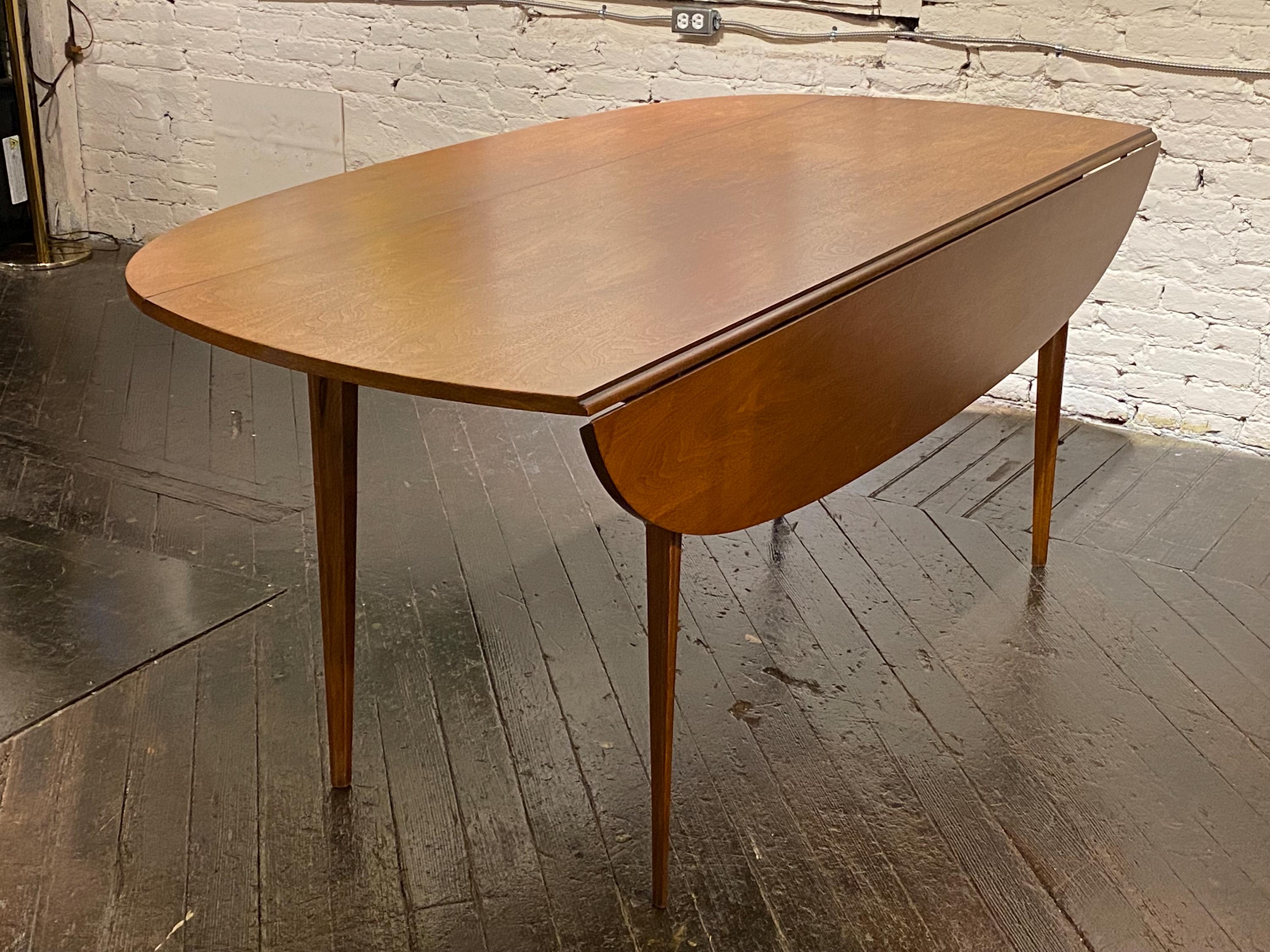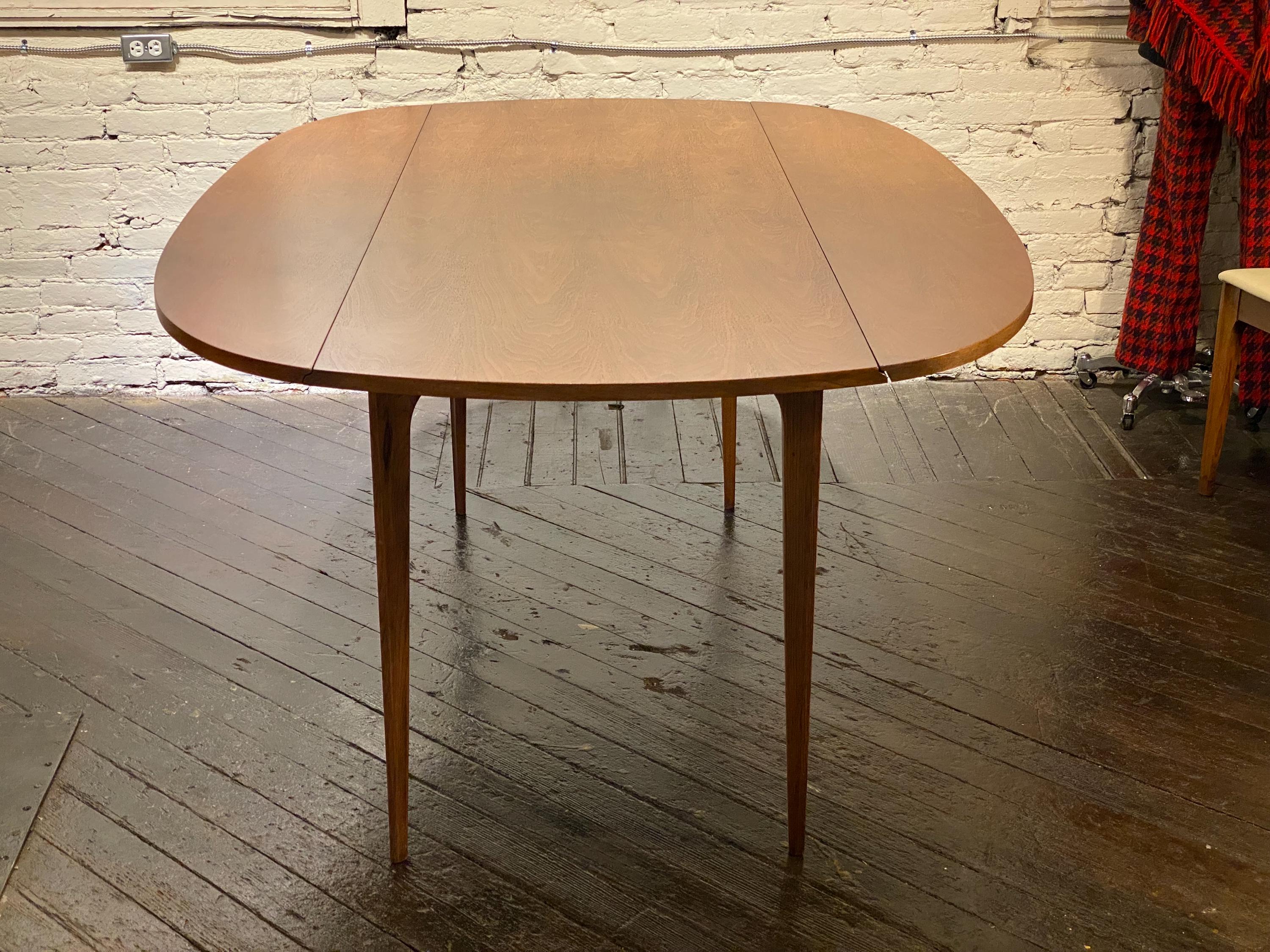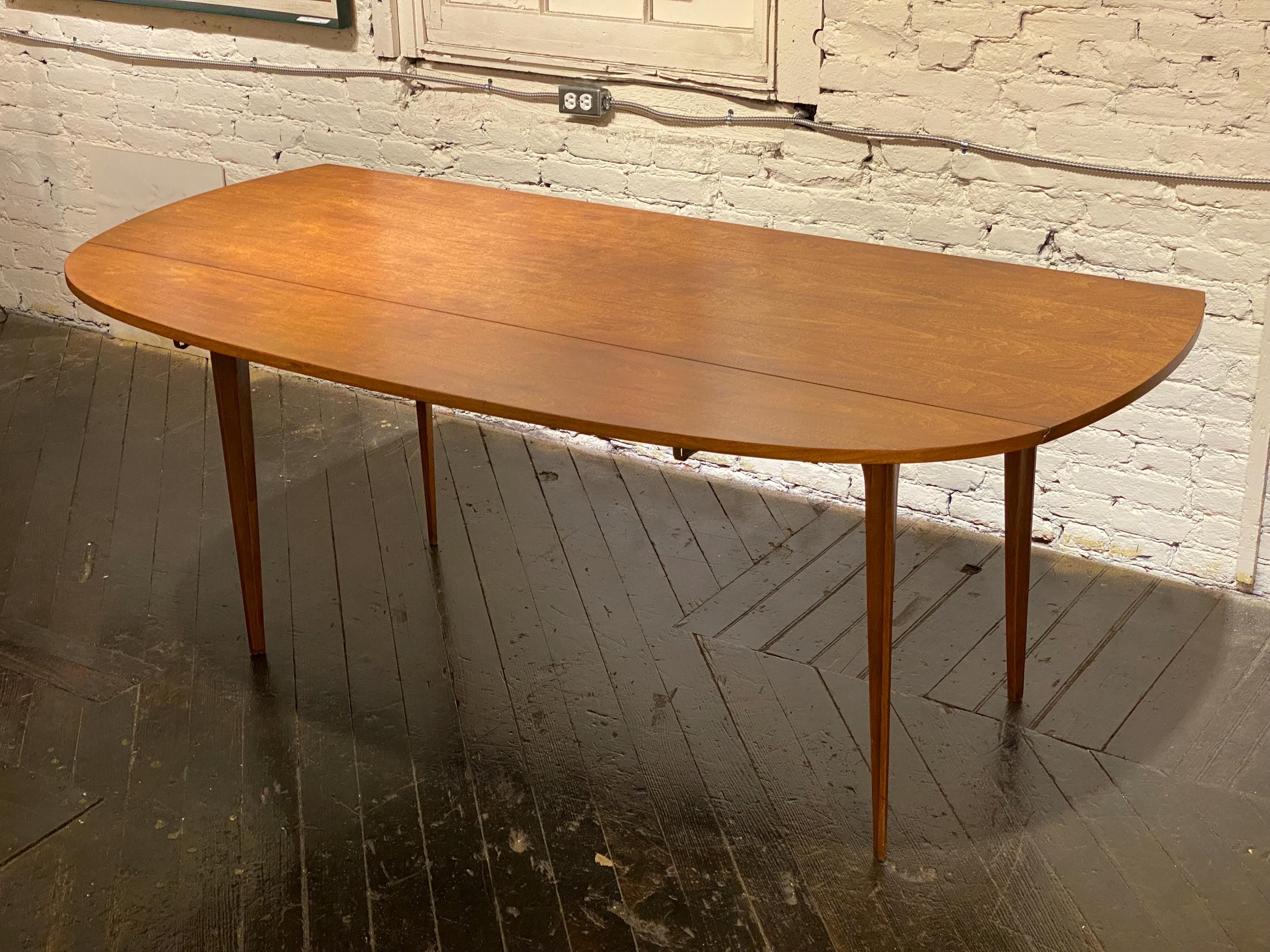 Now available is this stunning and hard-to-find Broyhill Brasilia Harvest table #6140-46. This table is 6 feet long and when opened it reaches 46" wide, and when closed it is 24" wide. This table was intended to be used for feeding a large group, and it can also be placed against a wall and used as a buffet/sideboard if needed. The table works well, each leaf operates as it should, one leaf is missing a hinge, but the other 4 hinges operate the eave with ease. The tabletop was stripped, sanded, and restored with a new walnut finish to bring out its original look and feel. The piece showcases the finely sculpted walnut Brasilia table legs, and it sits sturdily with no issues. Please check out our images and reach out if you have questions. Thanks for looking!