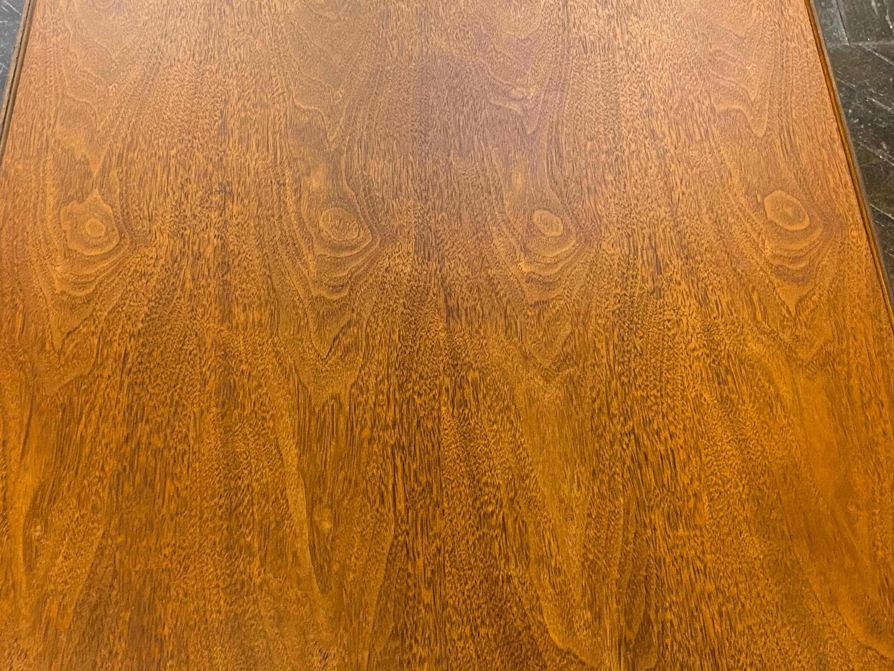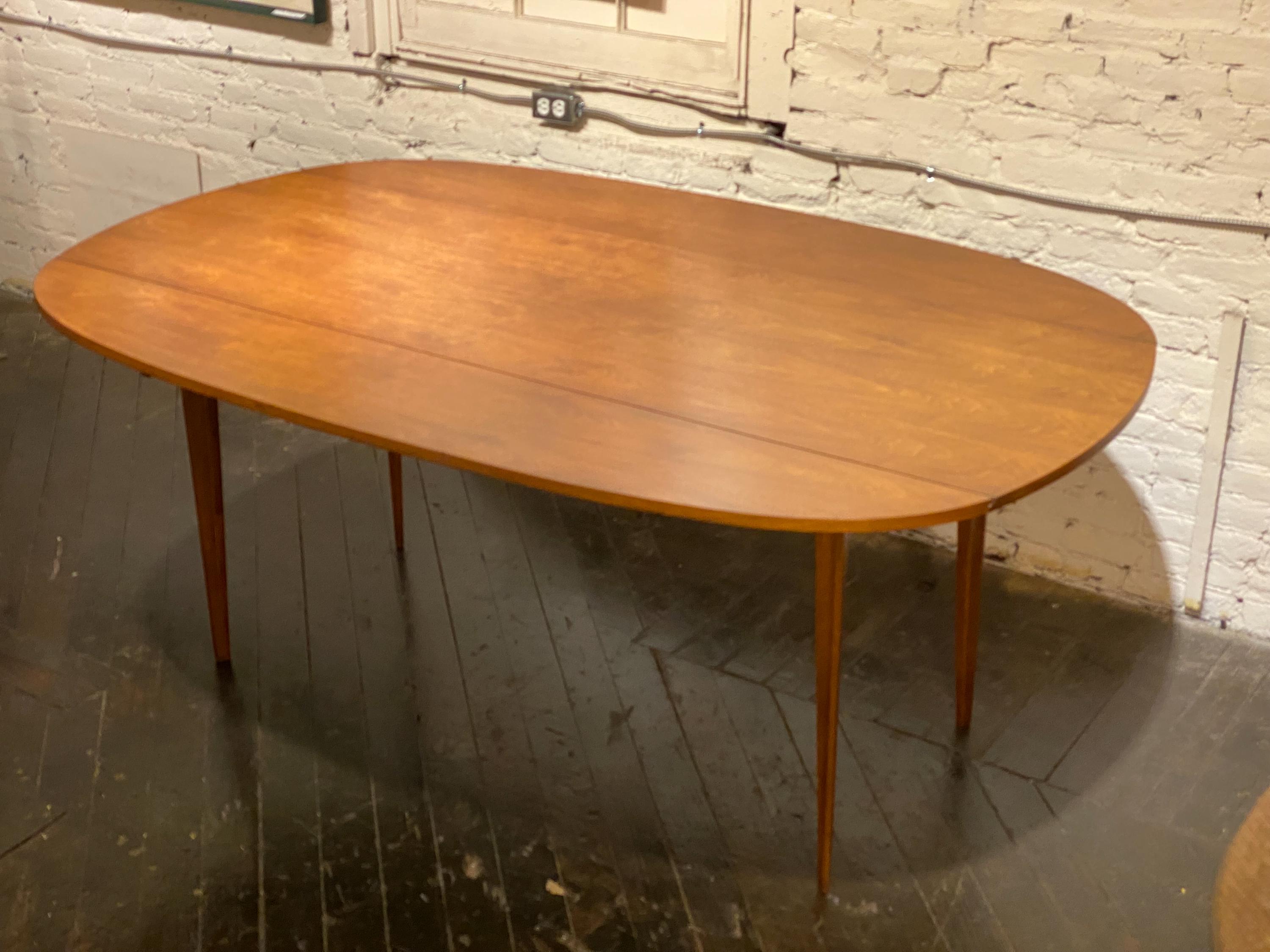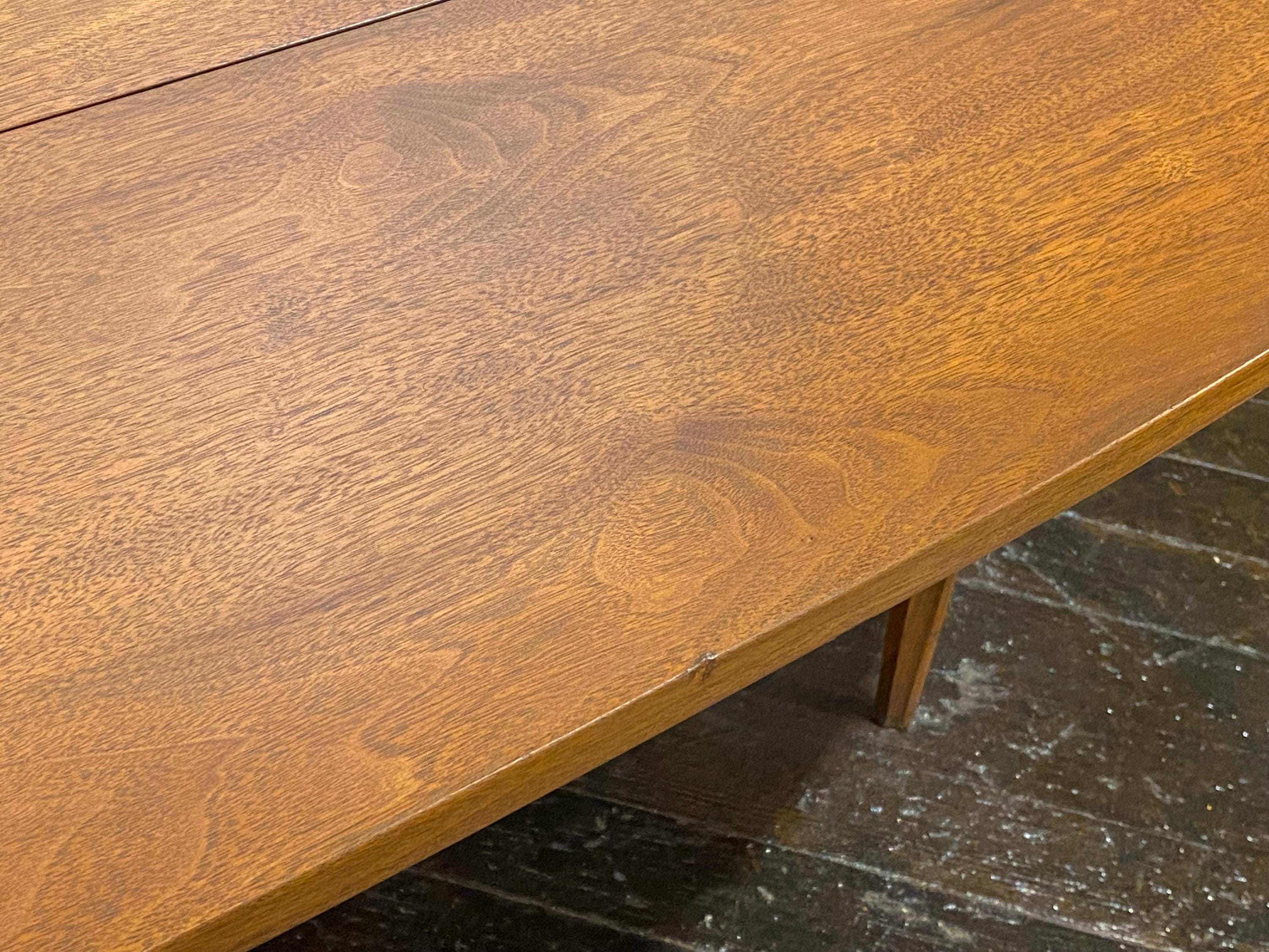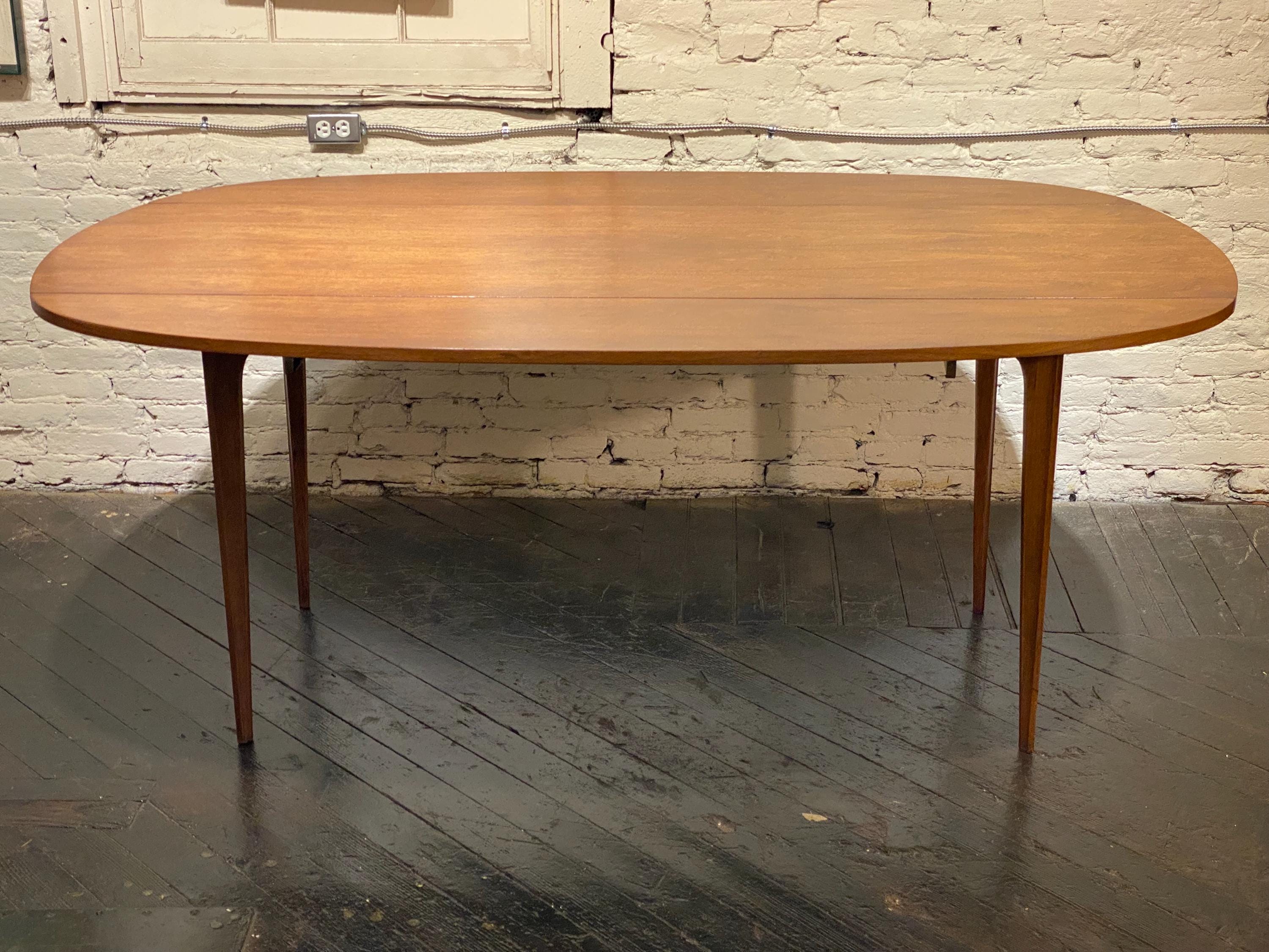 Now available is this stunning and hard-to-find Broyhill Brasilia Harvest table #6140-46. This table is 6 feet long and when opened it reaches 46" wide, and when closed it is 24" wide. This table was intended to be used for feeding a large group, and it can also be placed against a wall and used as a buffet/sideboard if needed. The table works well, each leaf operates as it should, one leaf is missing a hinge, but the other 4 hinges operate the eave with ease. The tabletop was stripped, sanded, and restored with a new walnut finish to bring out its original look and feel. The piece showcases the finely sculpted walnut Brasilia table legs, and it sits sturdily with no issues. Please check out our images and reach out if you have questions. Thanks for looking!