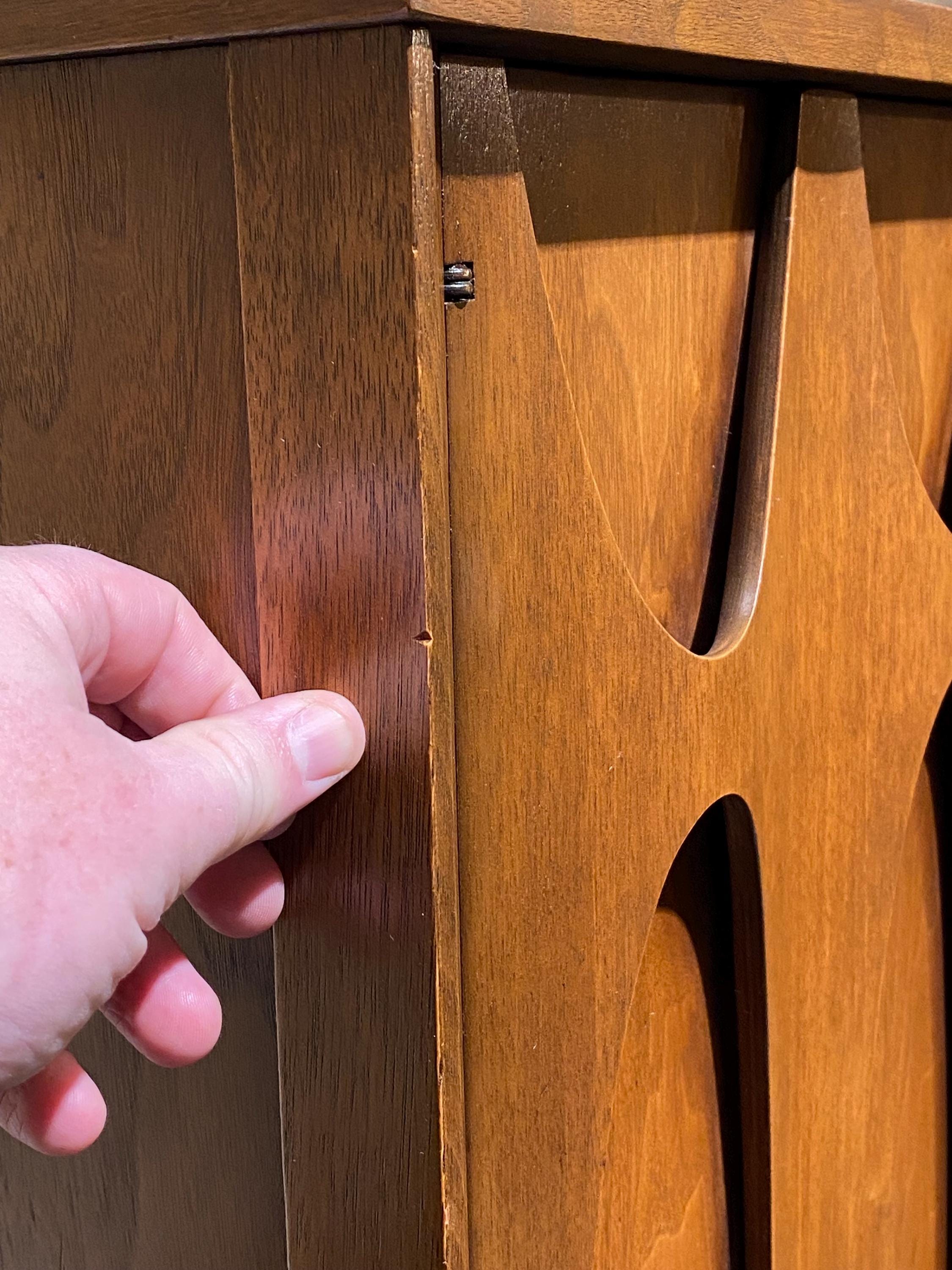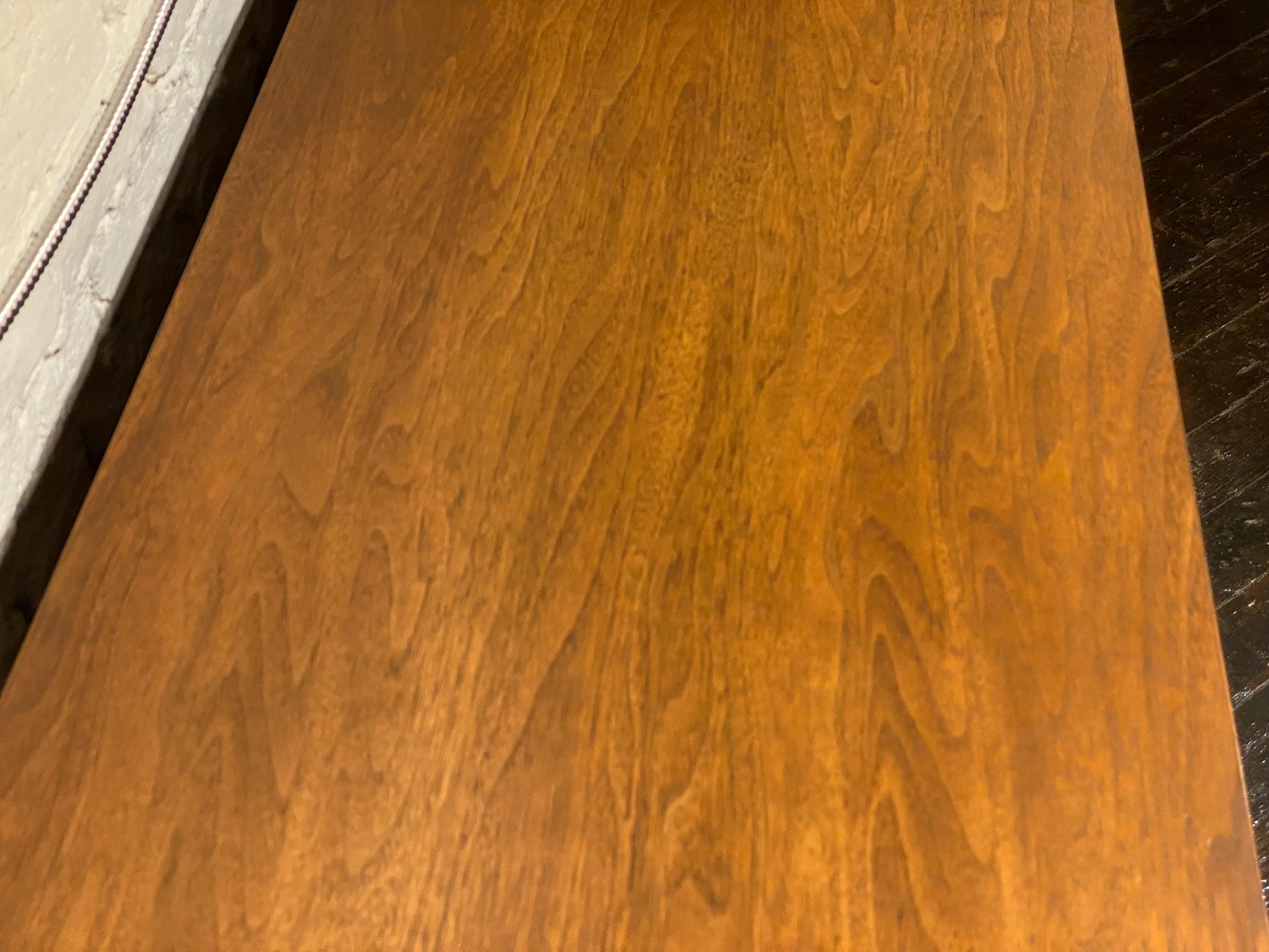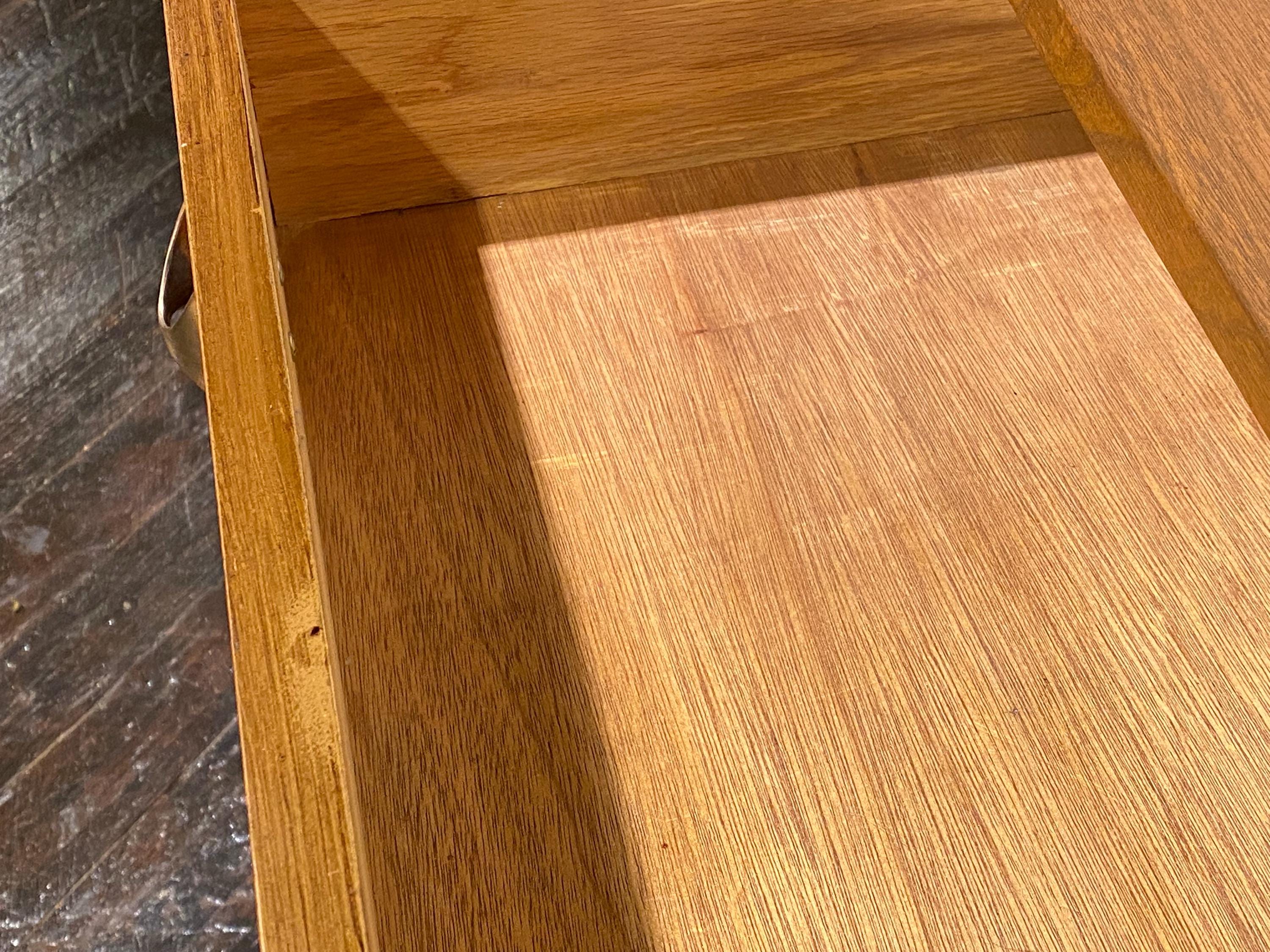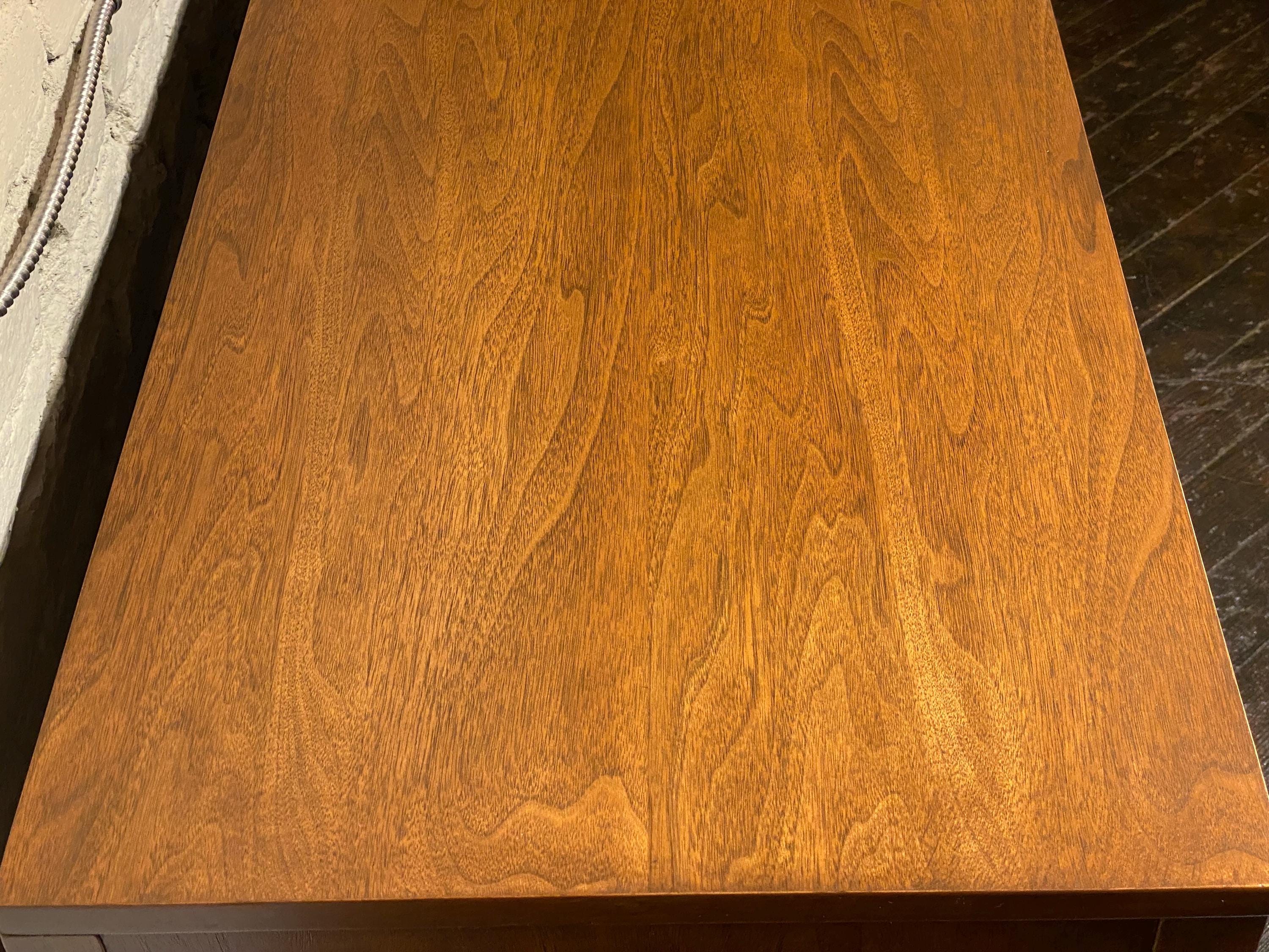 Before bringing this piece into our showroom, we took the time to clean the piece thoroughly, polished the brass pulls, cleaned the inside of each drawer, stripped the top, and added a new walnut finish. We thoroughly inspected the piece and cleaned every inch inside and out to bring the piece back to its original glory. The piece does show some signs of wear. Behind the drawer pulls, there is a slightly darker spot from age/use. The left side has two very, very small dents that we have highlighted in our images. Overall, the piece turned out very nicely and is ready for its next adventure.