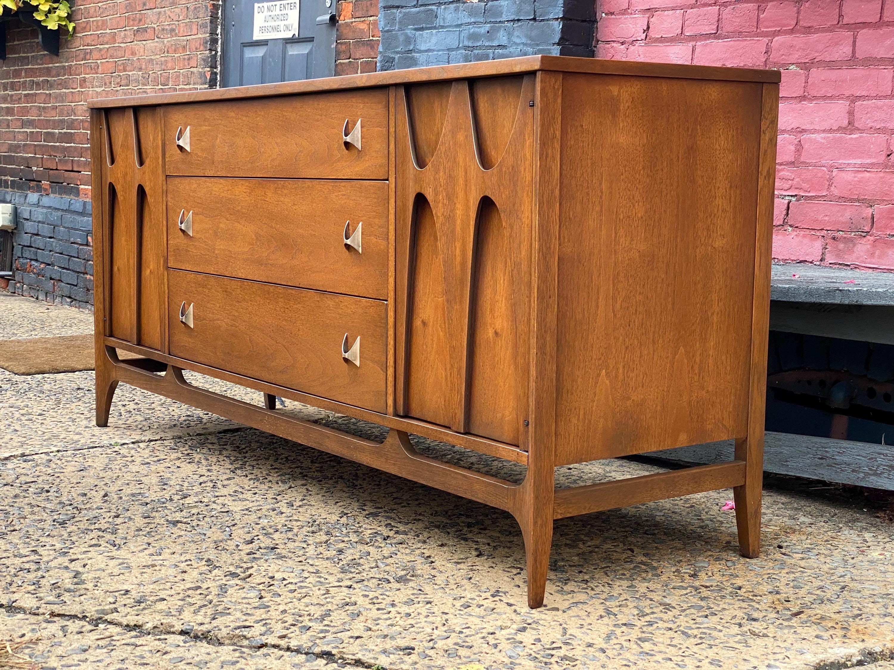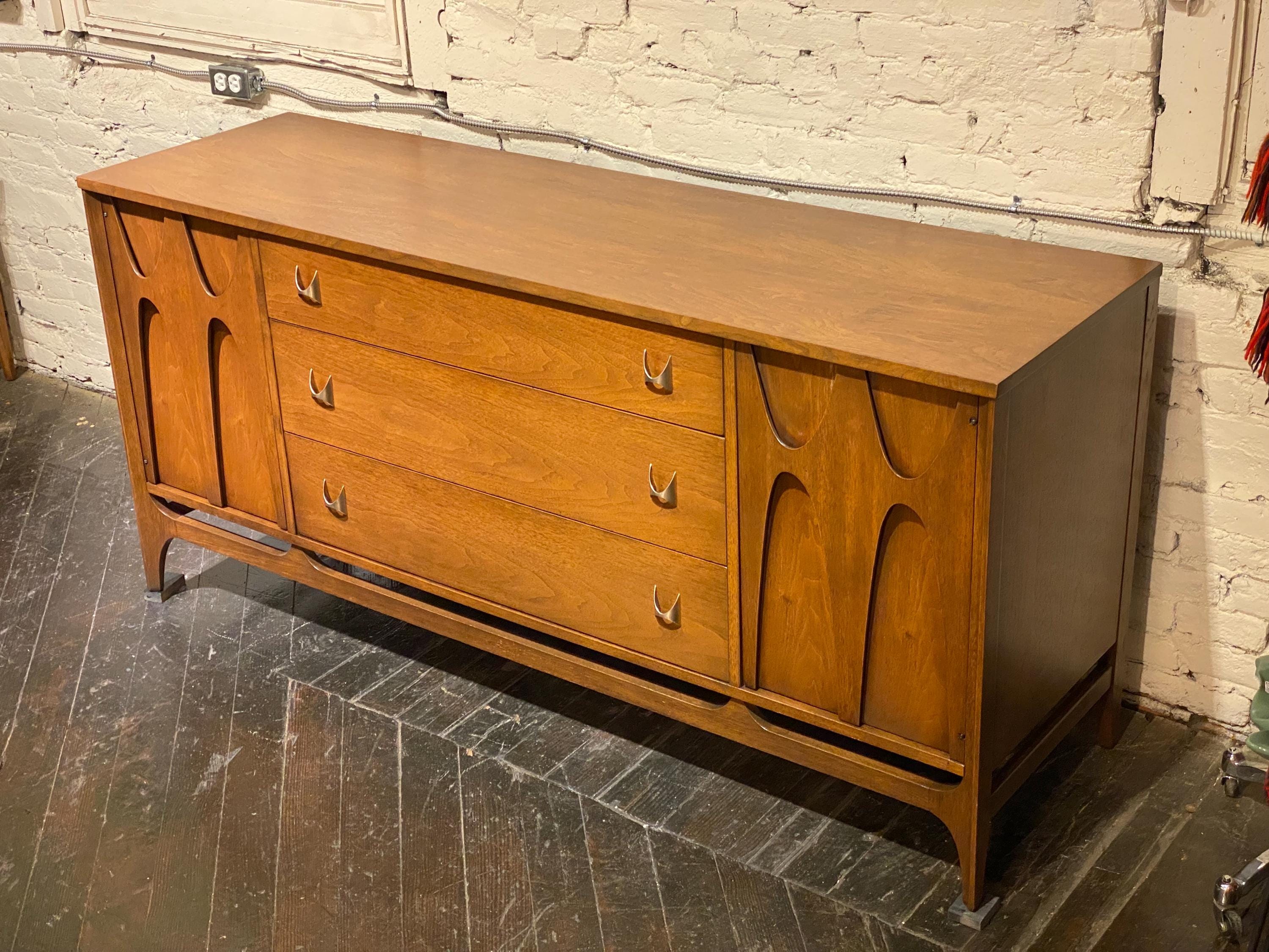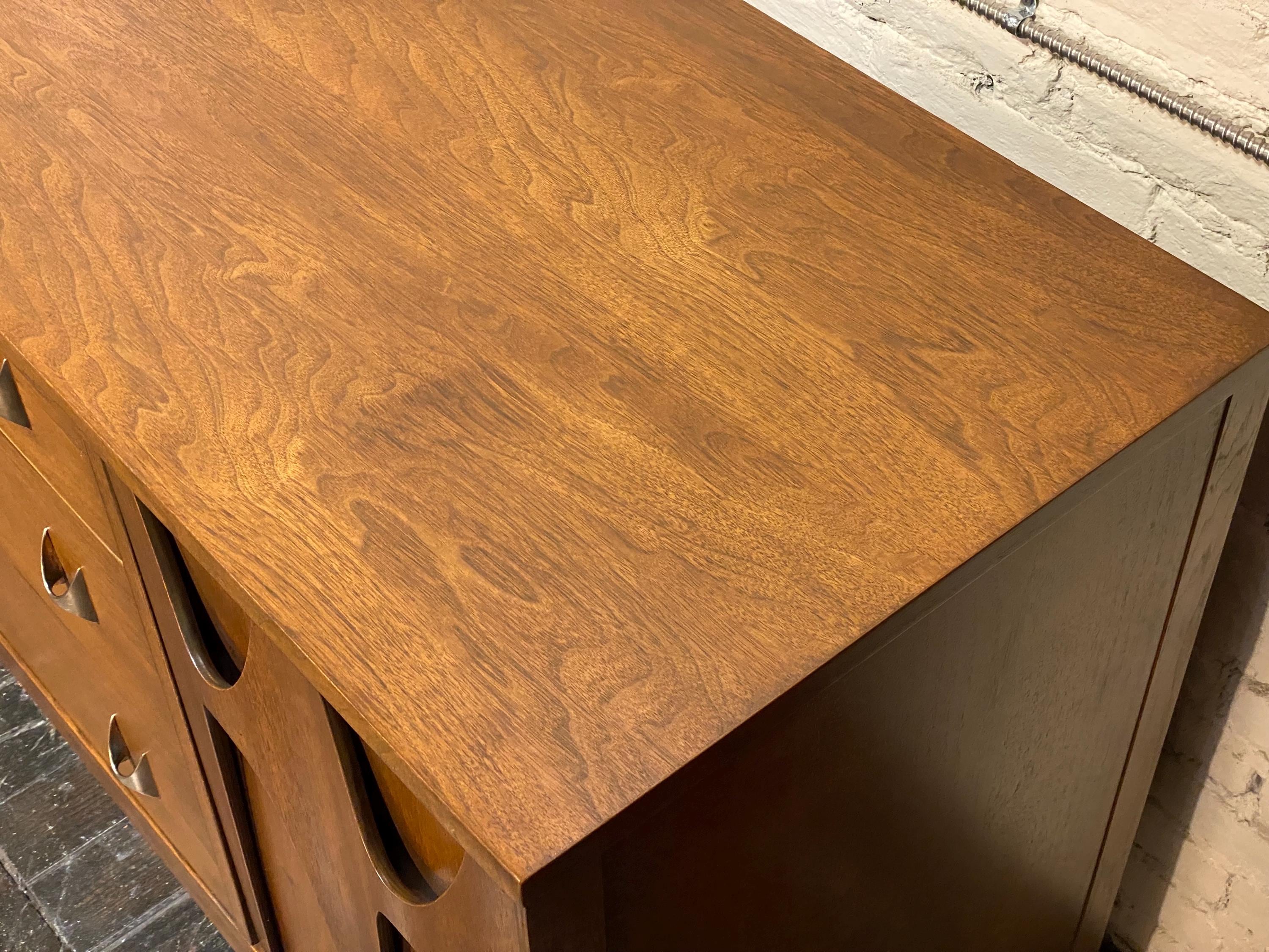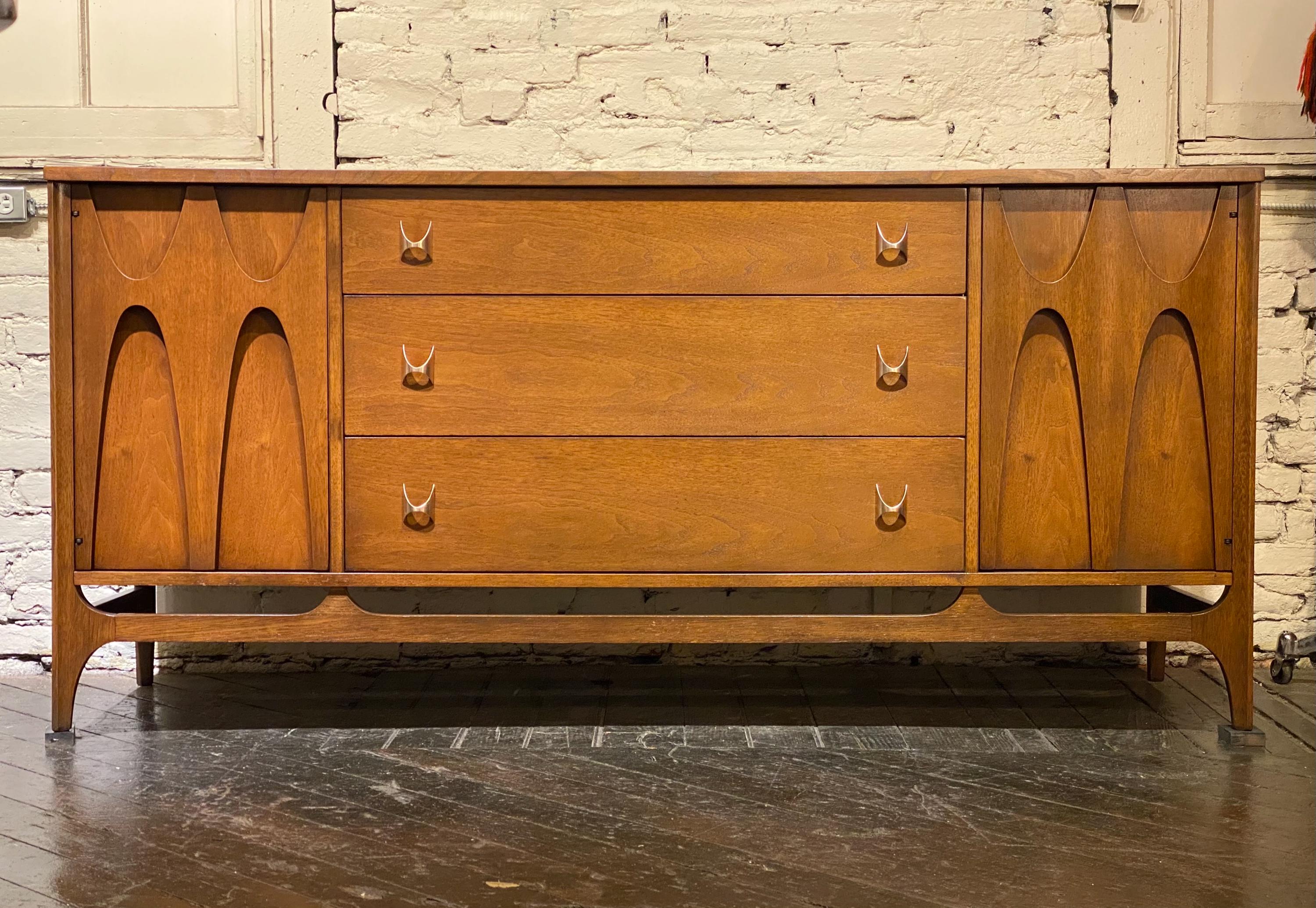 No available for purchase is this stunning 66" long credenza by Broyhill for their famous Brasilia line. This walnut credenza showcases some of the finest features of the Braislia line, from the brass pulls to the signature swoops on the doors; it oozes American Mid Century Modern from every angle. Manufactured in the 1960s, this piece has stood the test of time. This piece is the true credenza from the Brasilia line; it stands at 31".