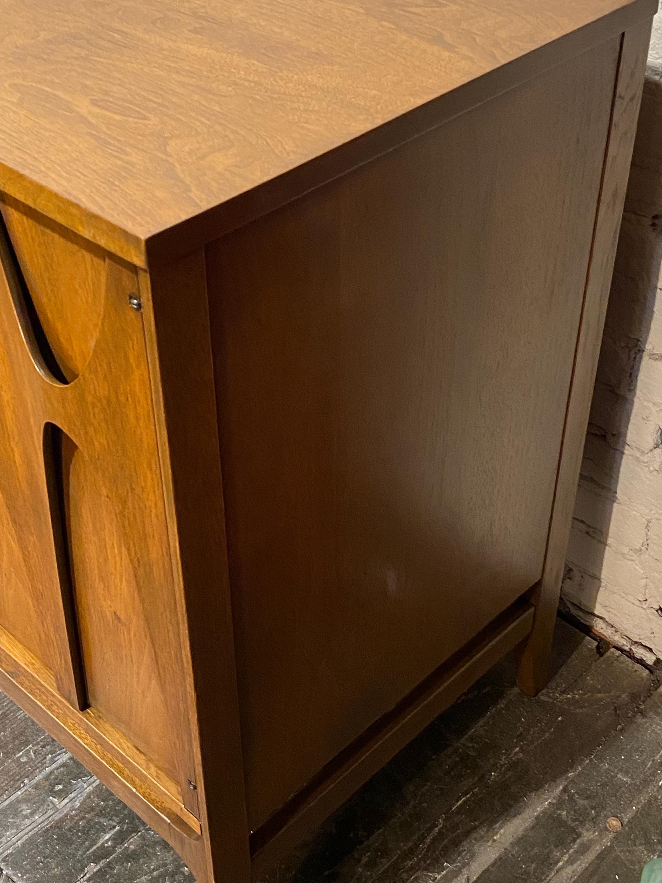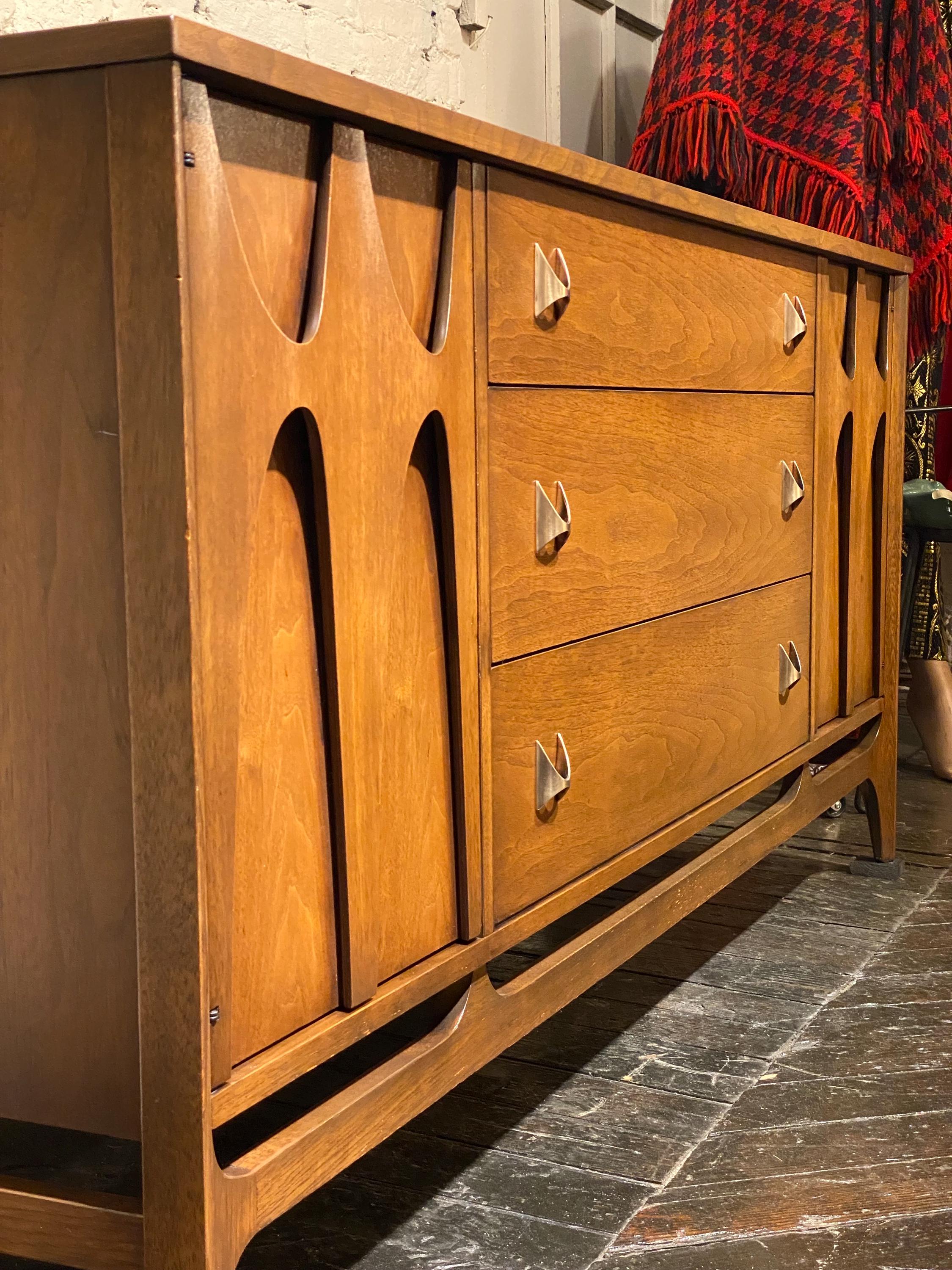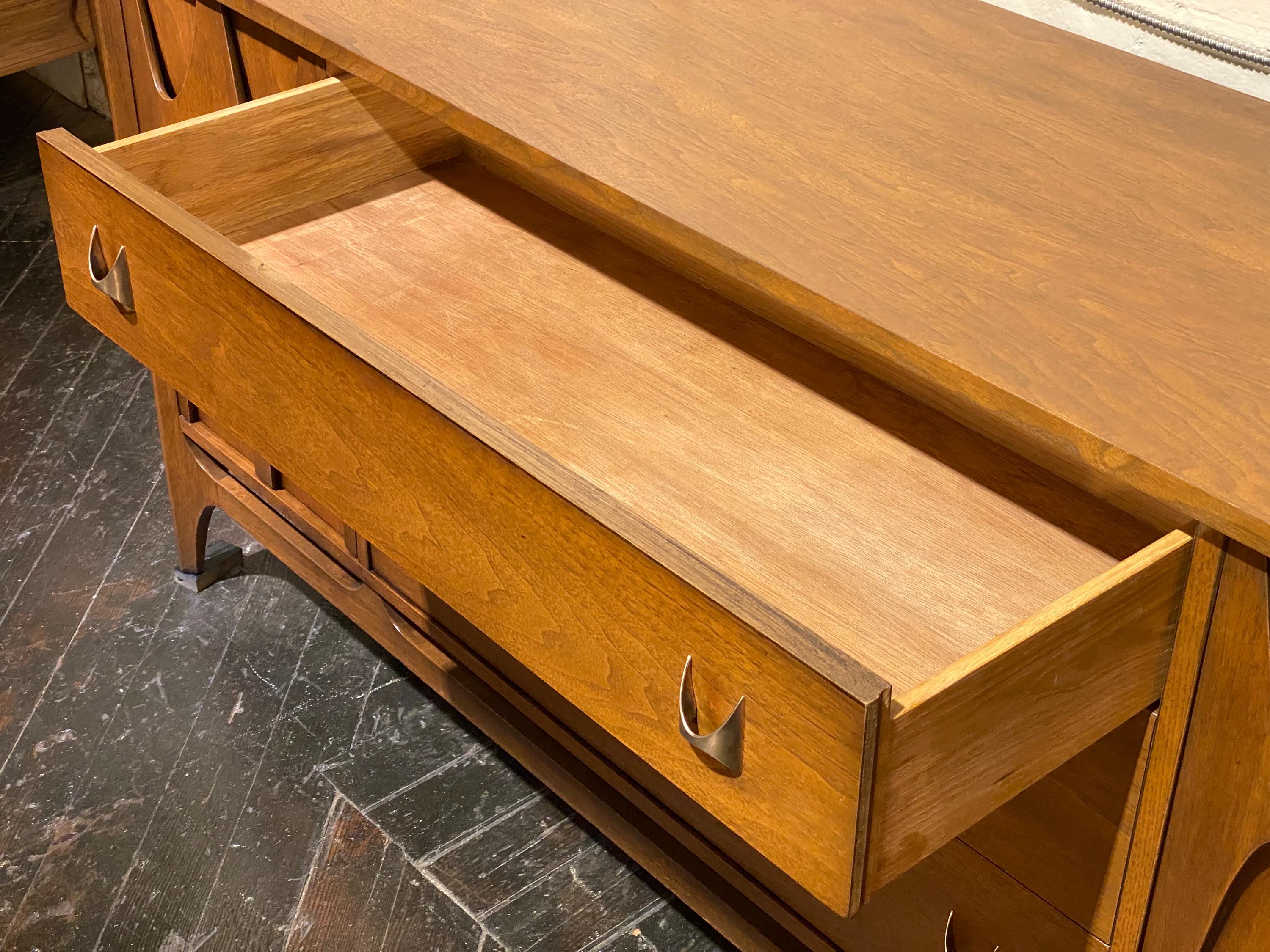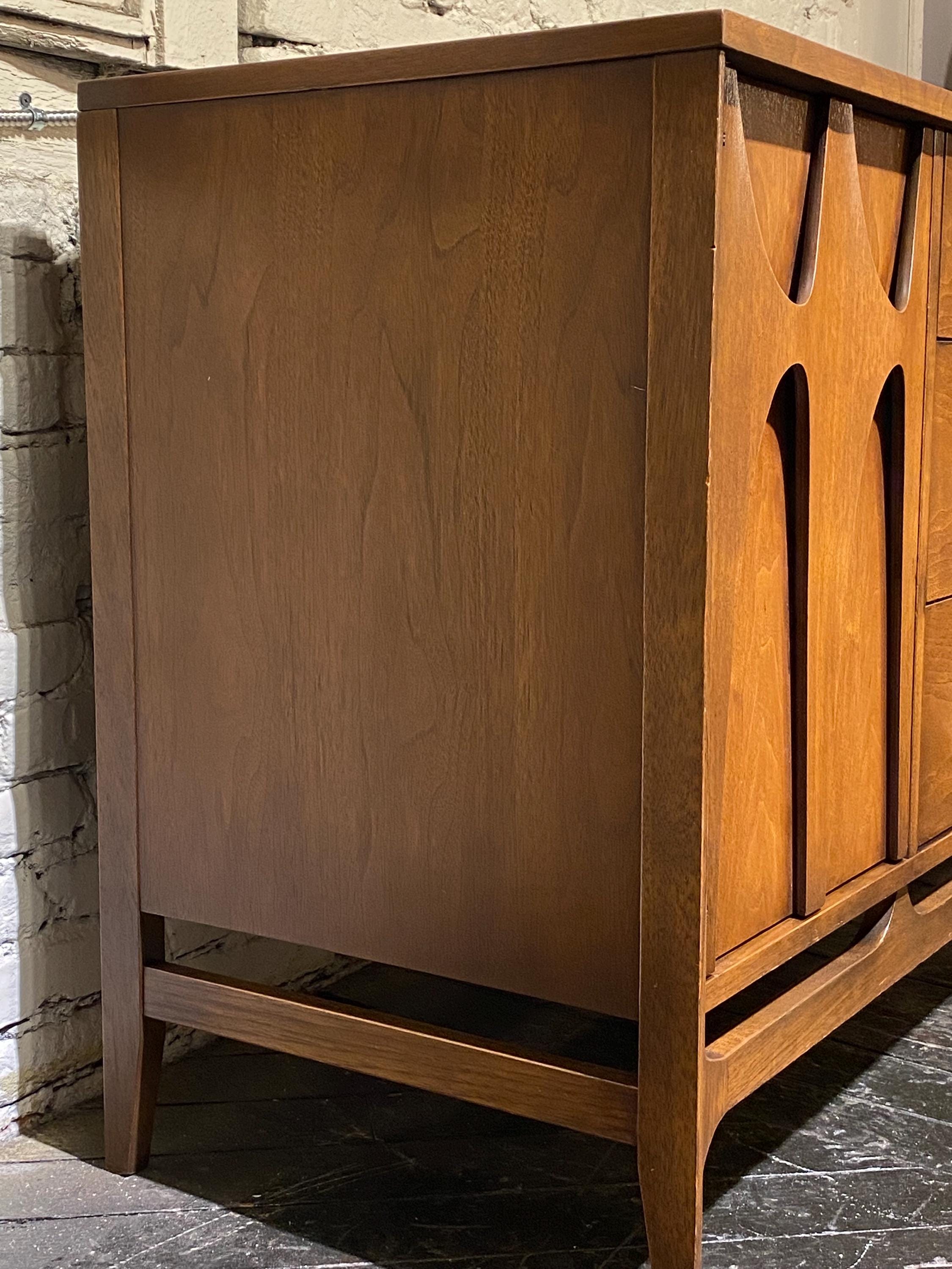 No available for purchase is this stunning 66" long credenza by Broyhill for their famous Brasilia line. This walnut credenza showcases some of the finest features of the Braislia line, from the brass pulls to the signature swoops on the doors; it oozes American Mid Century Modern from every angle. Manufactured in the 1960s, this piece has stood the test of time. This piece is the true credenza from the Brasilia line; it stands at 31".