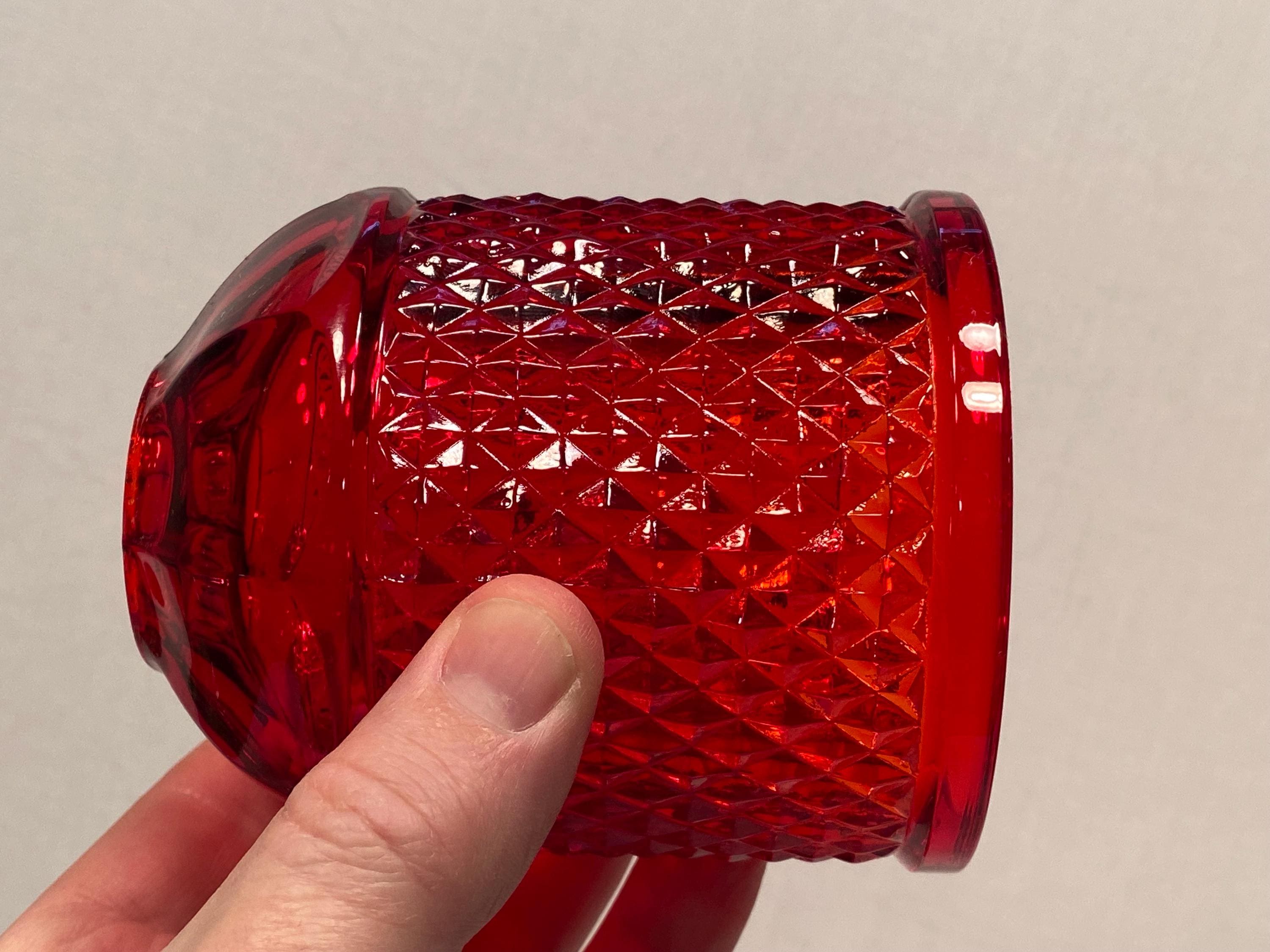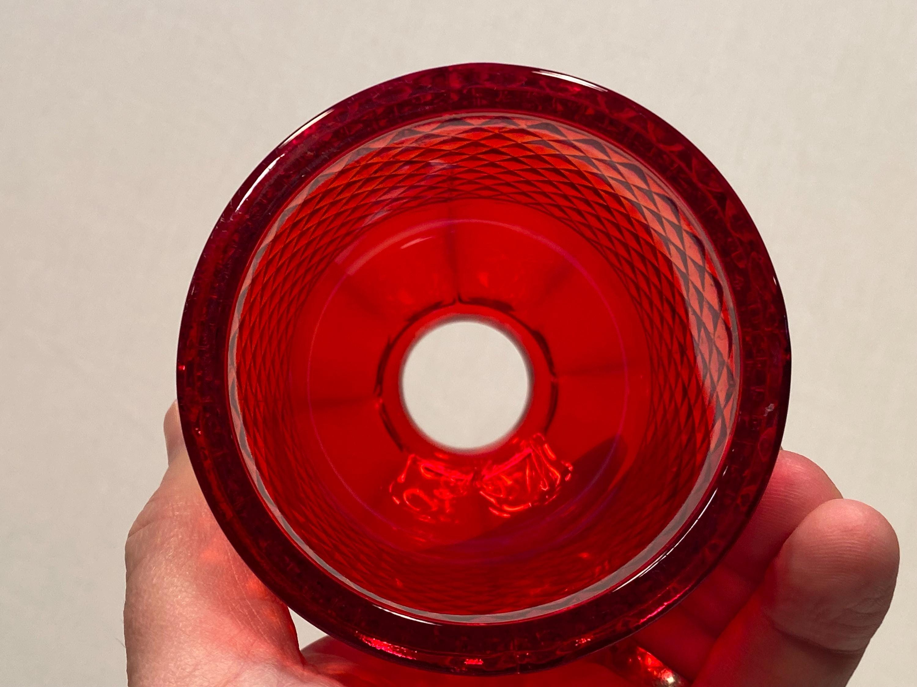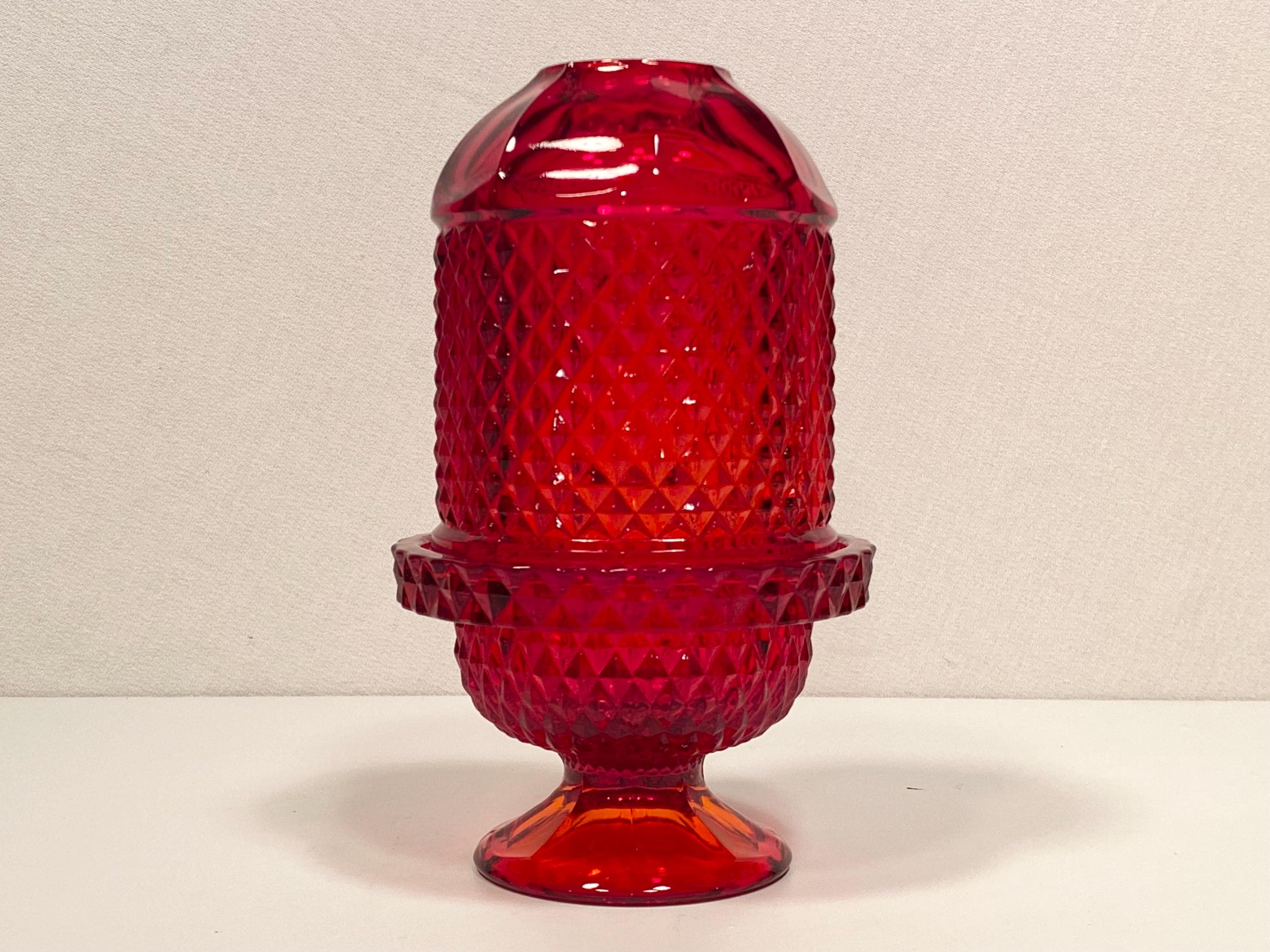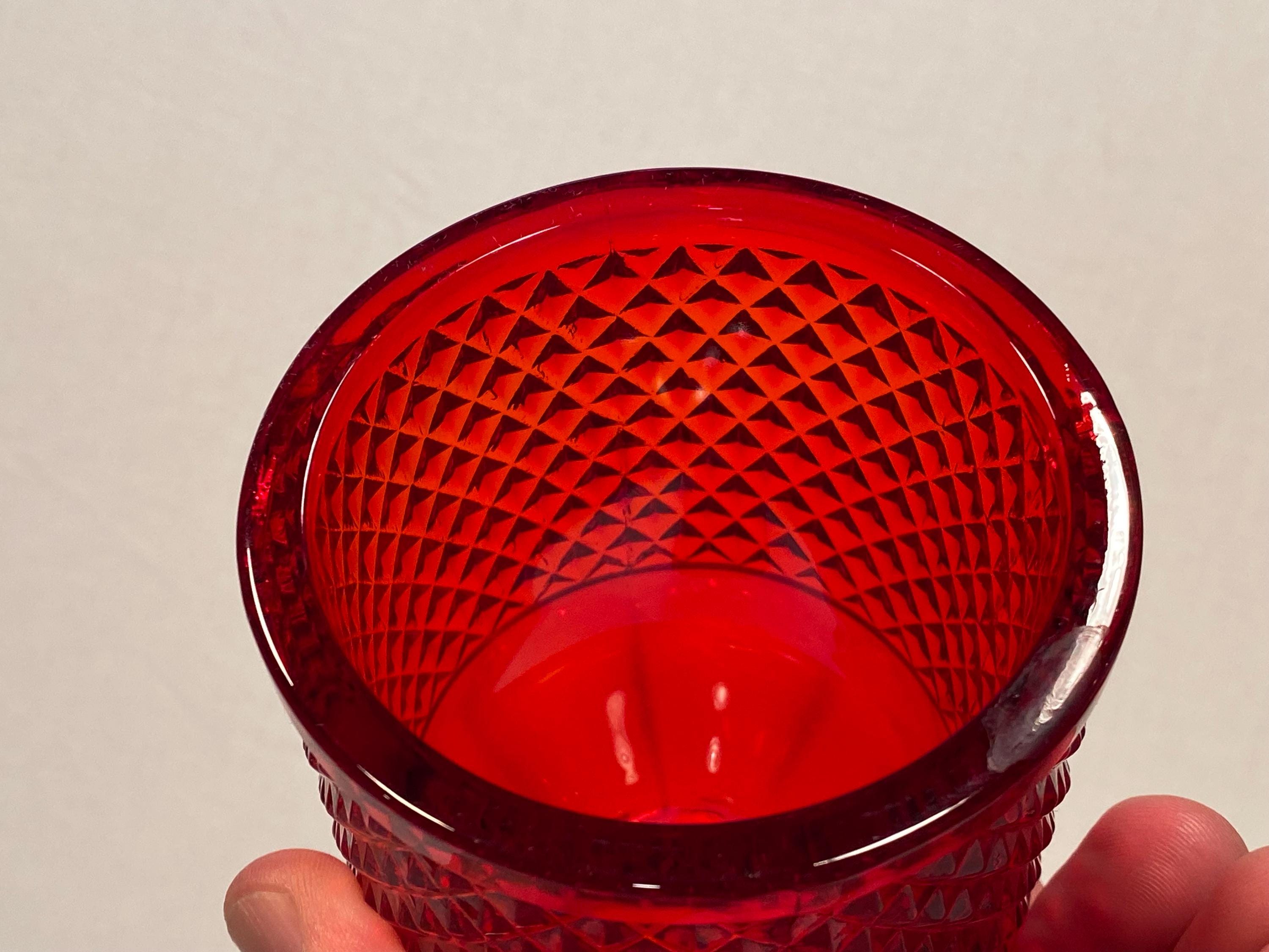 Viking Ruby Red Diamond Point Fairy lamp in excellent condition with no cracks or chips. Color is vibrant with no signs of dishwasher wear. Measures approximately 4" at widest and 6.75" tall.
