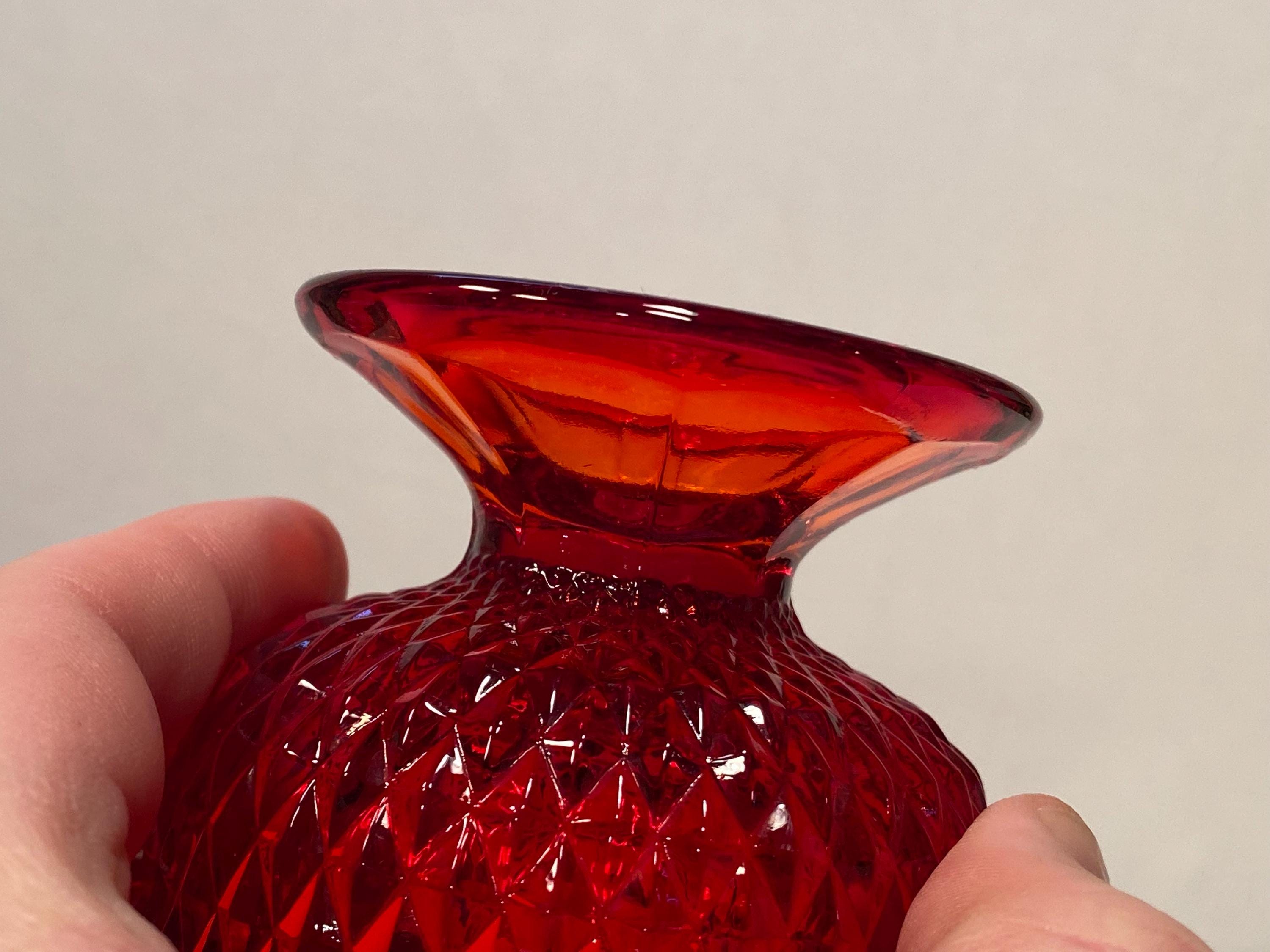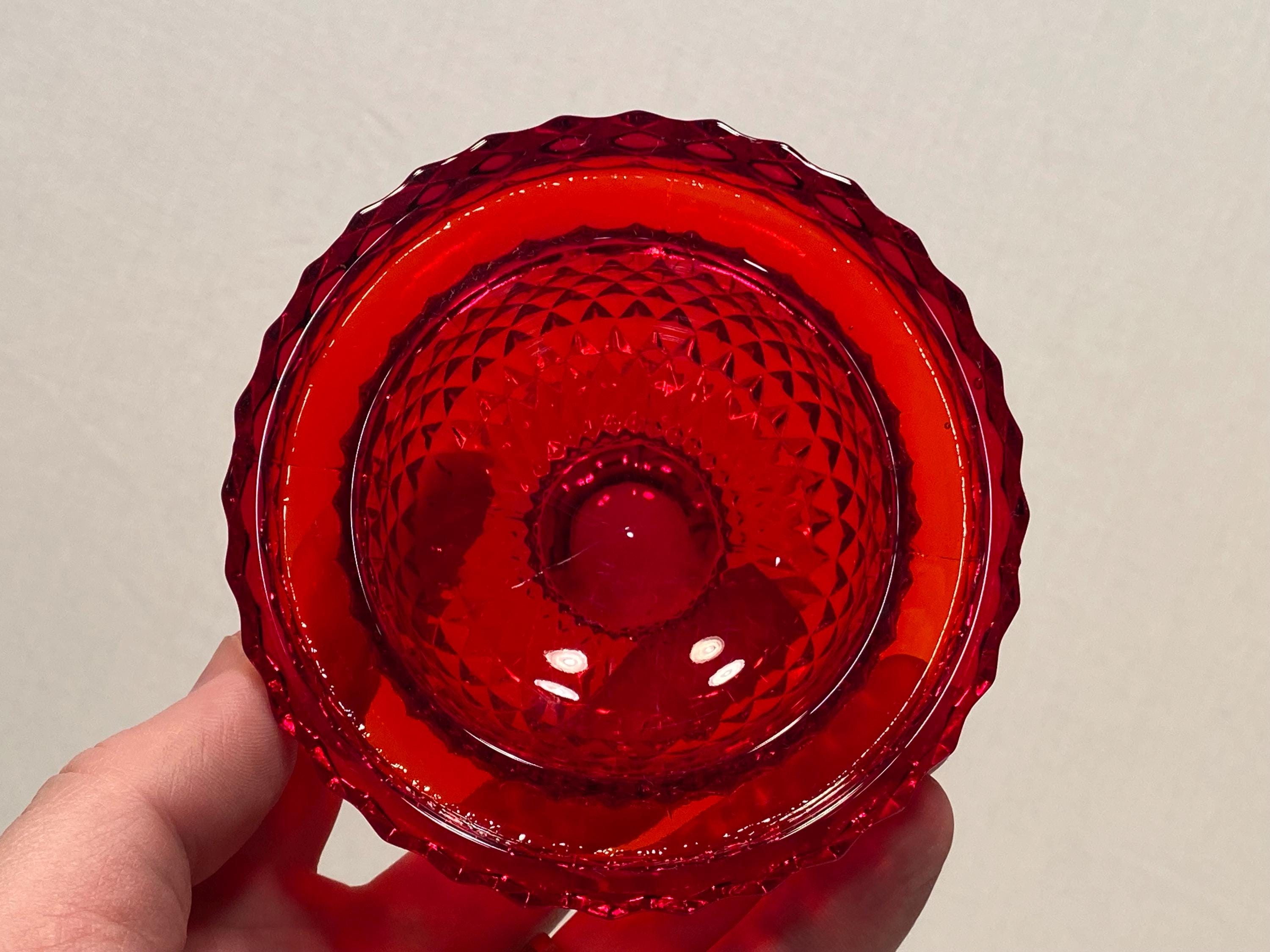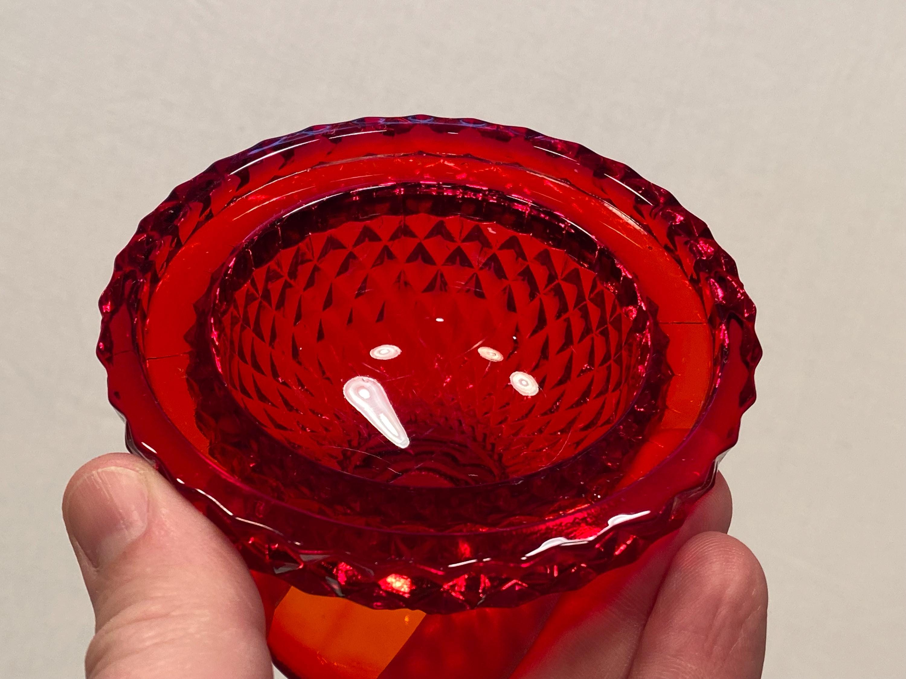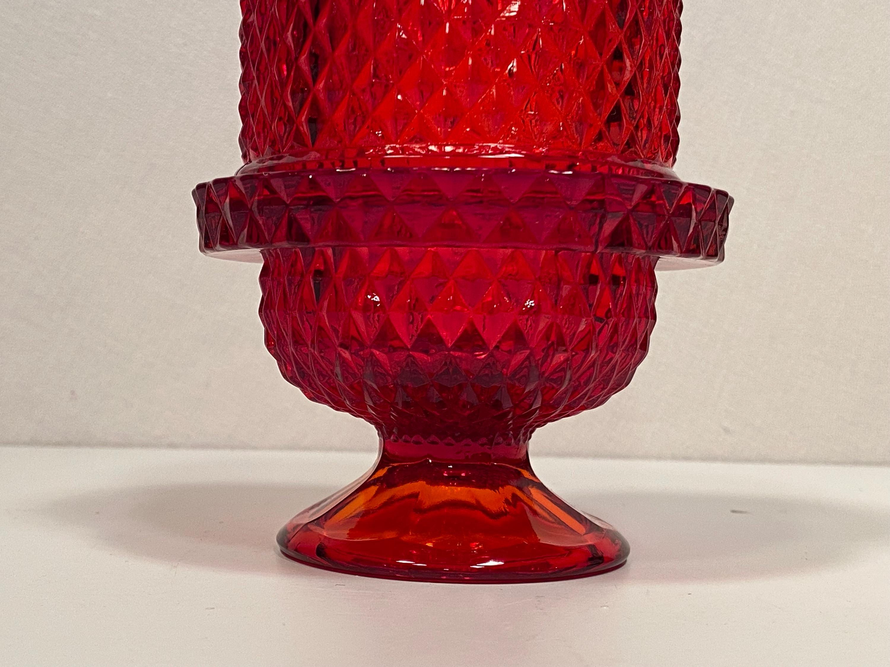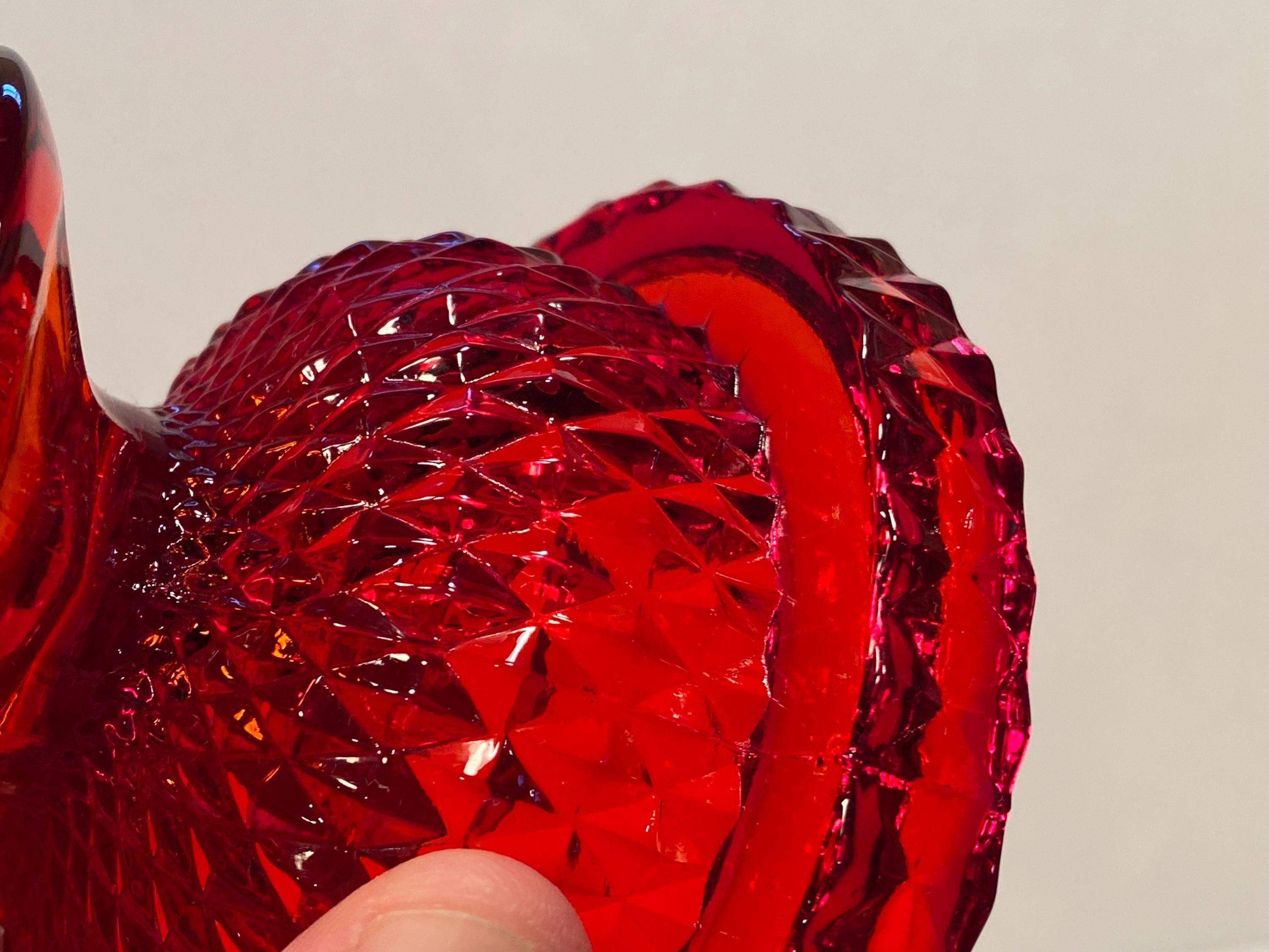 Viking Ruby Red Diamond Point Fairy lamp in excellent condition with no cracks or chips. Color is vibrant with no signs of dishwasher wear. Measures approximately 4" at widest and 6.75" tall.