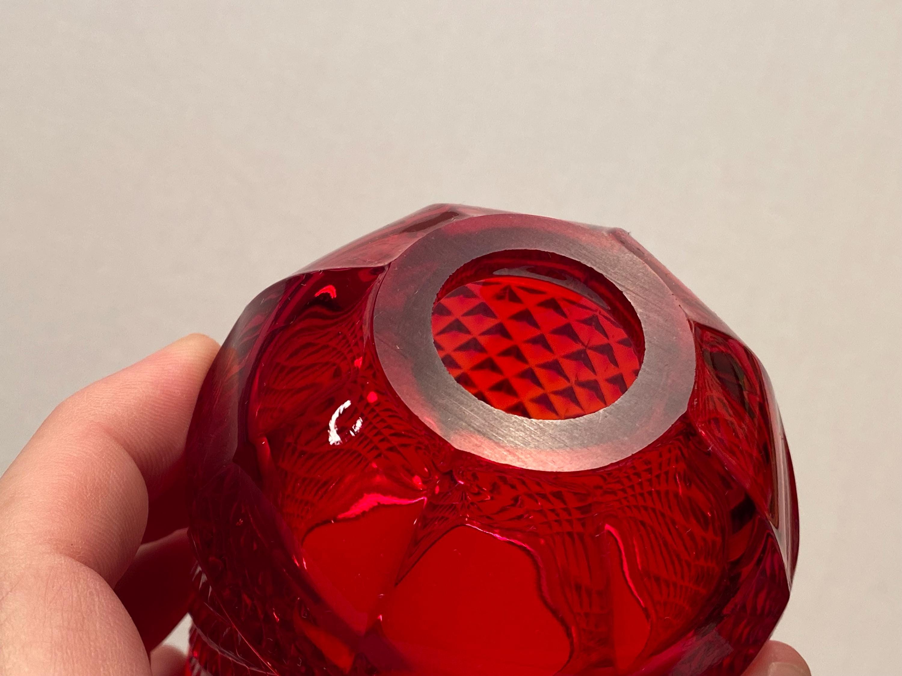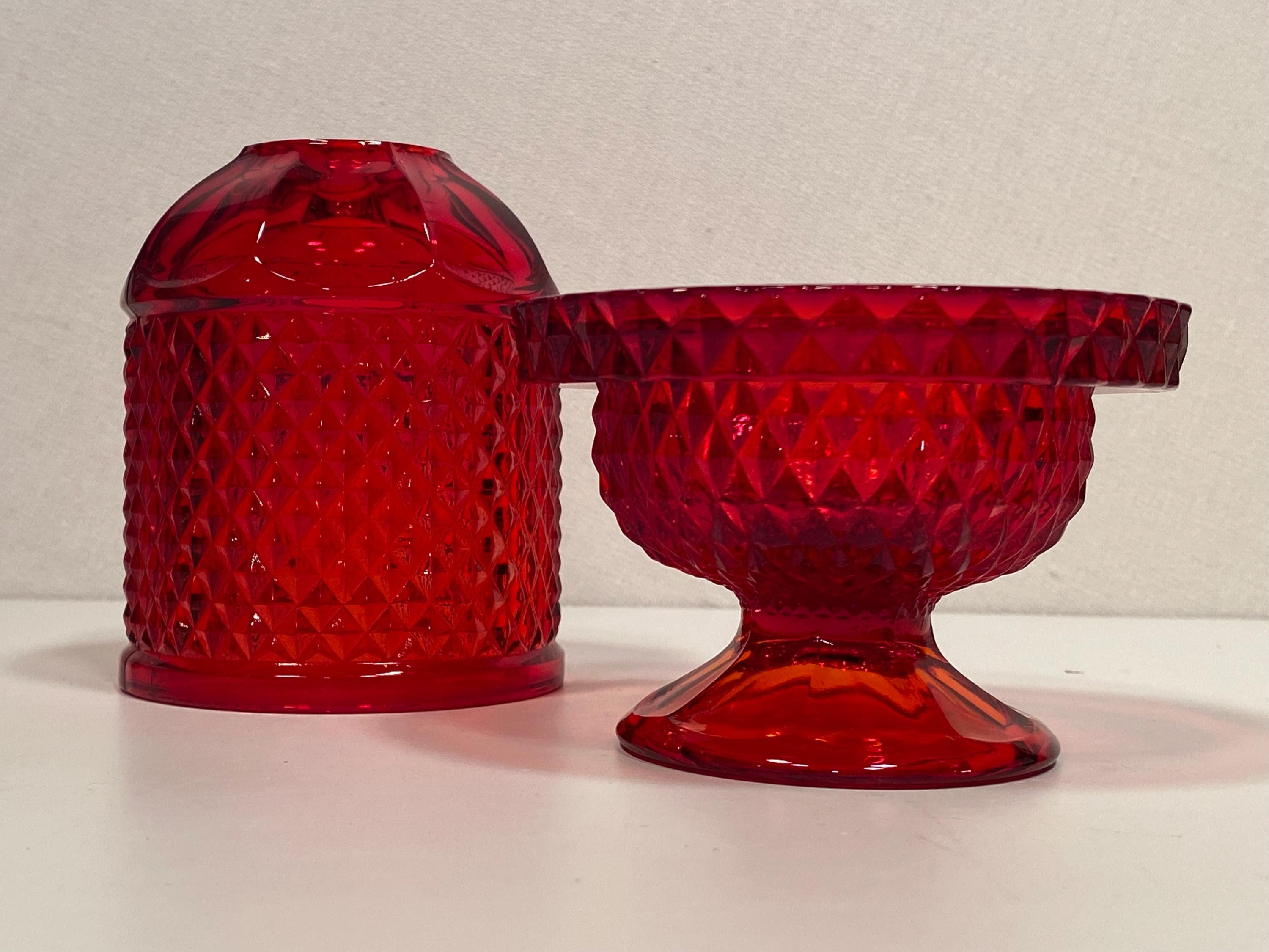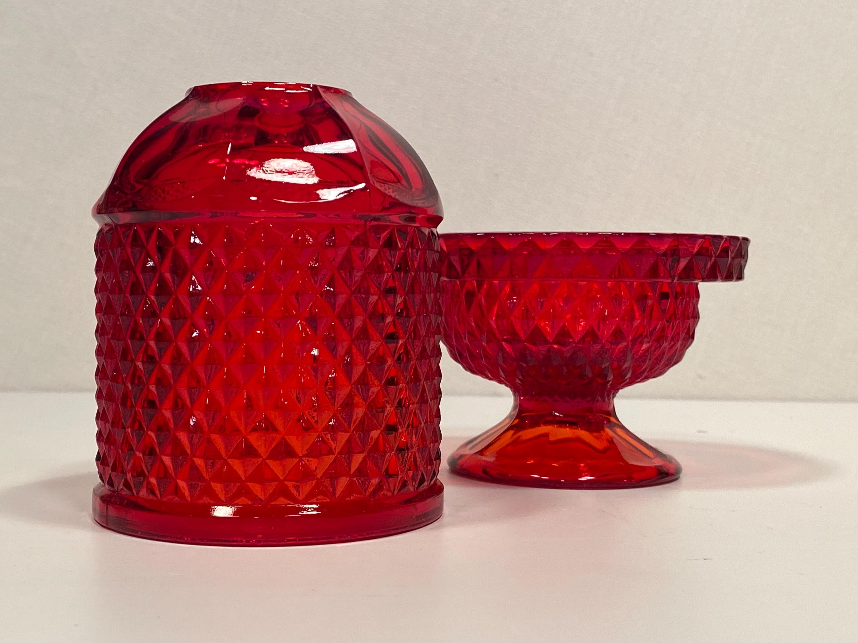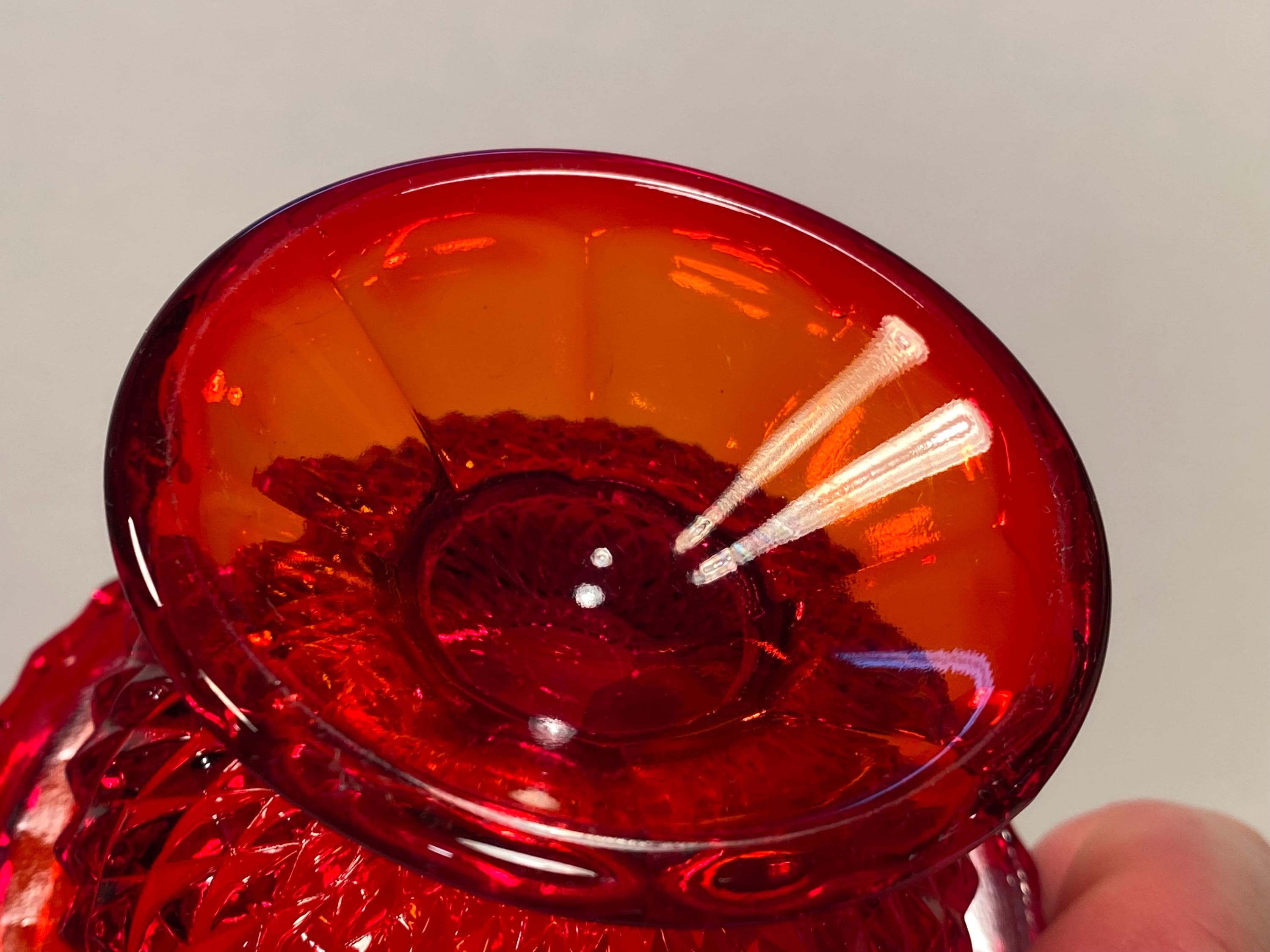 Viking Ruby Red Diamond Point Fairy lamp in excellent condition with no cracks or chips. Color is vibrant with no signs of dishwasher wear. Measures approximately 4" at widest and 6.75" tall.