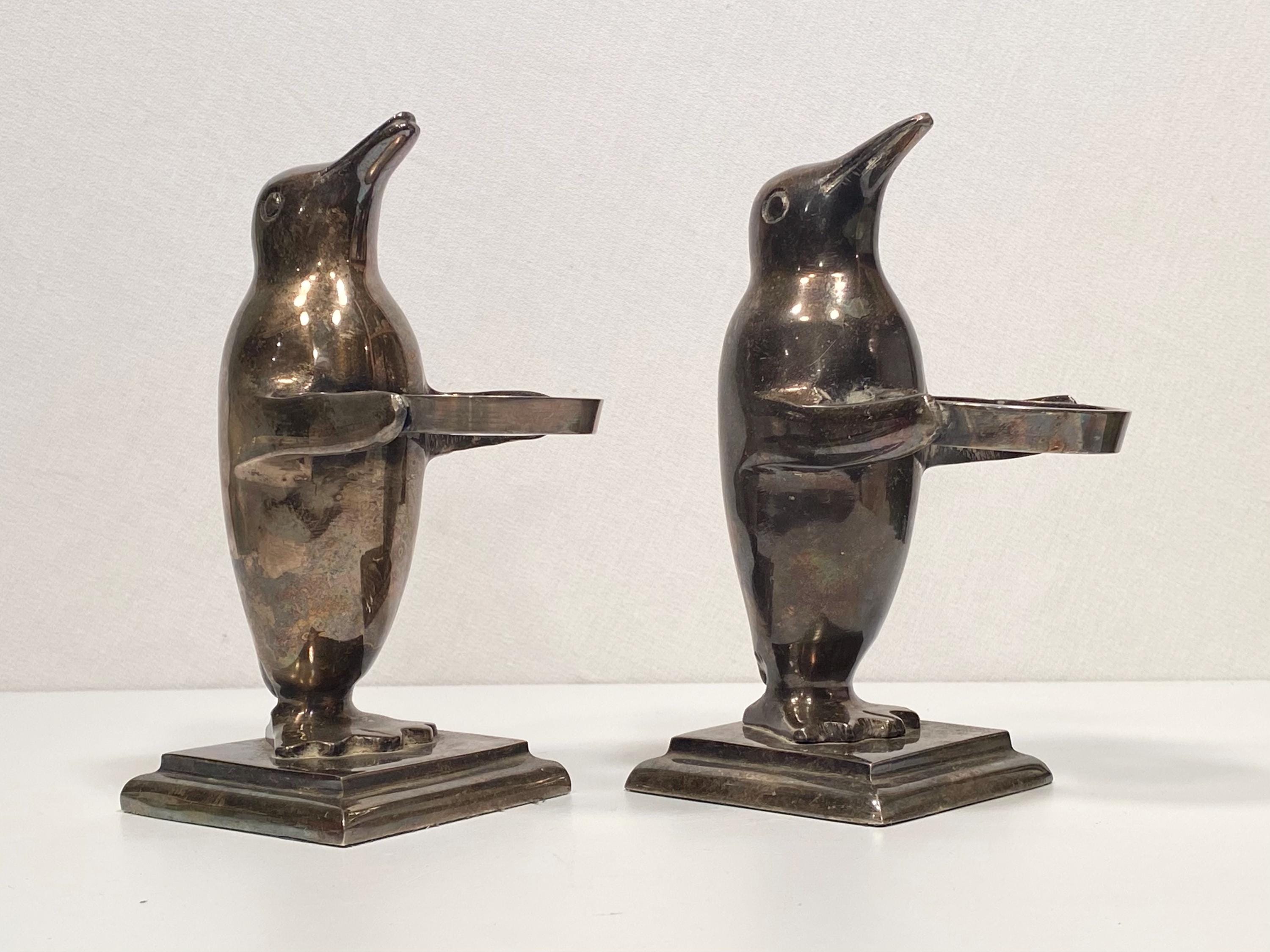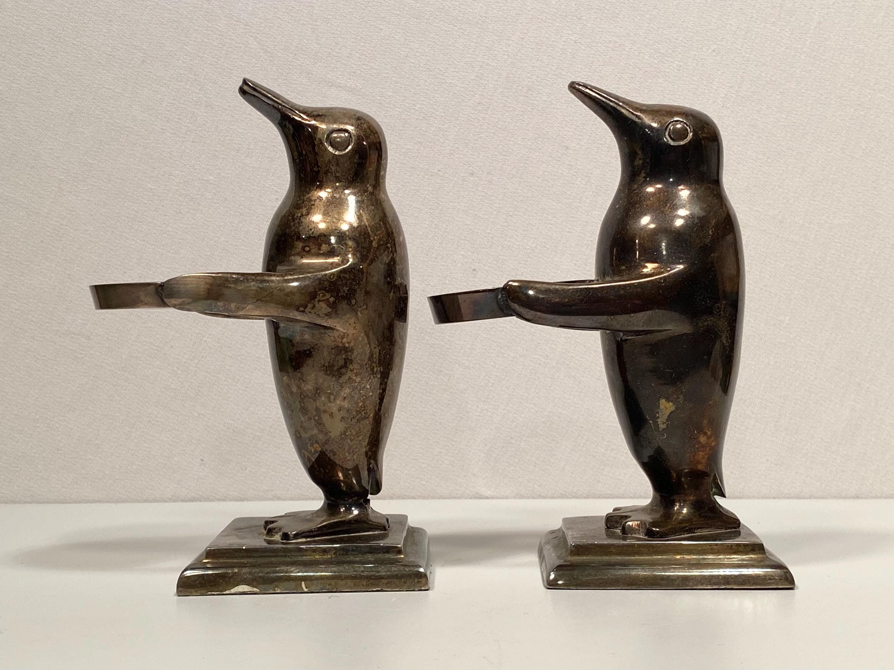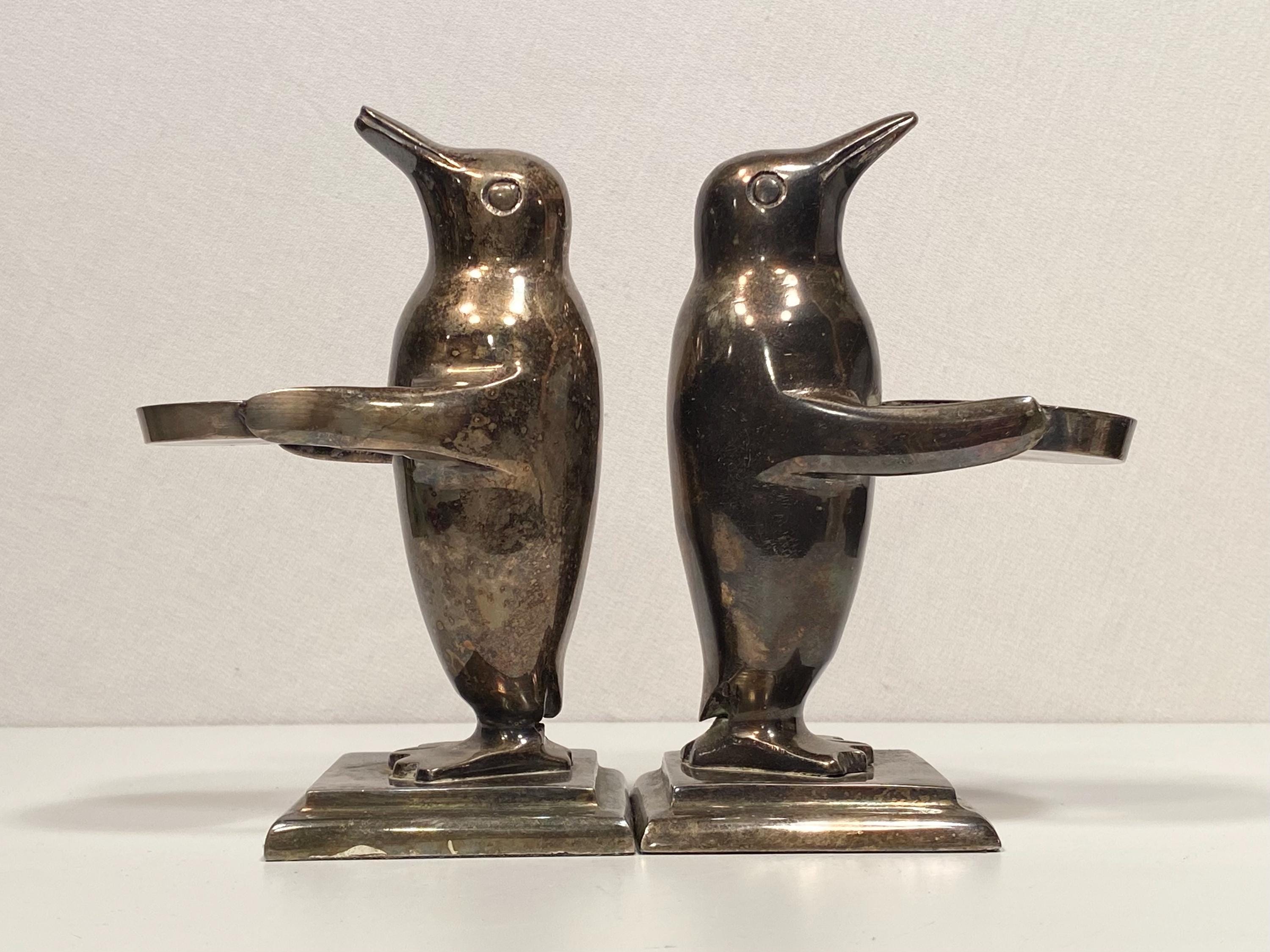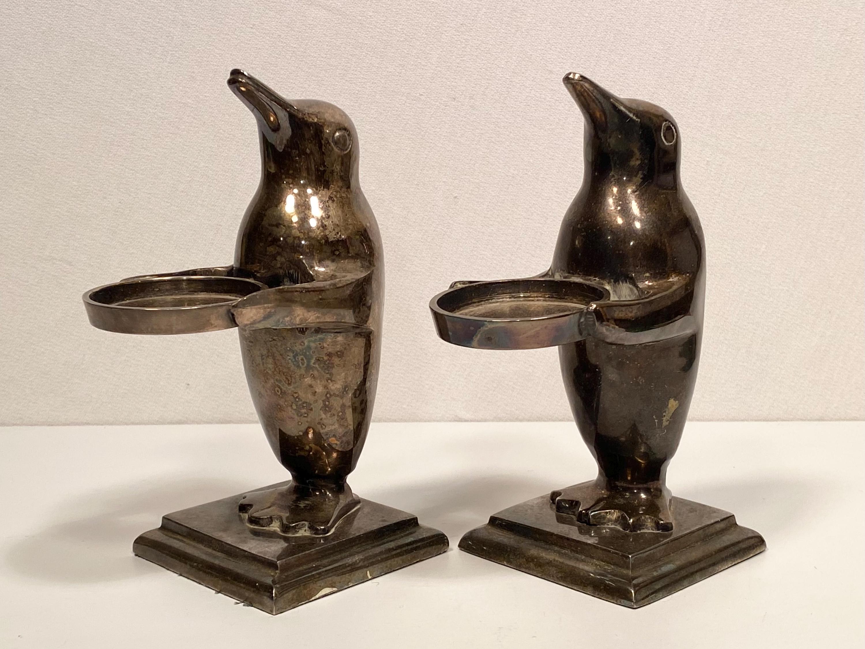 Pair of metal Penguin shaped candle / votive holders in good condition with no cracks or dents. Some age appropriate tarnishing that adds character. These have some weight to them, so you could probably also use them as bookends! Each one stands at approximately 6.5" tall and 4.5" deep from front to back. No visible identifying marks and unknown age. These are possibly silver plate but I have no way of testing them, so I would not guarantee that.