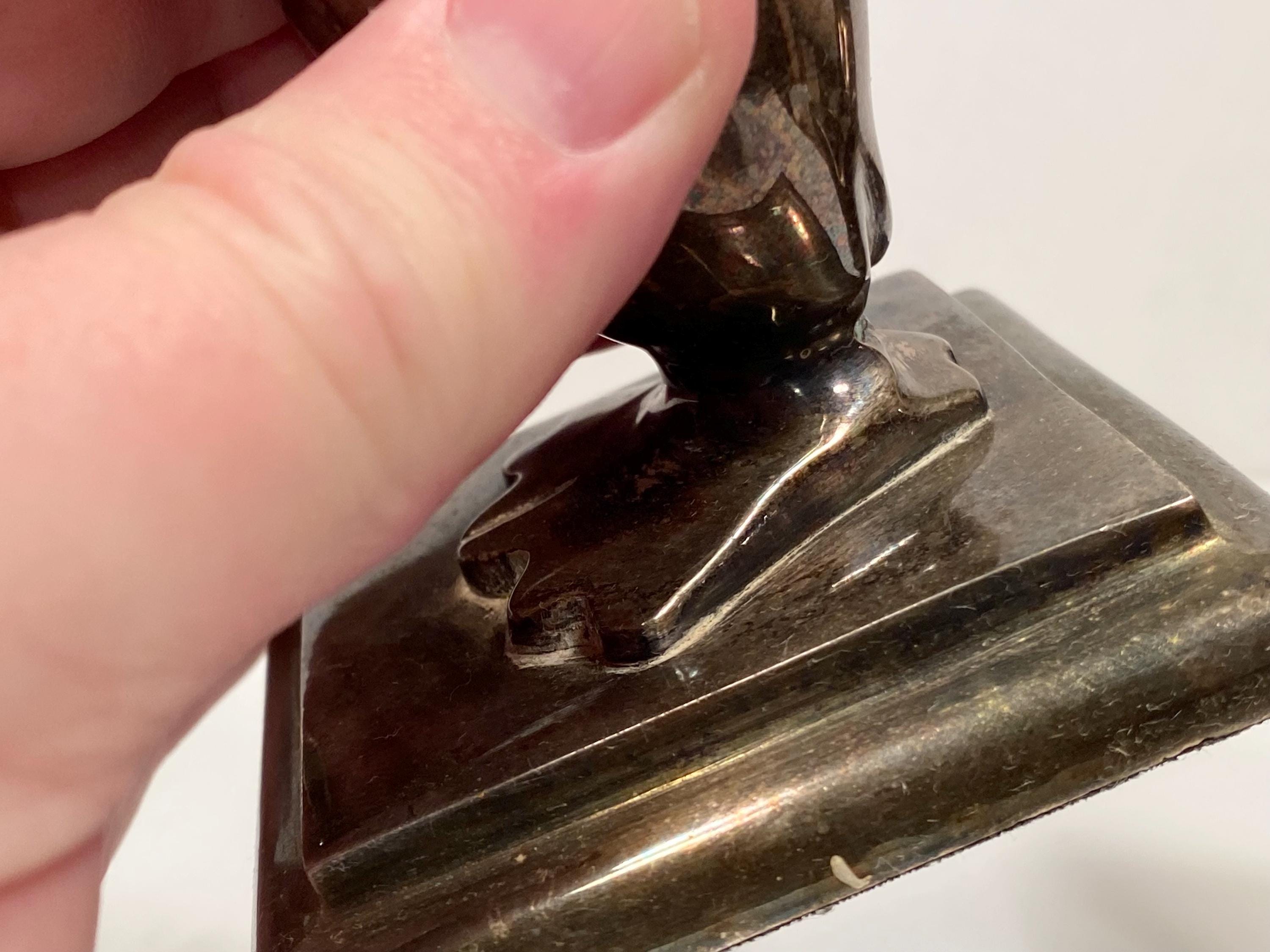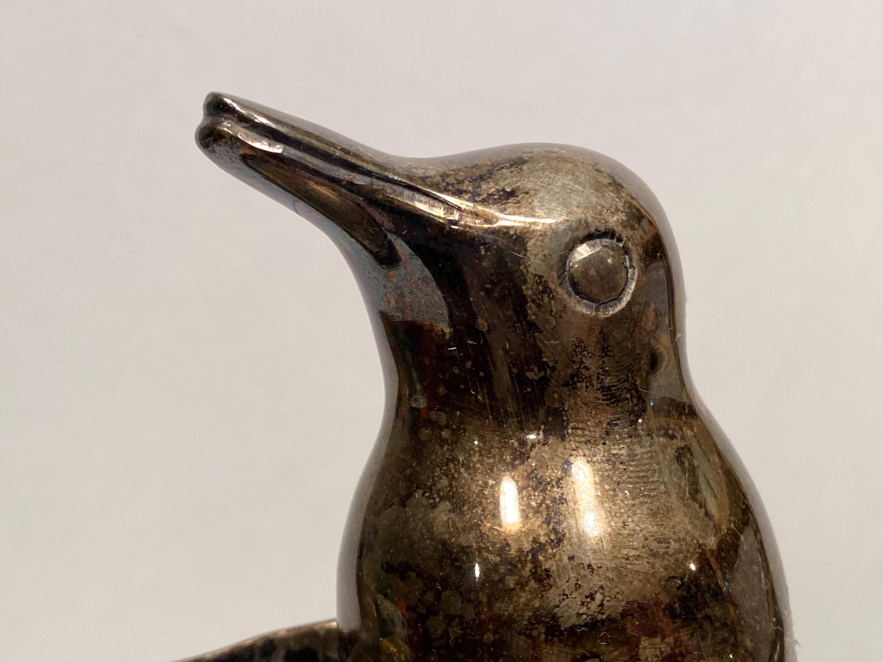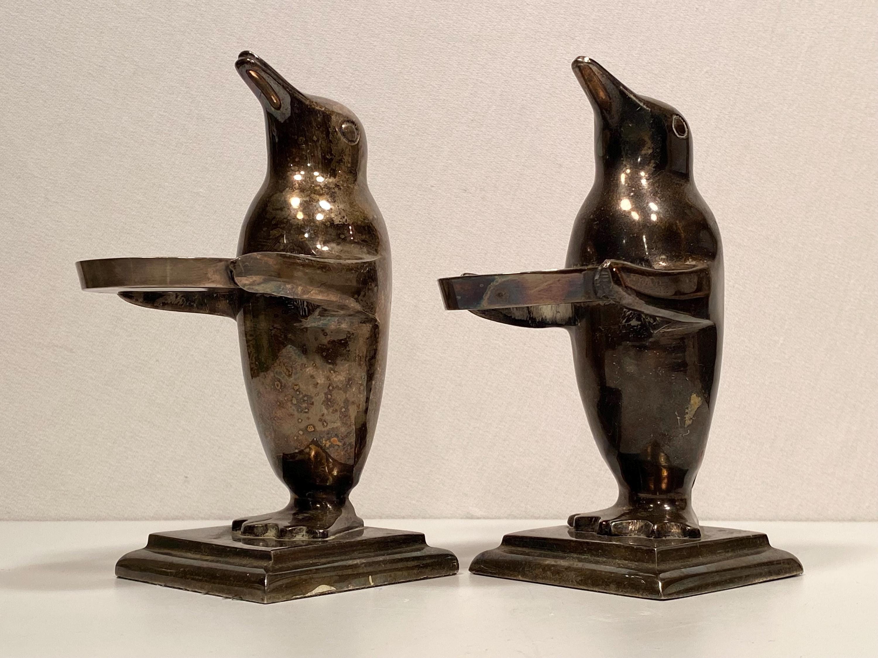 Pair of metal Penguin shaped candle / votive holders in good condition with no cracks or dents. Some age appropriate tarnishing that adds character. These have some weight to them, so you could probably also use them as bookends! Each one stands at approximately 6.5" tall and 4.5" deep from front to back. No visible identifying marks and unknown age. These are possibly silver plate but I have no way of testing them, so I would not guarantee that.