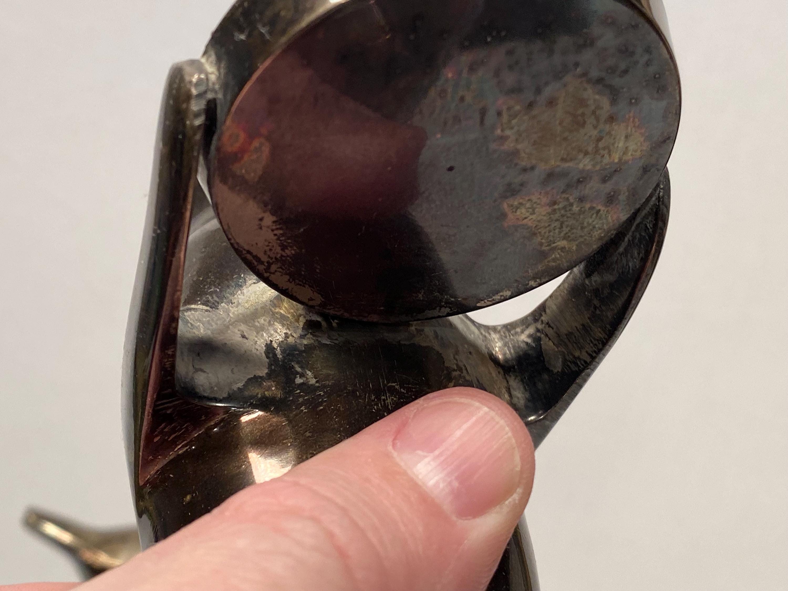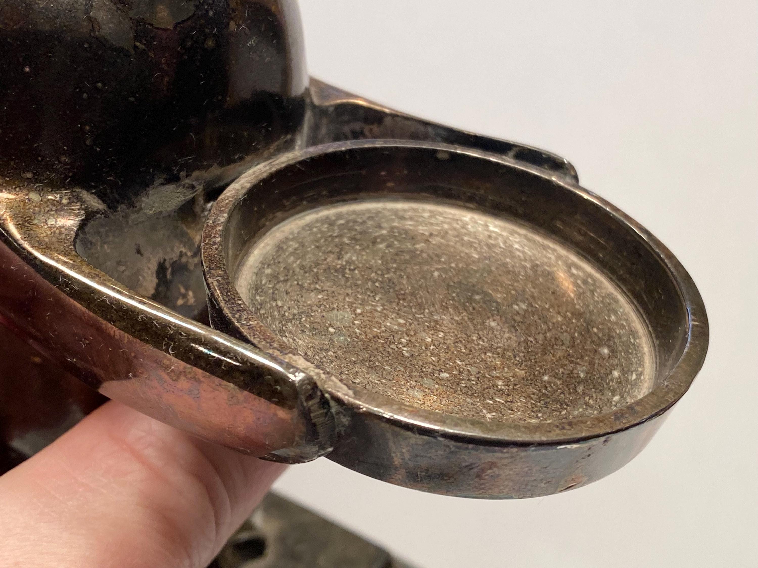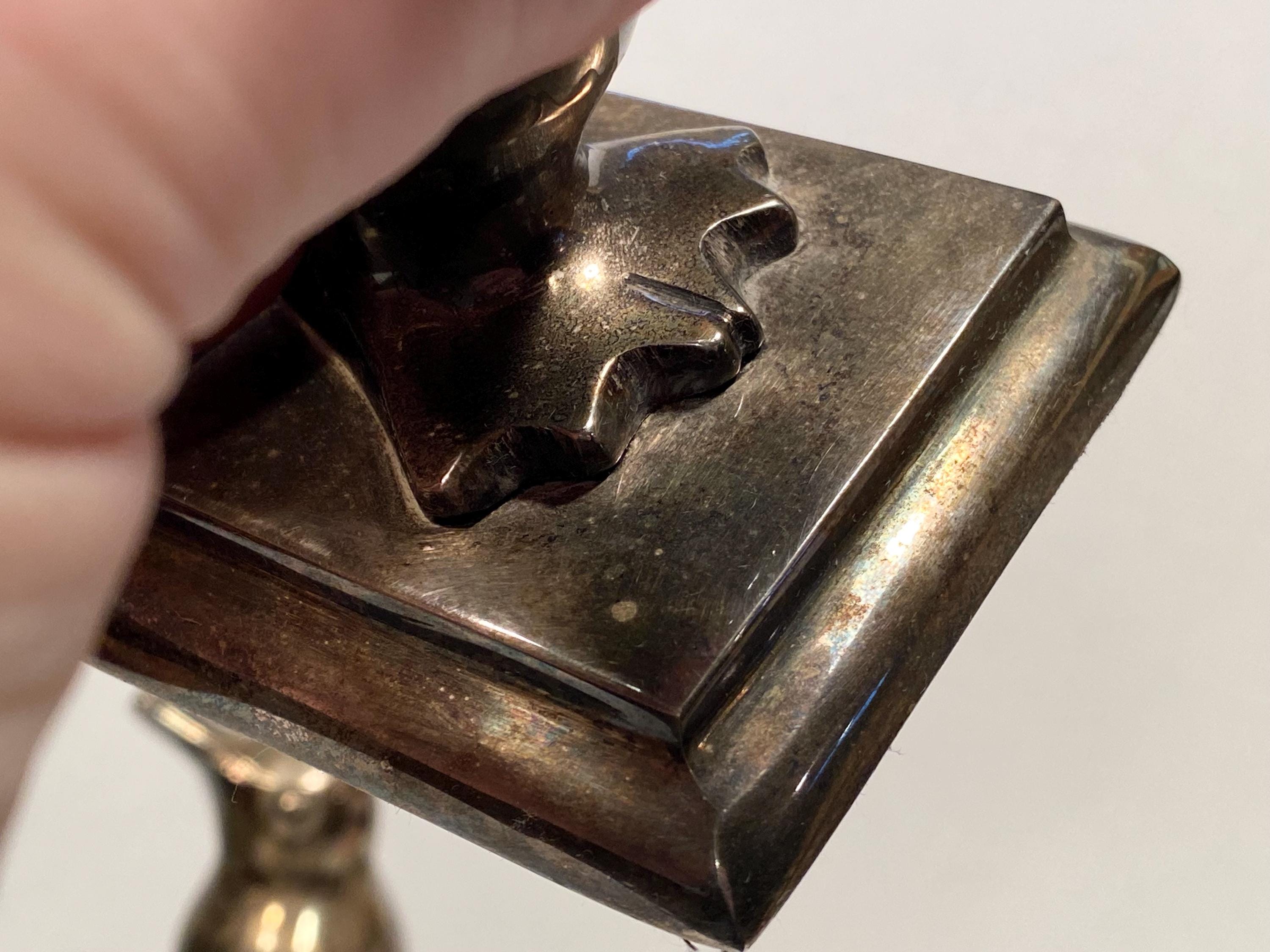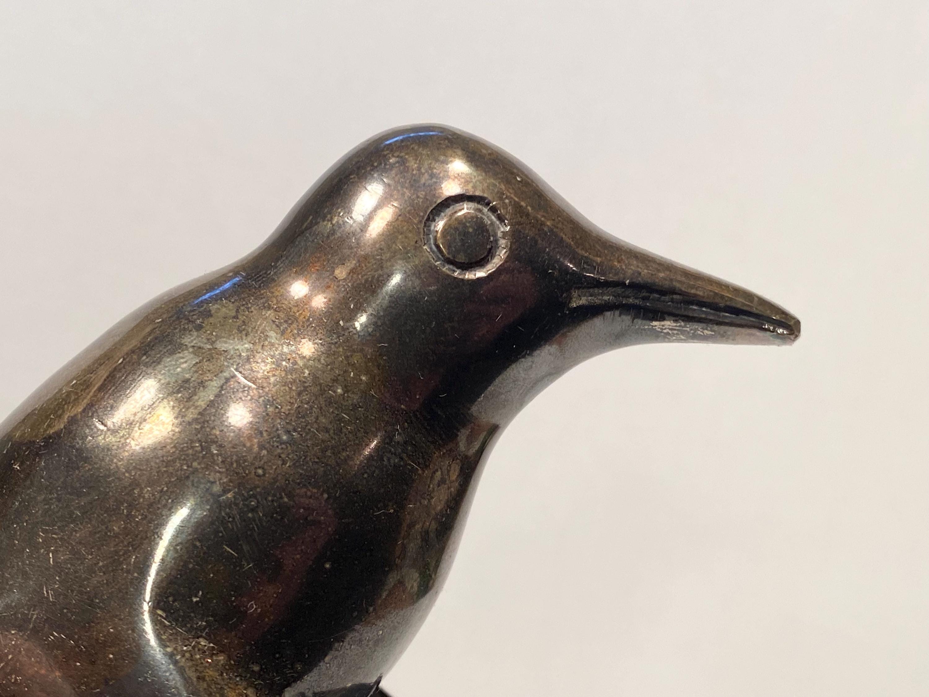 Pair of metal Penguin shaped candle / votive holders in good condition with no cracks or dents. Some age appropriate tarnishing that adds character. These have some weight to them, so you could probably also use them as bookends! Each one stands at approximately 6.5" tall and 4.5" deep from front to back. No visible identifying marks and unknown age. These are possibly silver plate but I have no way of testing them, so I would not guarantee that.