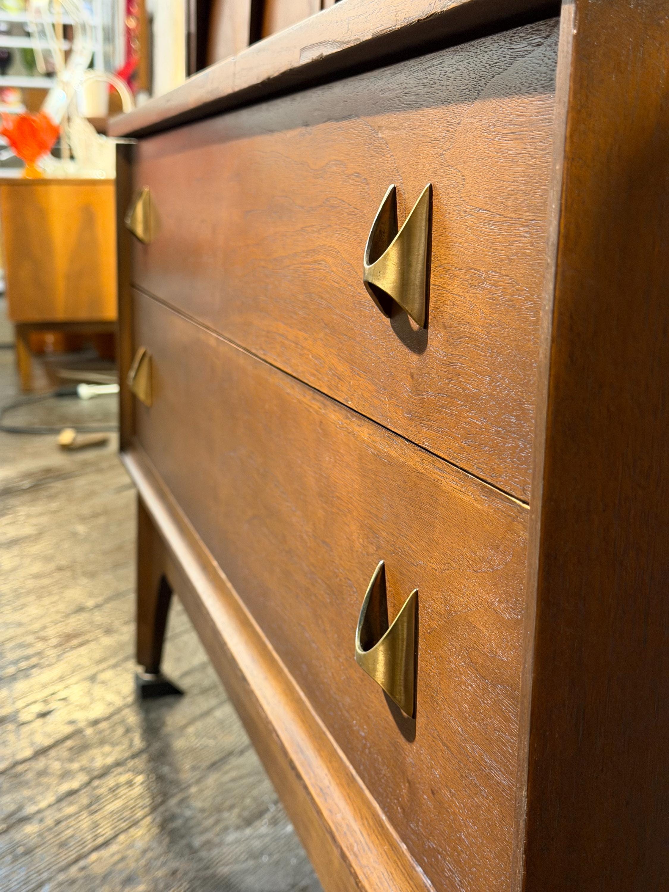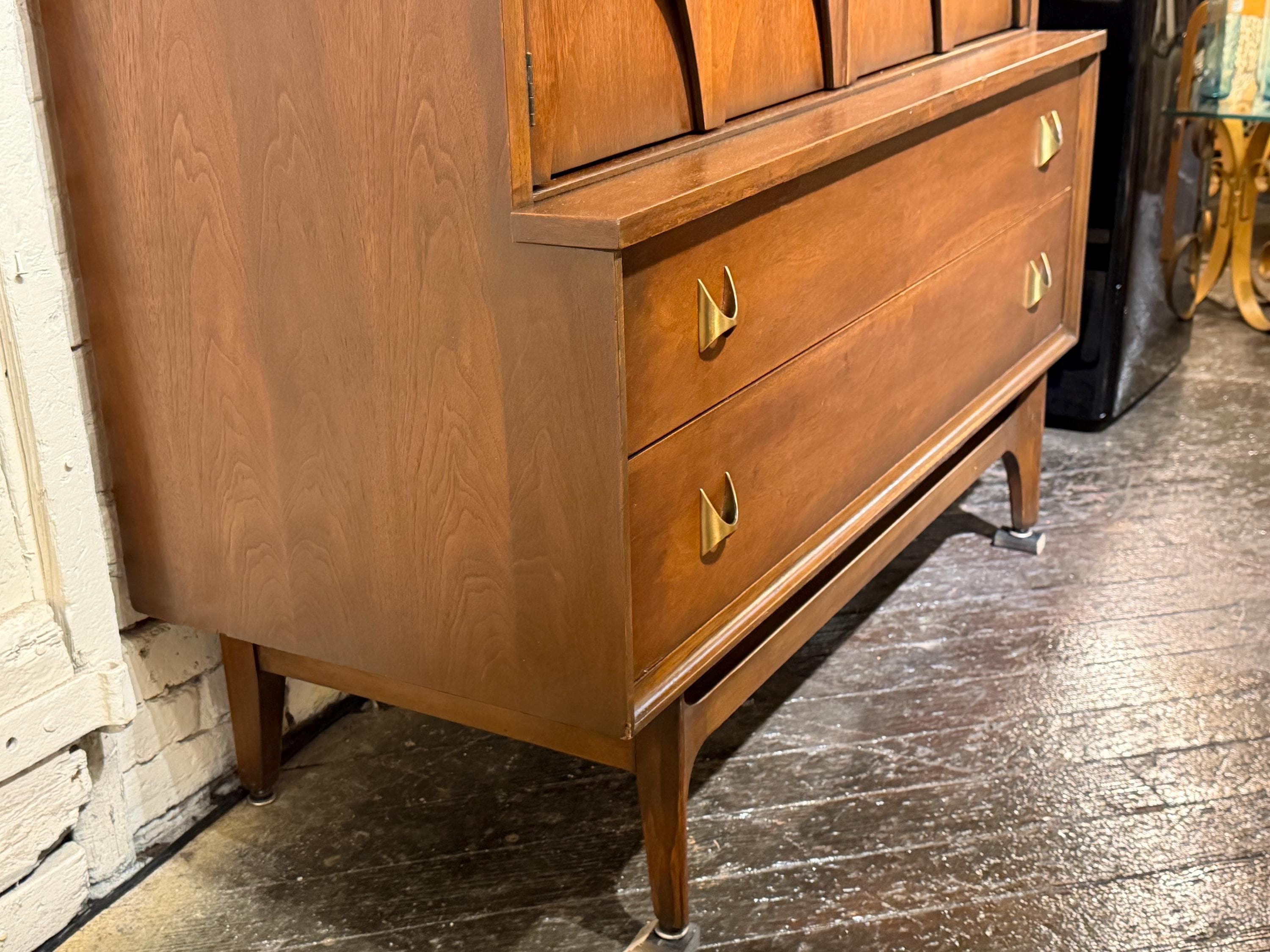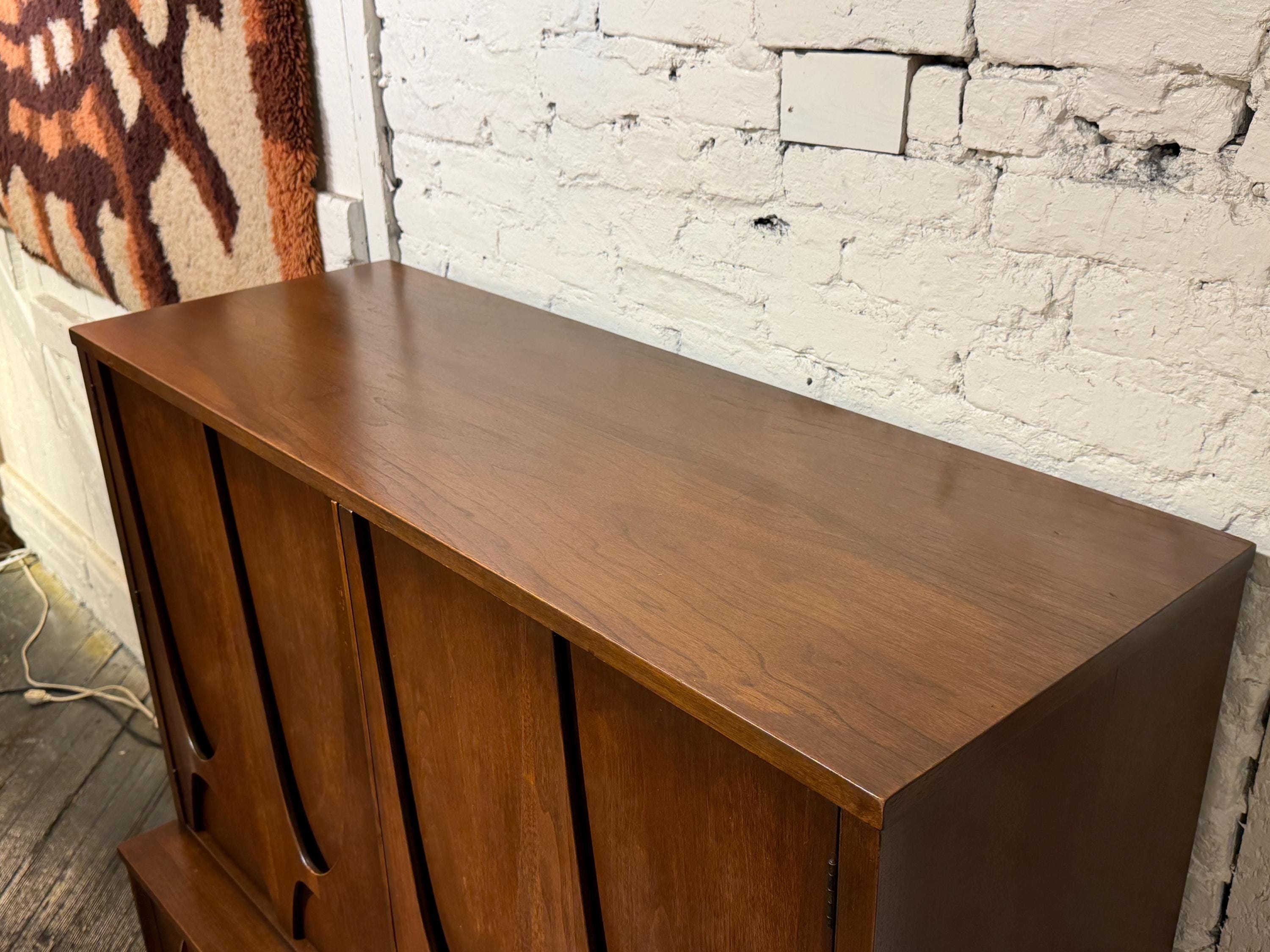 Here is a beautiful walnut gentleman’s chest by Broyhill for their Brasilia line, circa 1960s. If you are looking for a stylish piece with numerous storage options, then this is the perfect choice for you. All drawers glide smoothly, and this piece underwent a thorough review in our workshop. This piece looks great and has very minimal signs of wear, mostly to the original finish. Two small blemishes on the top can be seen with a close inspection, a small amount of discoloration to the doors from age/use, and all of these minor issues can be seen in our last few images. We have considered this wear when pricing this piece. Please reach out if you have any questions.